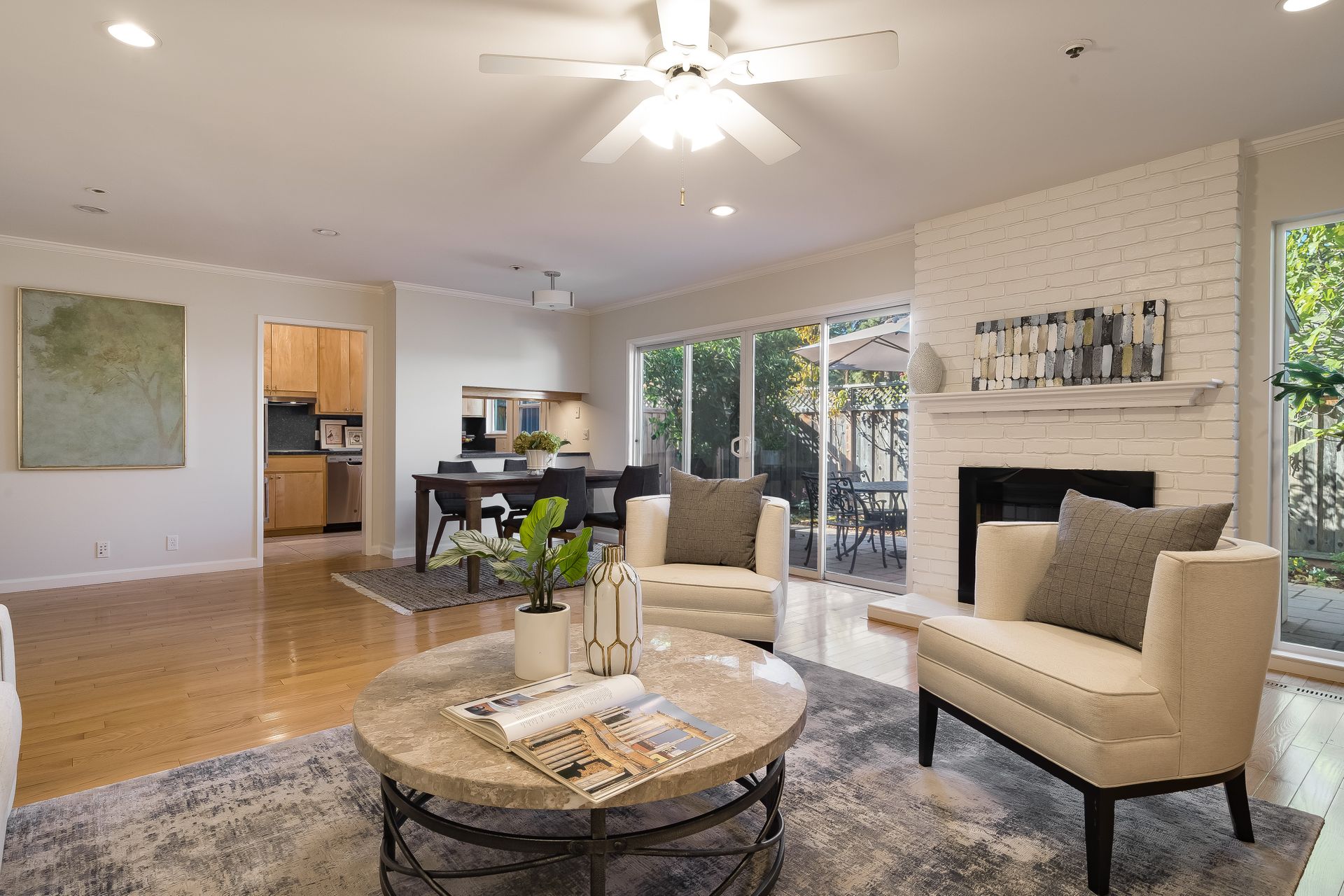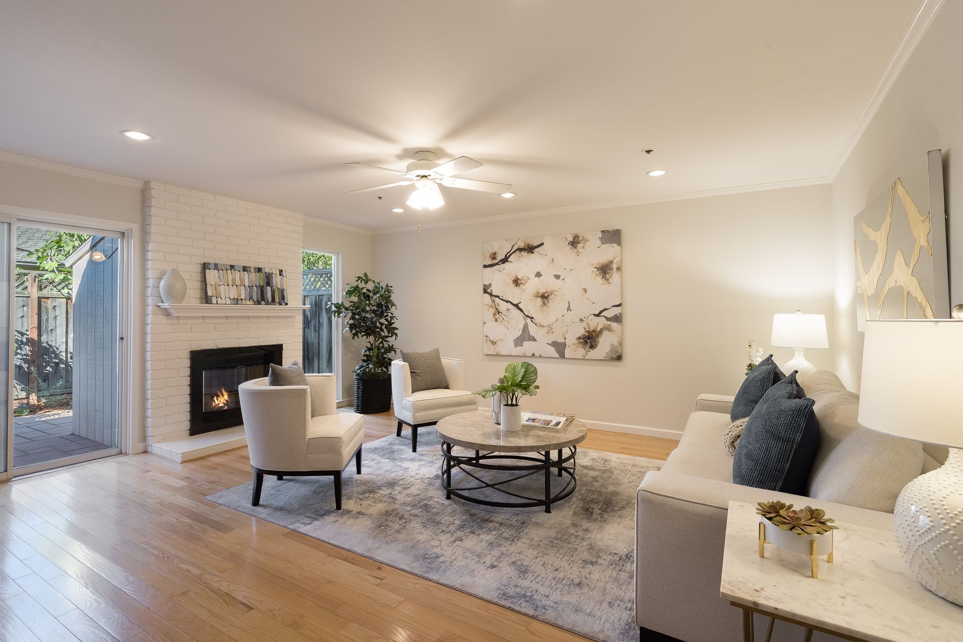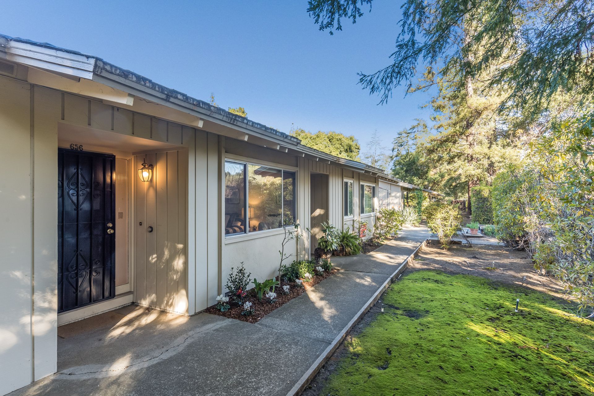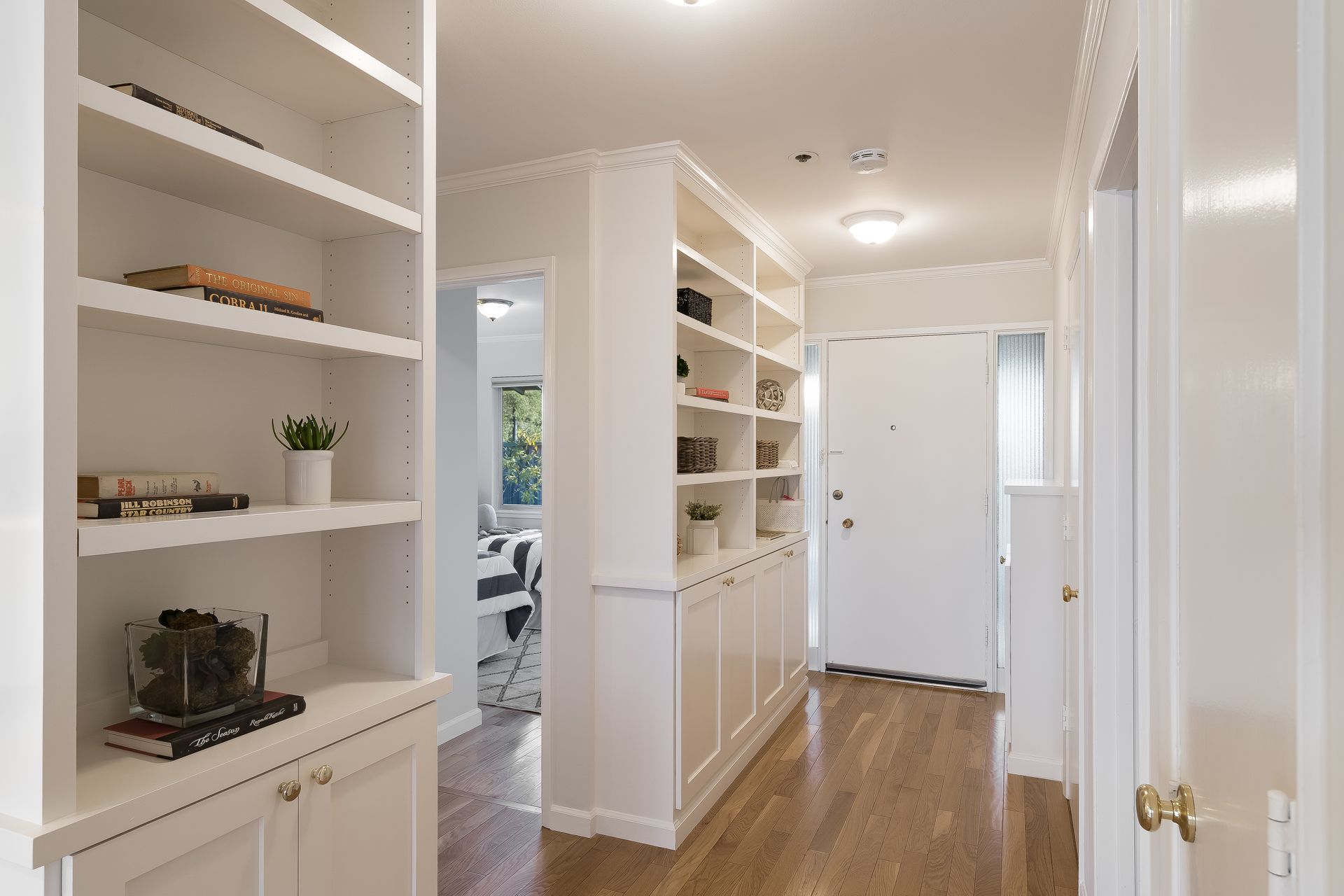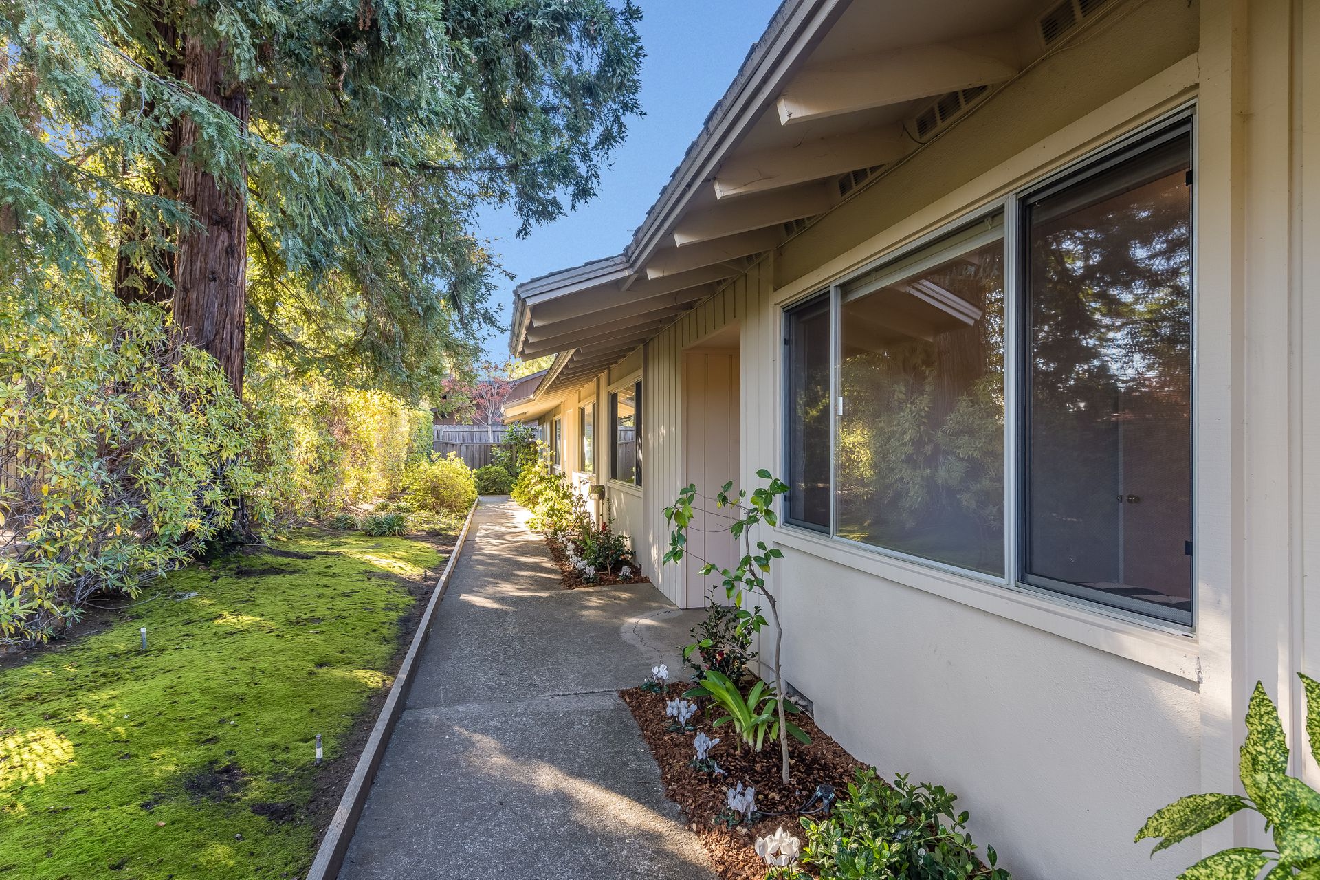 This sparkling, one-story two bedroom, two bath condominium in the Mark Twain complex is convenient to shops and restaurants in downtown Los Altos as well as to San Antonio Center. The formal entry includes built-in shelves and cabinets and two entry closets. The kitchen has Corian counters with pass through to the dining area, tile floor, loads of storage and newly installed stainless steel appliances including a double oven, vent hood, refrigerator, dishwasher and induction range. The separate kitchen door opens to the patio. Enjoy the living-dining room combination with a sliding glass door opening to the spacious paver patio with a custom shed and mature fruit trees. Hardwood floors can be found throughout the livable areas and the bedrooms. The master bedroom includes a newer stall shower, toilet and a luxury vinyl tile floor. The hall bath has a pedestal sink, tub and newer medicine cabinet. There is a laundry area in the master suite with newer flooring as well. The complex includes a swimming pool, community garden, carport and open parking.