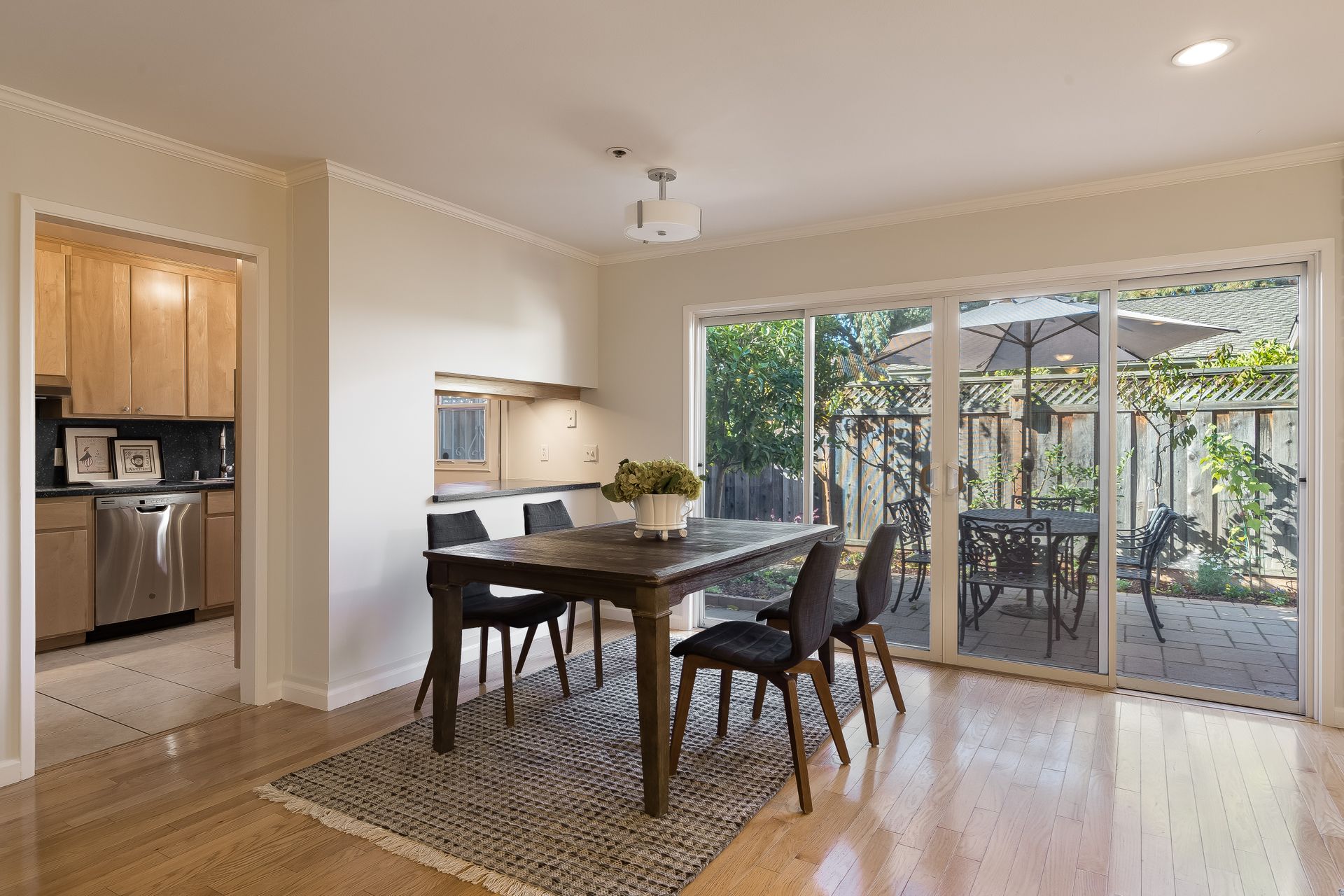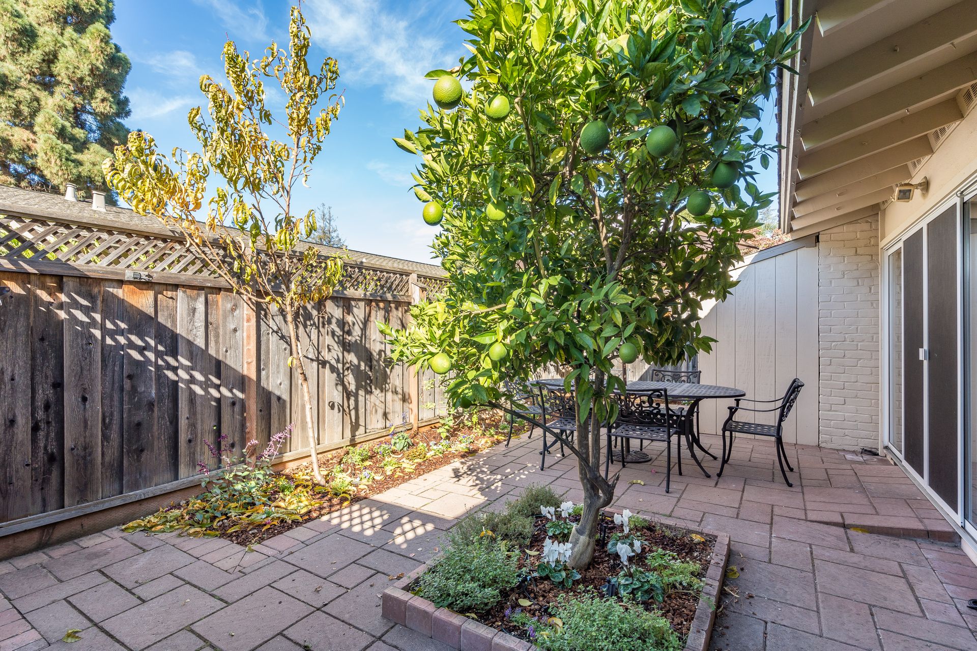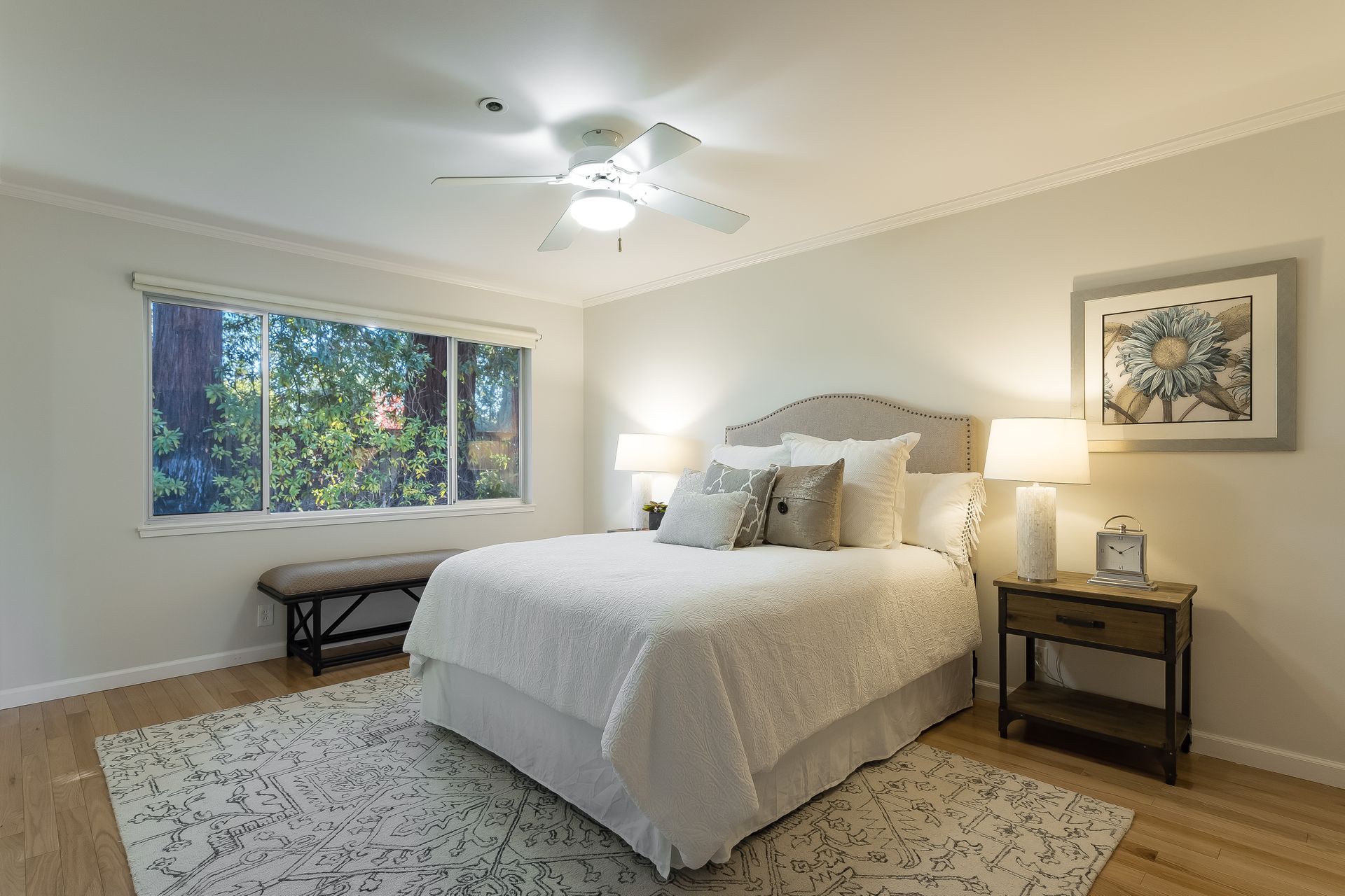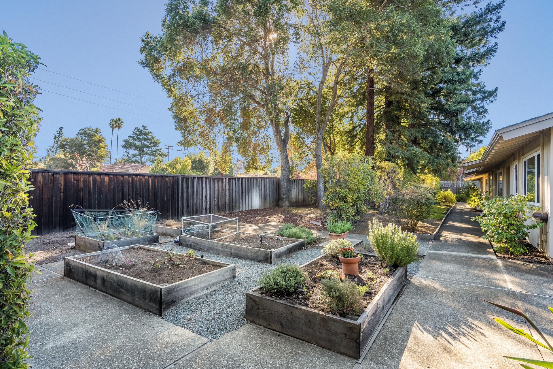 This sparkling, one-story two bedroom, two bath condominium in the Mark Twain complex is convenient to shops and restaurants in downtown Los Altos as well as to San Antonio Center. The formal entry includes built-in shelves and cabinets and two entry closets. The kitchen has Corian counters with pass through to the dining area, tile floor, loads of storage and newly installed stainless steel appliances including a double oven, vent hood, refrigerator, dishwasher and induction range. The separate kitchen door opens to the patio. Enjoy the living-dining room combination with a sliding glass door opening to the spacious paver patio with a custom shed and mature fruit trees. Hardwood floors can be found throughout the livable areas and the bedrooms. The master bedroom includes a newer stall shower, toilet and a luxury vinyl tile floor. The hall bath has a pedestal sink, tub and newer medicine cabinet. There is a laundry area in the master suite with newer flooring as well. The complex includes a swimming pool, community garden, carport and open parking.