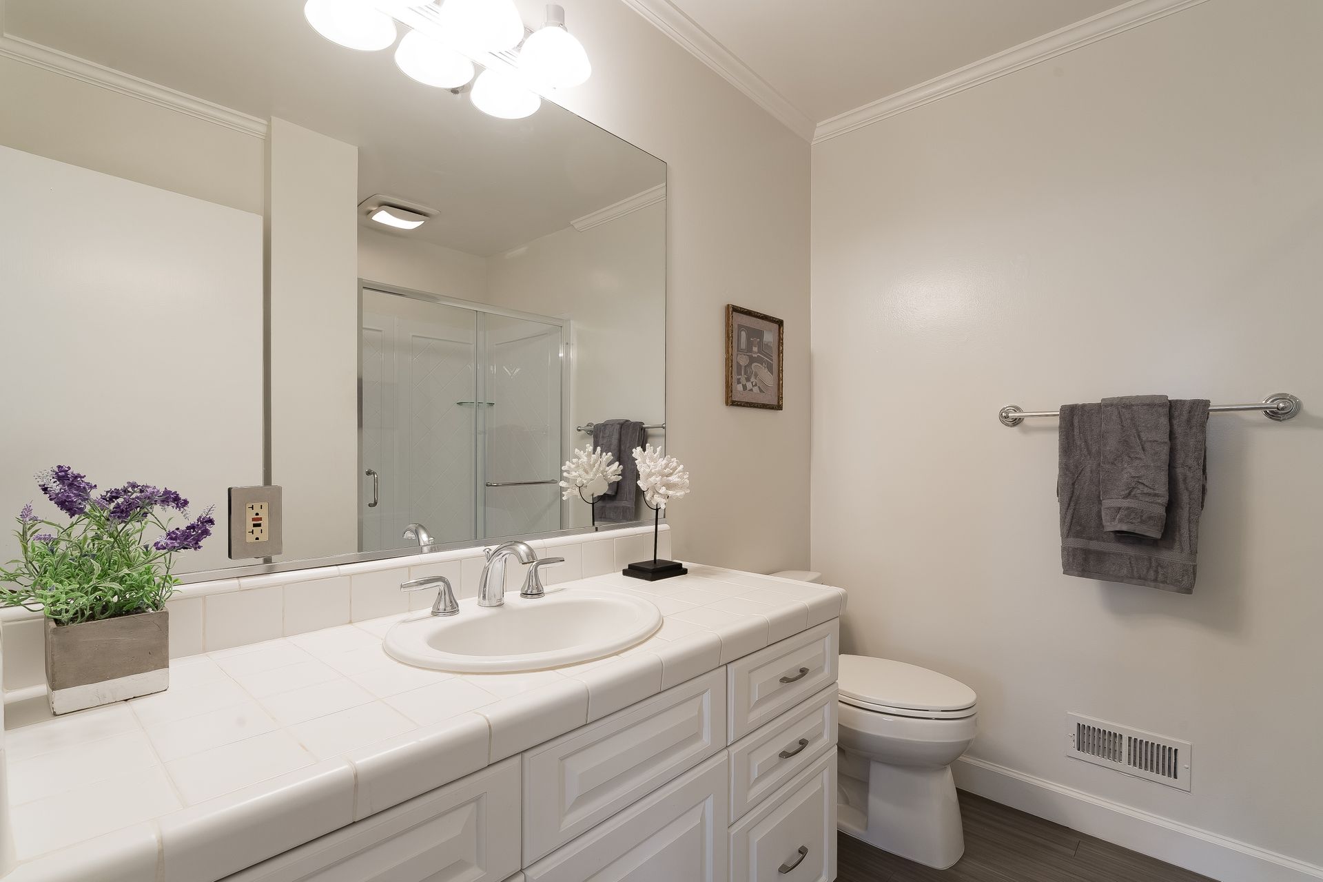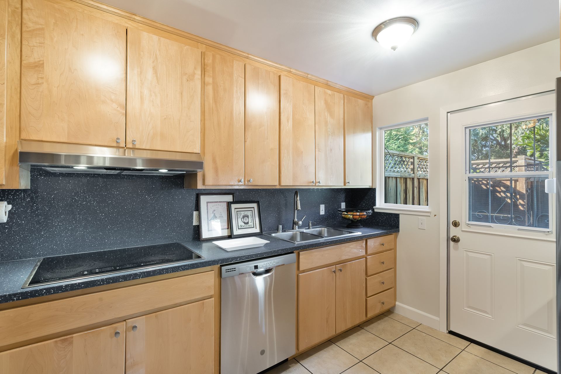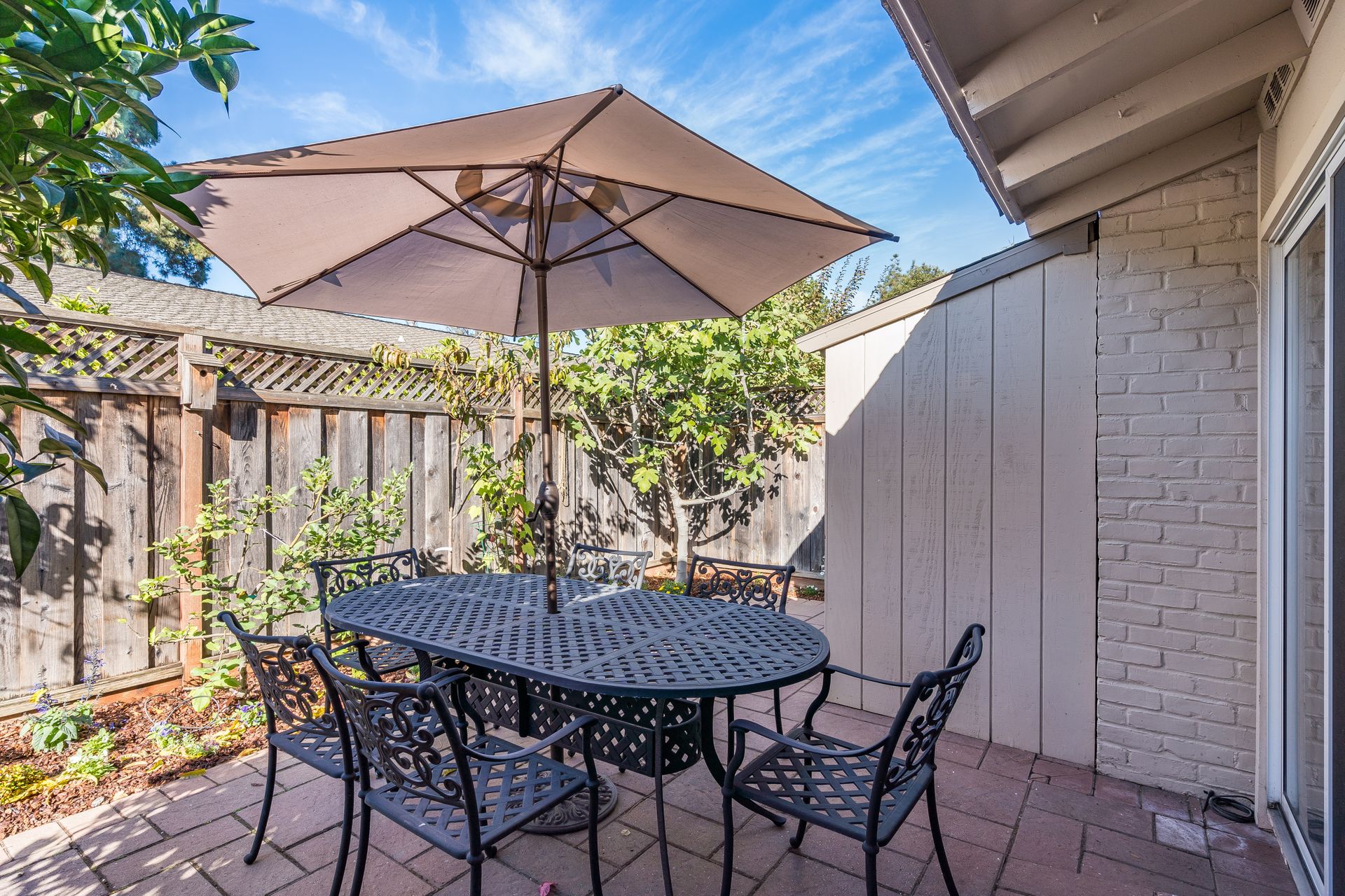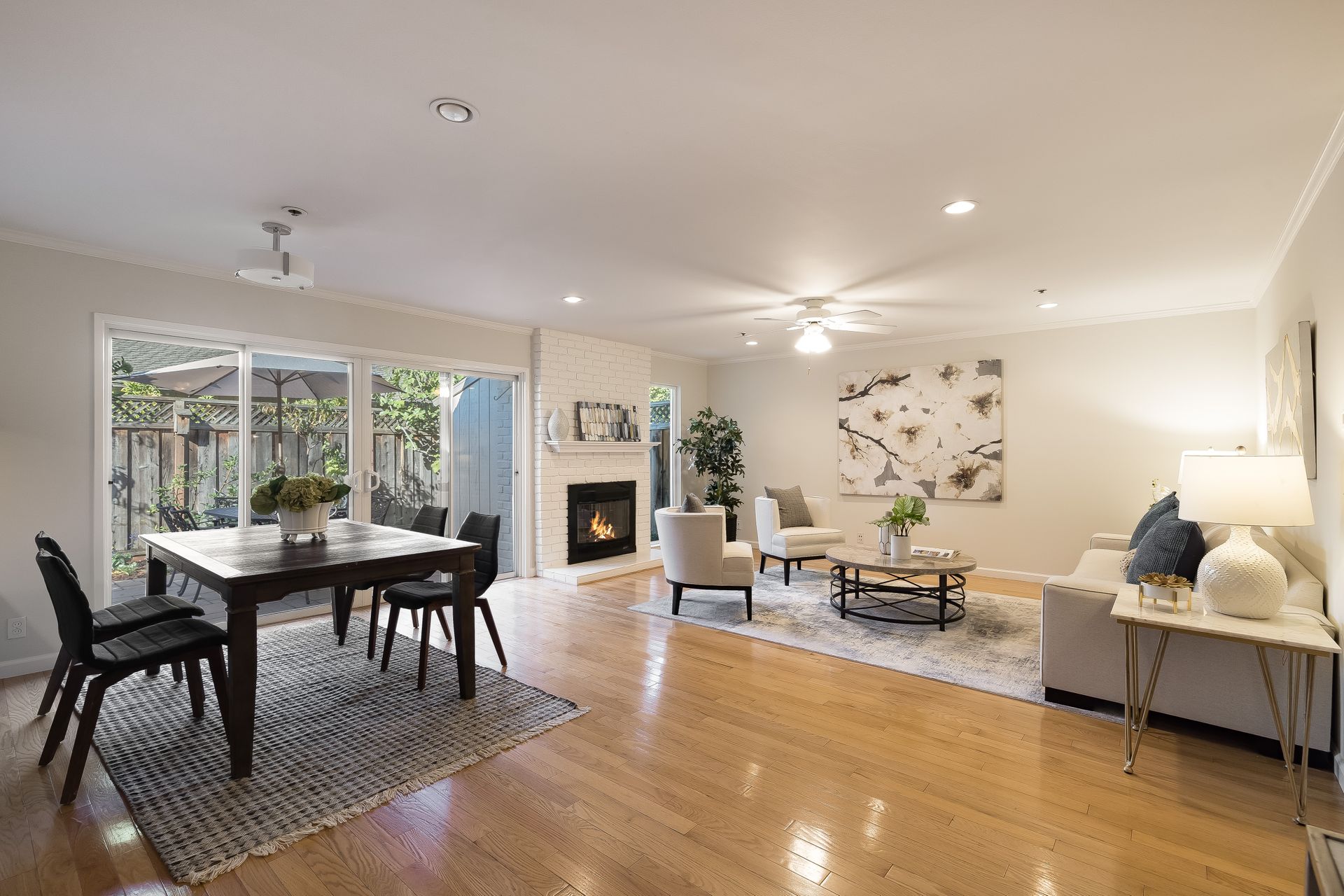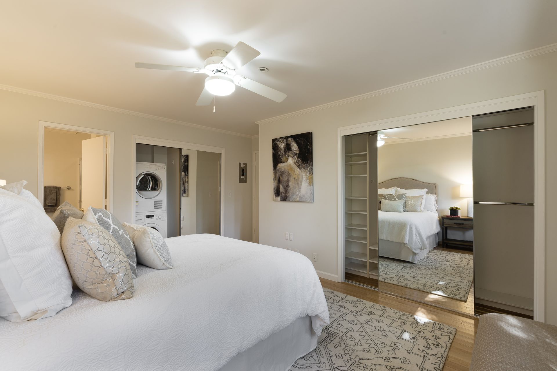 This sparkling, one-story two bedroom, two bath condominium in the Mark Twain complex is convenient to shops and restaurants in downtown Los Altos as well as to San Antonio Center. The formal entry includes built-in shelves and cabinets and two entry closets. The kitchen has Corian counters with pass through to the dining area, tile floor, loads of storage and newly installed stainless steel appliances including a double oven, vent hood, refrigerator, dishwasher and induction range. The separate kitchen door opens to the patio. Enjoy the living-dining room combination with a sliding glass door opening to the spacious paver patio with a custom shed and mature fruit trees. Hardwood floors can be found throughout the livable areas and the bedrooms. The master bedroom includes a newer stall shower, toilet and a luxury vinyl tile floor. The hall bath has a pedestal sink, tub and newer medicine cabinet. There is a laundry area in the master suite with newer flooring as well. The complex includes a swimming pool, community garden, carport and open parking.