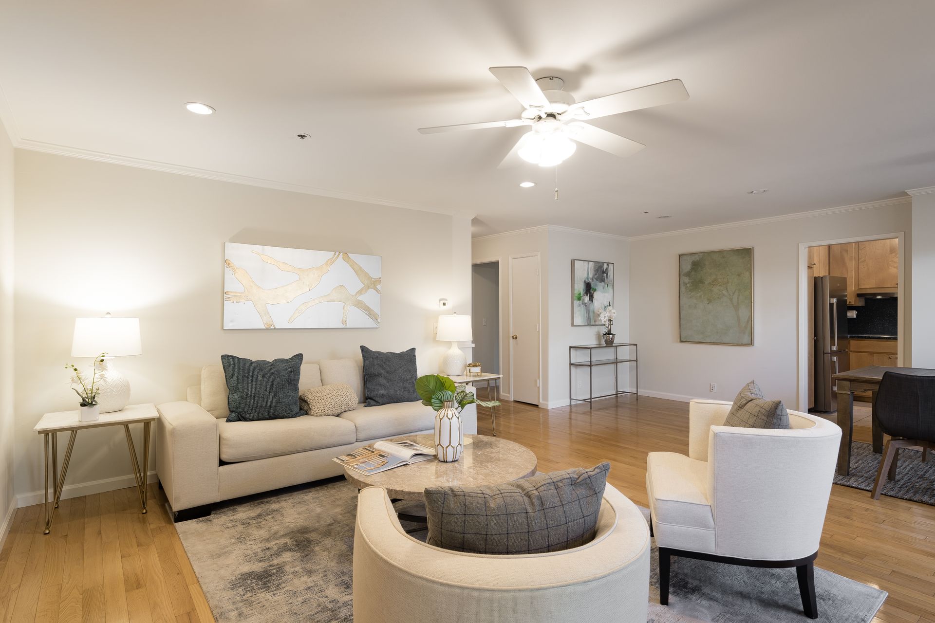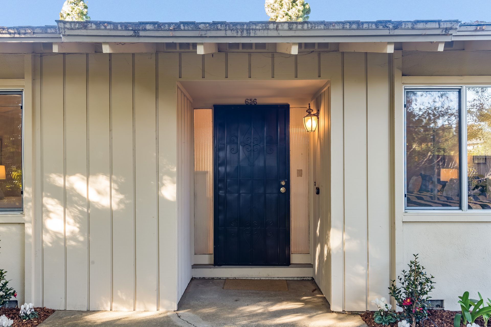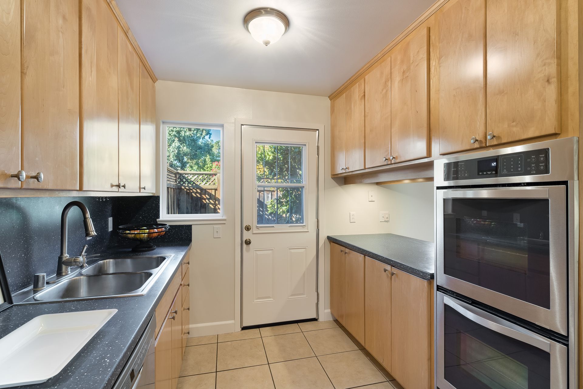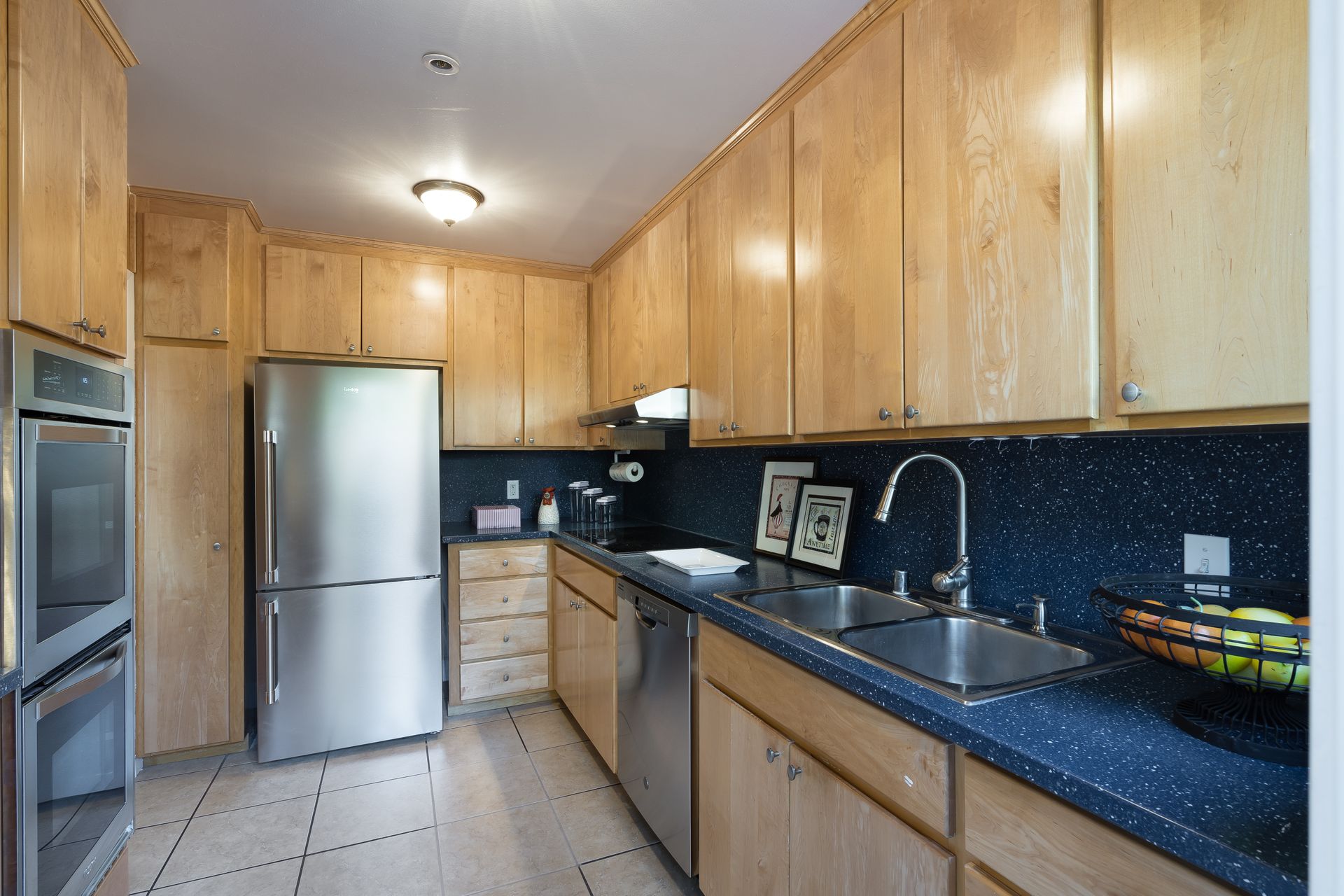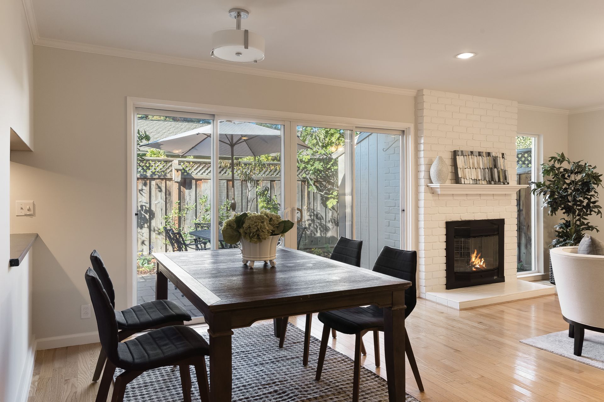This sparkling, one-story two bedroom, two bath condominium in the Mark Twain complex is convenient to shops and restaurants in downtown Los Altos as well as to San Antonio Center. The formal entry includes built-in shelves and cabinets and two entry closets. The kitchen has Corian counters with pass through to the dining area, tile floor, loads of storage and newly installed stainless steel appliances including a double oven, vent hood, refrigerator, dishwasher and induction range. The separate kitchen door opens to the patio. Enjoy the living-dining room combination with a sliding glass door opening to the spacious paver patio with a custom shed and mature fruit trees. Hardwood floors can be found throughout the livable areas and the bedrooms. The master bedroom includes a newer stall shower, toilet and a luxury vinyl tile floor. The hall bath has a pedestal sink, tub and newer medicine cabinet. There is a laundry area in the master suite with newer flooring as well. The complex includes a swimming pool, community garden, carport and open parking.