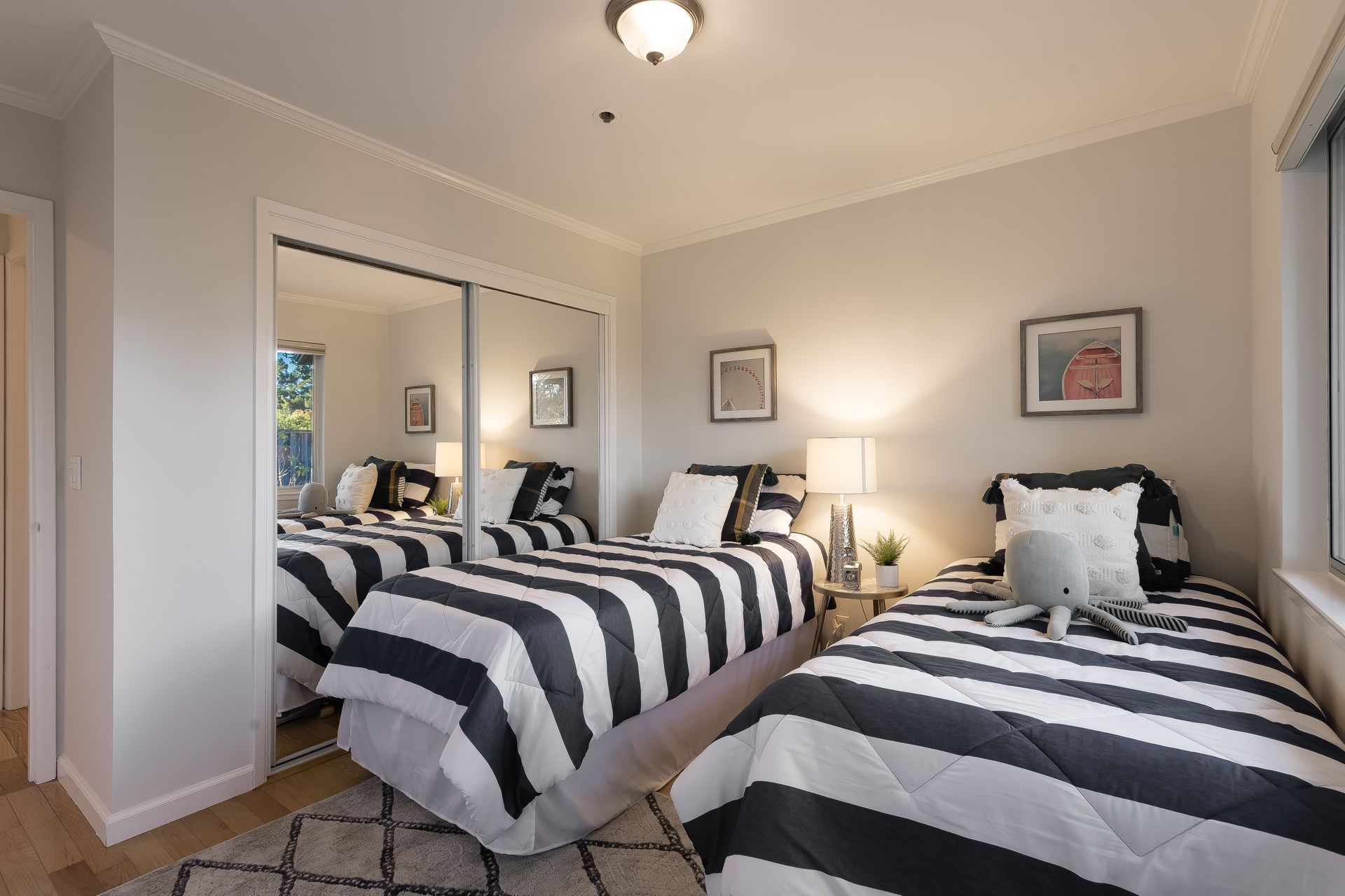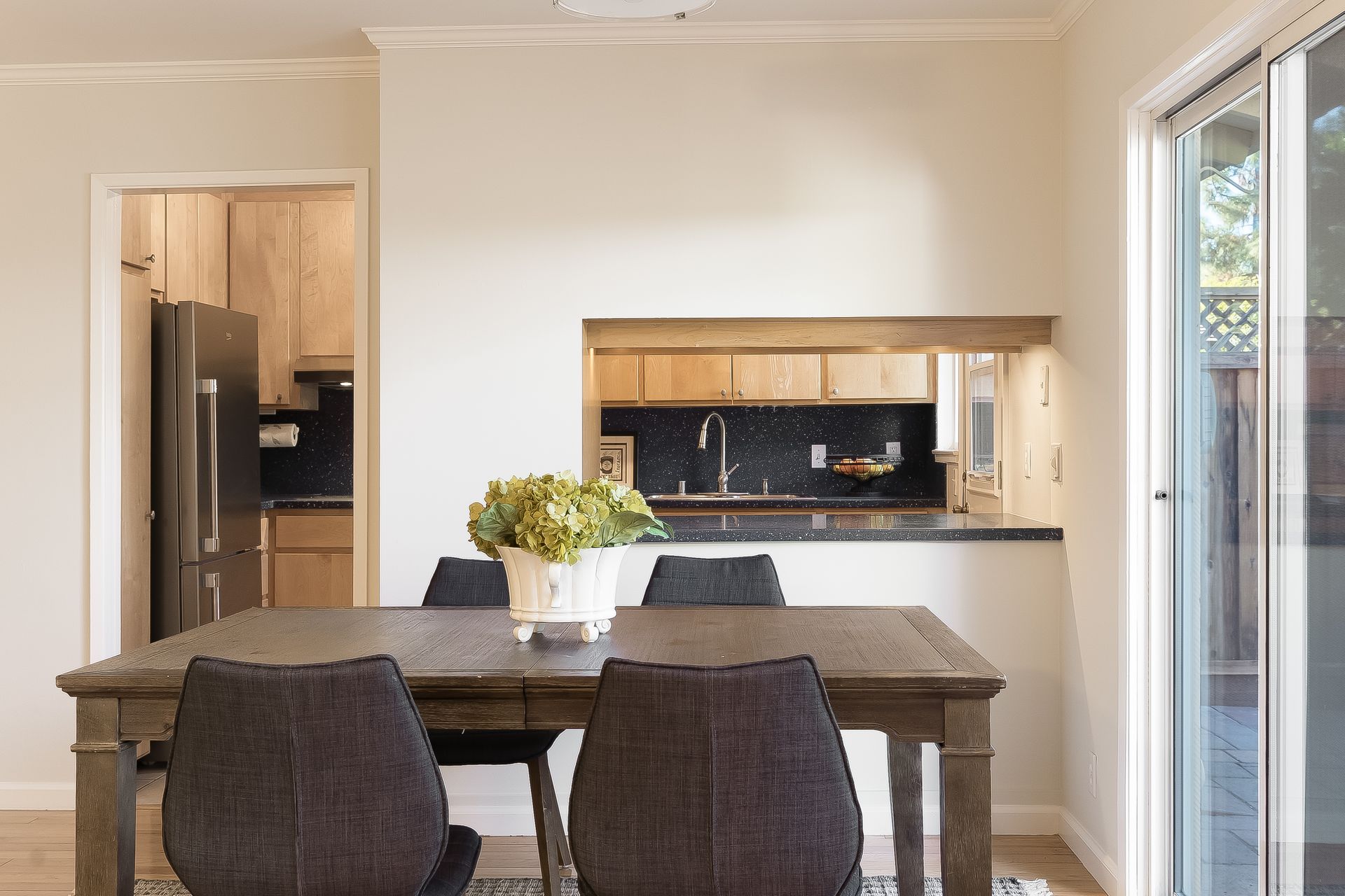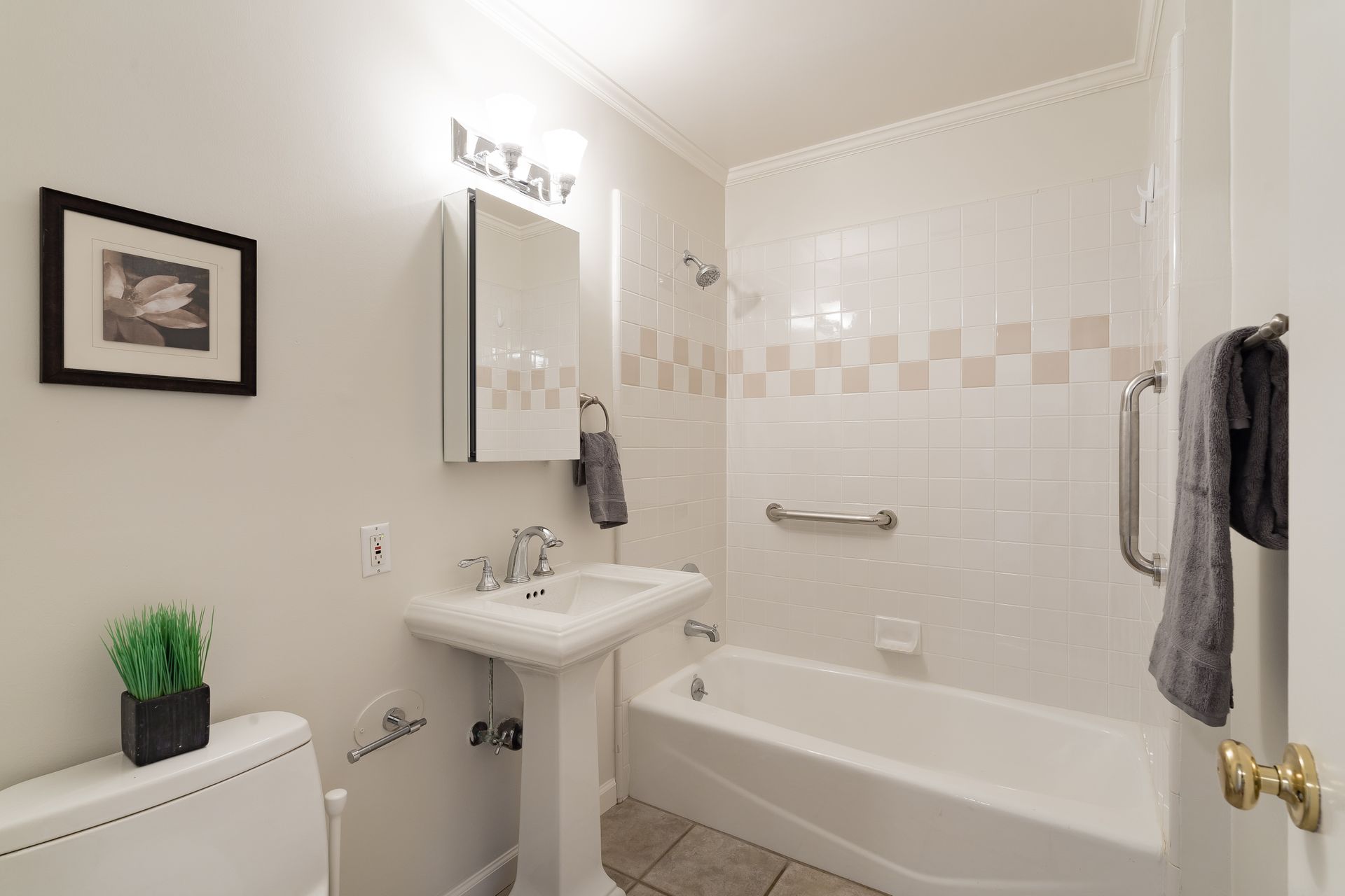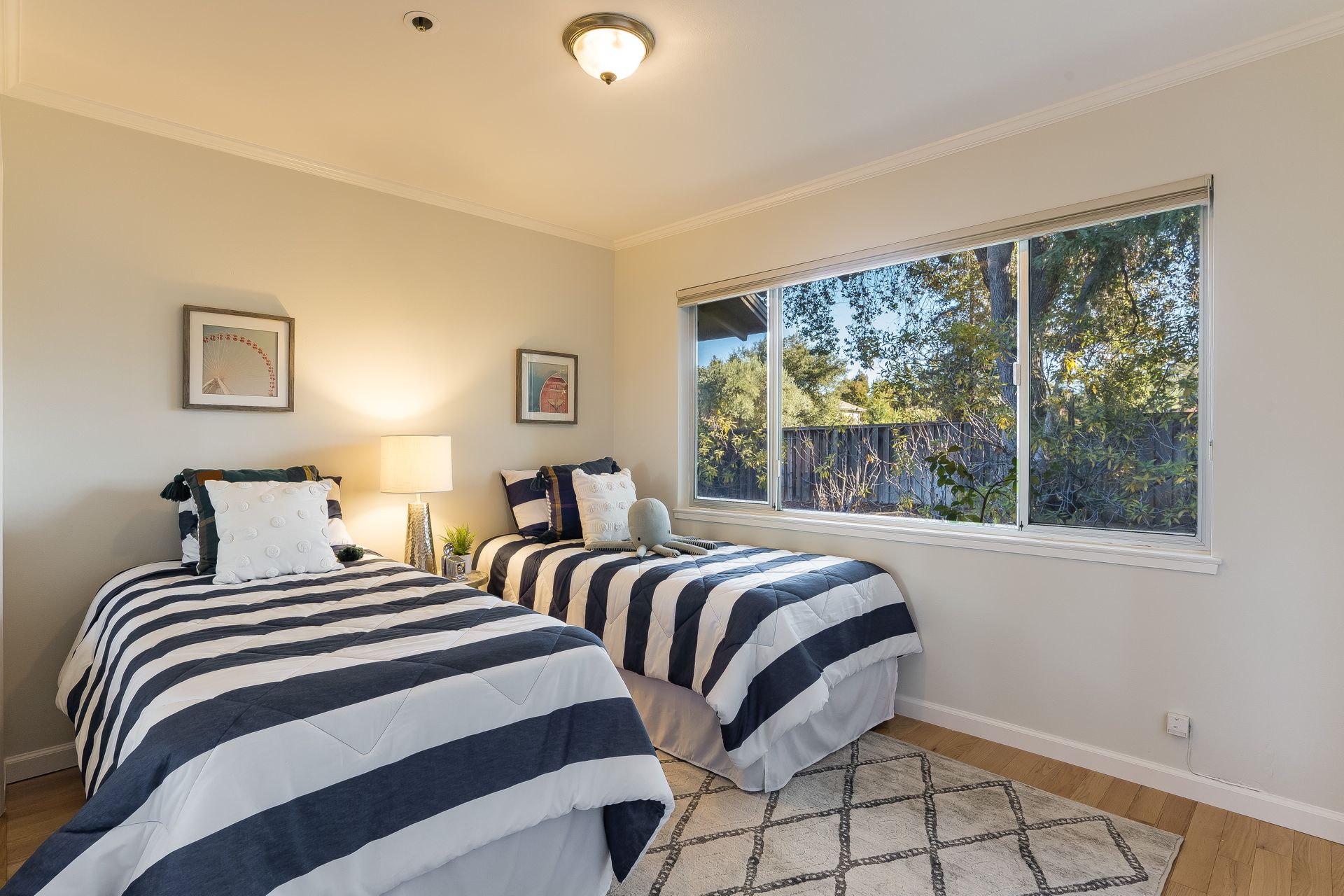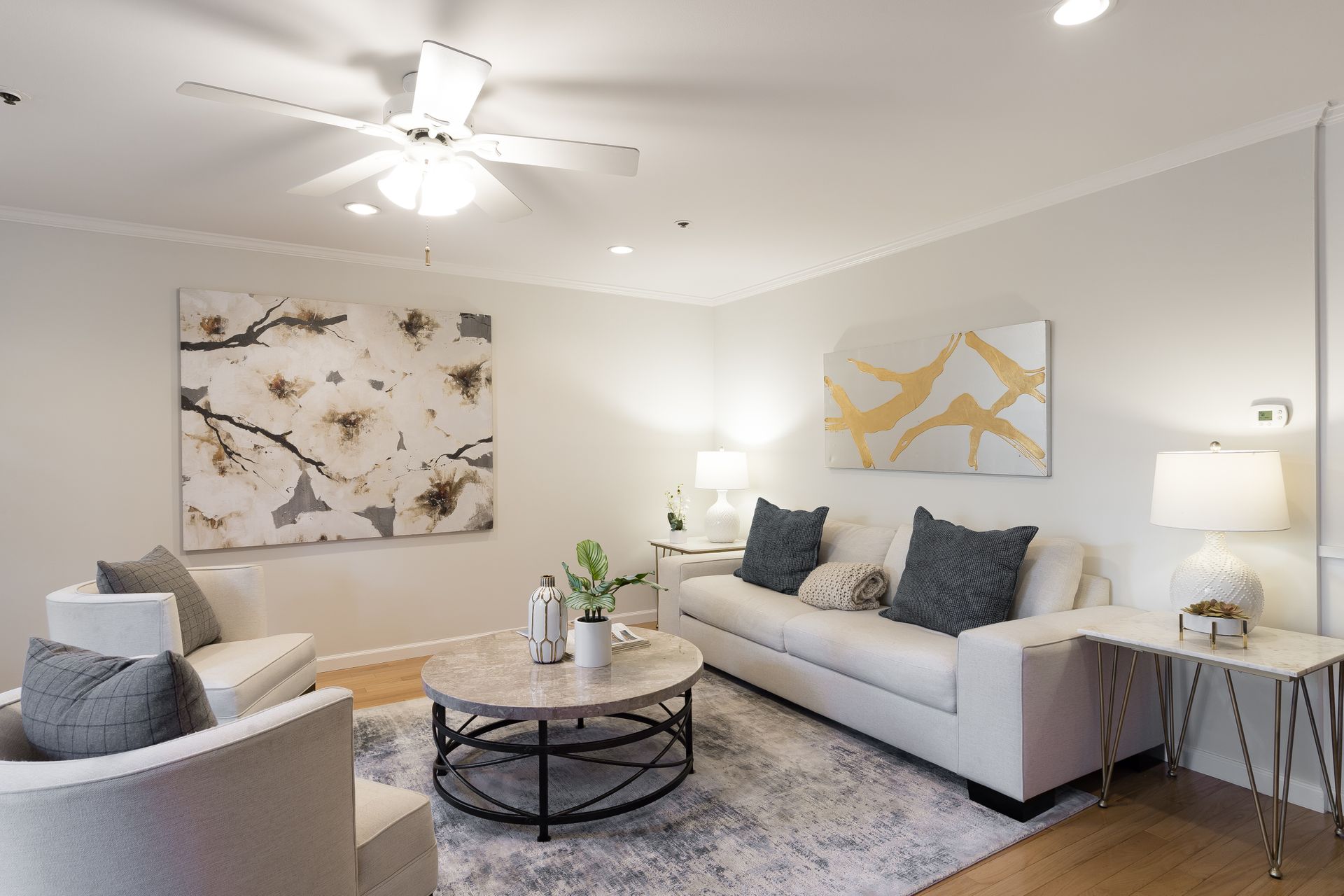 This sparkling, one-story two bedroom, two bath condominium in the Mark Twain complex is convenient to shops and restaurants in downtown Los Altos as well as to San Antonio Center. The formal entry includes built-in shelves and cabinets and two entry closets. The kitchen has Corian counters with pass through to the dining area, tile floor, loads of storage and newly installed stainless steel appliances including a double oven, vent hood, refrigerator, dishwasher and induction range. The separate kitchen door opens to the patio. Enjoy the living-dining room combination with a sliding glass door opening to the spacious paver patio with a custom shed and mature fruit trees. Hardwood floors can be found throughout the livable areas and the bedrooms. The master bedroom includes a newer stall shower, toilet and a luxury vinyl tile floor. The hall bath has a pedestal sink, tub and newer medicine cabinet. There is a laundry area in the master suite with newer flooring as well. The complex includes a swimming pool, community garden, carport and open parking.