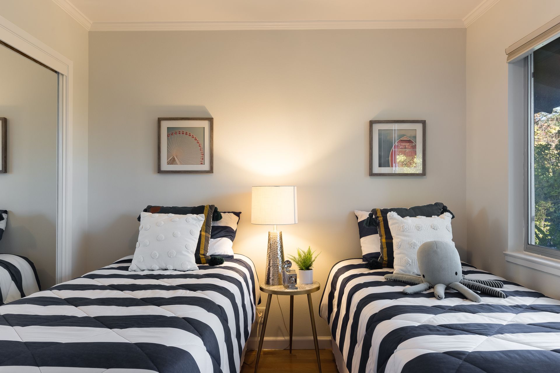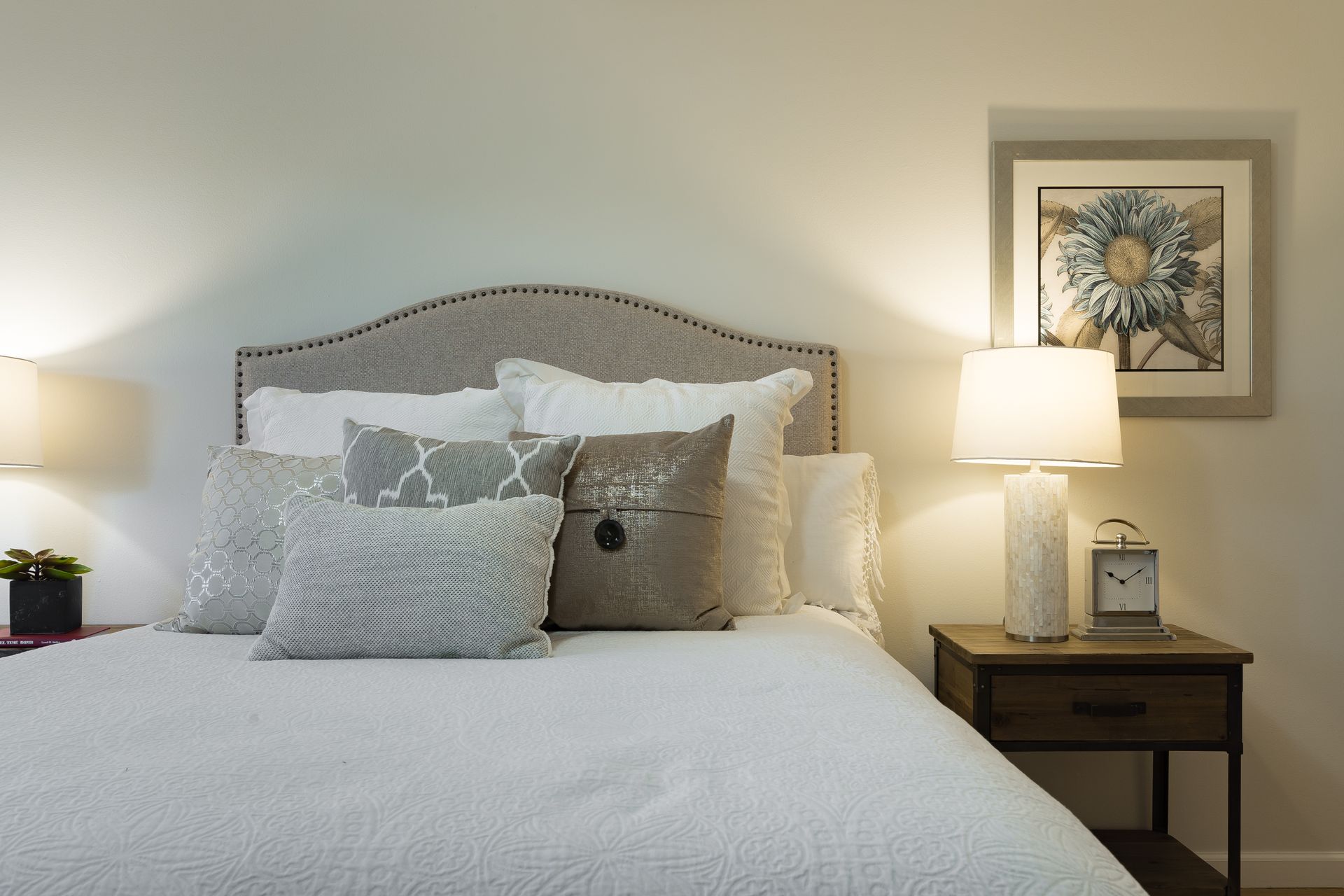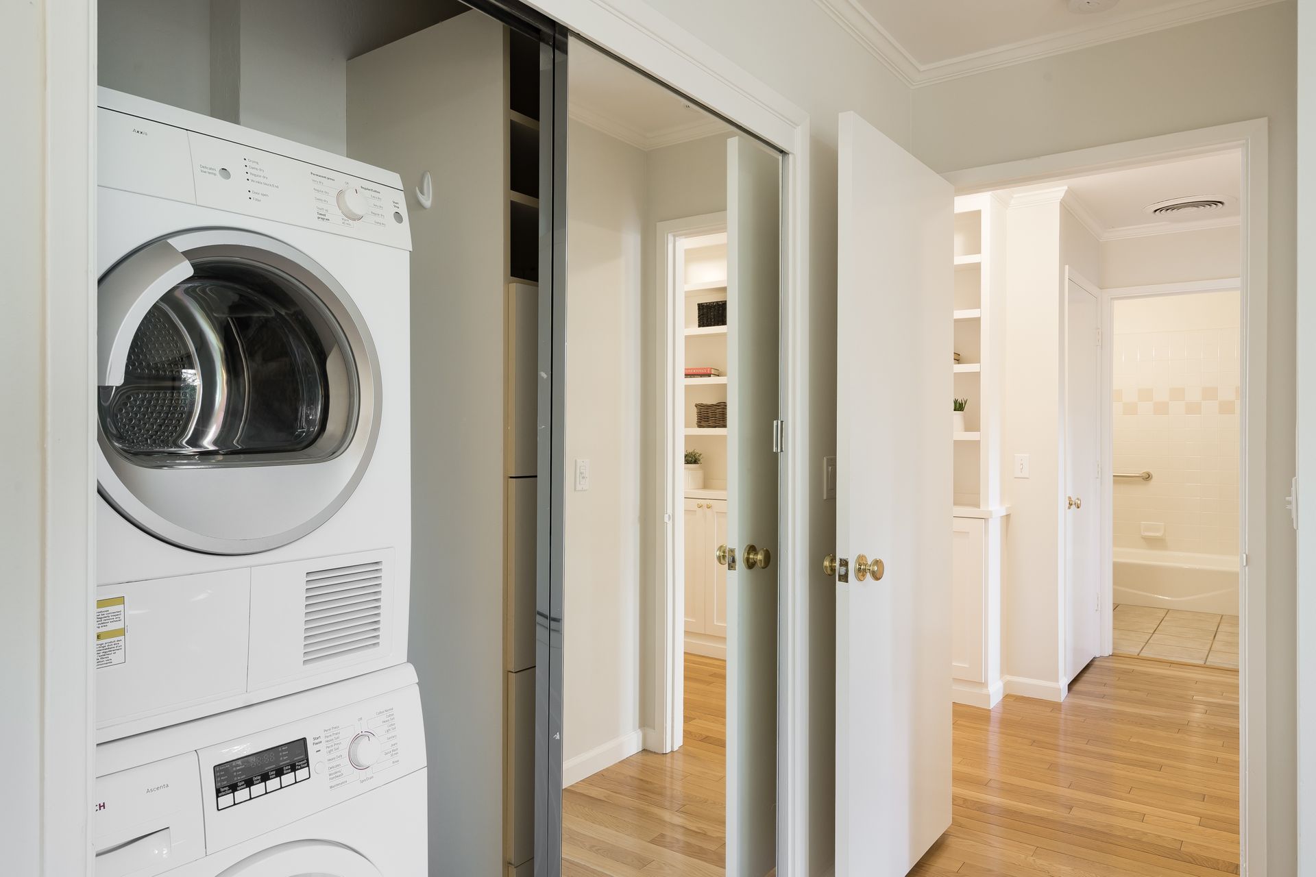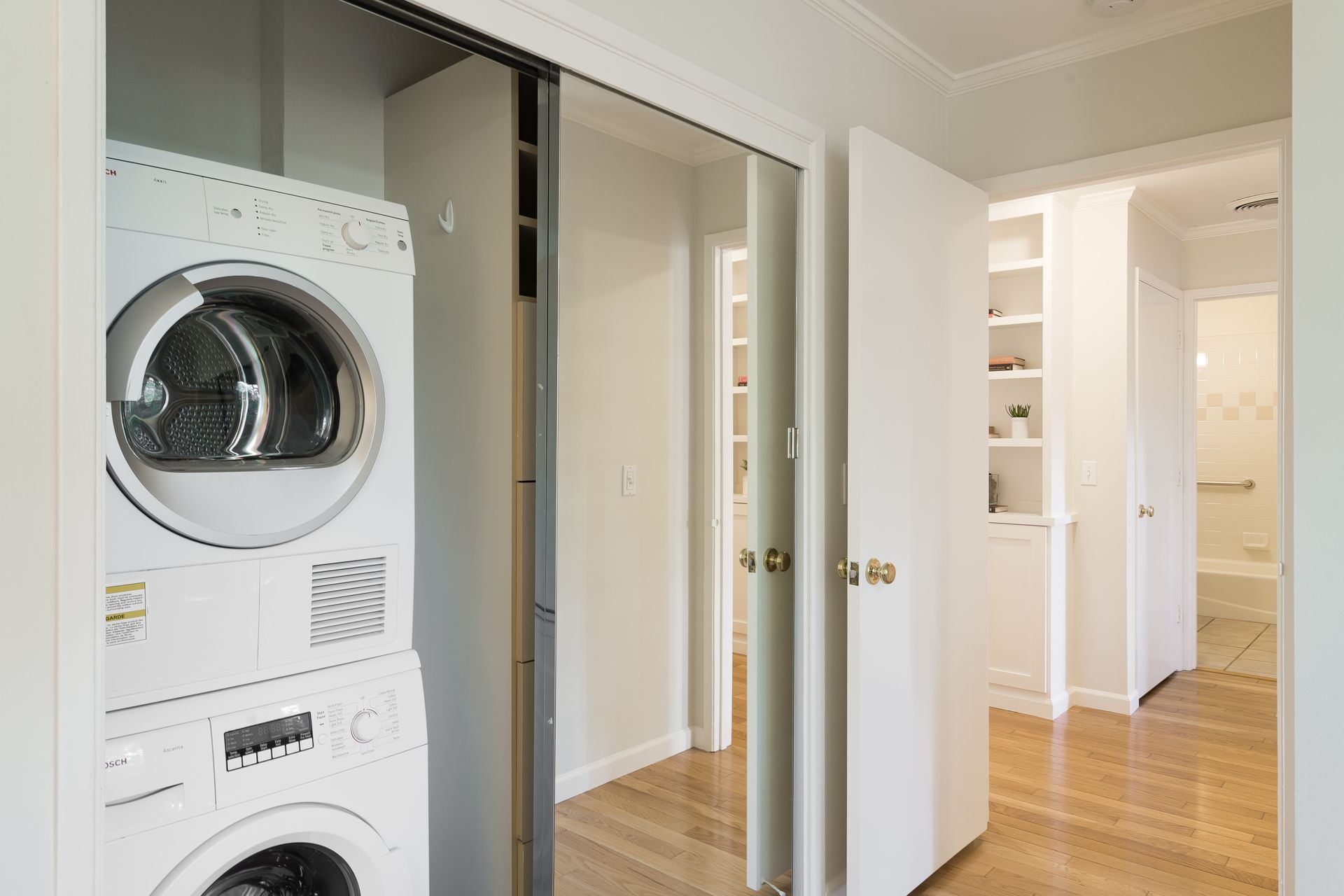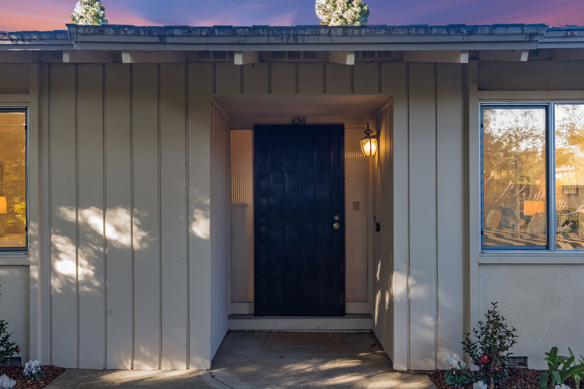 This sparkling, one-story two bedroom, two bath condominium in the Mark Twain complex is convenient to shops and restaurants in downtown Los Altos as well as to San Antonio Center. The formal entry includes built-in shelves and cabinets and two entry closets. The kitchen has Corian counters with pass through to the dining area, tile floor, loads of storage and newly installed stainless steel appliances including a double oven, vent hood, refrigerator, dishwasher and induction range. The separate kitchen door opens to the patio. Enjoy the living-dining room combination with a sliding glass door opening to the spacious paver patio with a custom shed and mature fruit trees. Hardwood floors can be found throughout the livable areas and the bedrooms. The master bedroom includes a newer stall shower, toilet and a luxury vinyl tile floor. The hall bath has a pedestal sink, tub and newer medicine cabinet. There is a laundry area in the master suite with newer flooring as well. The complex includes a swimming pool, community garden, carport and open parking.
