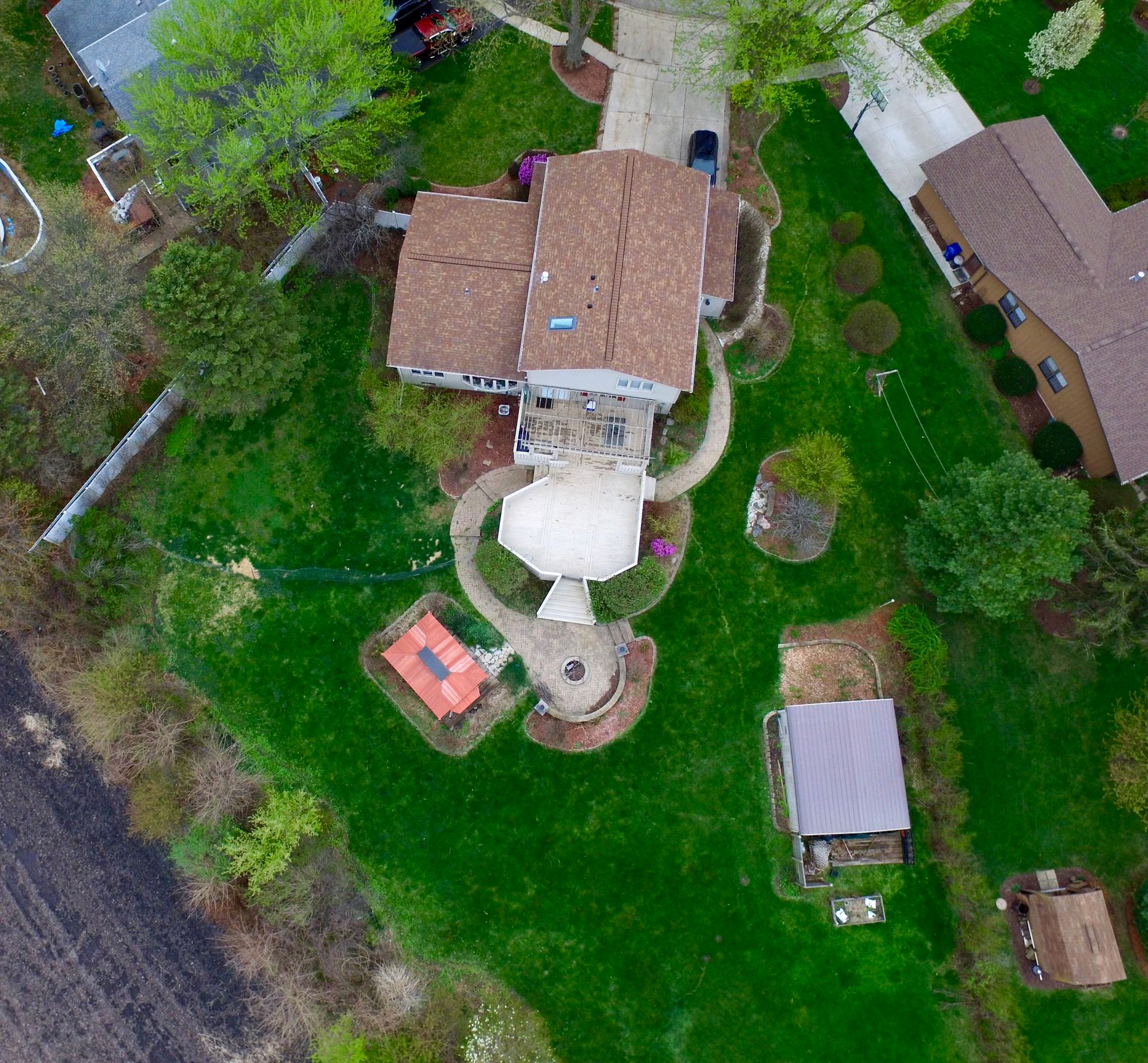 Stepping down into the Family Room and through the atrium doors, will lead you to the huge 2-tier Deck with Pergola, Brick Paver Patio, Fire Pit, Brick Sitting Area and Walkways. Also outdoors is a Garden Shed with Overhead Door and enclosed Gazebo with bench seating.