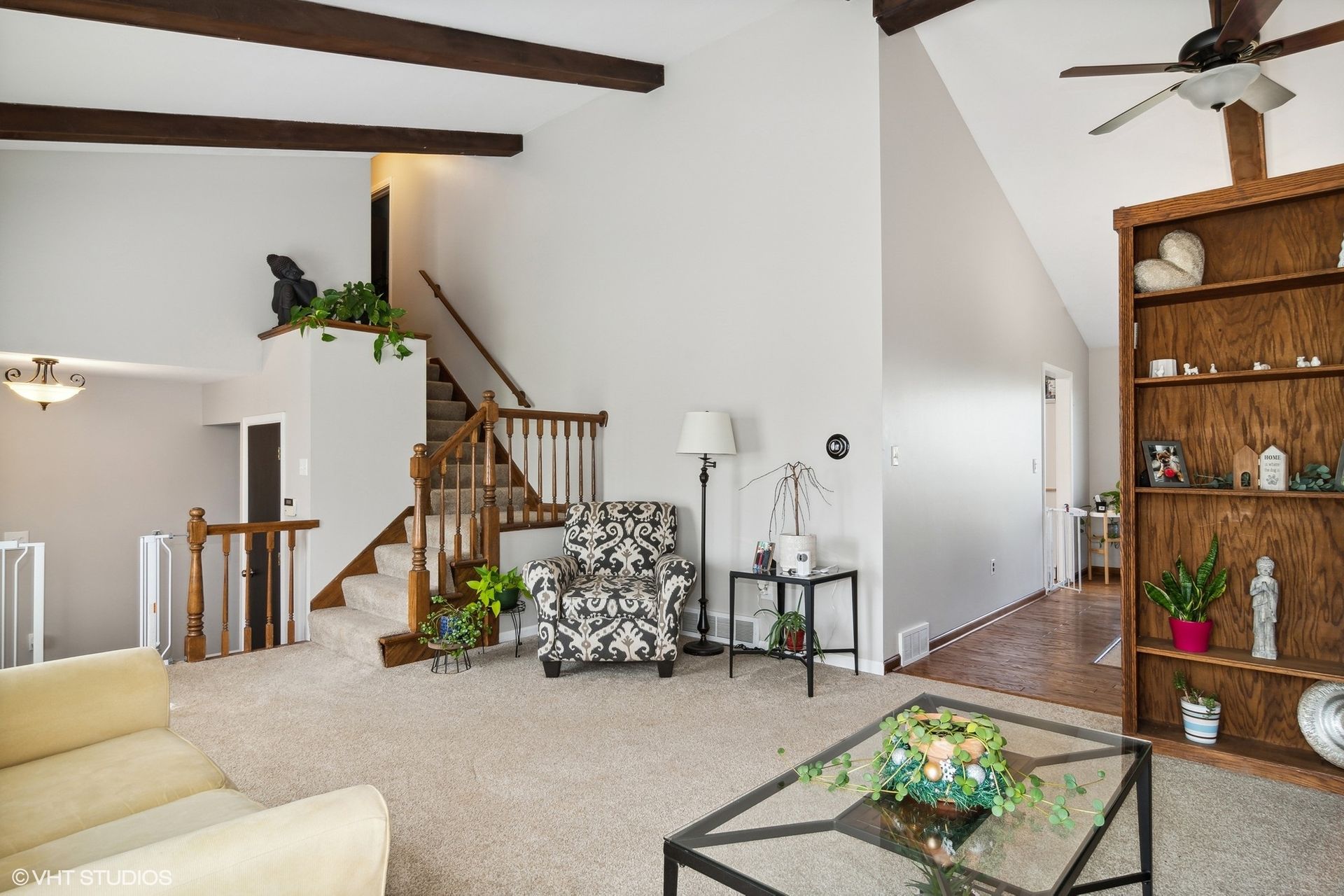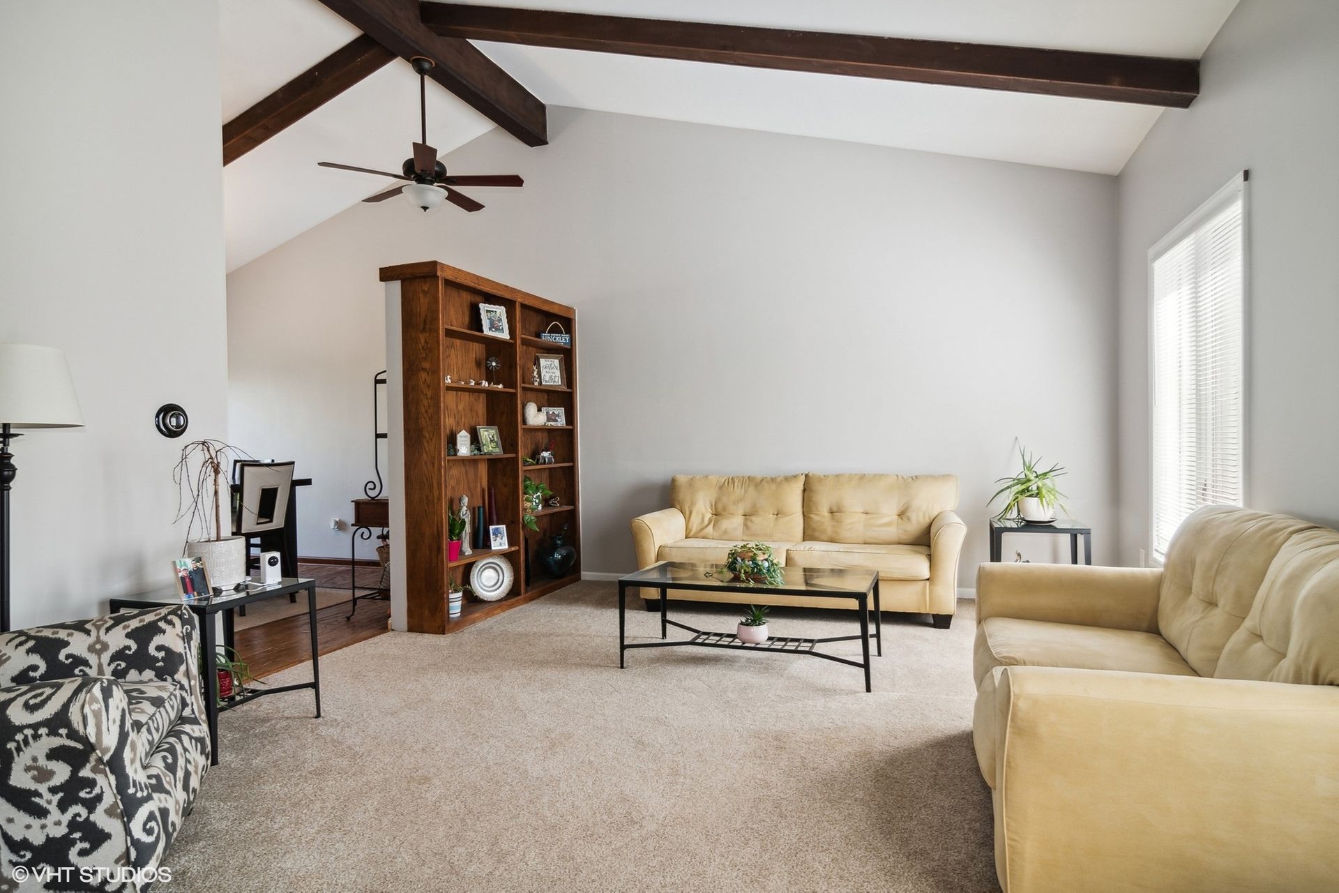 Upon entry to the right, you are greeted with lovely Formal Living Room offering beamed vaulted ceilings and built-in bookshelves.