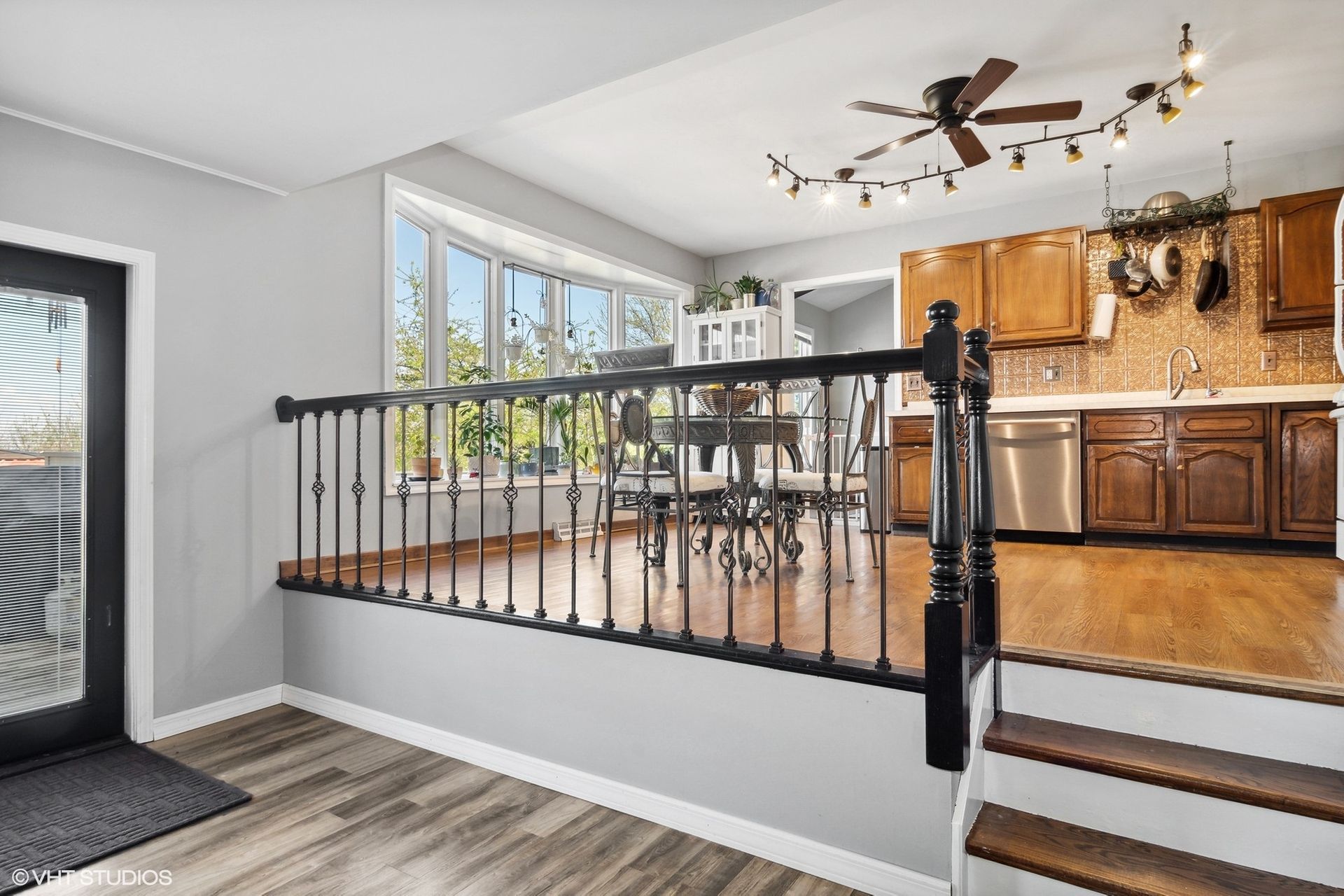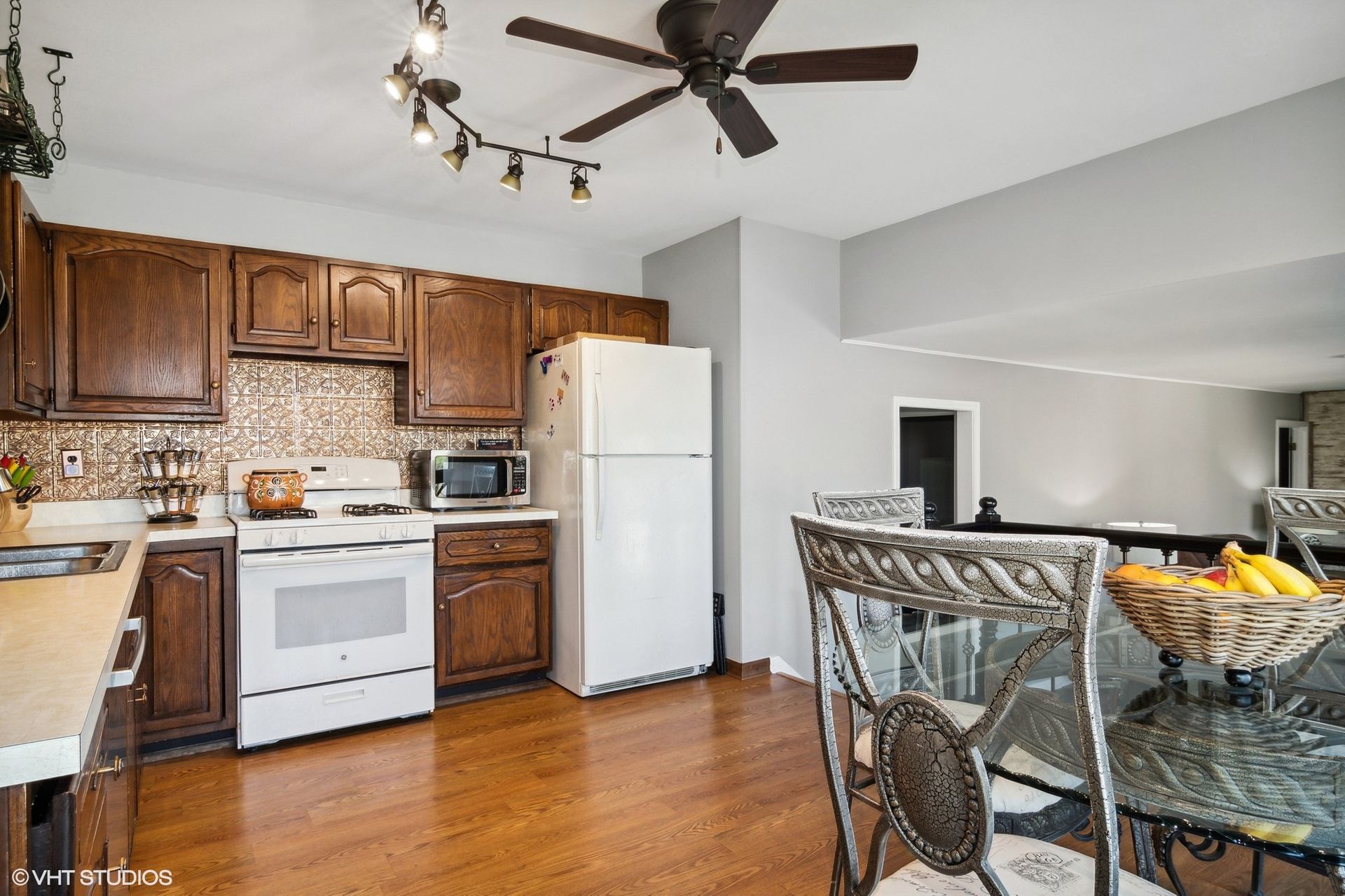 This, then, will take you into the Dining room, which also offers beamed ceilings and hardwood floors. The Kitchen offers plenty of space for a big table, a Reverse Osmosis Filtration System, Pantry and a big Bay Window that overlooks the amazing Backyard.