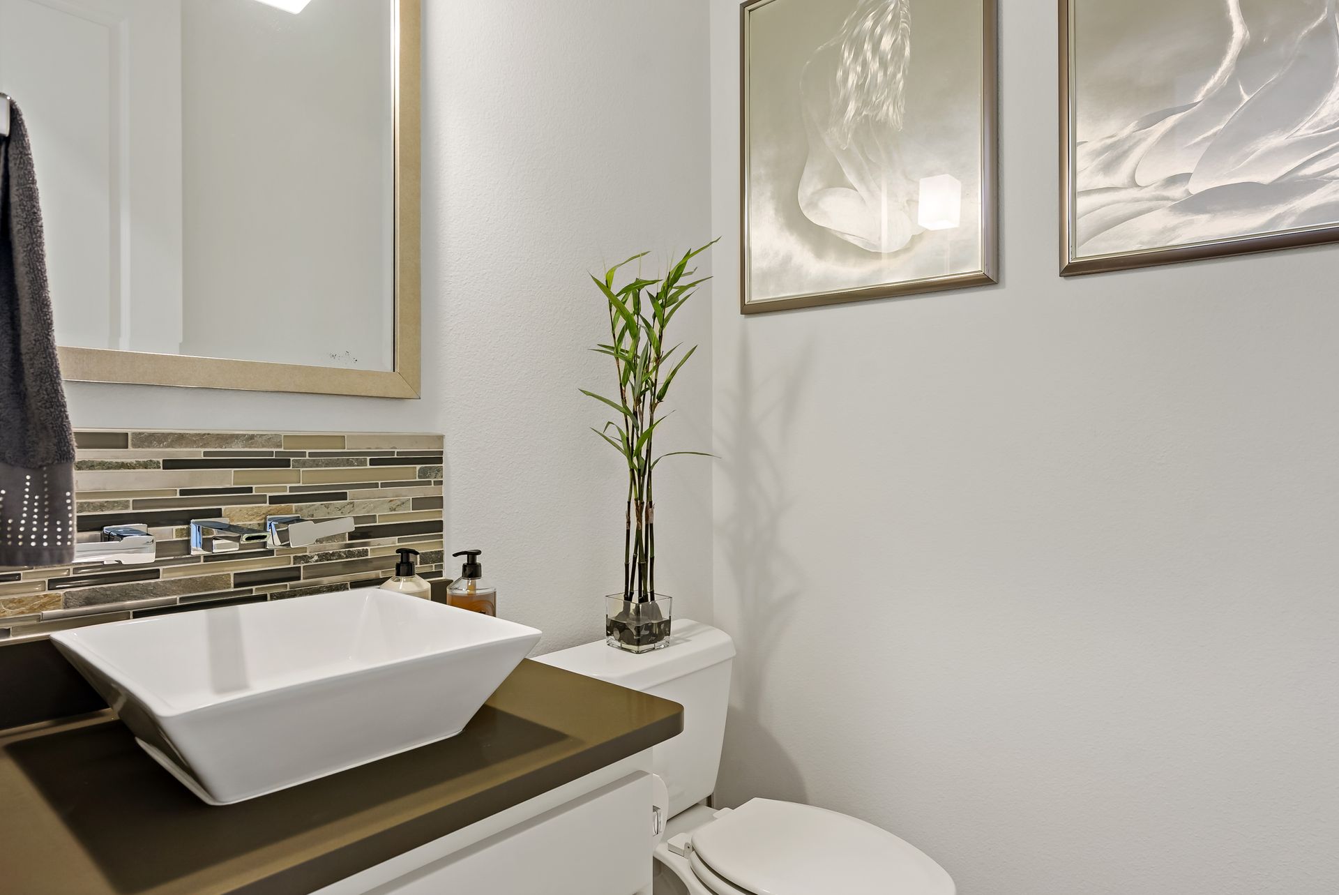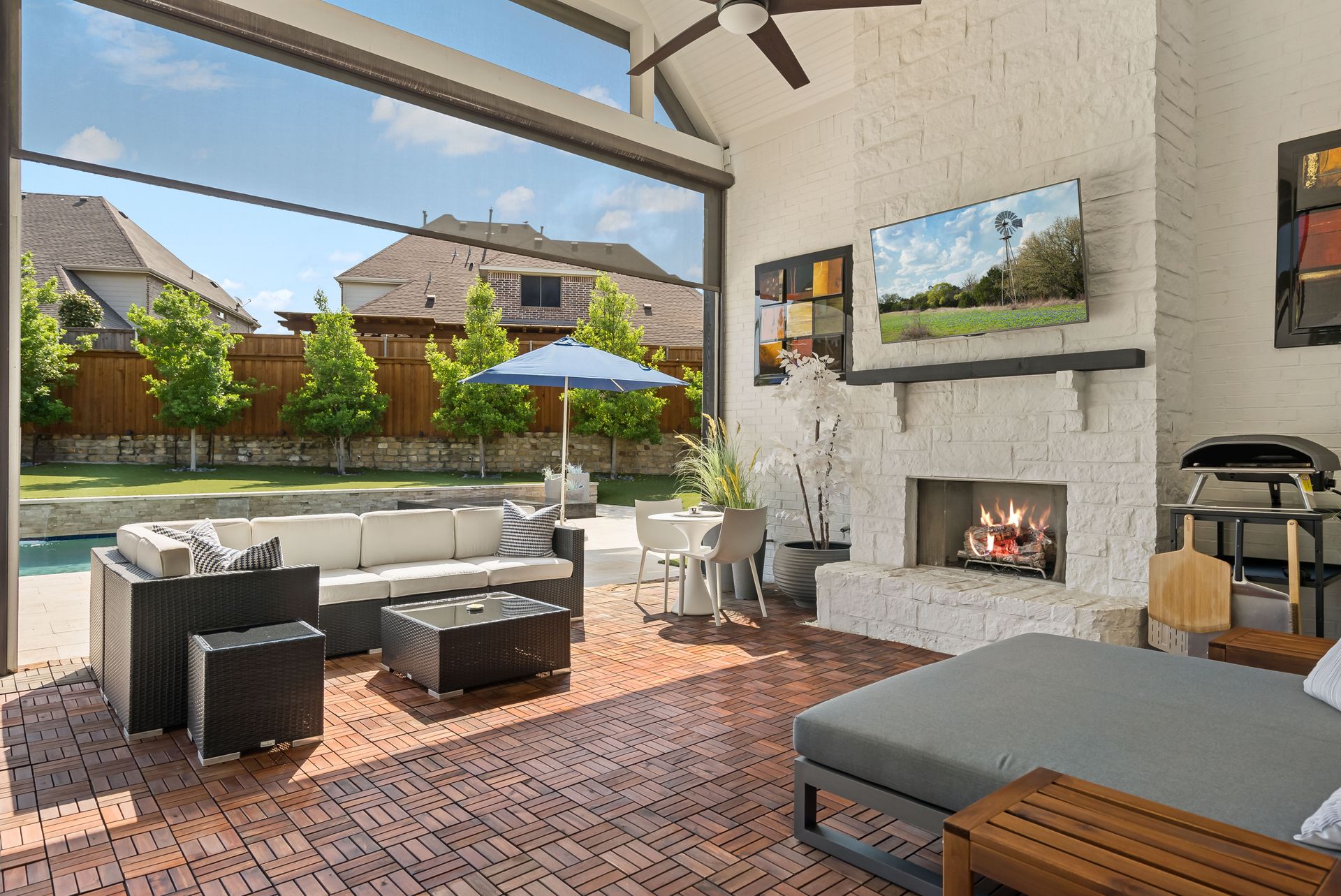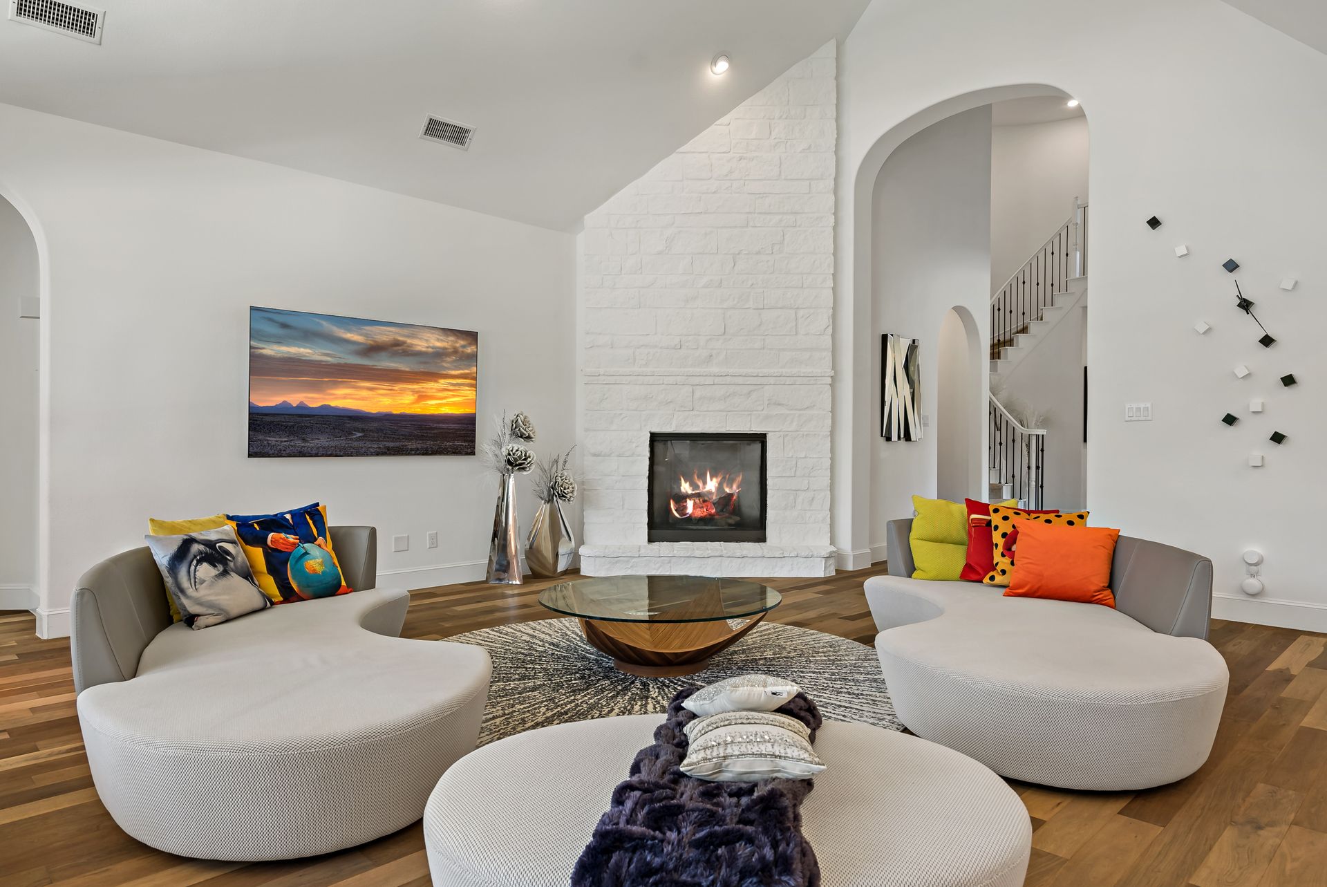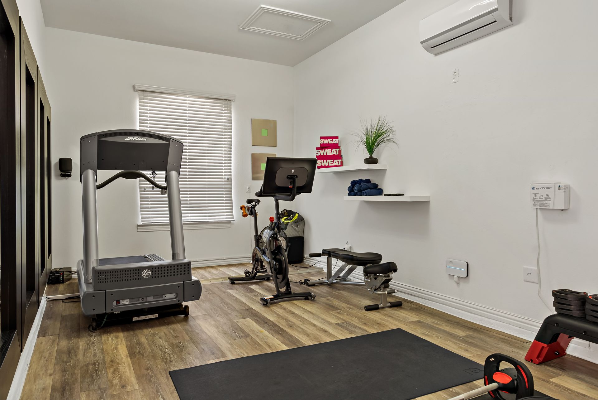 The backyard is beyond stunning with an oversized covered patio complete with a fireplace and a remote screen that helps in keeping those pesky bugs out. The modern lap pool with spa and completely turfed backyard complete with a tree lined perimeter, extra shade cover and lounge deck just beg you to come play and relax! The home also features a three car garage with extra parking space complete with a gated porte cochere. However the third garage space has been converted to a home gym with it's own separate AC Unit. **please note** This space can be easily changed back if needed but it is a great use of space not included in the current square footage.