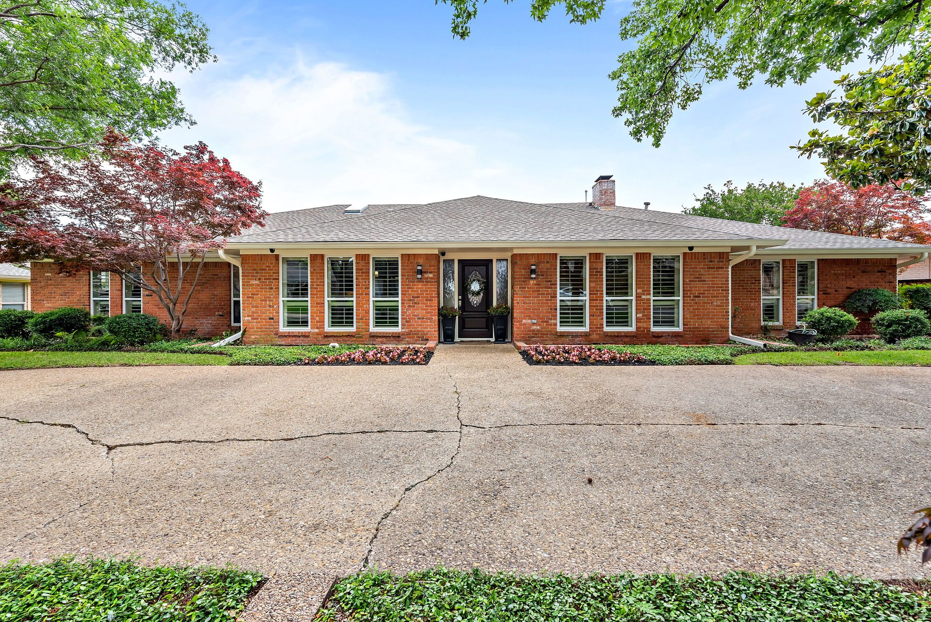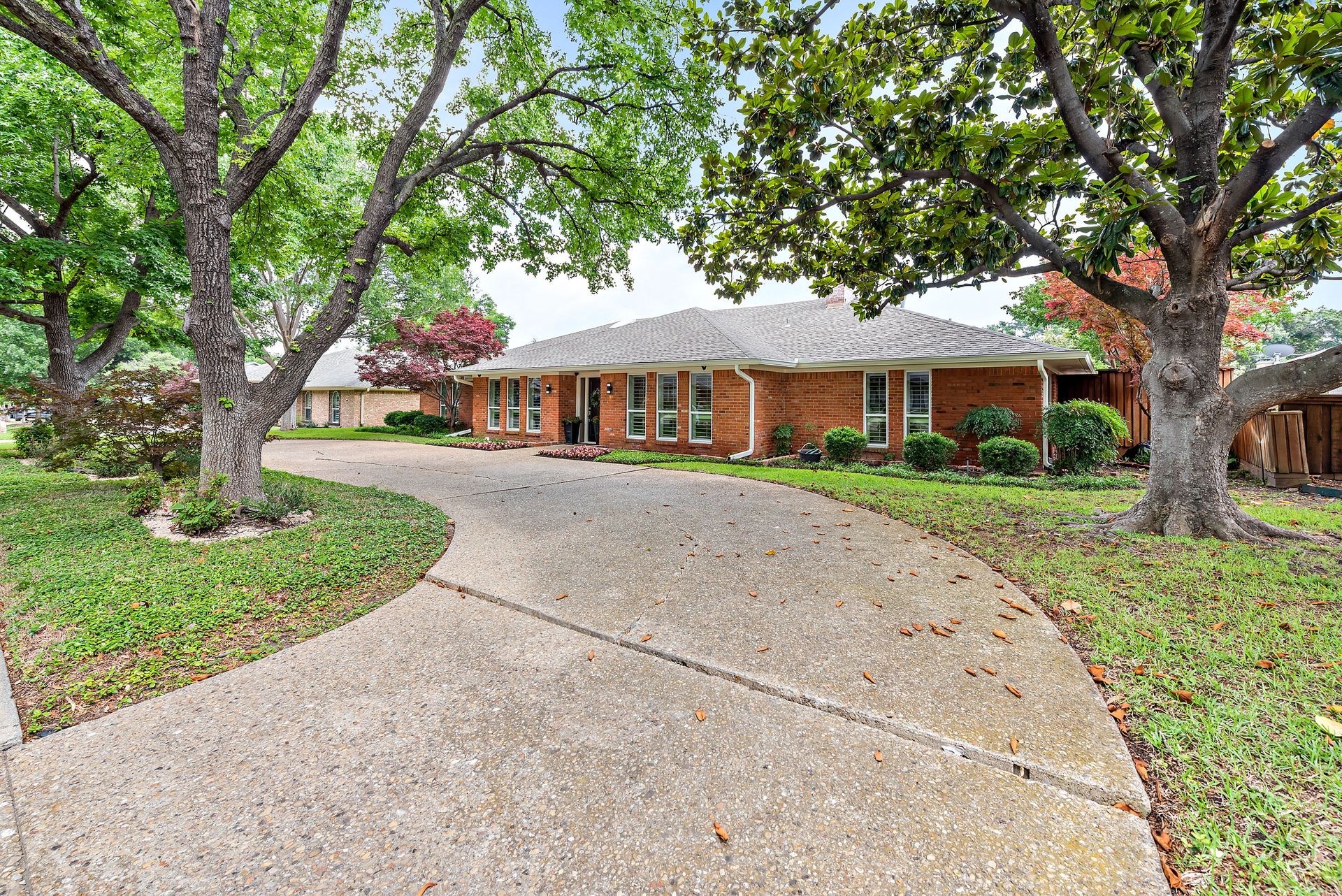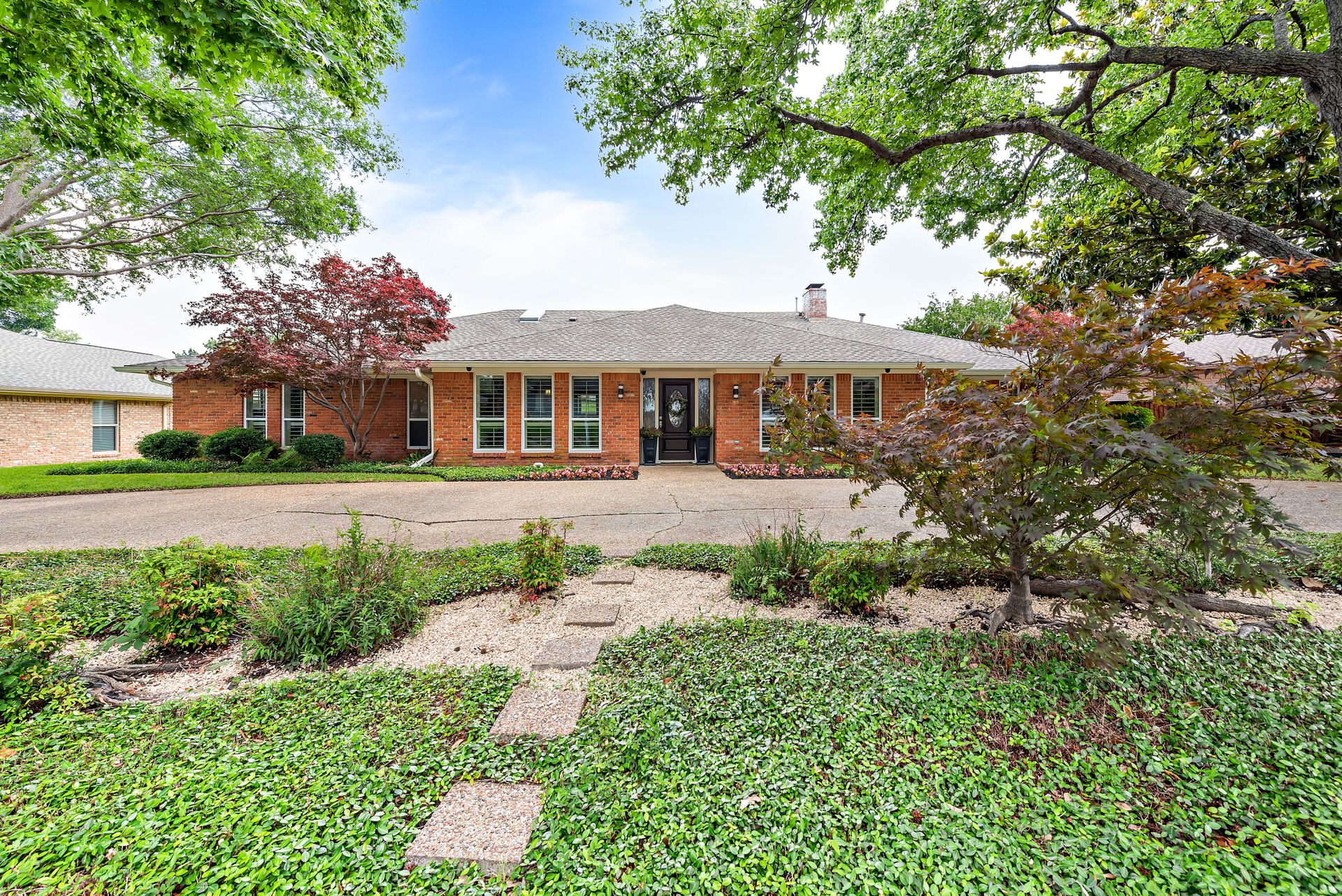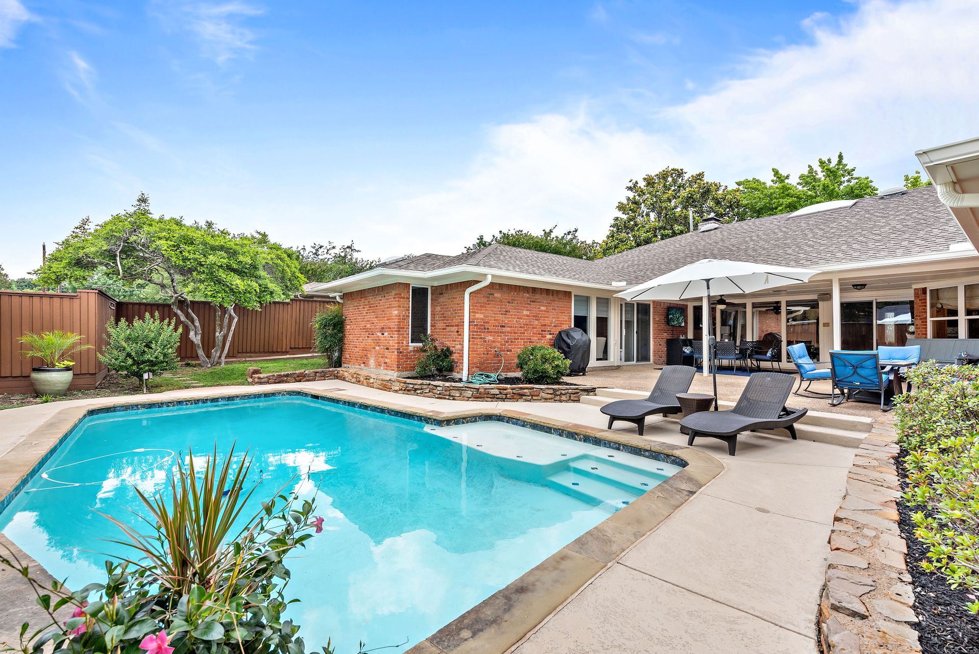 Gorgeous four bedroom, three and one half bath Ranch style home on shaded interior lot with beautiful established trees and lush landscaping in prime north Dallas location. Semi-circle drive with additional three car garage in back. Home features an open and bright living room with high pitched ceiling, wood flooring, and wet-bar great for entertaining. Large second living area that can be used as game area or workout room. Upgraded modern kitchen with eat in breakfast area, featuring stainless steel appliances, double oven, Induction range and second dishwasher in utility room off kitchen. Primary bedroom boast beautiful views of the oversized covered patio and sparkling blue pool. Includes updated ensuite with large glass seamless shower, jetted tub and double vanity with medicine cabinet. Do not miss out on the opportunity to live in sought after Prestonwood neighborhood and enjoy the convenient location of the neighborhood with easy access to LBJ, DNT, top Dallas private and public schools. Faces North!
