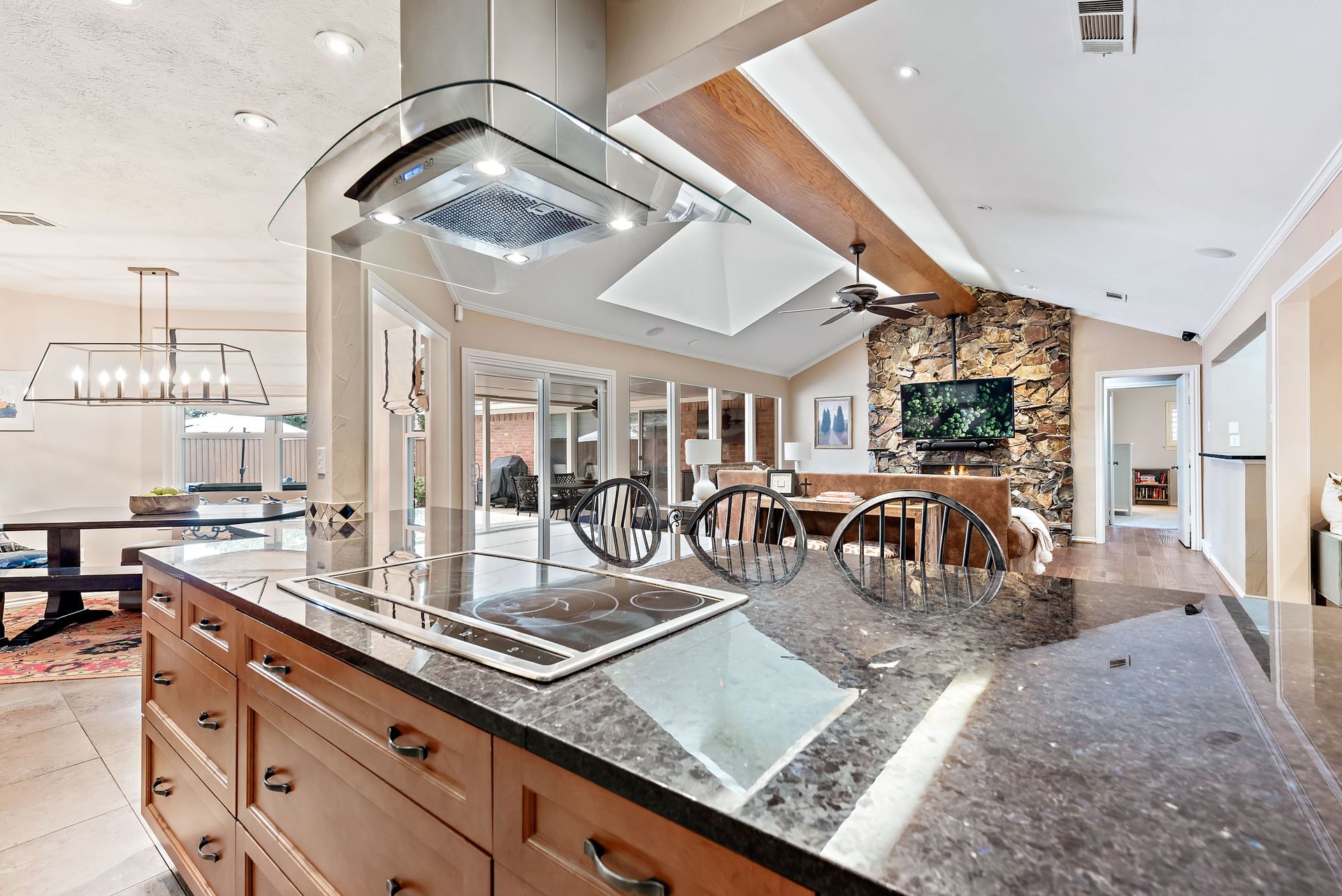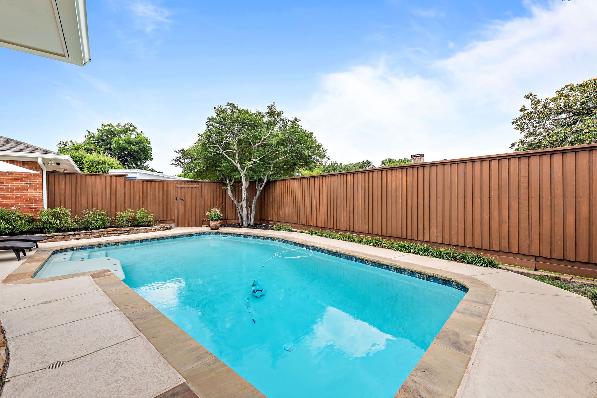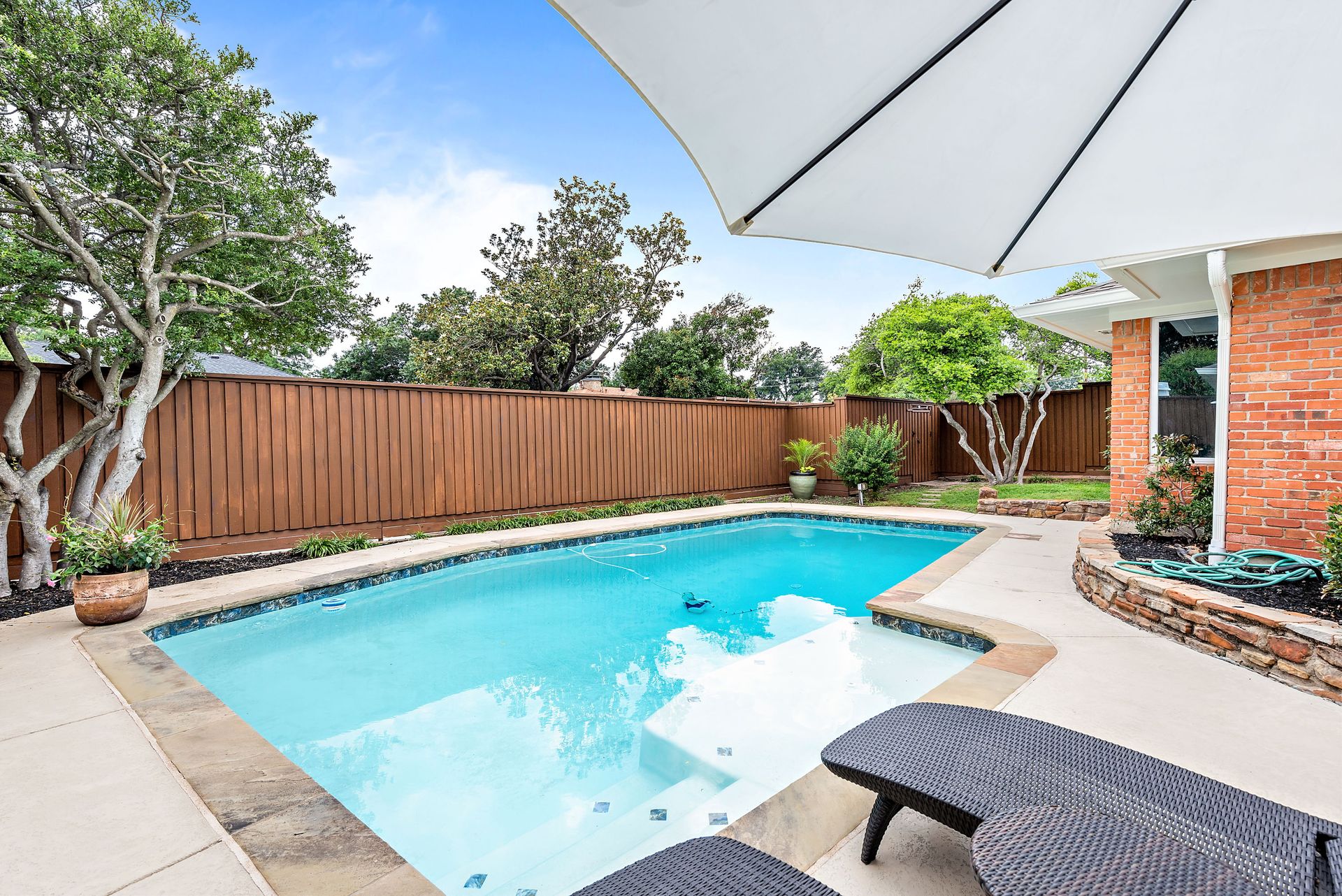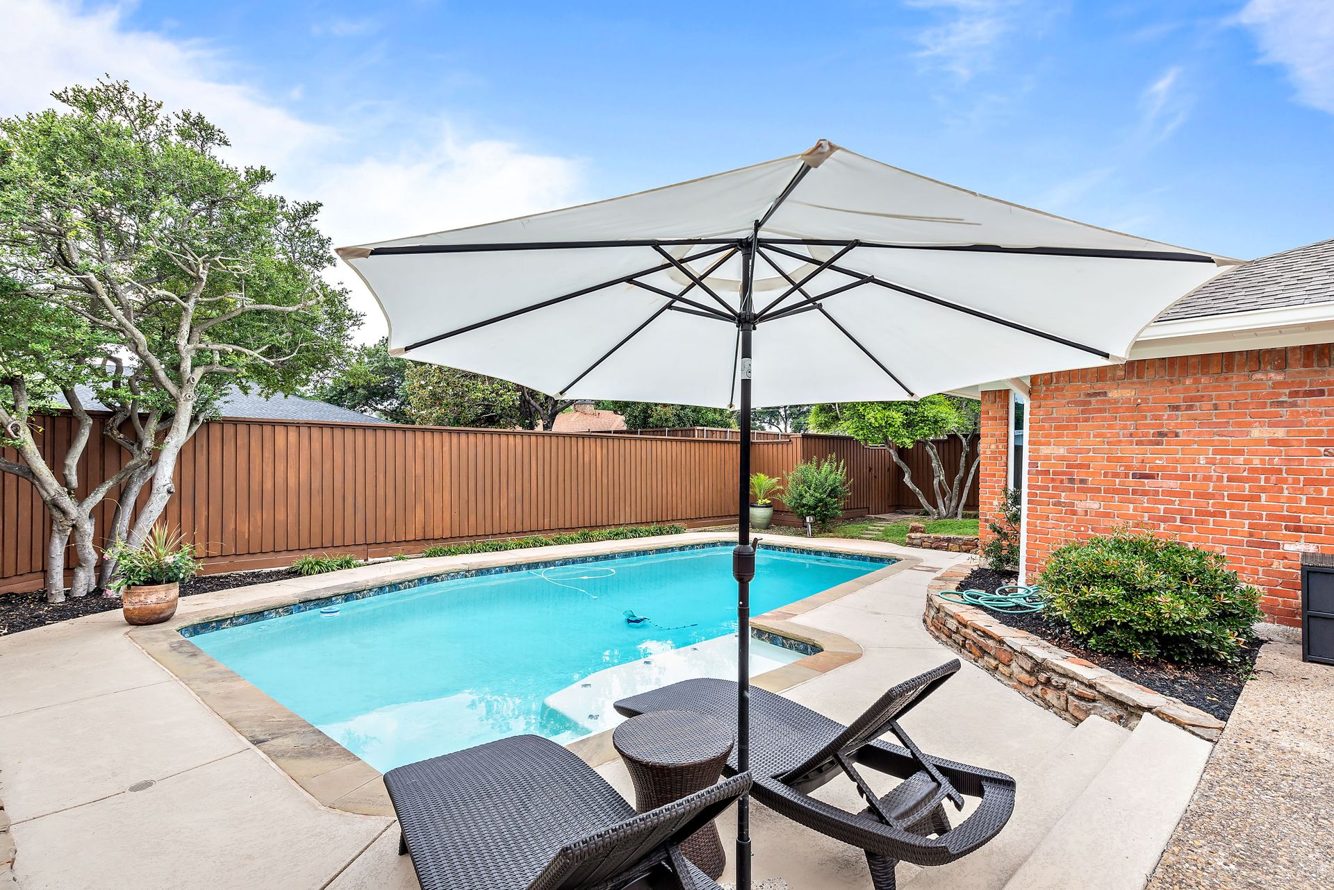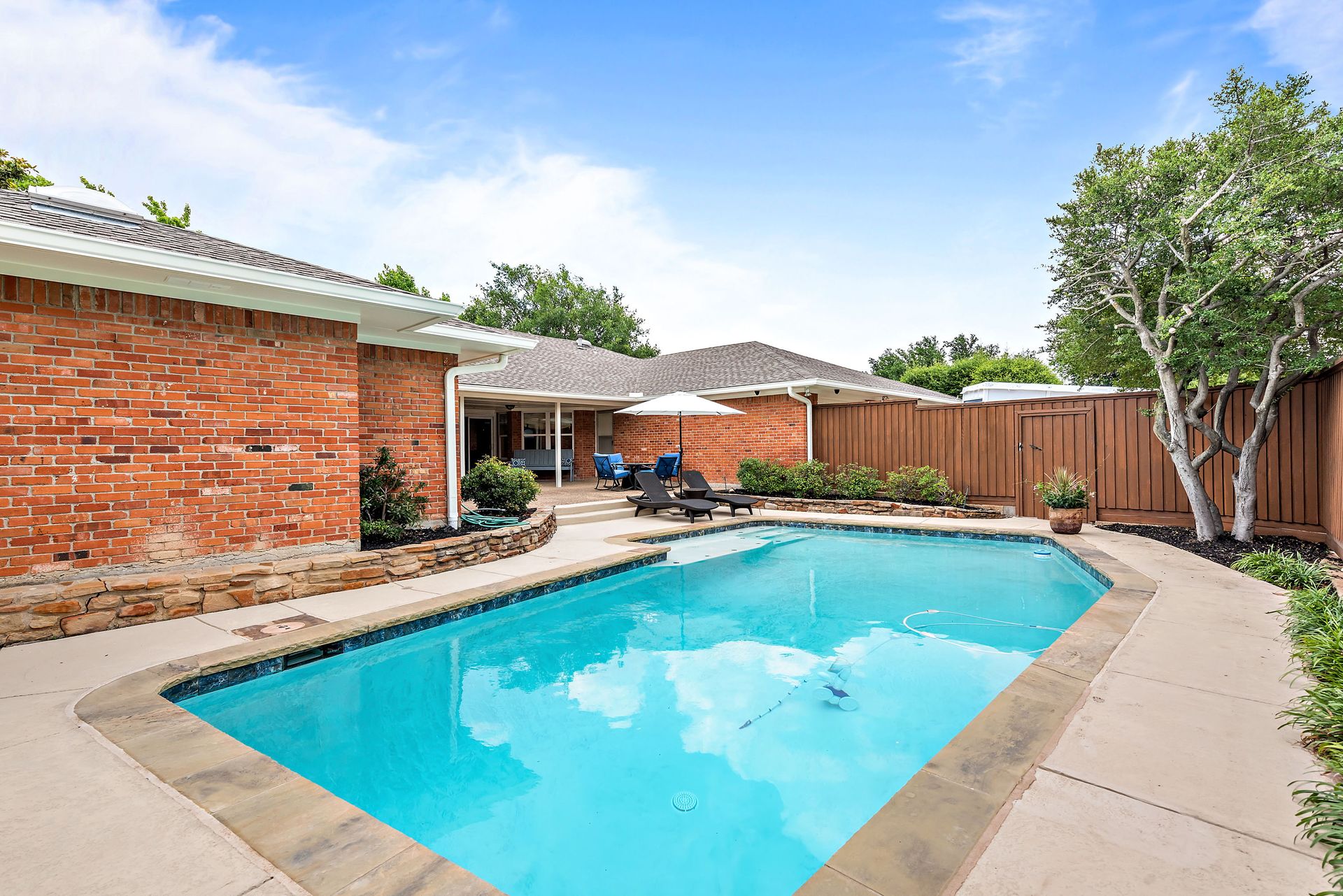 Gorgeous four bedroom, three and one half bath Ranch style home on shaded interior lot with beautiful established trees and lush landscaping in prime north Dallas location. Semi-circle drive with additional three car garage in back. Home features an open and bright living room with high pitched ceiling, wood flooring, and wet-bar great for entertaining. Large second living area that can be used as game area or workout room. Upgraded modern kitchen with eat in breakfast area, featuring stainless steel appliances, double oven, Induction range and second dishwasher in utility room off kitchen. Primary bedroom boast beautiful views of the oversized covered patio and sparkling blue pool. Includes updated ensuite with large glass seamless shower, jetted tub and double vanity with medicine cabinet. Do not miss out on the opportunity to live in sought after Prestonwood neighborhood and enjoy the convenient location of the neighborhood with easy access to LBJ, DNT, top Dallas private and public schools. Faces North!