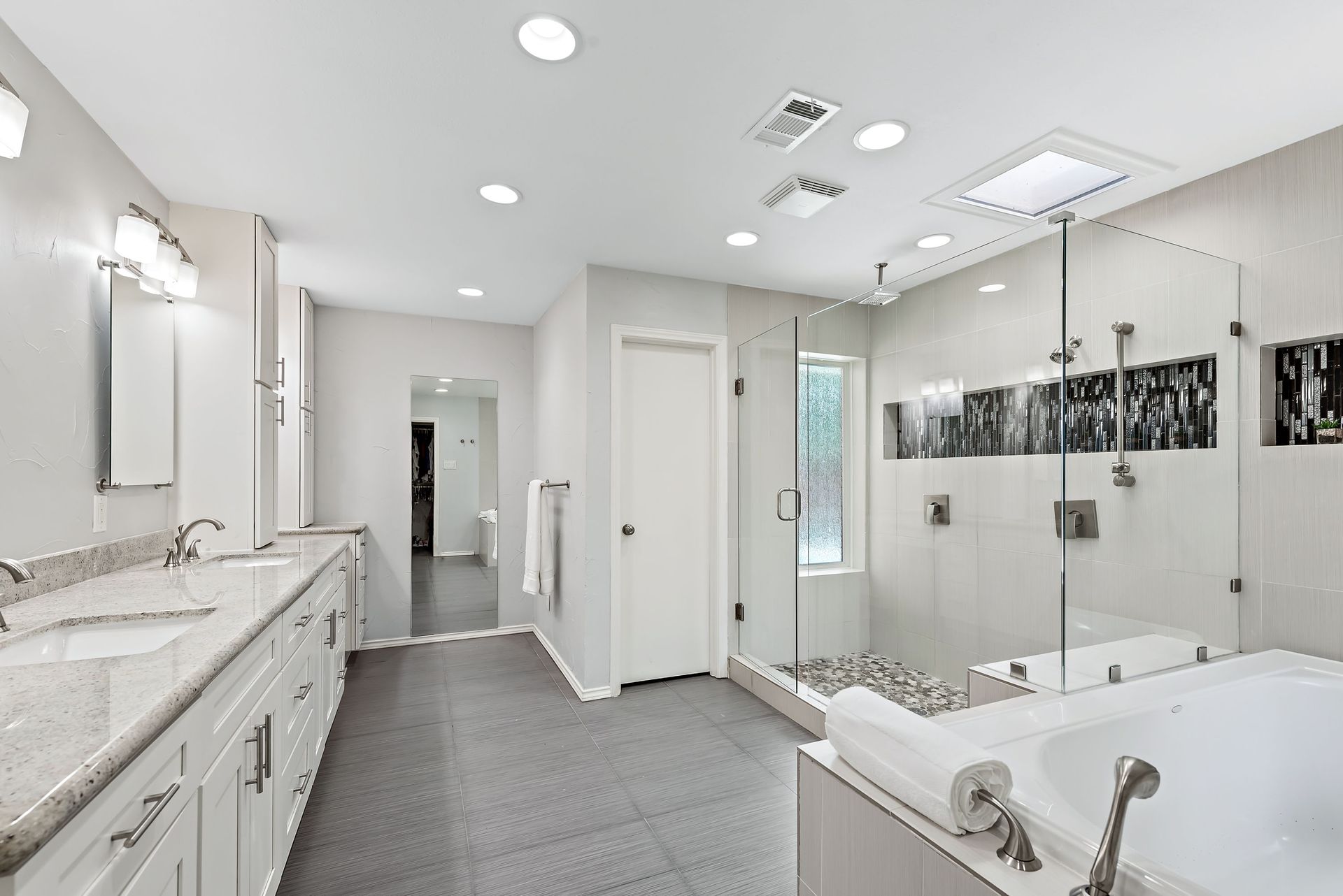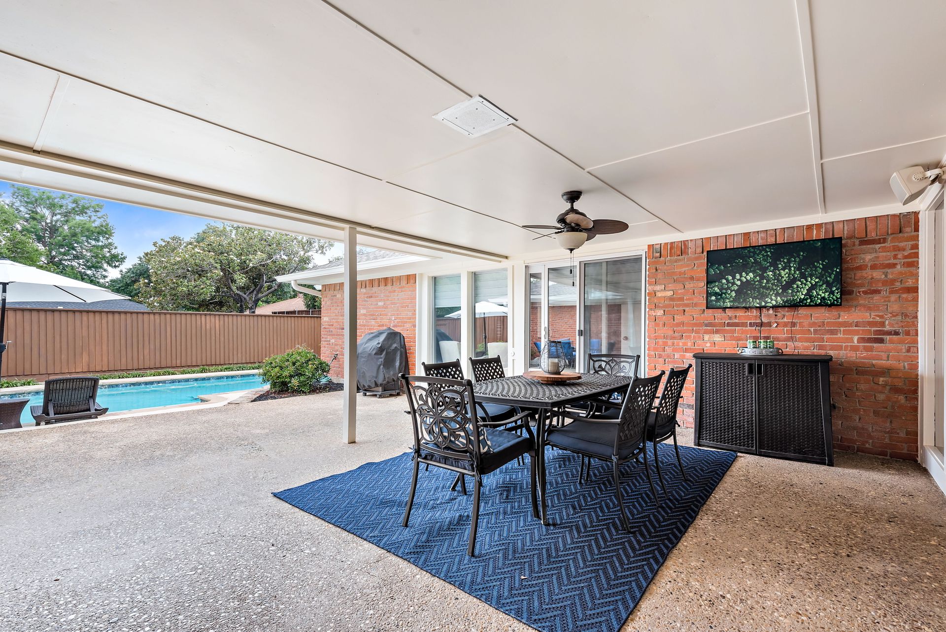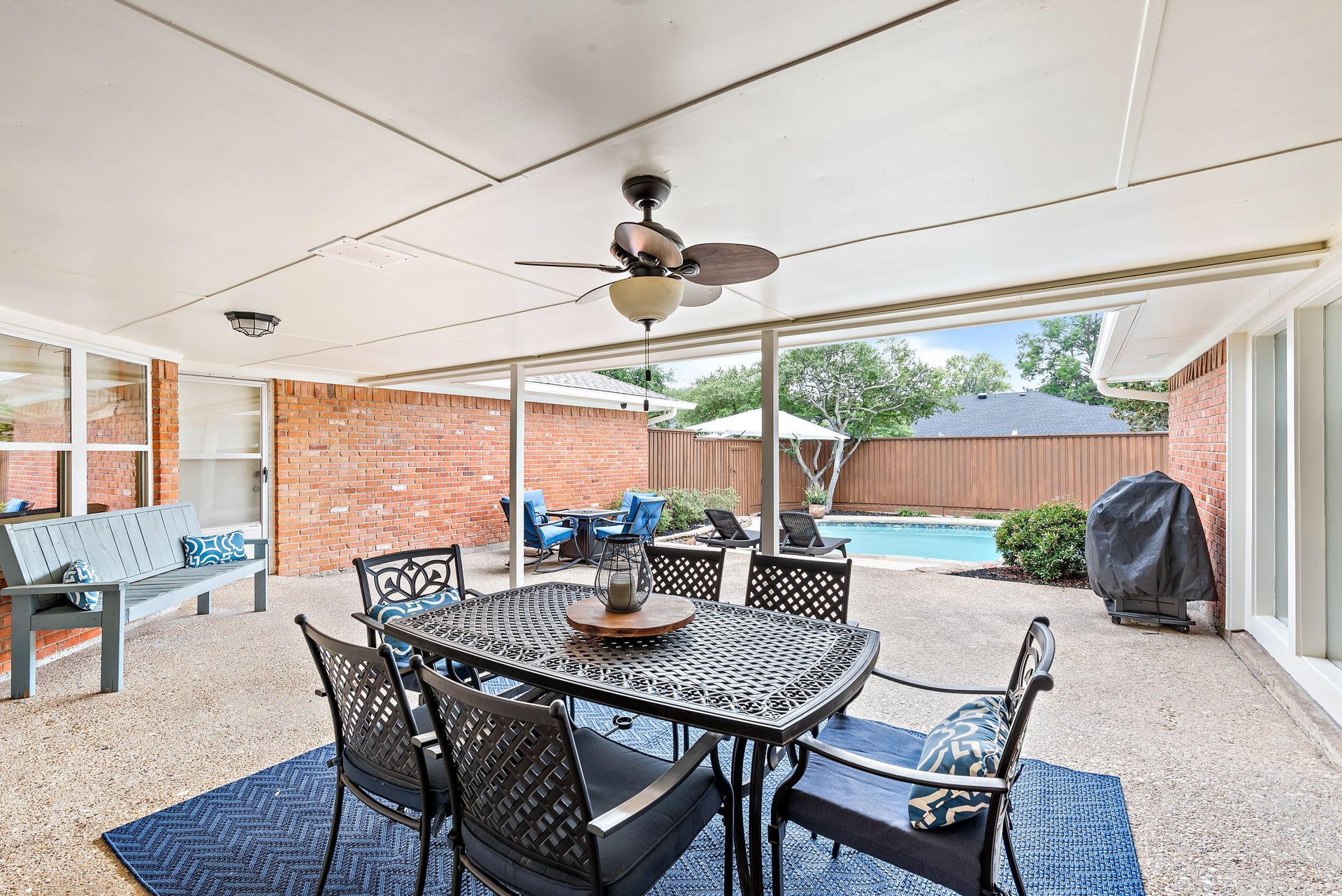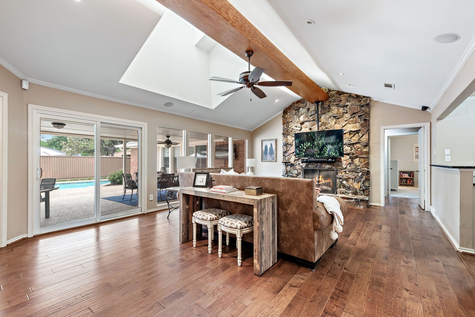 Gorgeous four bedroom, three and one half bath Ranch style home on shaded interior lot with beautiful established trees and lush landscaping in prime north Dallas location. Semi-circle drive with additional three car garage in back. Home features an open and bright living room with high pitched ceiling, wood flooring, and wet-bar great for entertaining. Large second living area that can be used as game area or workout room. Upgraded modern kitchen with eat in breakfast area, featuring stainless steel appliances, double oven, Induction range and second dishwasher in utility room off kitchen. Primary bedroom boast beautiful views of the oversized covered patio and sparkling blue pool. Includes updated ensuite with large glass seamless shower, jetted tub and double vanity with medicine cabinet. Do not miss out on the opportunity to live in sought after Prestonwood neighborhood and enjoy the convenient location of the neighborhood with easy access to LBJ, DNT, top Dallas private and public schools. Faces North!