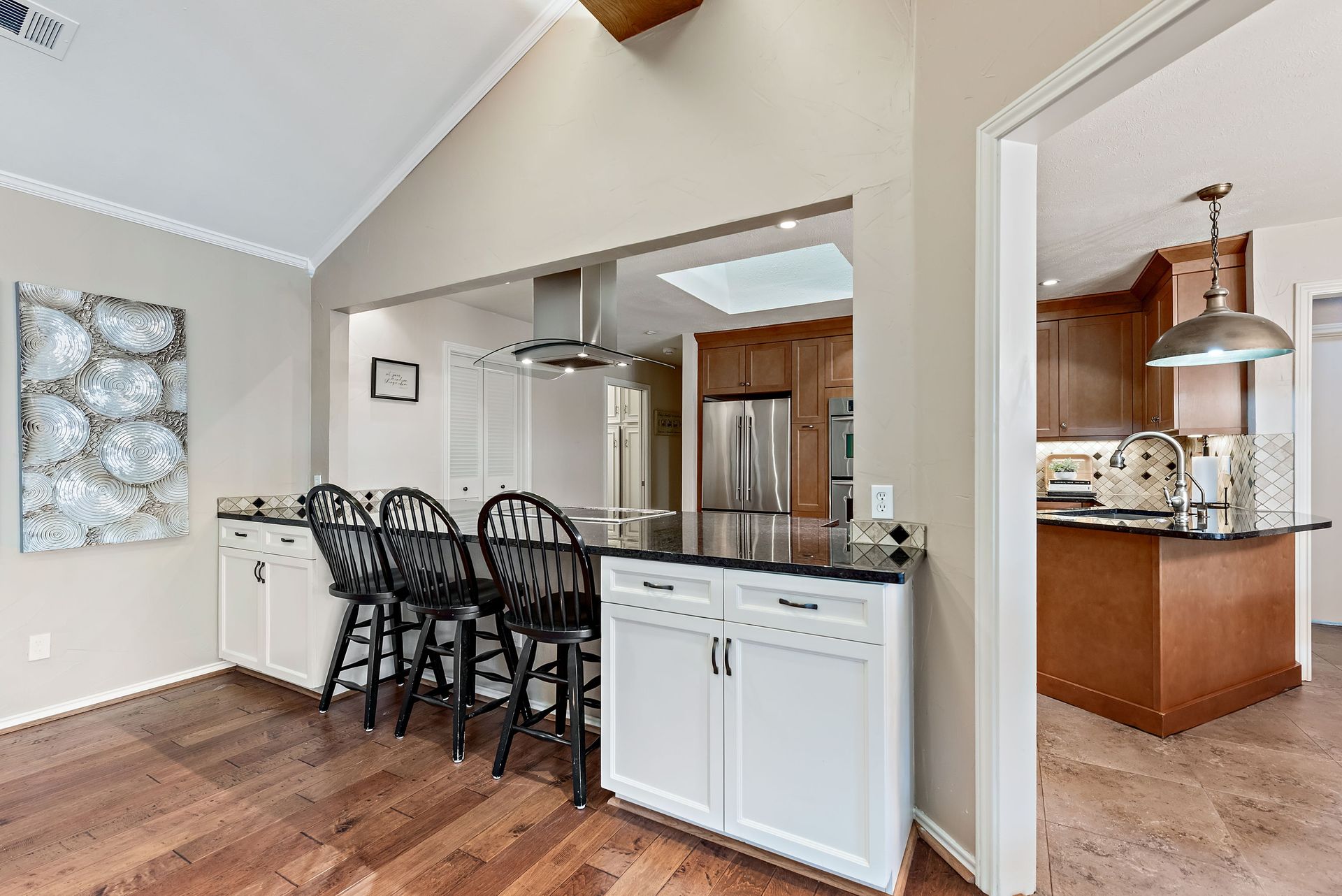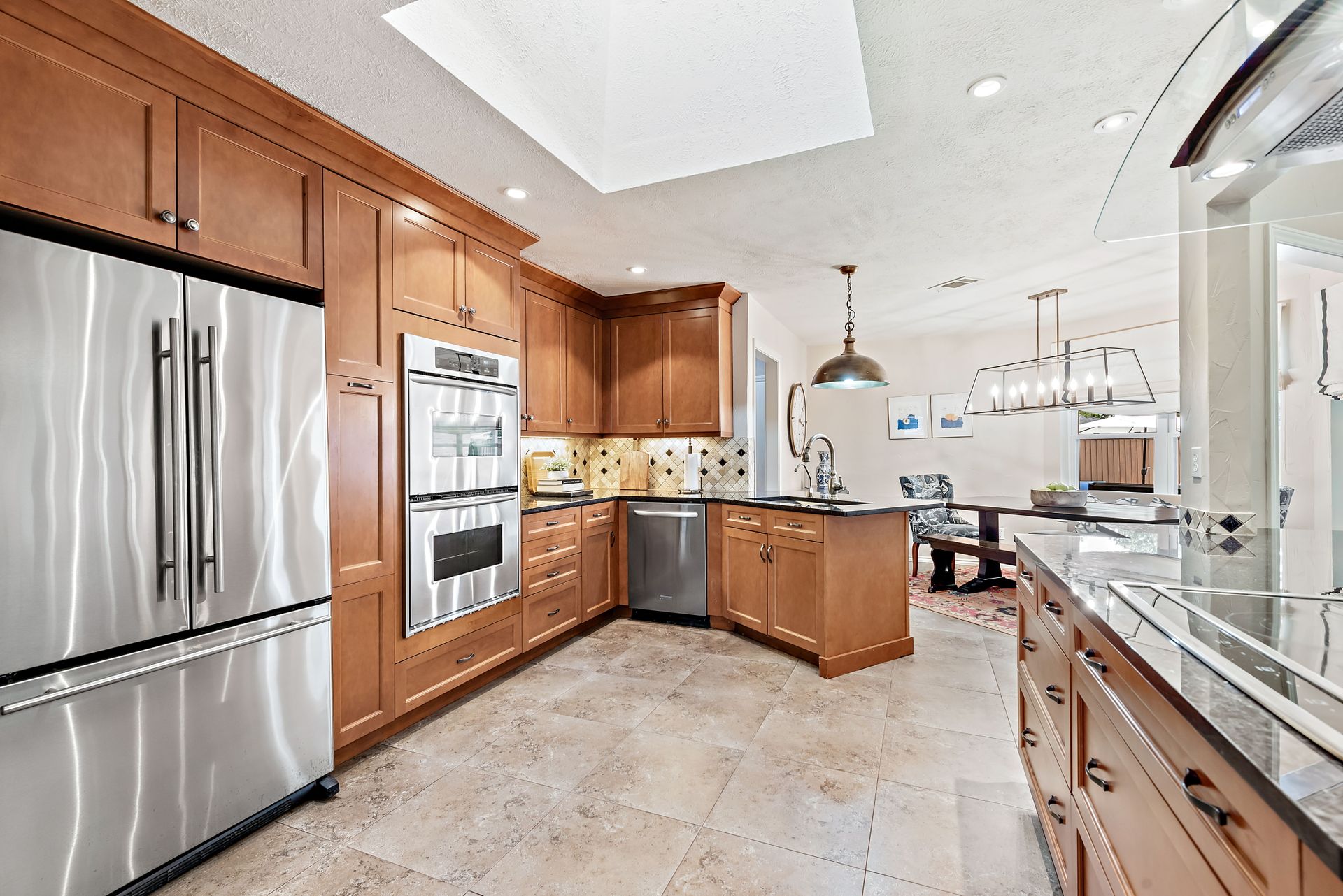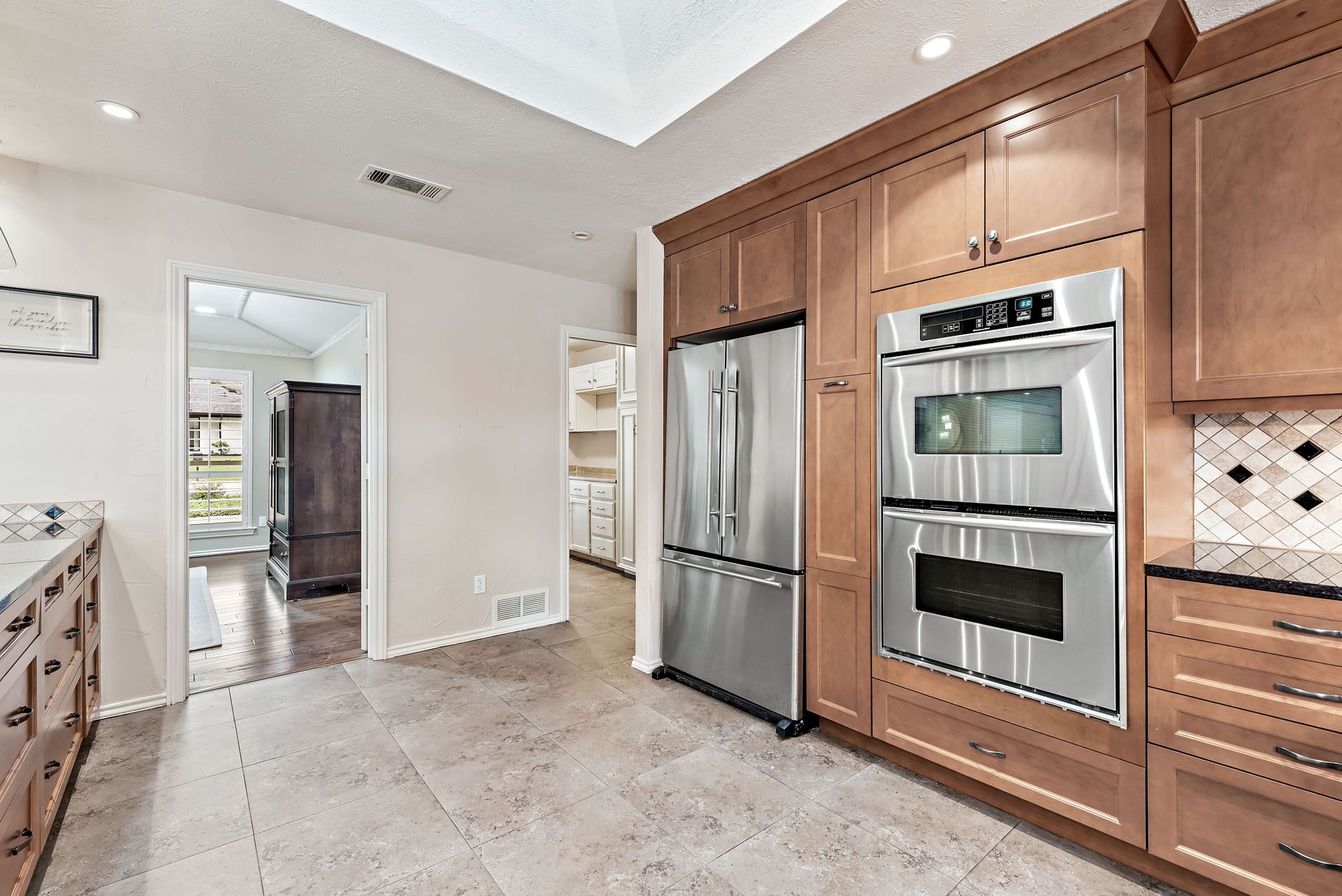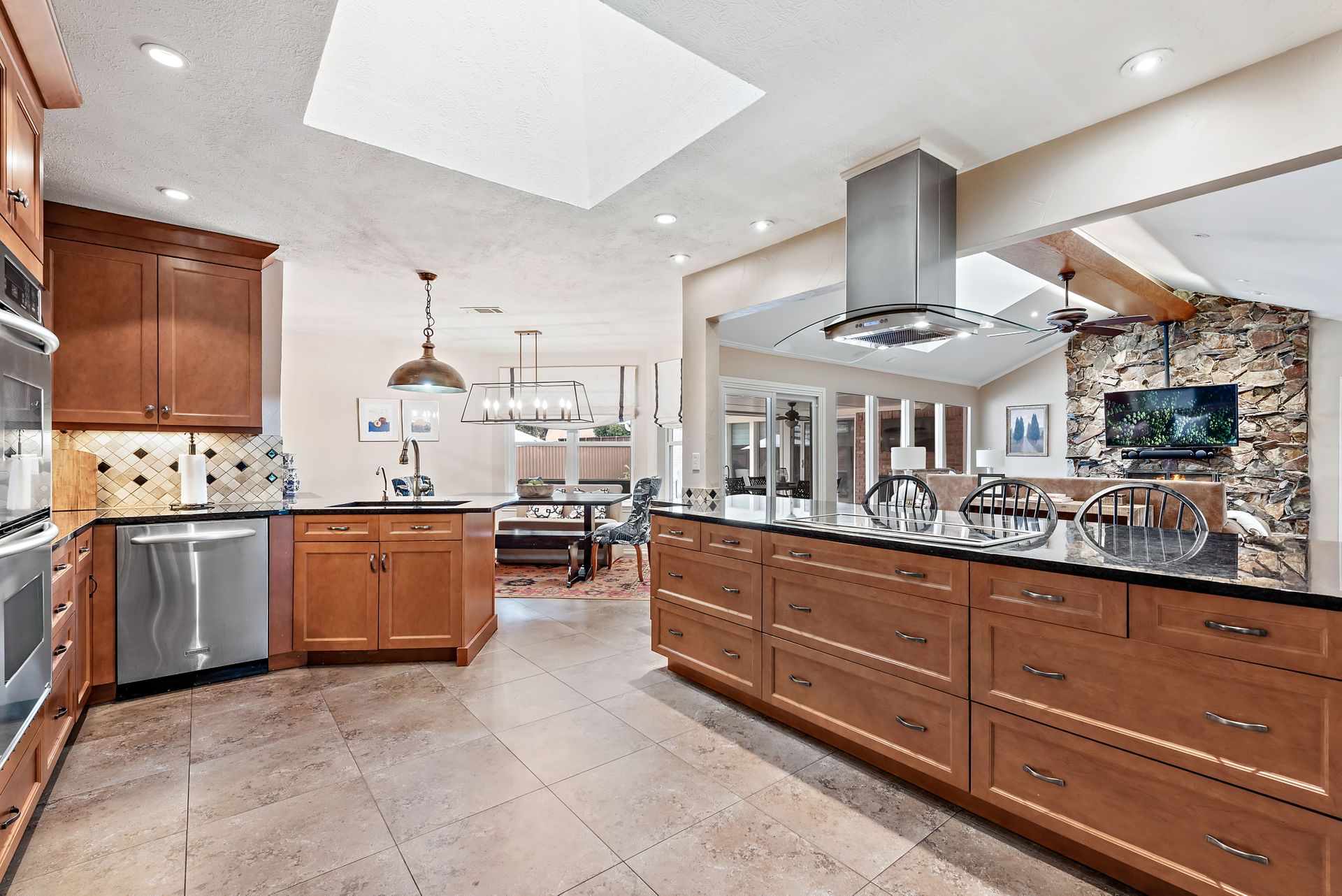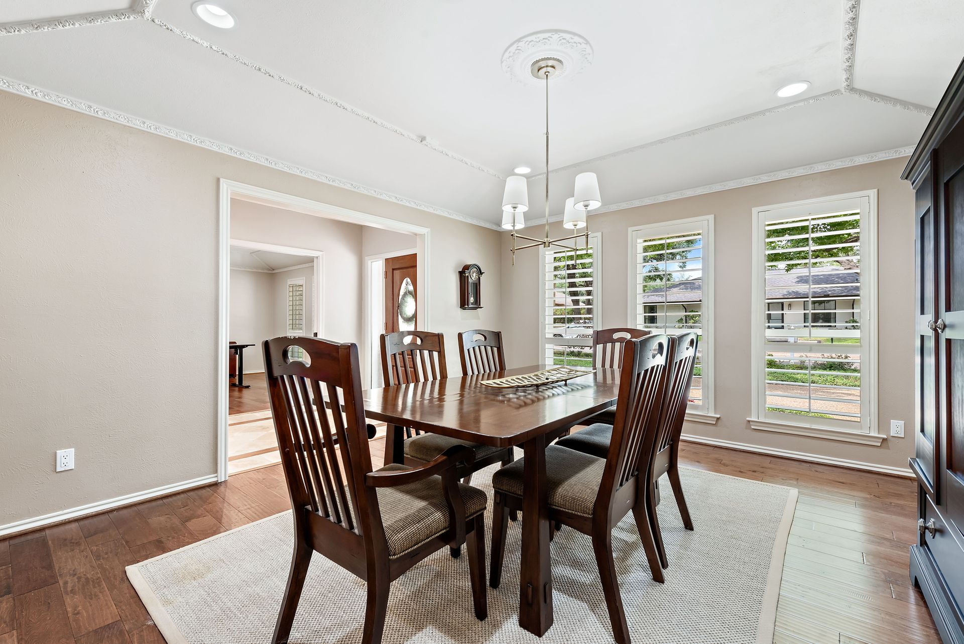 Gorgeous four bedroom, three and one half bath Ranch style home on shaded interior lot with beautiful established trees and lush landscaping in prime north Dallas location. Semi-circle drive with additional three car garage in back. Home features an open and bright living room with high pitched ceiling, wood flooring, and wet-bar great for entertaining. Large second living area that can be used as game area or workout room. Upgraded modern kitchen with eat in breakfast area, featuring stainless steel appliances, double oven, Induction range and second dishwasher in utility room off kitchen. Primary bedroom boast beautiful views of the oversized covered patio and sparkling blue pool. Includes updated ensuite with large glass seamless shower, jetted tub and double vanity with medicine cabinet. Do not miss out on the opportunity to live in sought after Prestonwood neighborhood and enjoy the convenient location of the neighborhood with easy access to LBJ, DNT, top Dallas private and public schools. Faces North!