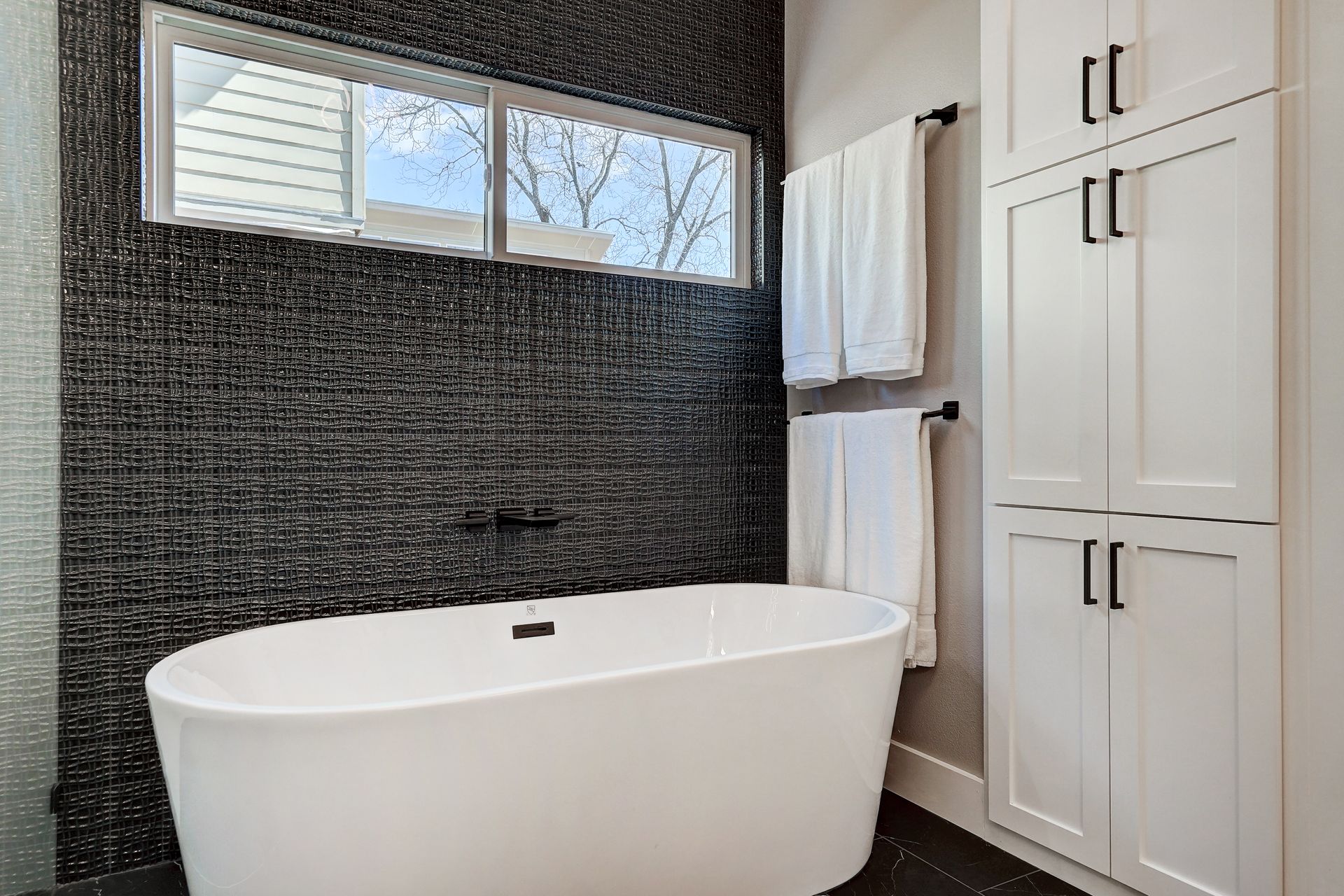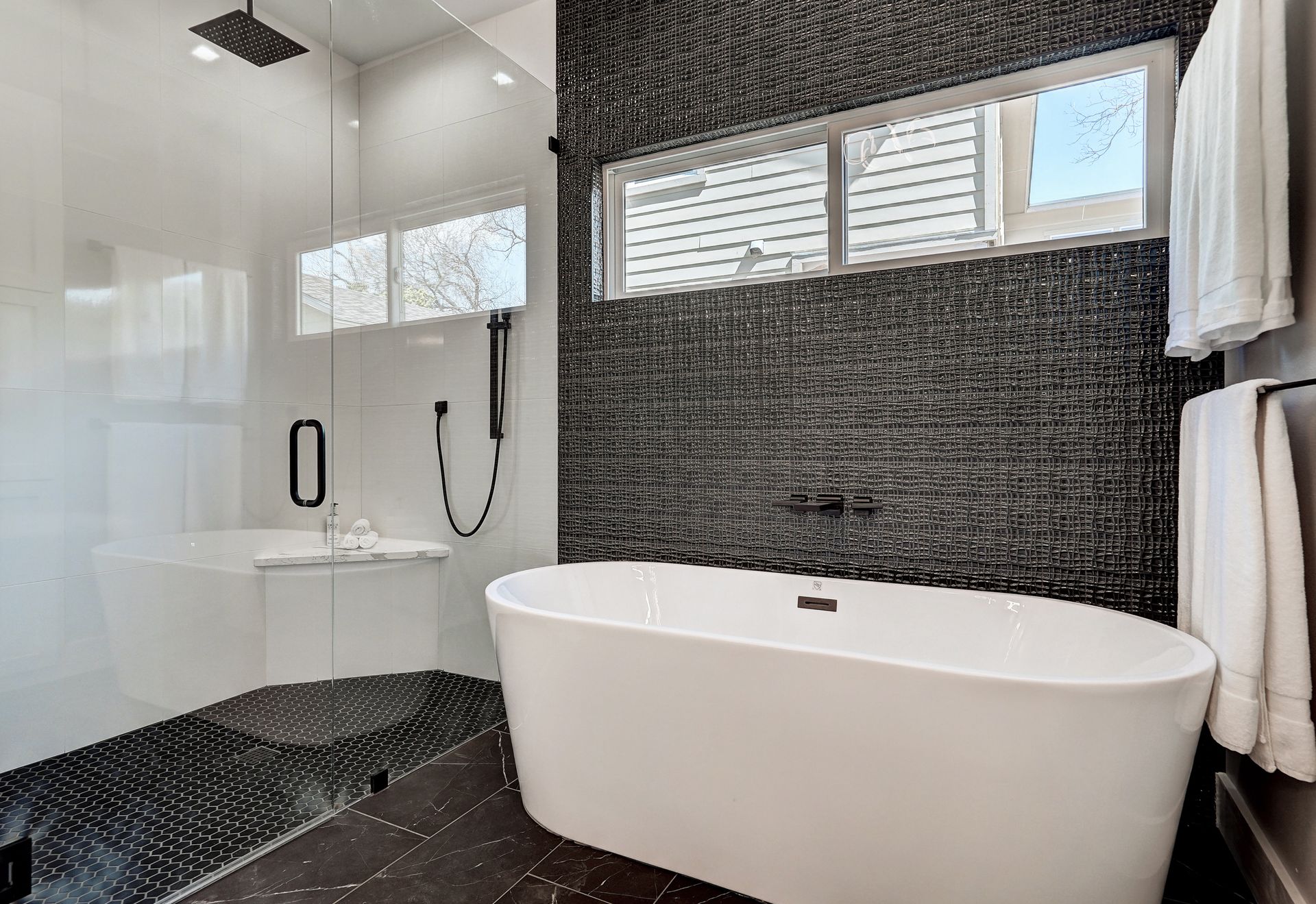 - 1st floor primary suite with large walk-in shower, soaking tub, and spacious custom closet
