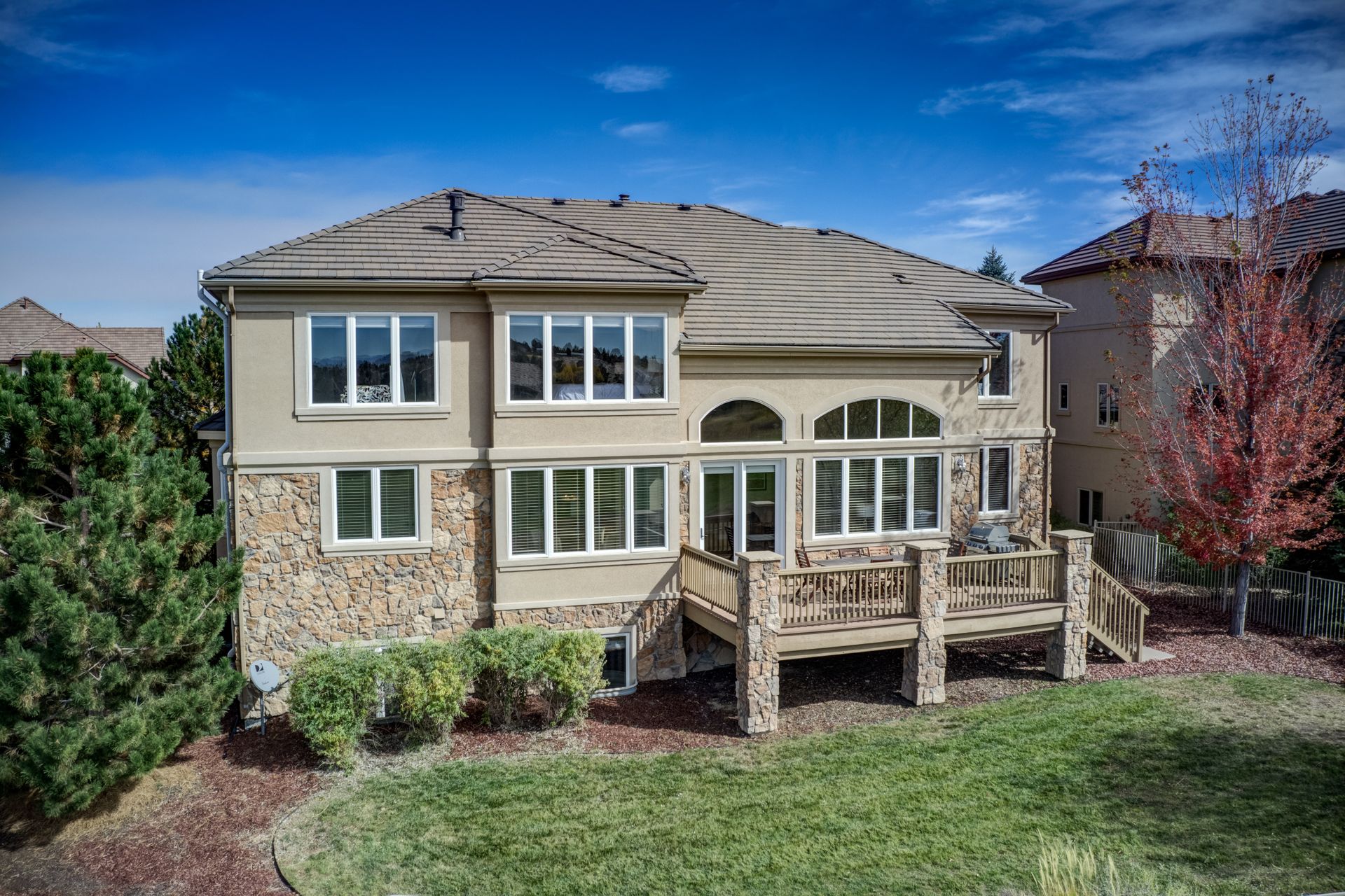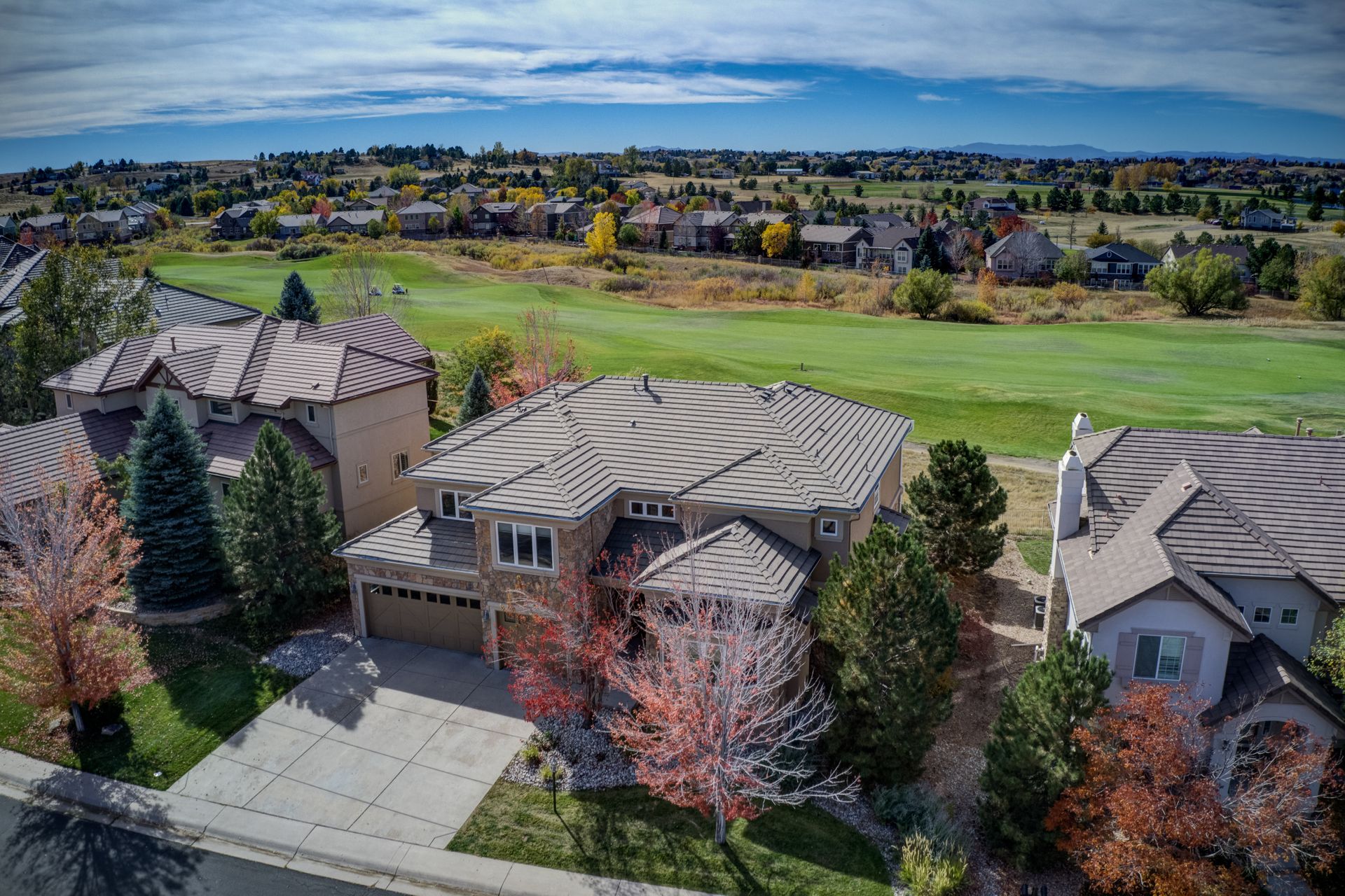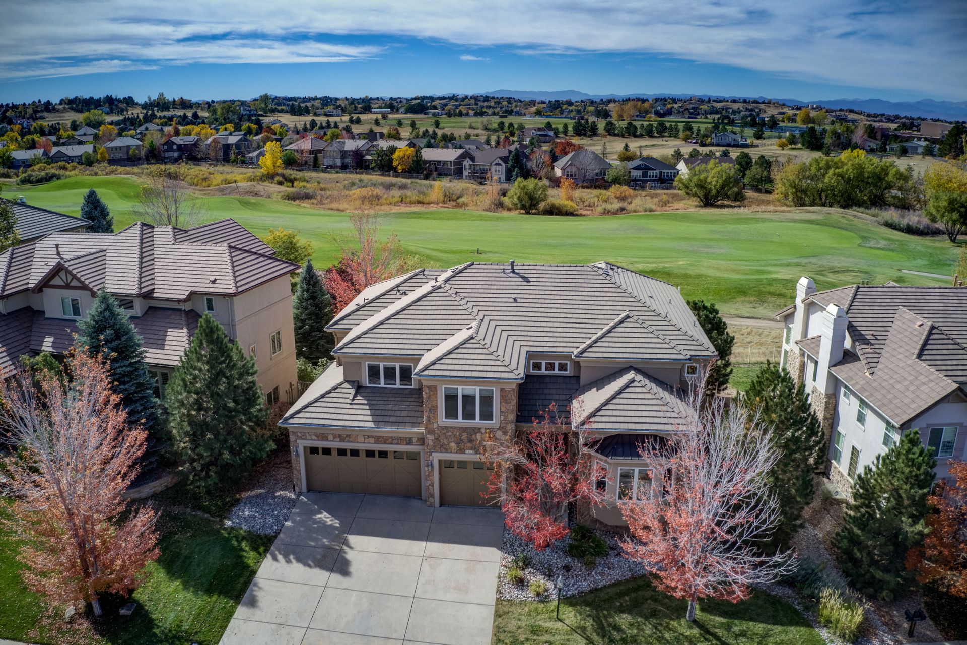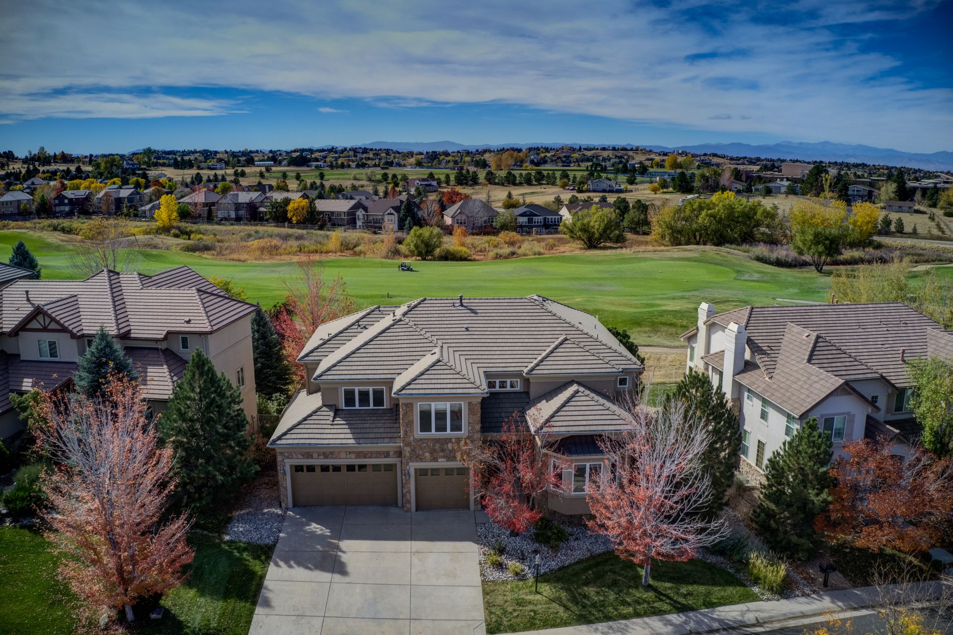 Backing to the 17th fairway of Saddle Rock Golf Course, this beautiful 6 bedroom/ 7 bath home offers privacy and spectacular mountain and golf course views. Your guests are greeted by a soaring foyer with tile, marble and art niches. Total WOW from the moment you enter this gracious home! The living room with fireplace, custom millwork and bay window is an elegant way to entertain formally or just relax for a few minutes. Holiday entertaining will be a dream come true in this beautiful dining room with custom cabinetry for china and crystal, tray ceiling, beautiful millwork and a butler’s pantry. The kitchen offers slab granite, natural cherry cabinets, stainless appliances, pantry, oversized island, command center, dining area and gorgeous wide plank natural cherry hardwood floors. The two story family room with a wall of windows allows fabulous golf course and mountain views. Main floor study with custom cabinetry and French doors is the perfect “work from home” office for today’s lifestyle. Completing the main floor is a guest suite with full bath for mutigenerational living or a second home office, laundry and powder room with custom tile wainscoting.