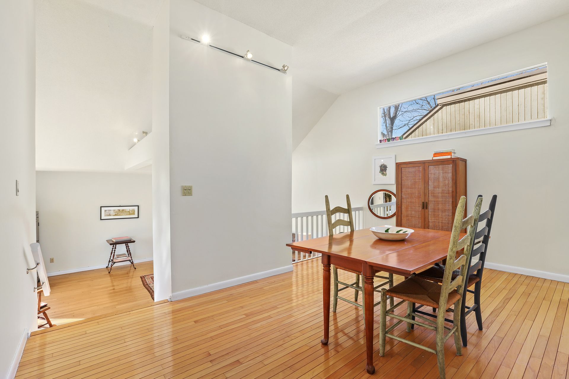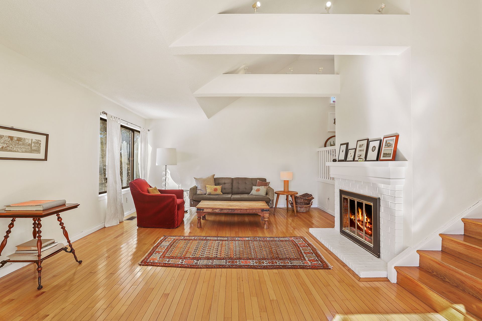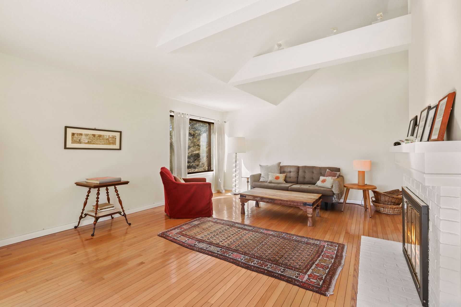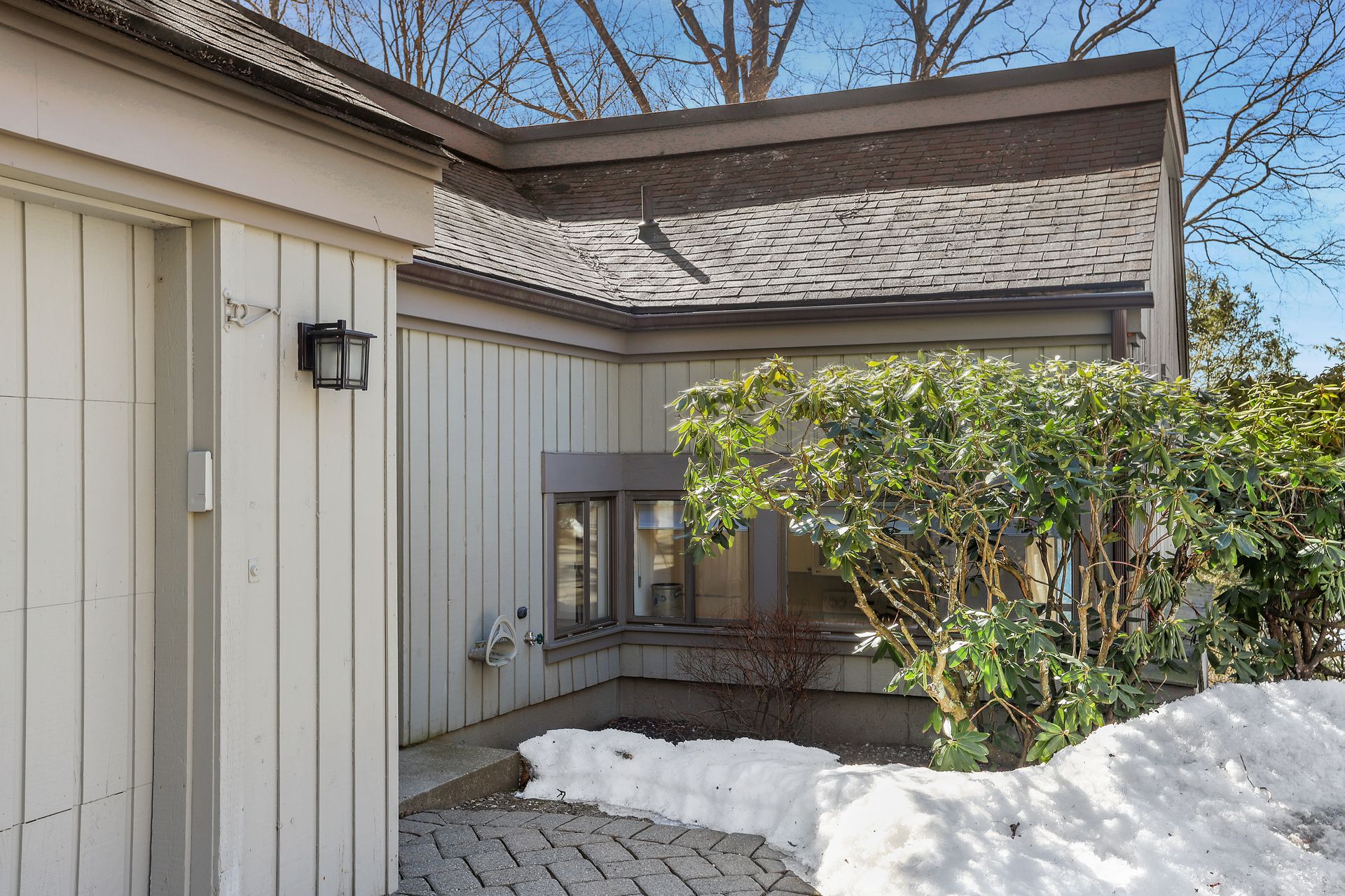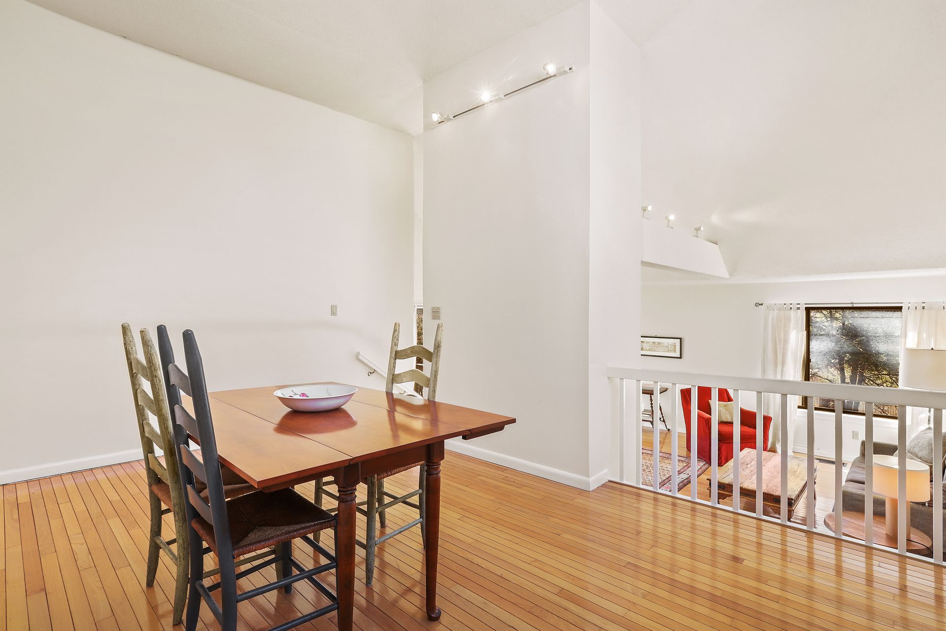 This lovely END UNIT is at the end of a cobblestone cul-de-sac / courtyard with EXTREME PRIVACY, birds singing, flowering and specimen plantings. Views of nature abound through walls of windows in the Master Suite, Living Room and deck. The Master also boasts a long window seat with storage and a master bath. The split levels add to the architectural detail that makes this feel more like a house than a condo. Ceramic floor is in the foyer and kitchen. Double sink and Corian counter tops. Extremely light and bright.