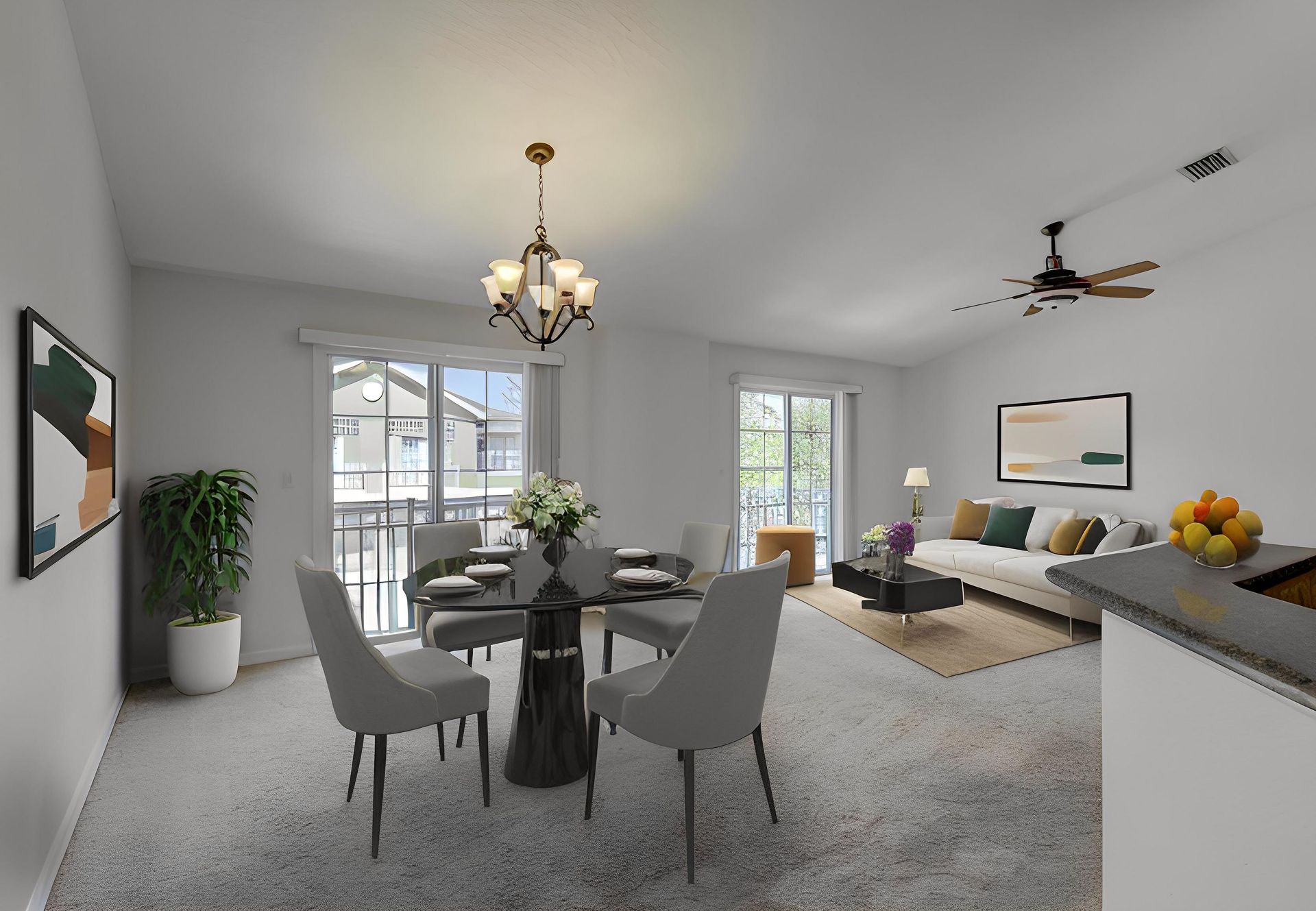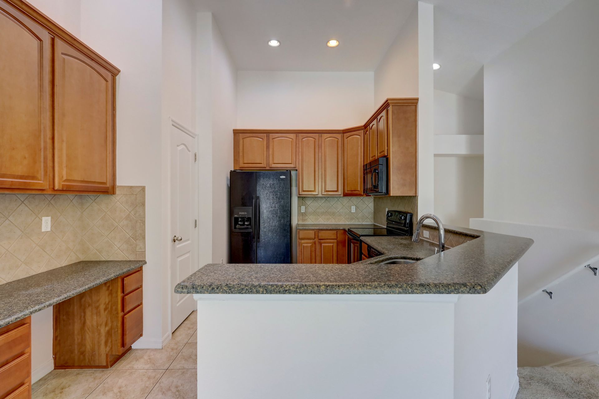 *Seller offers one-year American Homeshield Plus coverage (HVAC, electrical, washer/dryer, refrigerator, ovens, dishwasher, ceiling fans etc).* This open-floor plan condo is freshly painted and ready for you! Conveniently park your car in your own garage and let the stairs lead you to the living room and open kitchen. You will notice the high ceilings that create an immediate sense of space while two double sliding doors let in the natural light. The open kitchen seamlessly integrates with the living area. The breakfast bar is perfect for entertaining guests while preparing meals or snacks. The primary bedroom is spacious and features a walk-in closet. The ensuite bathroom offers a dual sink vanity. The second bedroom is equally inviting and has easy access to the second bathroom, in the hall, across from your separate laundry room.