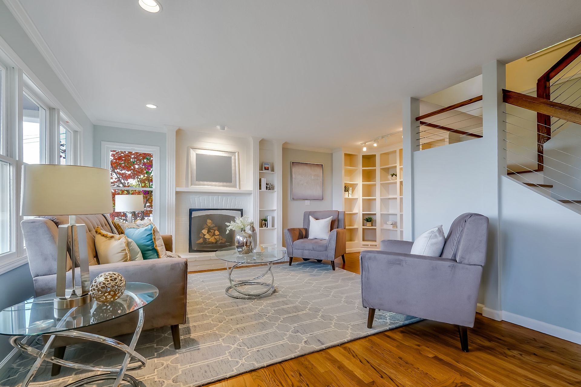 On the first floor the gracious entry welcomes you to the comfortable living room, complete with gleaming hardwood floors, a wood burning fireplace and an abundance of built- in cabinetry. On this floor there is also a separate laundry room and a sleek open concept kitchen. The kitchen is equipped with attractive pendant lighting, tile backsplash and soapstone countertops adjacent to a spacious family room and dining area with sliding glass doors to the exterior. In addition, there is a convenient full bathroom with shower.