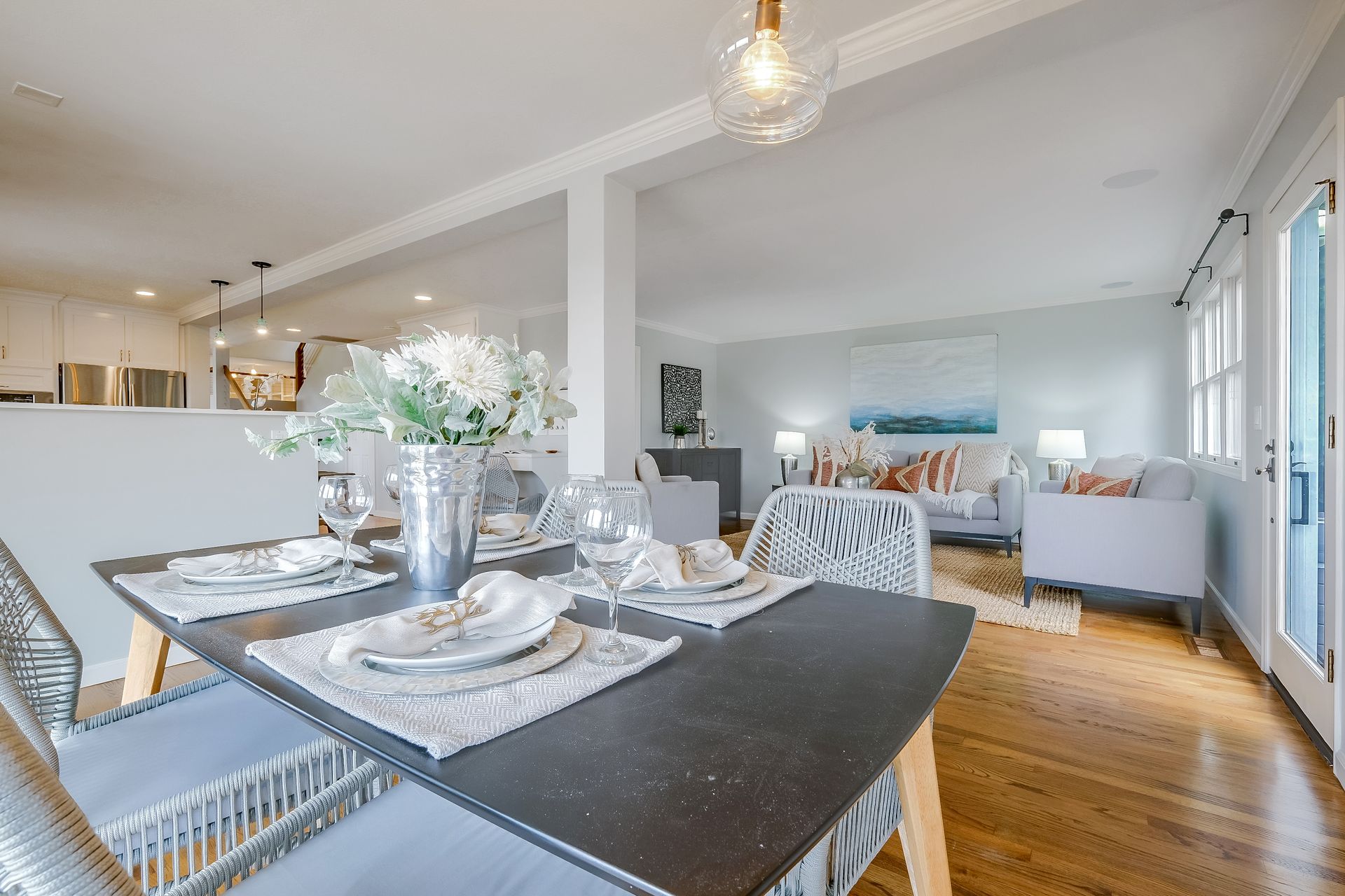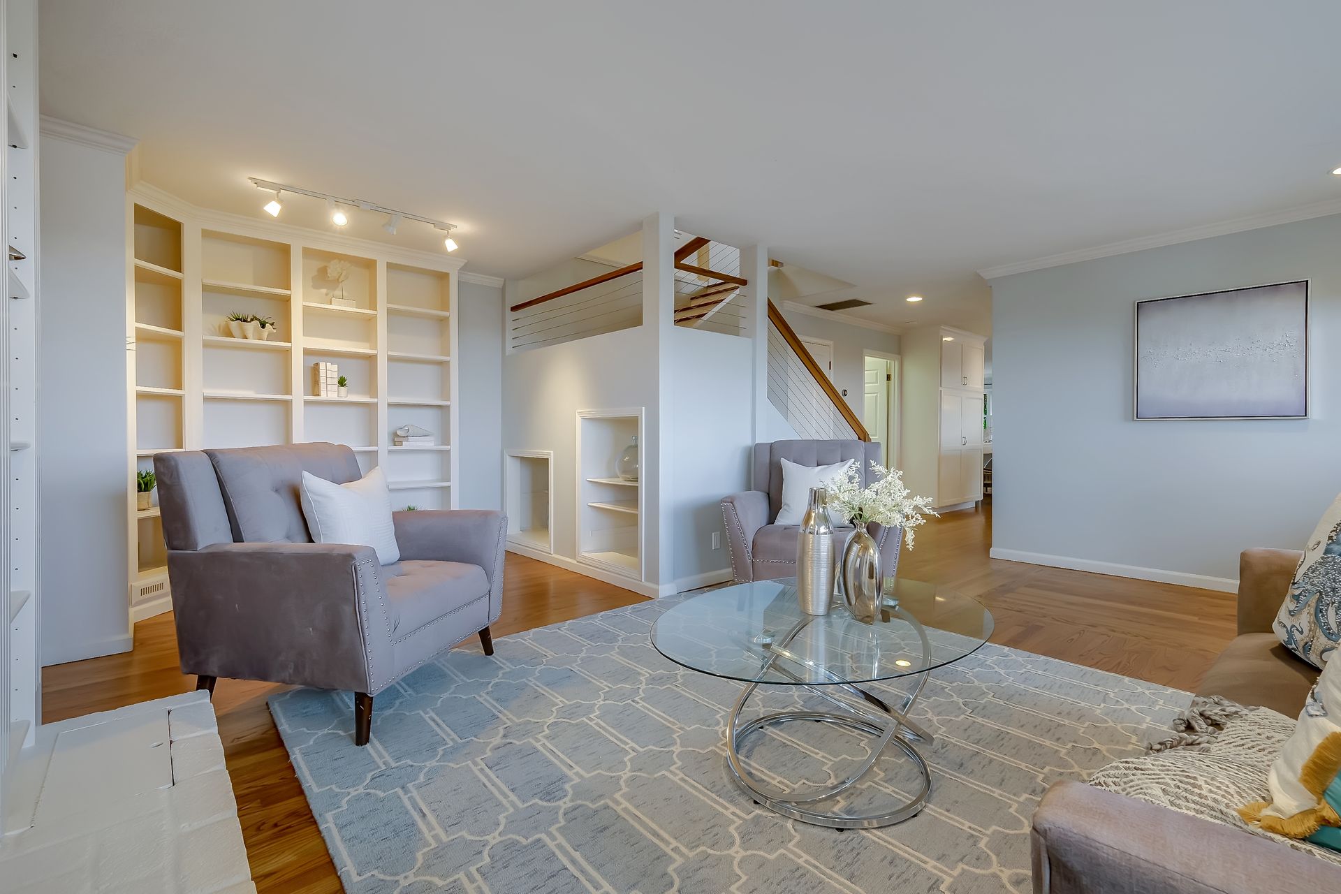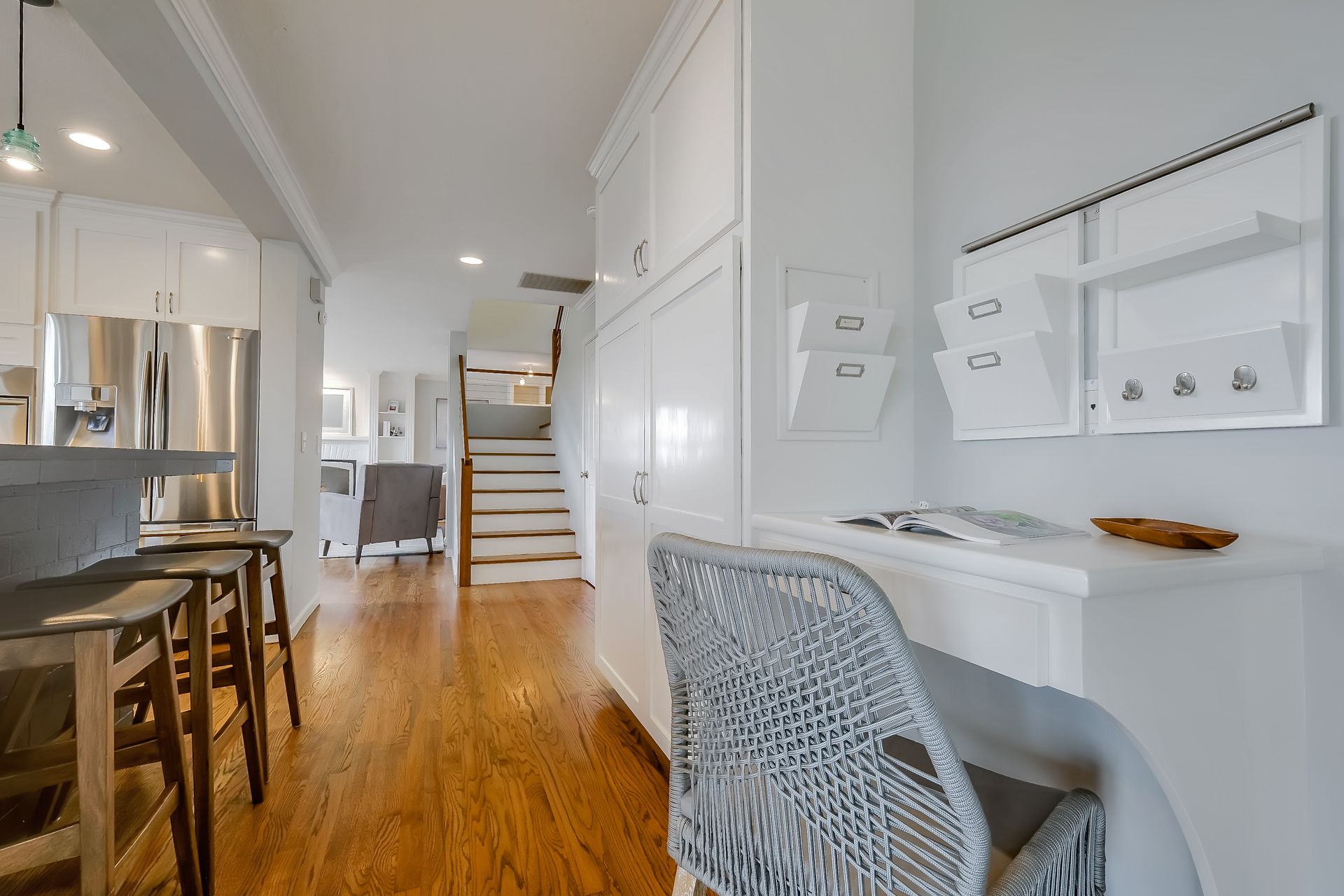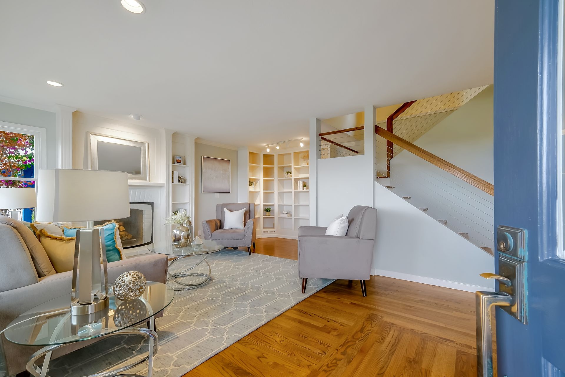 On the first floor the gracious entry welcomes you to the comfortable living room, complete with gleaming hardwood floors, a wood burning fireplace and an abundance of built- in cabinetry. On this floor there is also a separate laundry room and a sleek open concept kitchen. The kitchen is equipped with attractive pendant lighting, tile backsplash and soapstone countertops adjacent to a spacious family room and dining area with sliding glass doors to the exterior. In addition, there is a convenient full bathroom with shower.