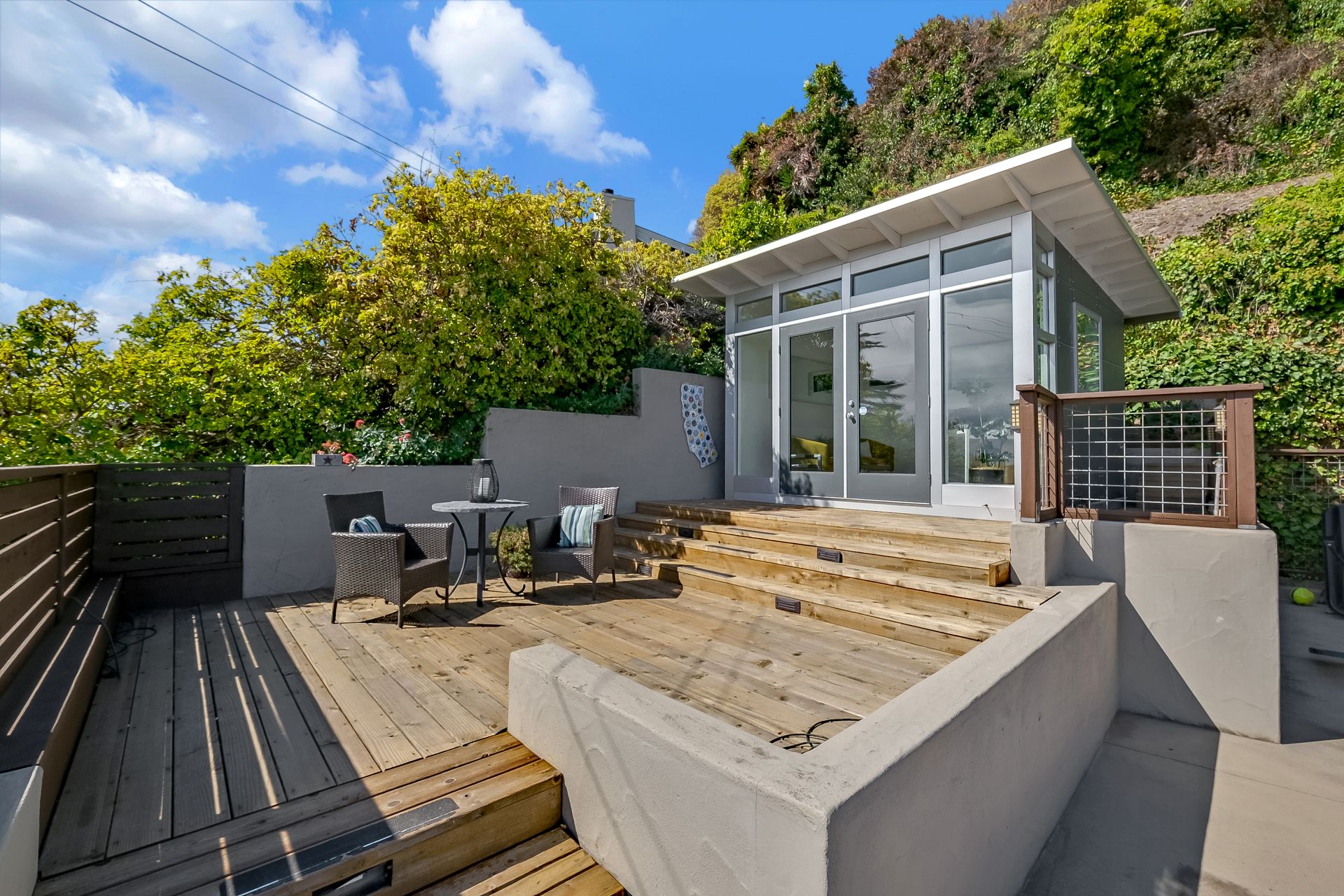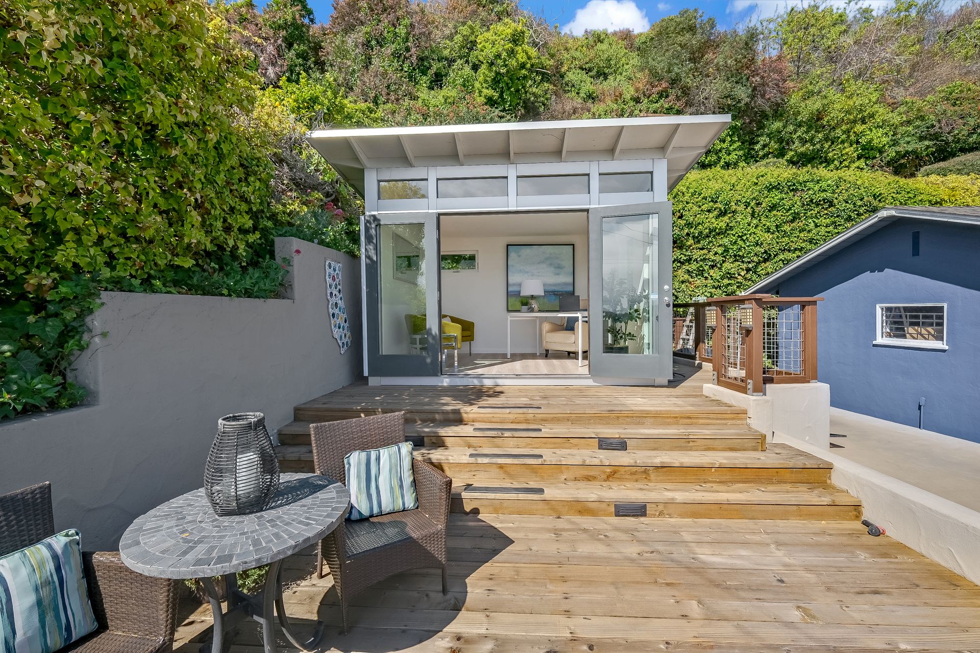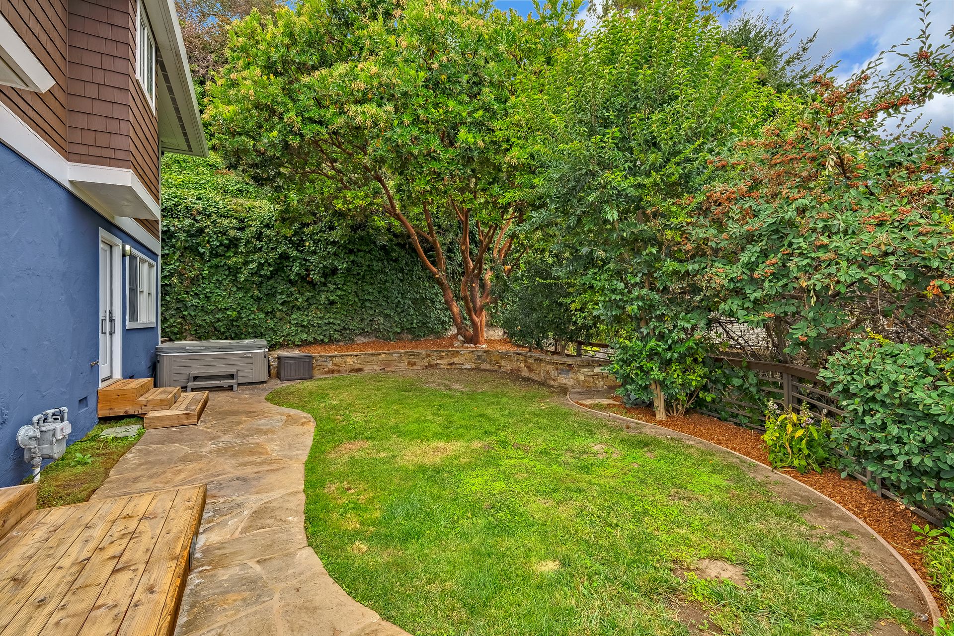 The private generous side yard with hot tub is ready to relax and enjoy. In addition, there is a separate structure which has been freshly painted, new luxury vinyl flooring which would be ideal as a home office or an artist retreat. The separate two-car garage has an electric car charger plus a large storage closet ideal for a workbench.