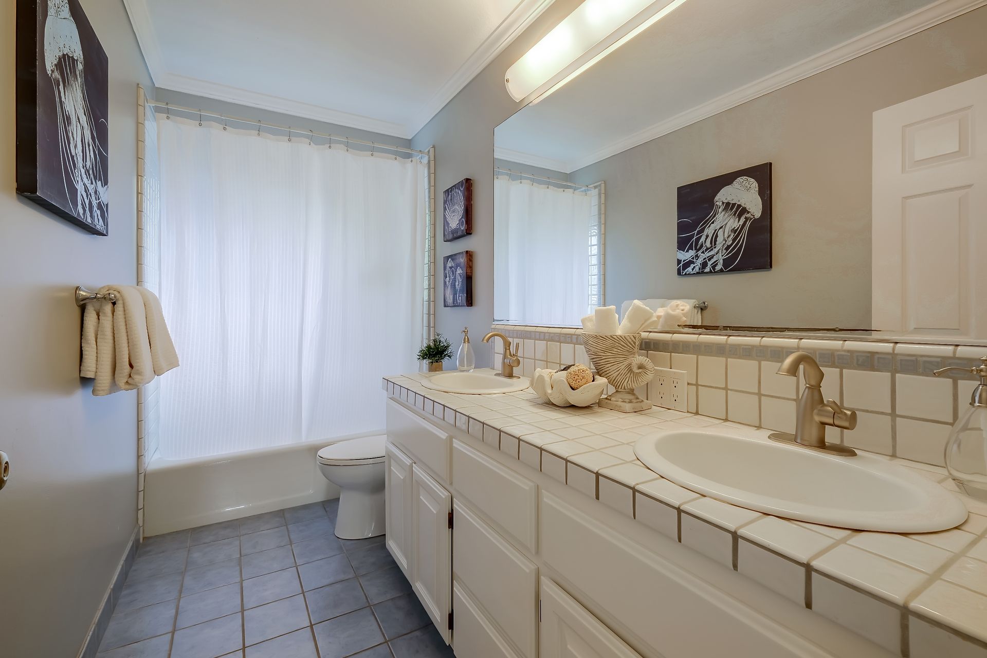 The other three rooms share a bright conveniently located hall bathroom with a shower over tub and dual sinks.