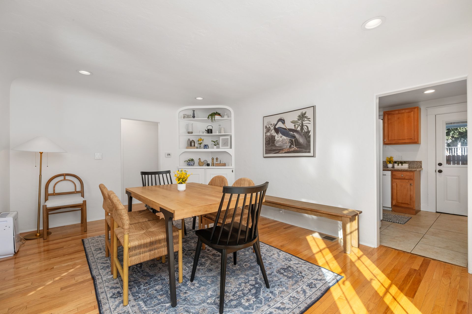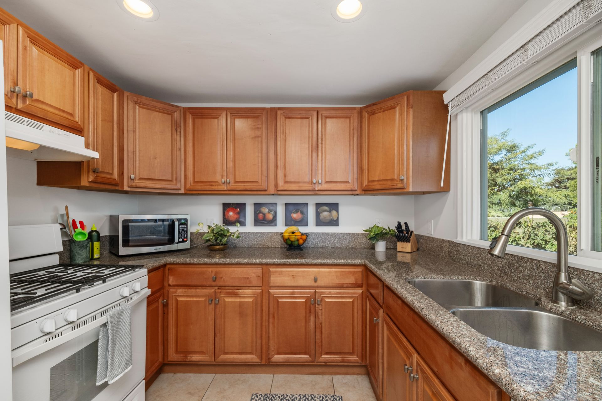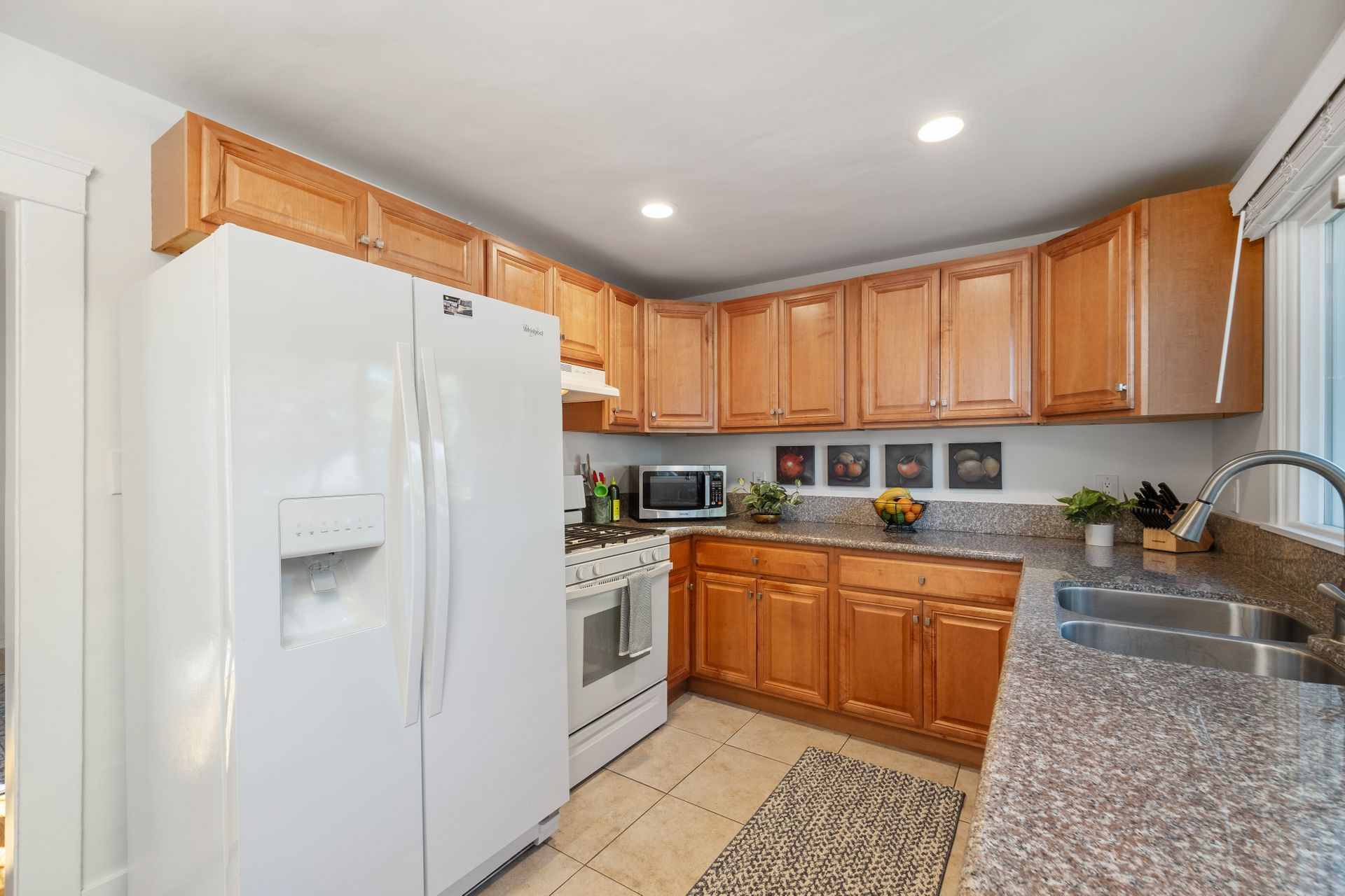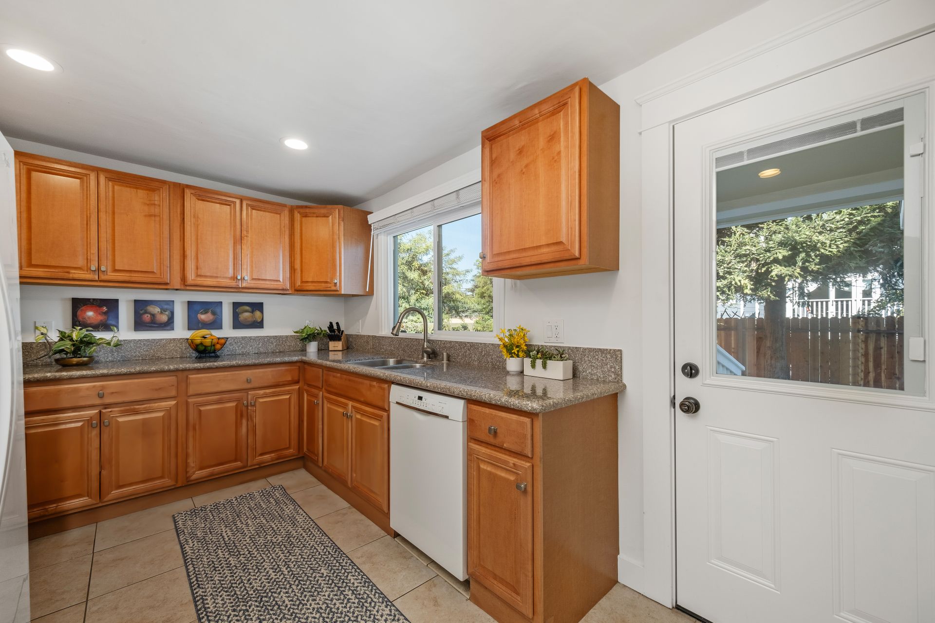 Upon entering, you’re greeted by a warm and inviting living room featuring wood flooring, recessed lighting and a cozy fireplace. The dining area seamlessly connects to a bright kitchen with granite countertops overlooking the backyard. The main bedroom boasts a walk-through closet and en suite bathroom, while two additional bedrooms share a stylish bath.