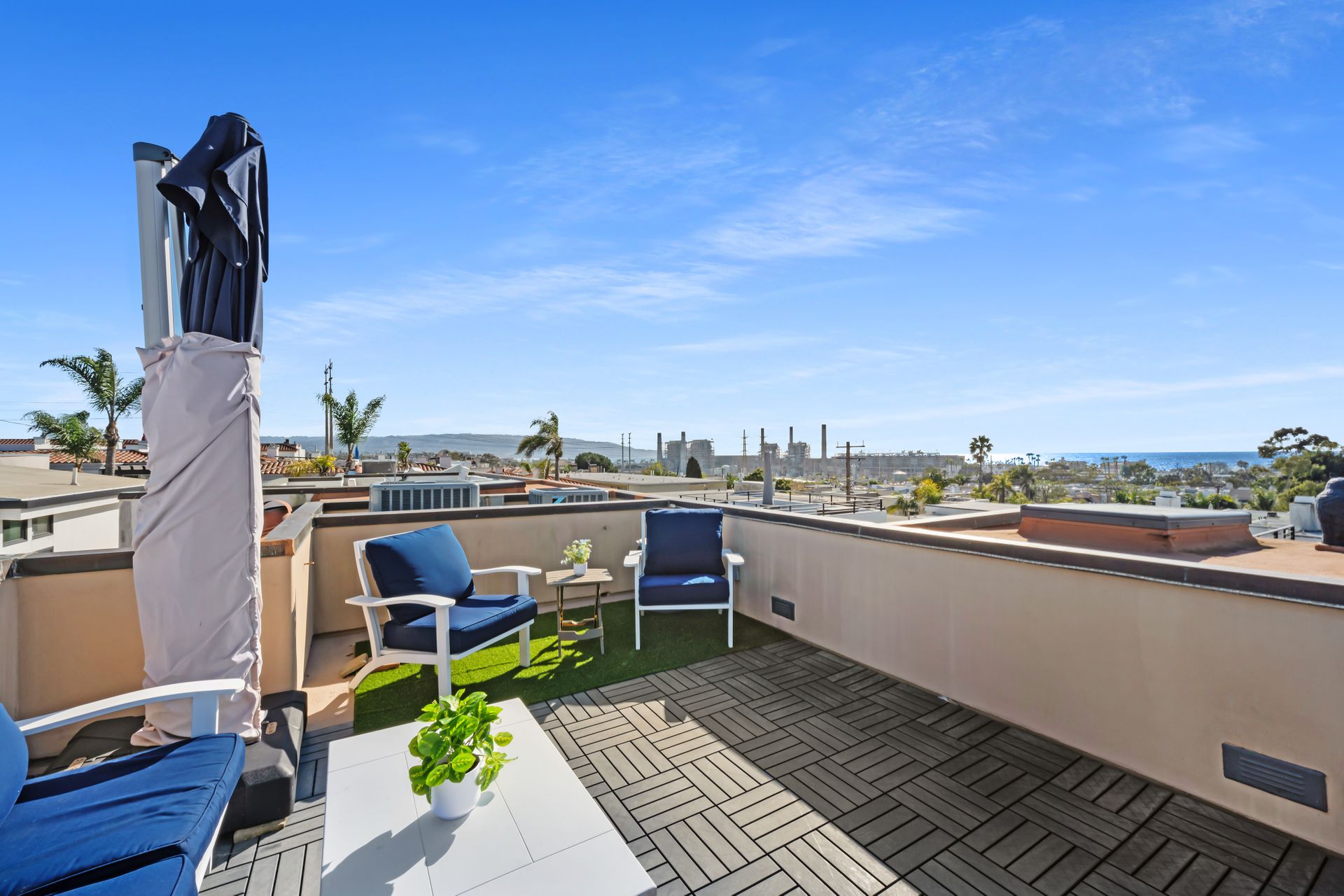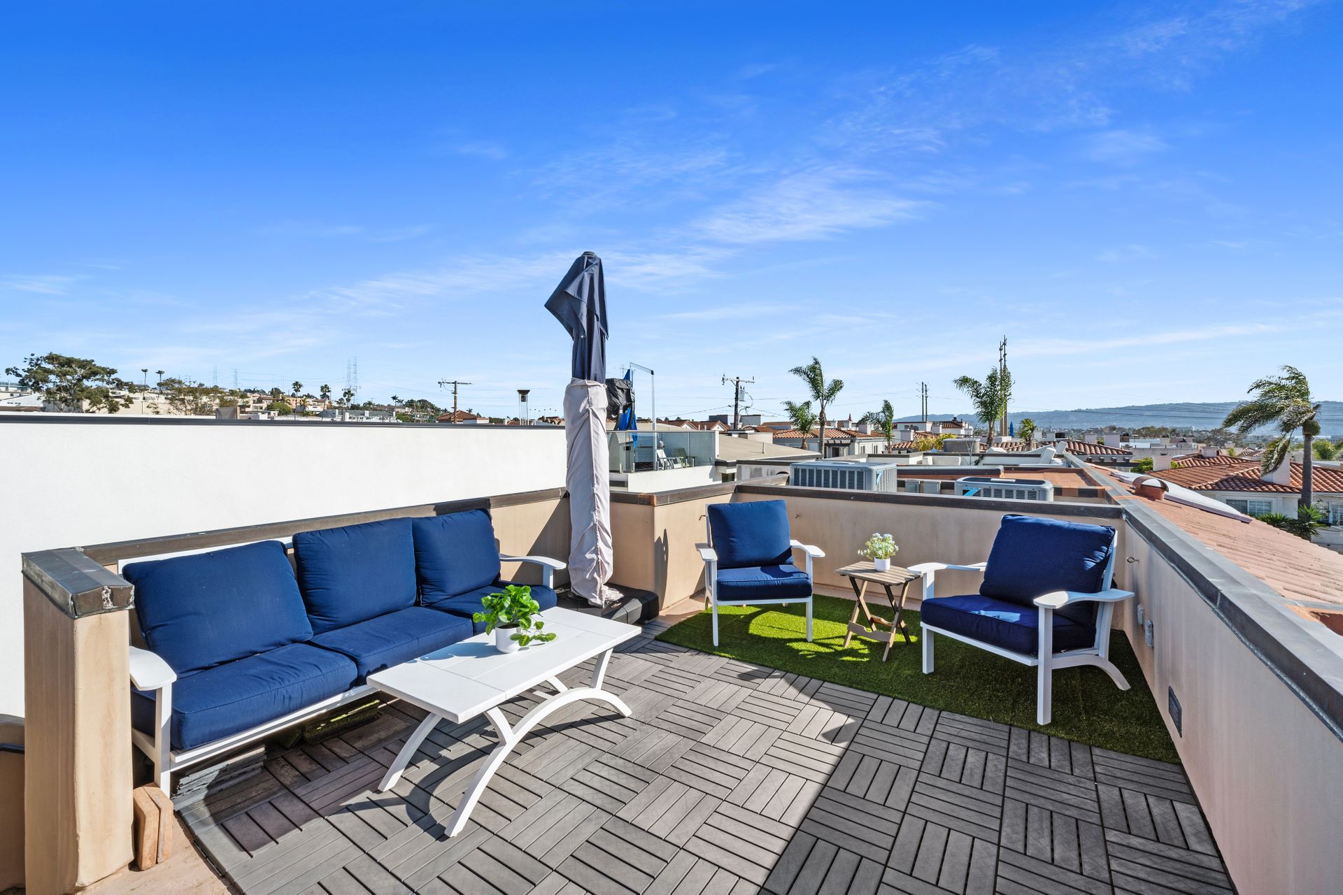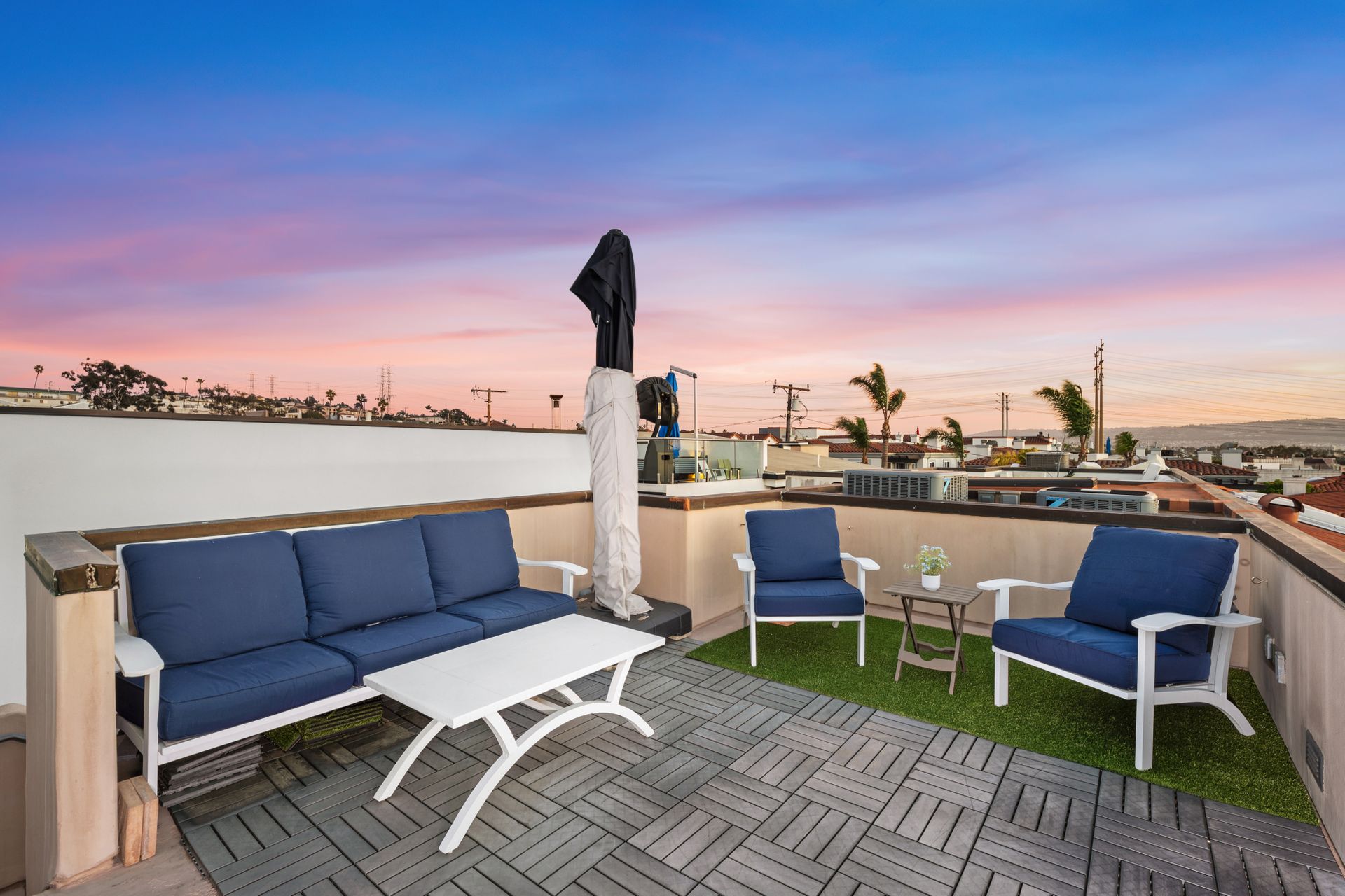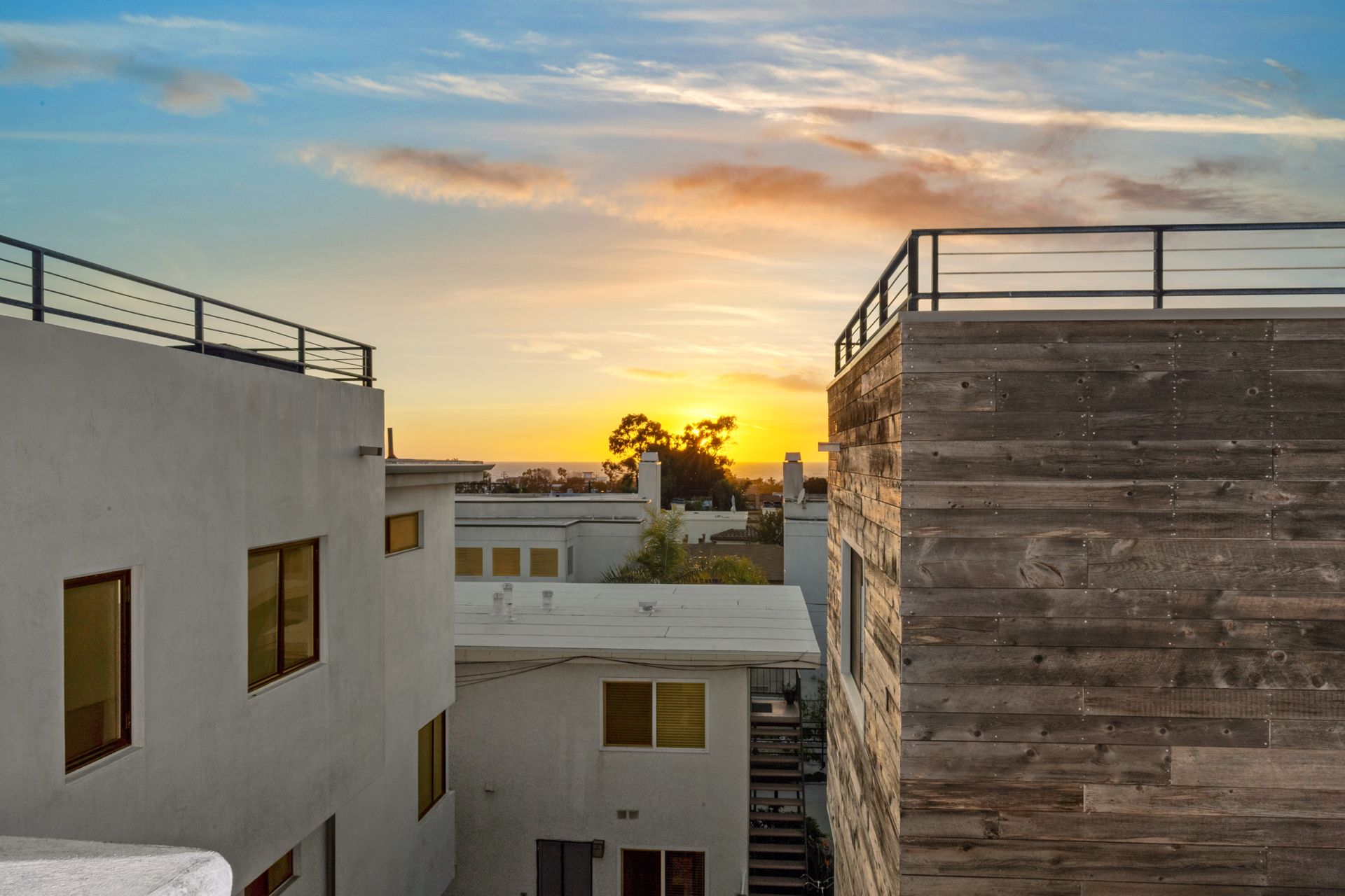 Welcome to this beautifully updated beach house conveniently positioned west of Pacific Coast Highway in the heart of Hermosa Beach, offering four bedrooms, four baths and over 2,480 square feet of thoughtfully designed livable space. Enter the spacious top-floor living area, where partial ocean and sunset views set the scene. Enjoy the warmth of a cozy fireplace, rich wood flooring and multiple seating areas that flow seamlessly into the dining space and gourmet kitchen. The kitchen is a chef’s dream, featuring granite countertops, an island and newer appliances. From this level, a staircase leads to the private rooftop deck, where you can entertain or unwind while taking in the expansive coastal views. The second floor features a generously sized primary suite with a private balcony, a walk-in closet and an ensuite bath with a jacuzzi tub. Two additional bedrooms and a shared bath complete this level. A fourth bedroom and additional bath are located on the first floor, offering flexibility for guests, a home office or a gym. The private backyard is conveniently accessed from the staircase landing between the first and second floors, creating an effortless indoor-outdoor flow.