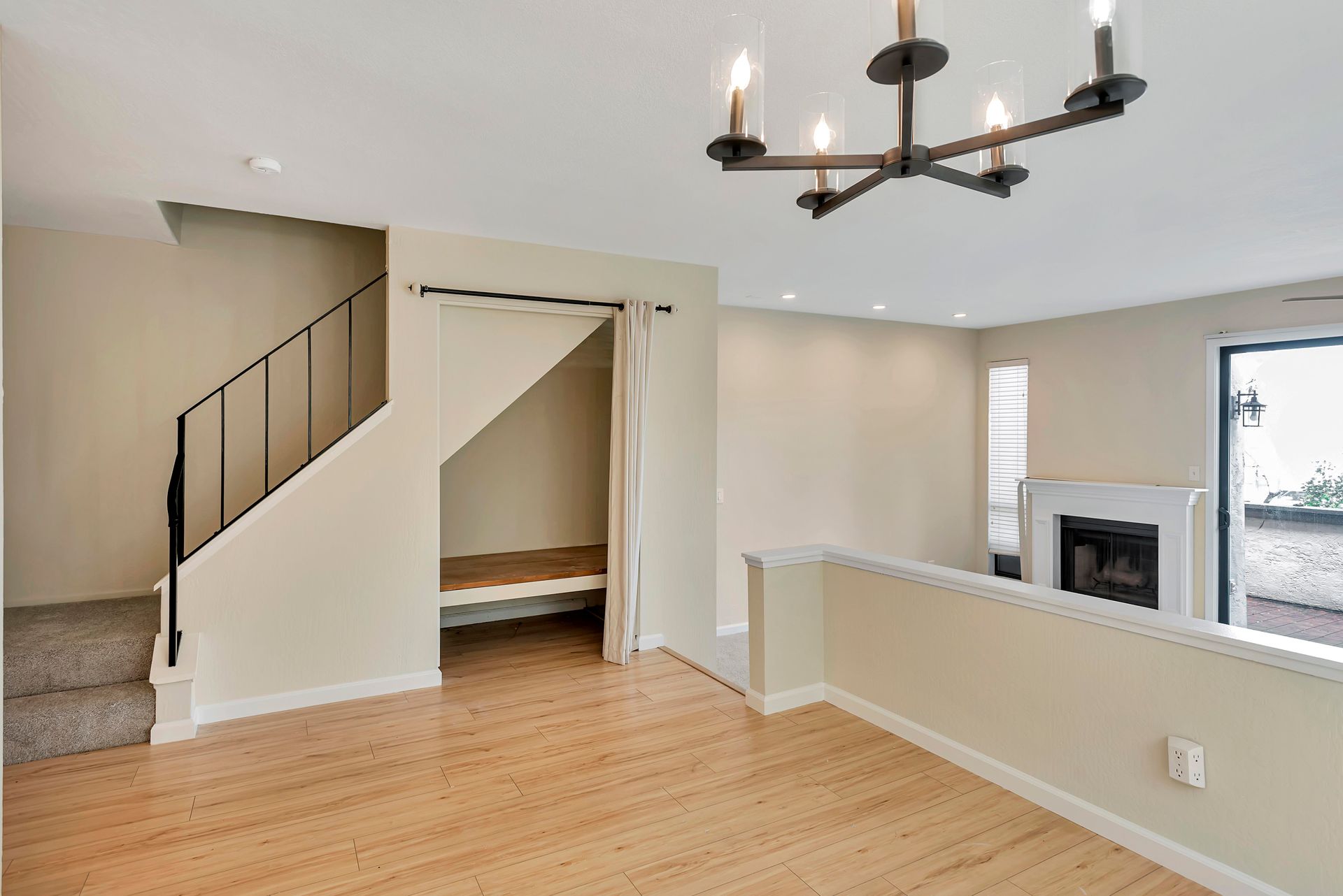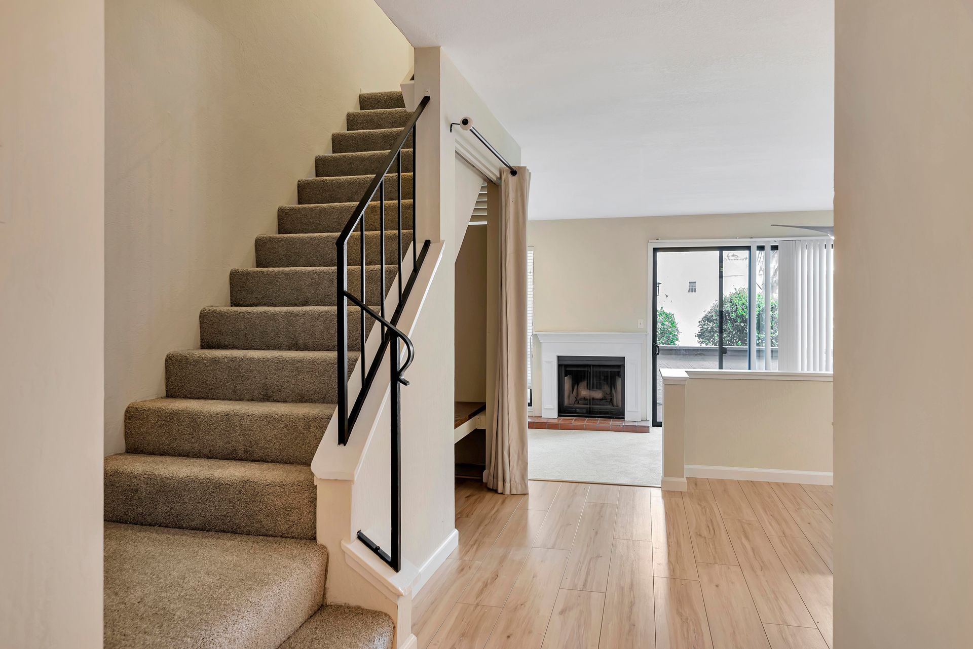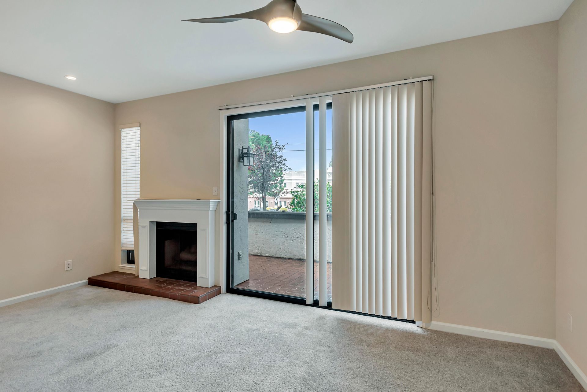 This two-level townhome-style condominium offers two spacious bedrooms and two bathrooms upstairs. A half-bath is located downstairs. Upstairs laundry area with side-by-side washer/dryer included. Fresh paint throughout the home and newly installed carpets. Highlights include double-pane windows, an inviting dining room, and a spacious step-down living room with a wood-burning fireplace, high ceilings, and a glass sliding door that leads to a large inviting private balcony. Excellent indoor-outdoor flow.