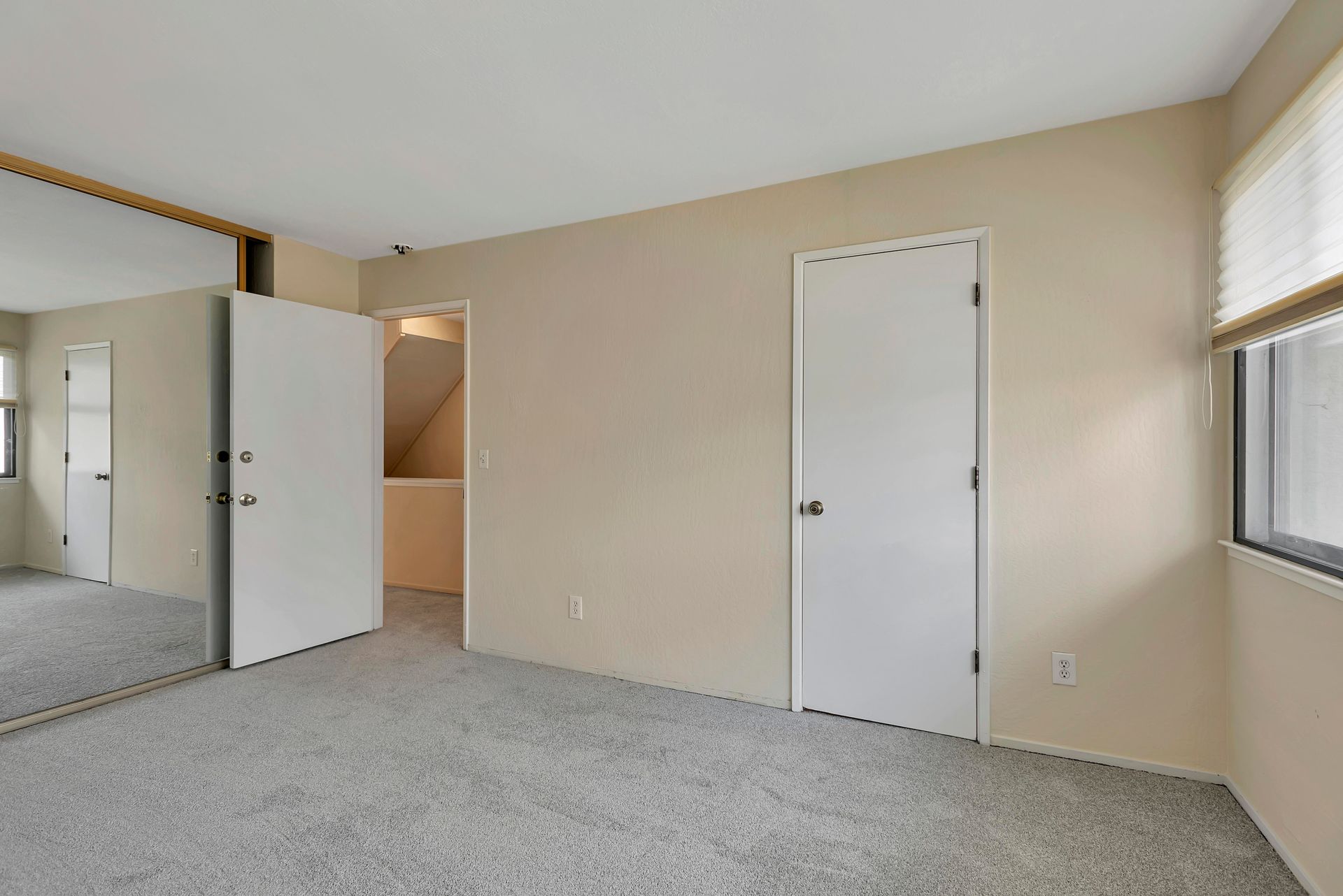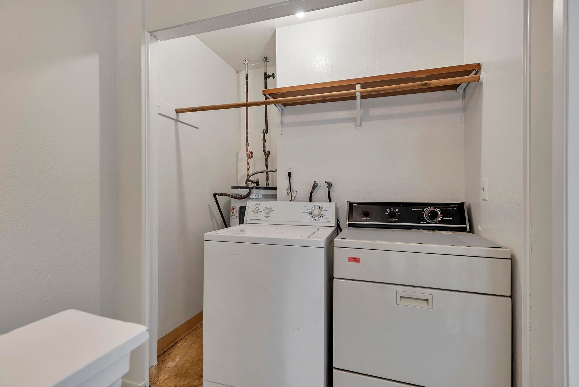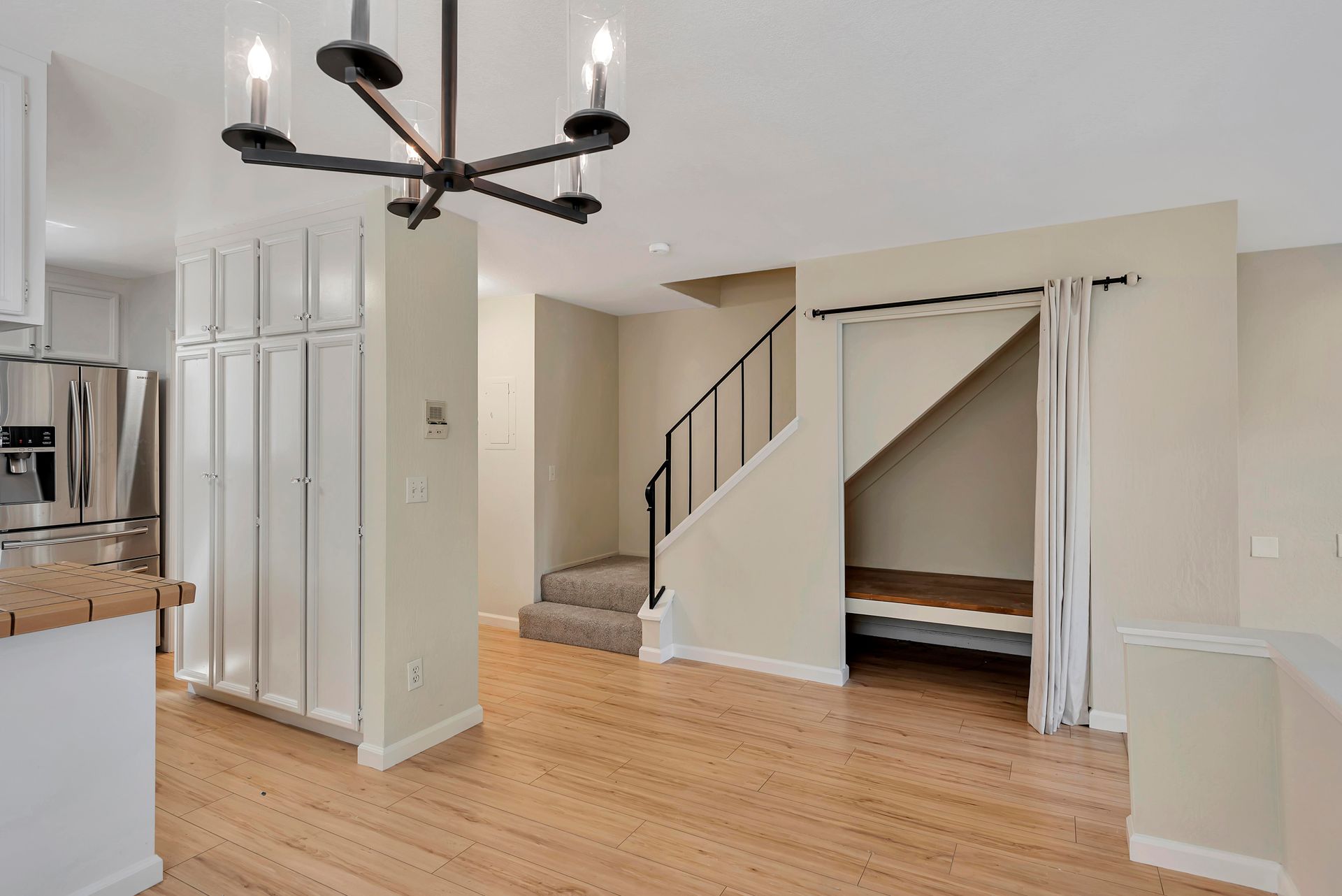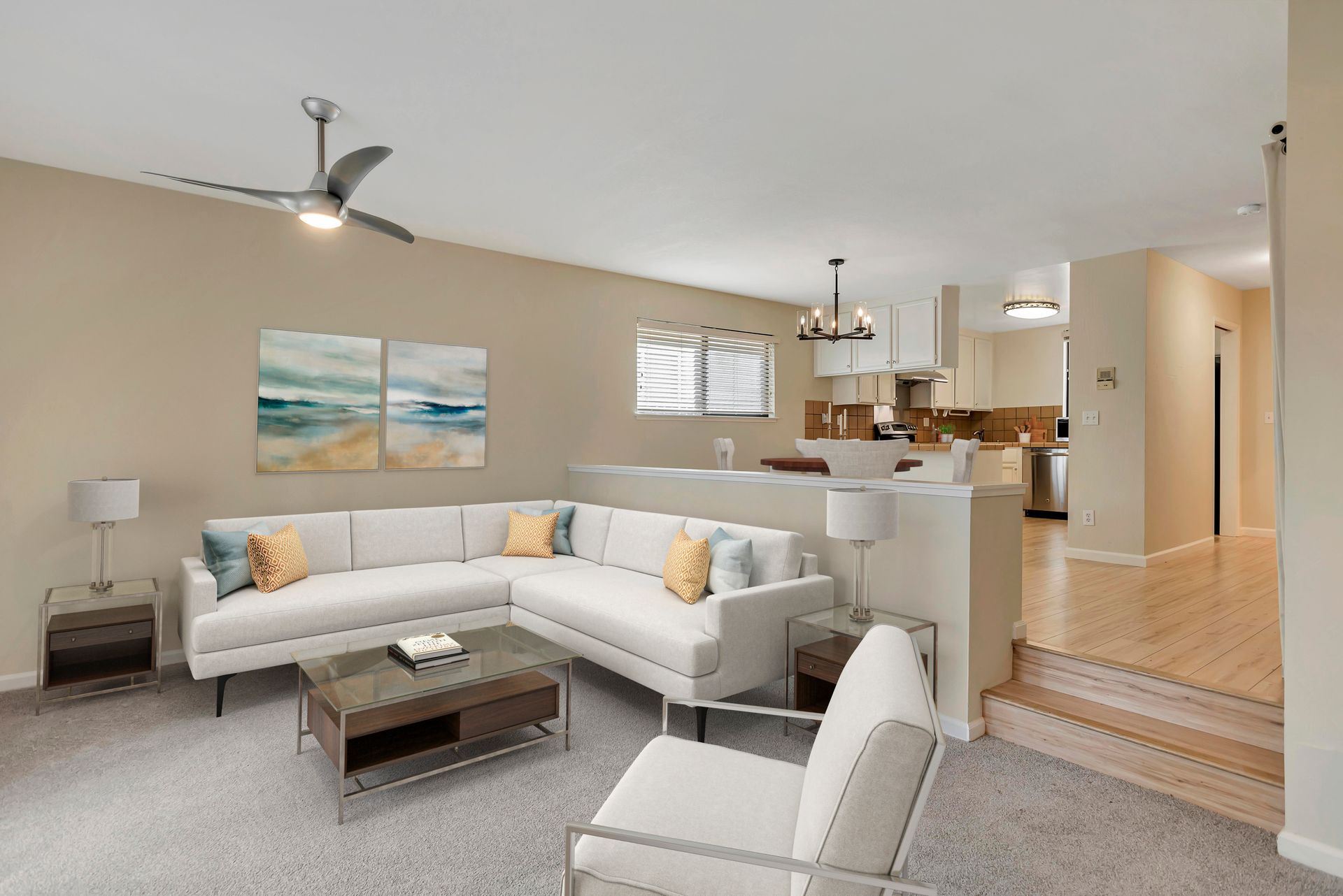 This two-level townhome-style condominium offers two spacious bedrooms and two bathrooms upstairs. A half-bath is located downstairs. Upstairs laundry area with side-by-side washer/dryer included. Fresh paint throughout the home and newly installed carpets. Highlights include double-pane windows, an inviting dining room, and a spacious step-down living room with a wood-burning fireplace, high ceilings, and a glass sliding door that leads to a large inviting private balcony. Excellent indoor-outdoor flow.