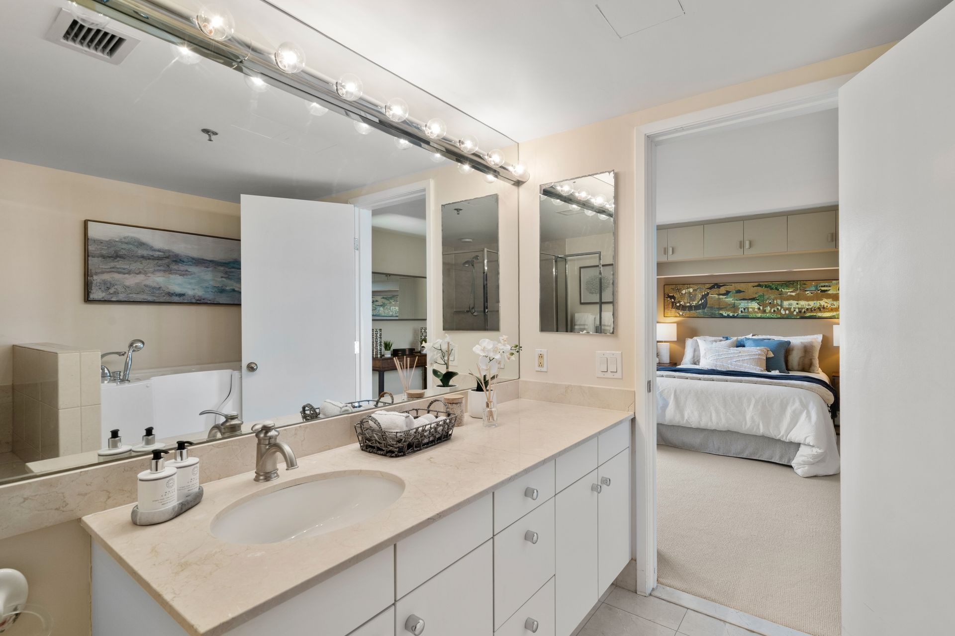The floor plan is meticulously designed, with the two bedrooms situated at opposite ends of the unit for enhanced privacy. The rare half bath adds convenience for guests. Every square foot is utilized efficiently, with virtually no wasted space or long hallways, creating a seamless flow throughout.