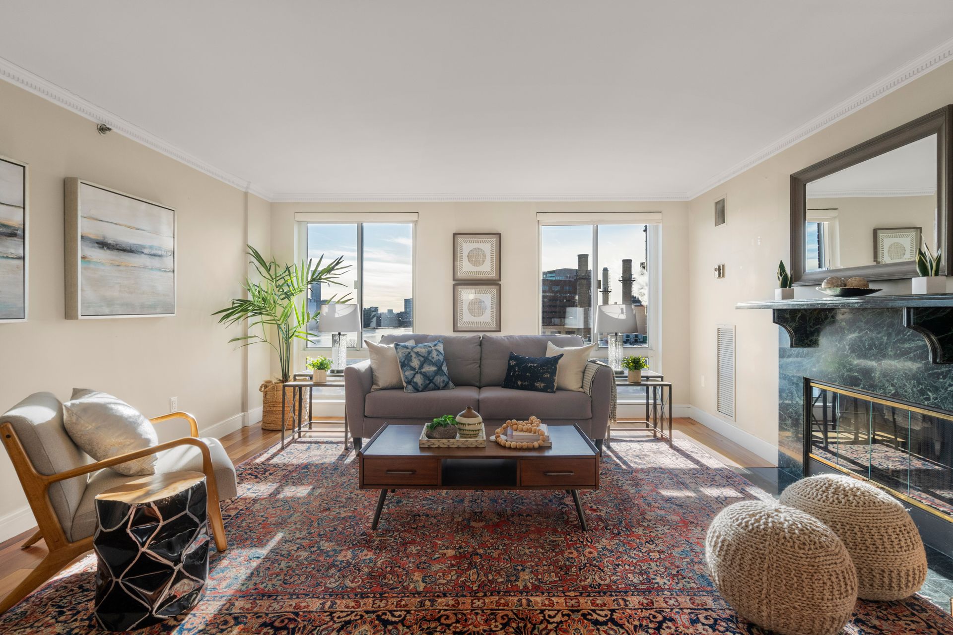 Natural light pours through large windows in every room, and two private balconies provide ideal spaces to relax and unwind. Enjoy your morning coffee on the balcony off the eat-in kitchen, or savor a drink in the living room, while taking in the serene river views, as the sun sets over the skyline.