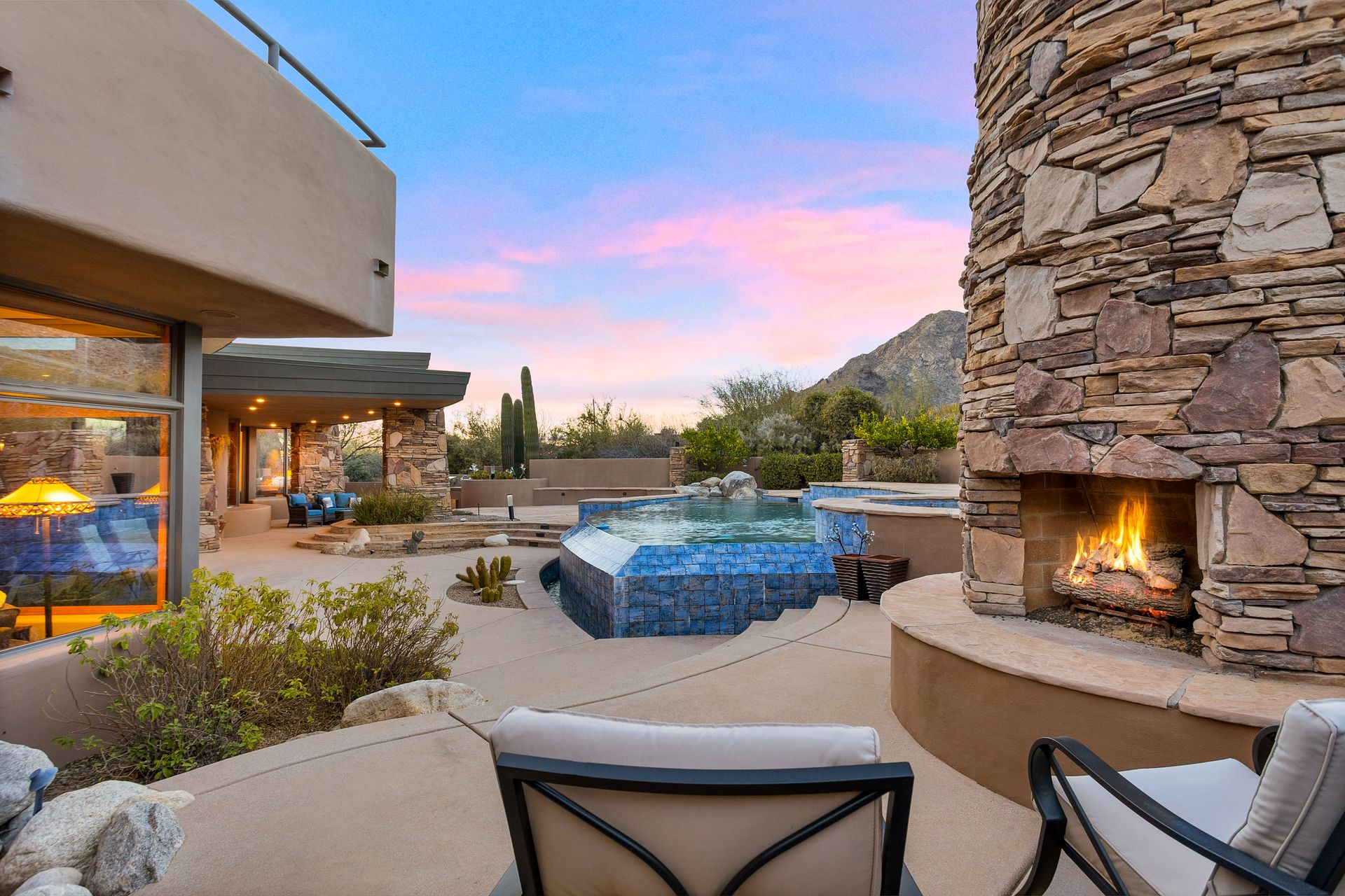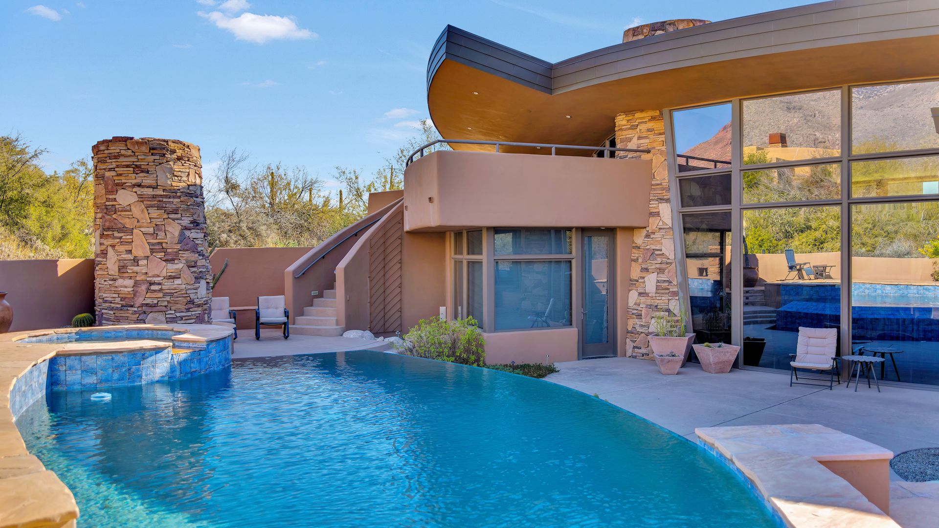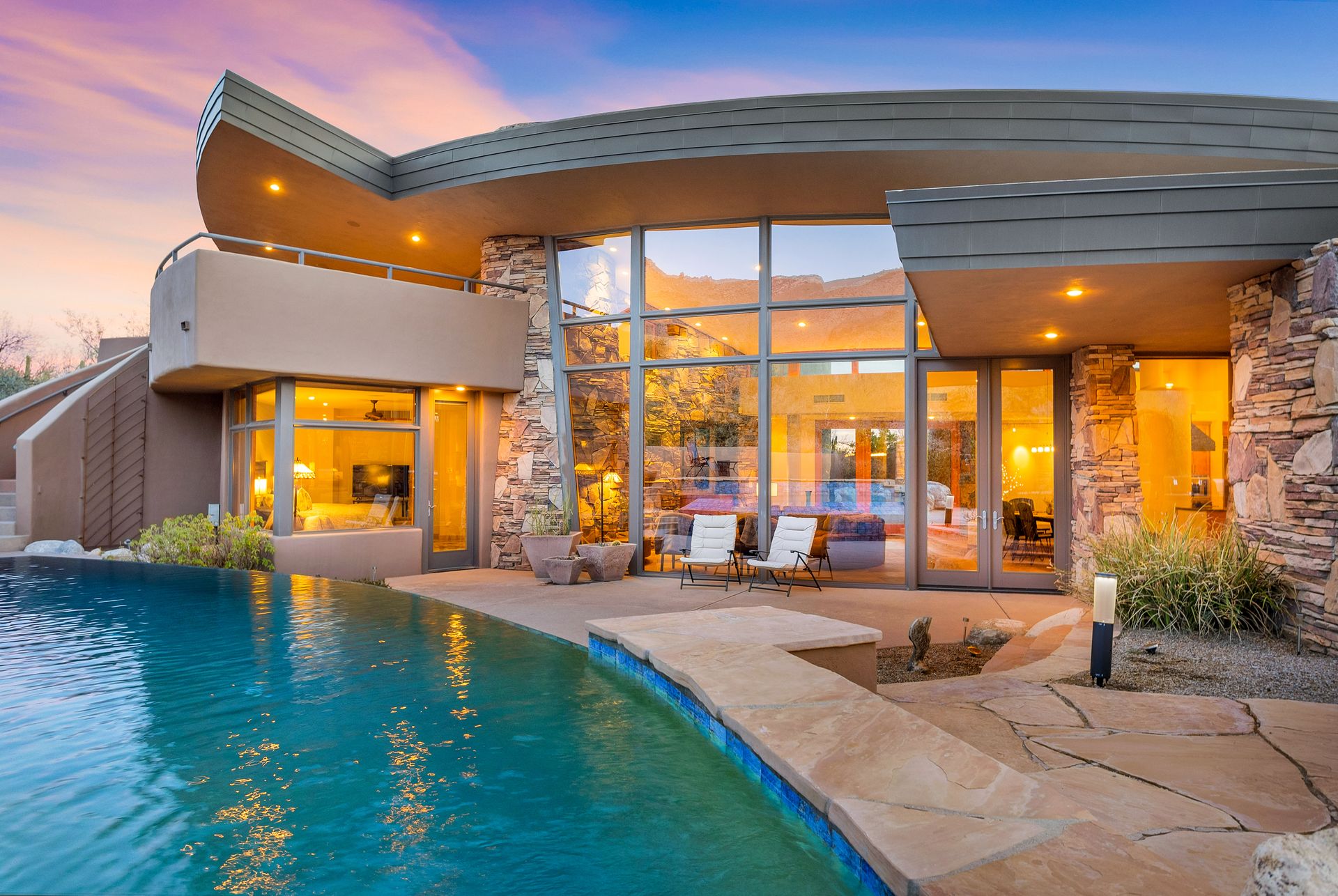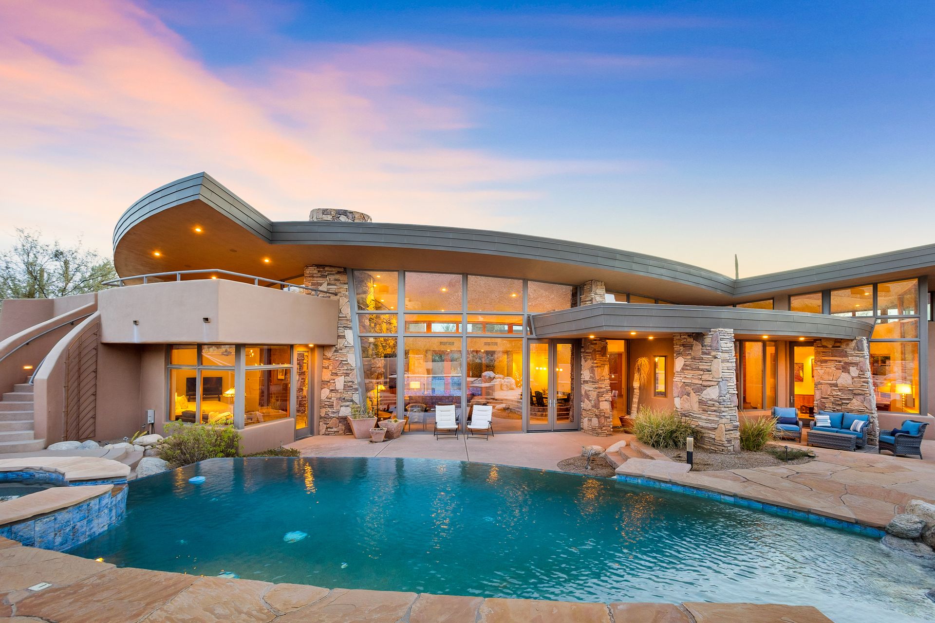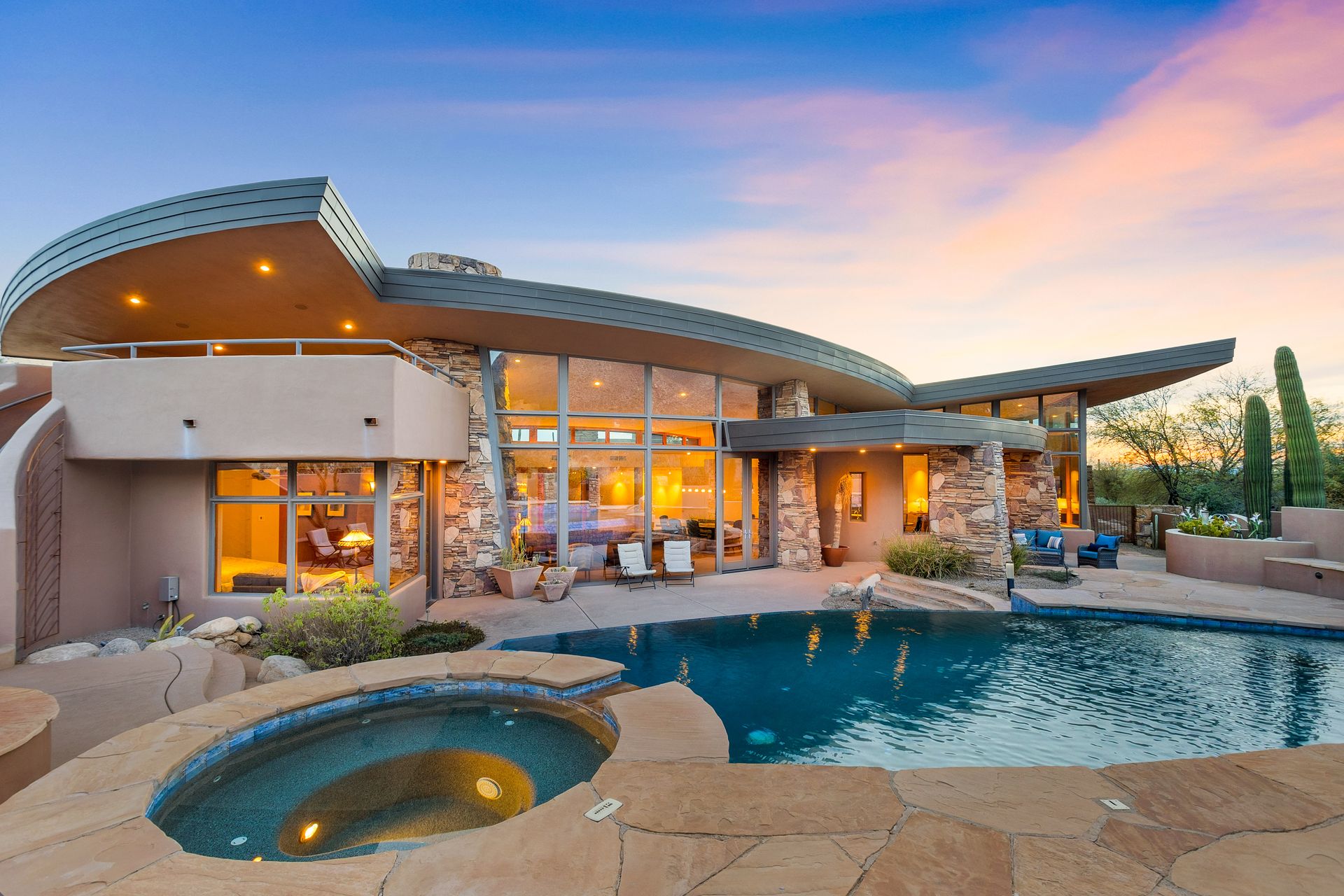 Pima Canyon contemporary home with exemplary display of renowned architect Kevin Howard and designed by Lori Carroll. Stunning private lot beautifully blends the forward-thinking design while integrating the magical backyard of the Sonoran Desert - PRIVACY! Be dazzled by the soaring floor to ceiling curved windows throughout with a touch of warm stone for a fireplace and ledges. The stone flooring is timeless and chosen for the ease of care and desert living. The creative open floor plan blends easy flow, soft and curved walls, and delineates rooms without separating them. The great room just got an entertainment facelift with an updated 85” TV and a fully integrated sound system. The gourmet kitchen includes a Dacor range, two Fisher and Paykel dishwashers, granite, a center island, a true abundance of counter space and a wet bar. The split bedroom, which ensures privacy, has one wing that showcases an oversized master bedroom with a cozy fireplace, a built-in office, a closet fit for a King and Queen and a serene spa-like bathroom. The second wing showcases three oversized guest suites, all with en-suites. A true resort-style home including upper deck for fantastic viewing of all sunrises and sunsets plus a negative overflow spa/pool combination—new tile and pebble sheen. This home is BREATHTAKING!