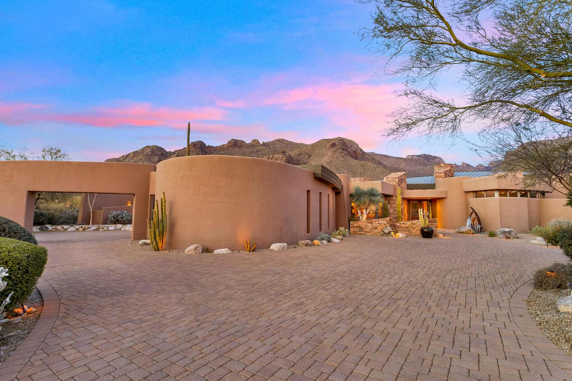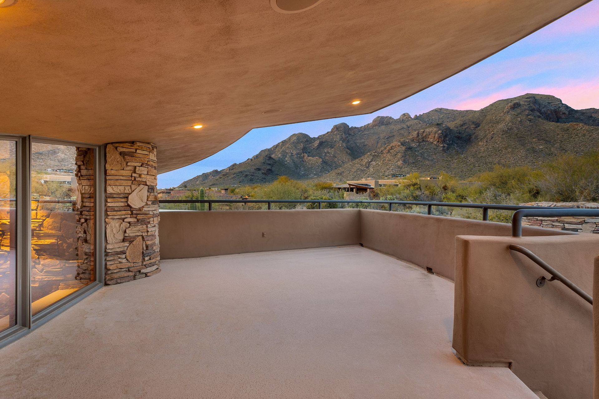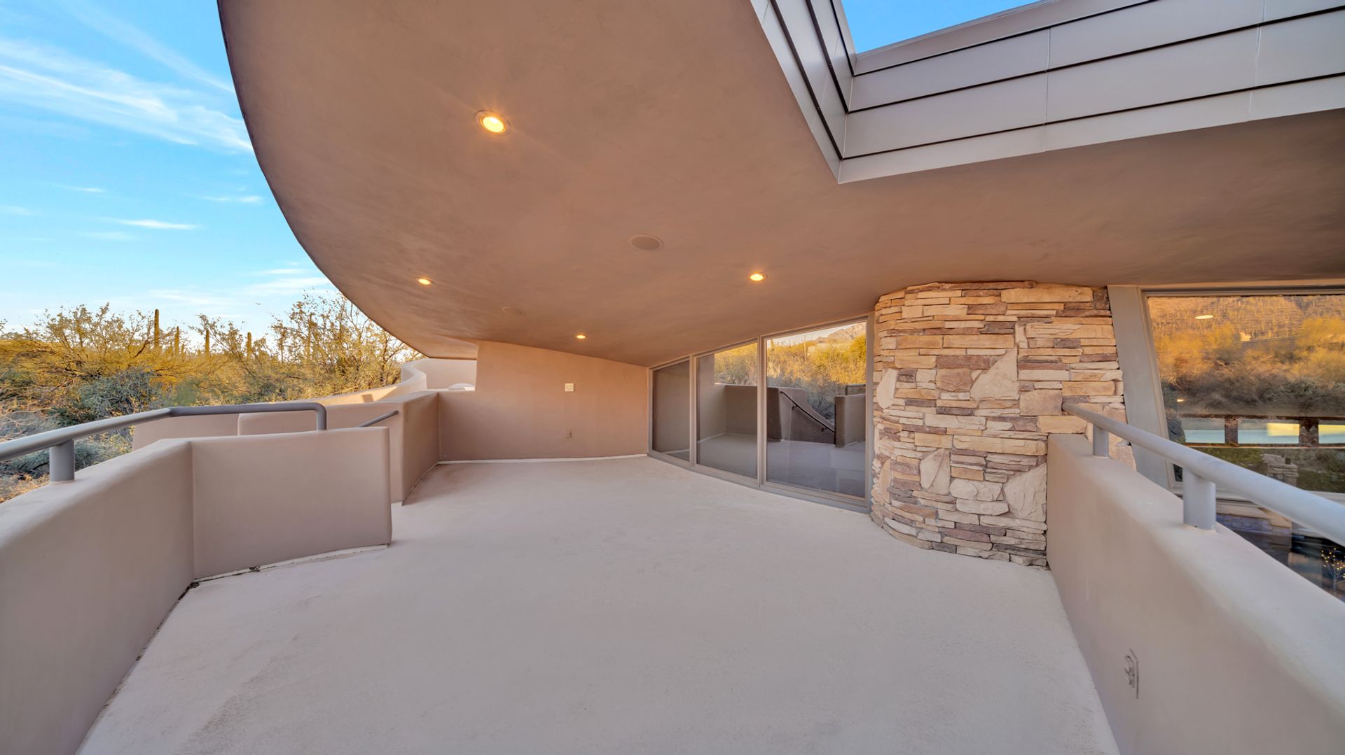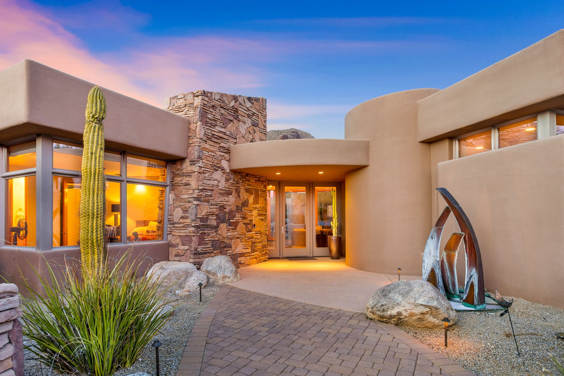 Pima Canyon contemporary home with exemplary display of renowned architect Kevin Howard and designed by Lori Carroll. Stunning private lot beautifully blends the forward-thinking design while integrating the magical backyard of the Sonoran Desert - PRIVACY! Be dazzled by the soaring floor to ceiling curved windows throughout with a touch of warm stone for a fireplace and ledges. The stone flooring is timeless and chosen for the ease of care and desert living. The creative open floor plan blends easy flow, soft and curved walls, and delineates rooms without separating them. The great room just got an entertainment facelift with an updated 85” TV and a fully integrated sound system. The gourmet kitchen includes a Dacor range, two Fisher and Paykel dishwashers, granite, a center island, a true abundance of counter space and a wet bar. The split bedroom, which ensures privacy, has one wing that showcases an oversized master bedroom with a cozy fireplace, a built-in office, a closet fit for a King and Queen and a serene spa-like bathroom. The second wing showcases three oversized guest suites, all with en-suites. A true resort-style home including upper deck for fantastic viewing of all sunrises and sunsets plus a negative overflow spa/pool combination—new tile and pebble sheen. This home is BREATHTAKING!