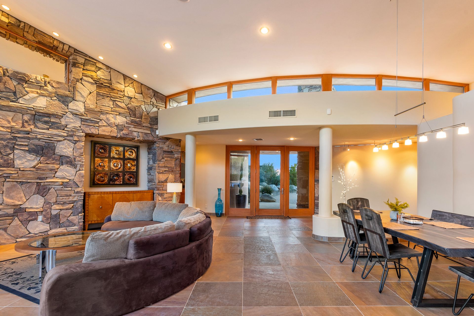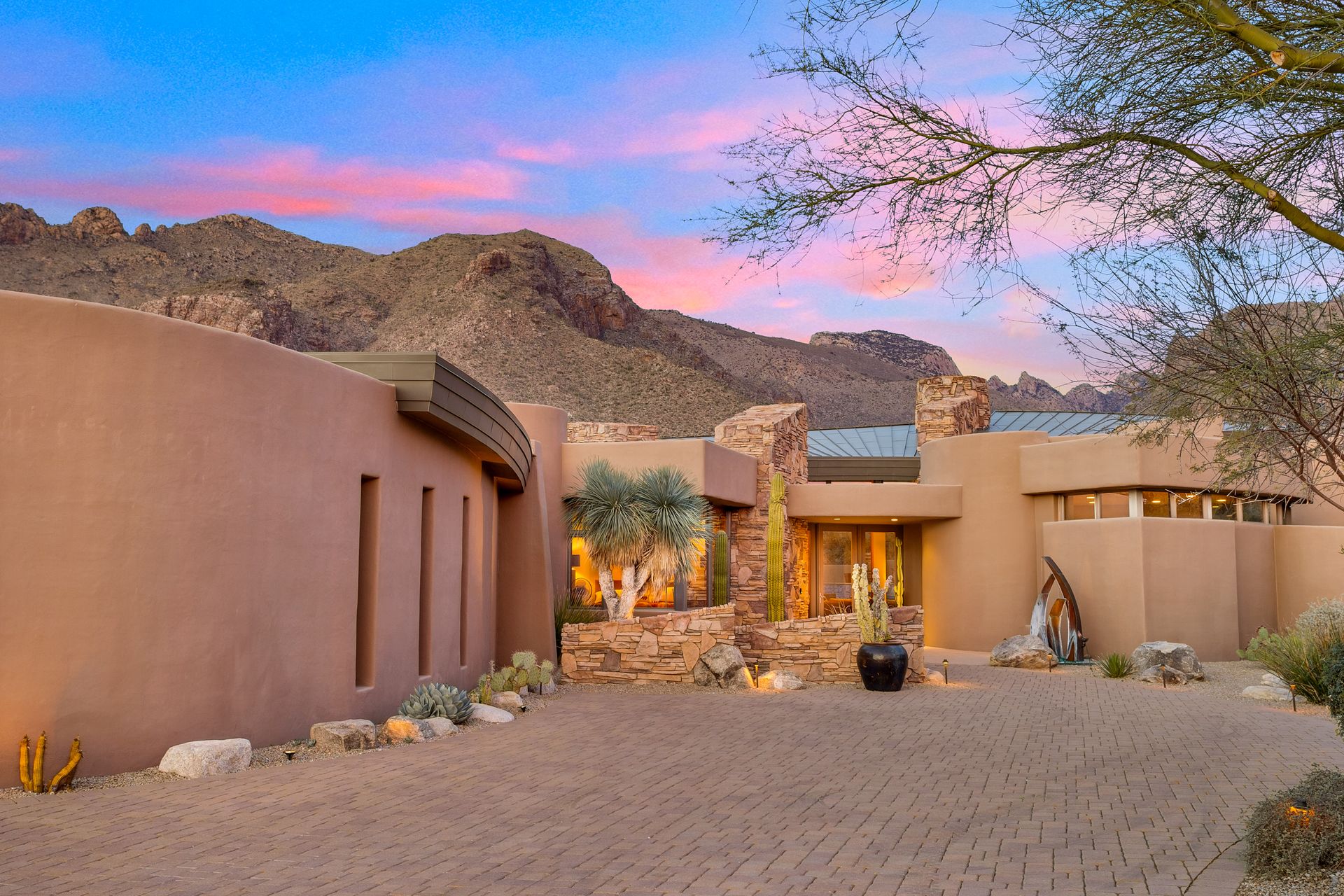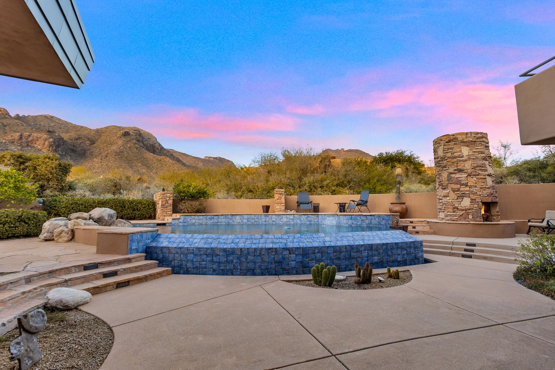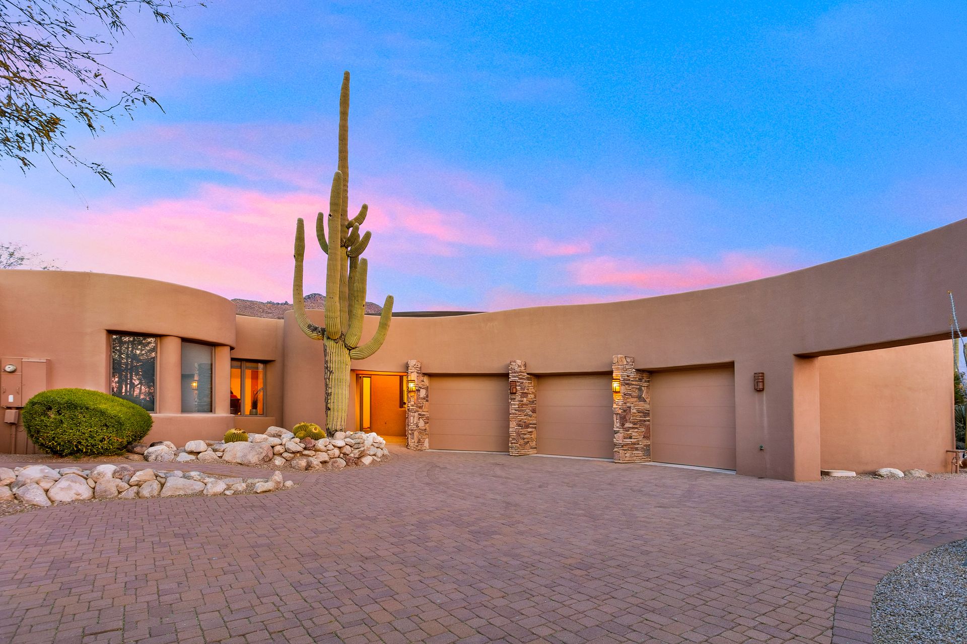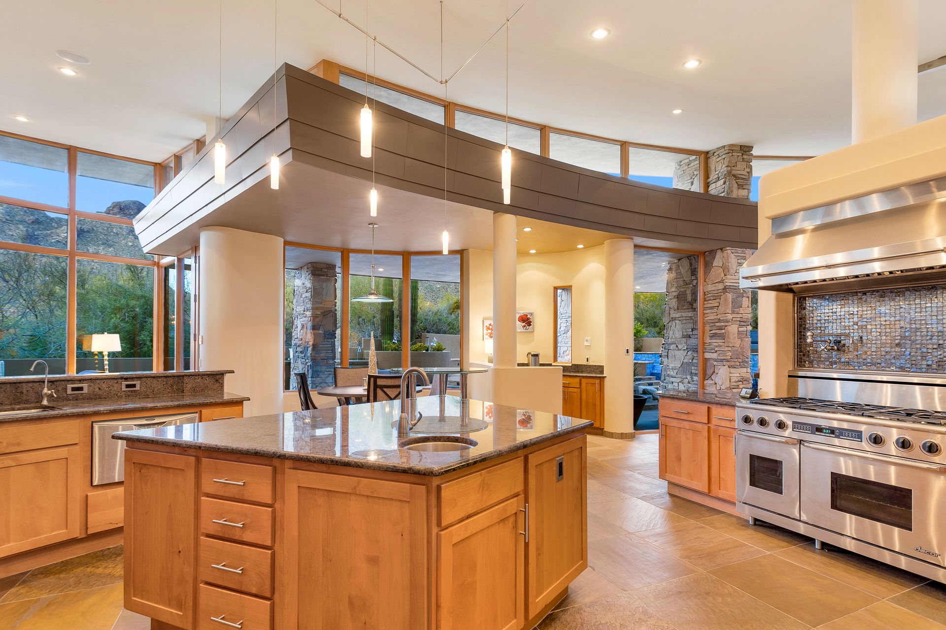 Pima Canyon contemporary home with exemplary display of renowned architect Kevin Howard and designed by Lori Carroll. Stunning private lot beautifully blends the forward-thinking design while integrating the magical backyard of the Sonoran Desert - PRIVACY! Be dazzled by the soaring floor to ceiling curved windows throughout with a touch of warm stone for a fireplace and ledges. The stone flooring is timeless and chosen for the ease of care and desert living. The creative open floor plan blends easy flow, soft and curved walls, and delineates rooms without separating them. The great room just got an entertainment facelift with an updated 85” TV and a fully integrated sound system. The gourmet kitchen includes a Dacor range, two Fisher and Paykel dishwashers, granite, a center island, a true abundance of counter space and a wet bar. The split bedroom, which ensures privacy, has one wing that showcases an oversized master bedroom with a cozy fireplace, a built-in office, a closet fit for a King and Queen and a serene spa-like bathroom. The second wing showcases three oversized guest suites, all with en-suites. A true resort-style home including upper deck for fantastic viewing of all sunrises and sunsets plus a negative overflow spa/pool combination—new tile and pebble sheen. This home is BREATHTAKING!