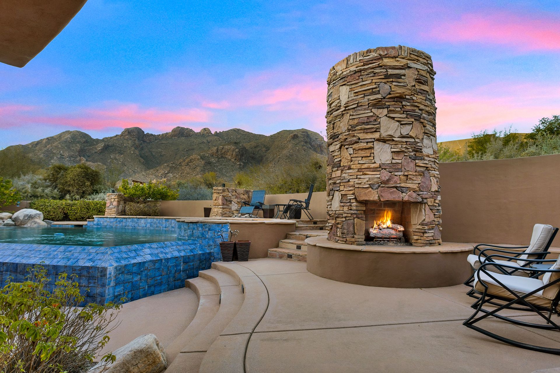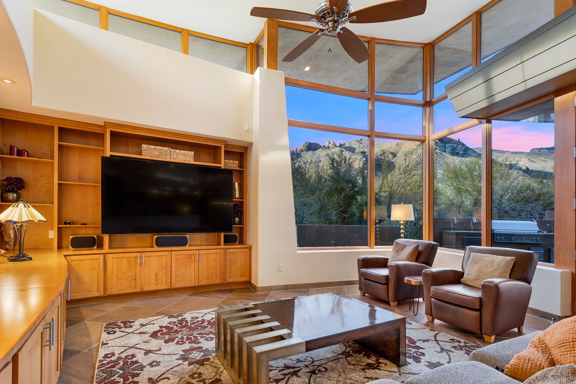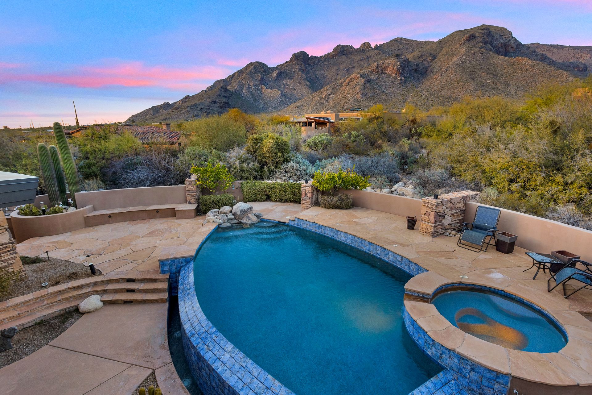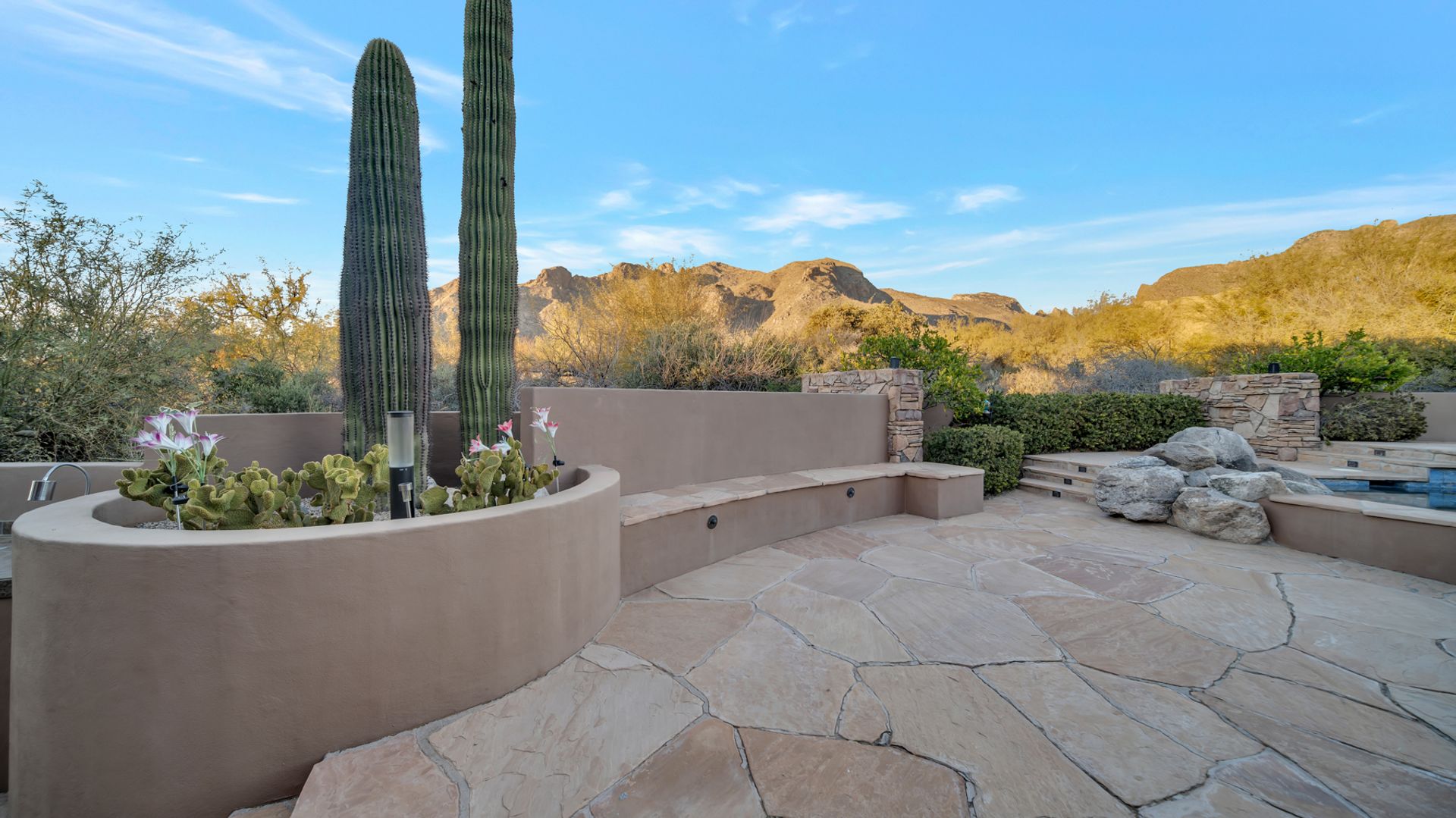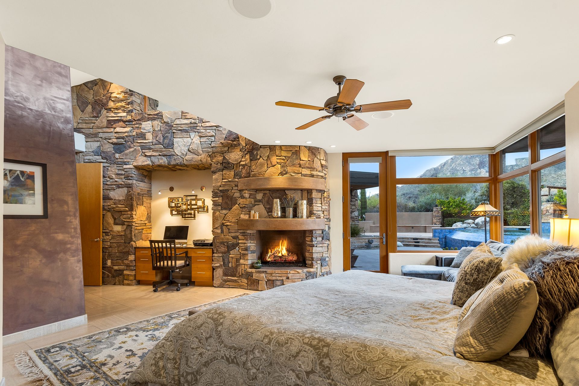 Pima Canyon contemporary home with exemplary display of renowned architect Kevin Howard and designed by Lori Carroll. Stunning private lot beautifully blends the forward-thinking design while integrating the magical backyard of the Sonoran Desert - PRIVACY! Be dazzled by the soaring floor to ceiling curved windows throughout with a touch of warm stone for a fireplace and ledges. The stone flooring is timeless and chosen for the ease of care and desert living. The creative open floor plan blends easy flow, soft and curved walls, and delineates rooms without separating them. The great room just got an entertainment facelift with an updated 85” TV and a fully integrated sound system. The gourmet kitchen includes a Dacor range, two Fisher and Paykel dishwashers, granite, a center island, a true abundance of counter space and a wet bar. The split bedroom, which ensures privacy, has one wing that showcases an oversized master bedroom with a cozy fireplace, a built-in office, a closet fit for a King and Queen and a serene spa-like bathroom. The second wing showcases three oversized guest suites, all with en-suites. A true resort-style home including upper deck for fantastic viewing of all sunrises and sunsets plus a negative overflow spa/pool combination—new tile and pebble sheen. This home is BREATHTAKING!