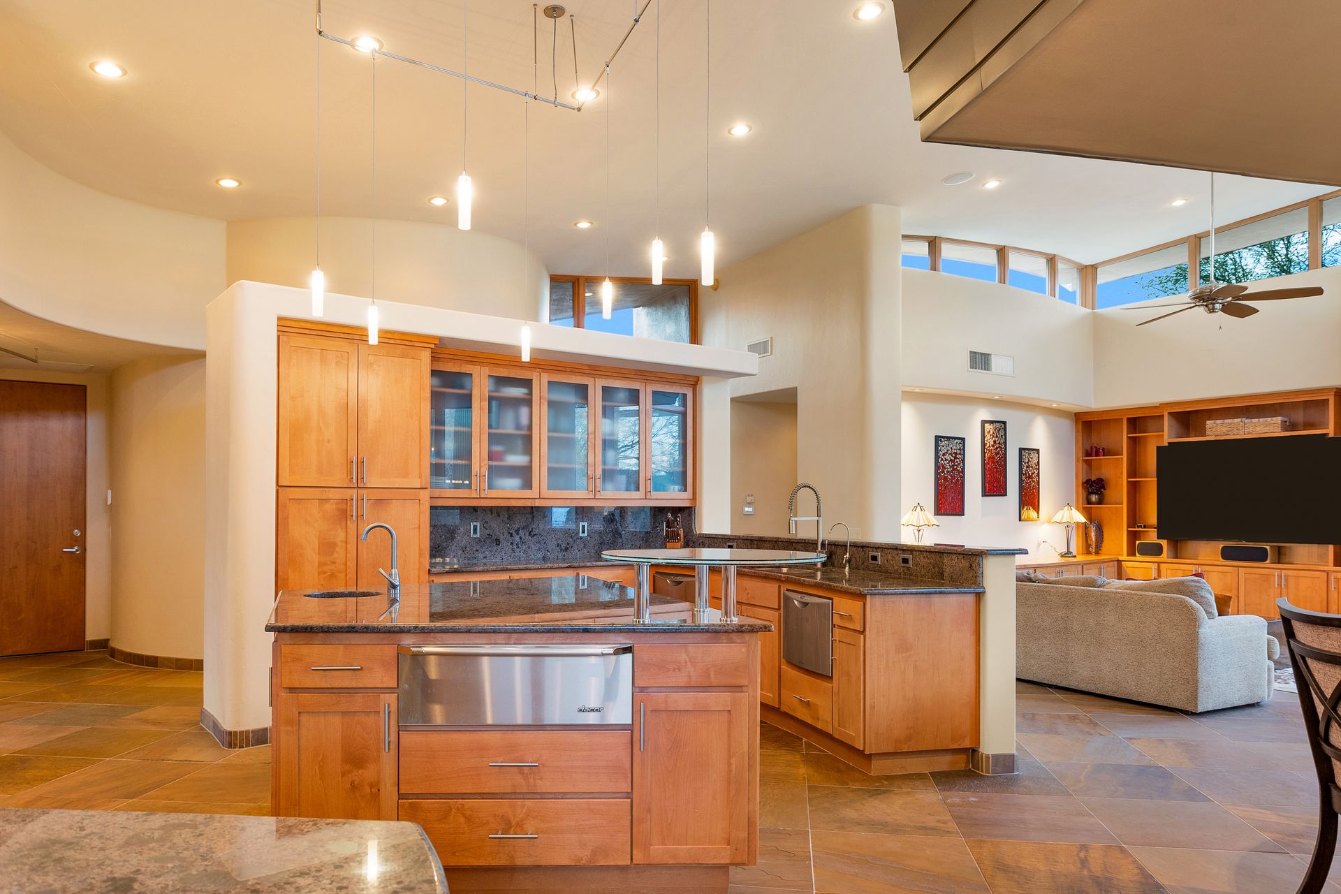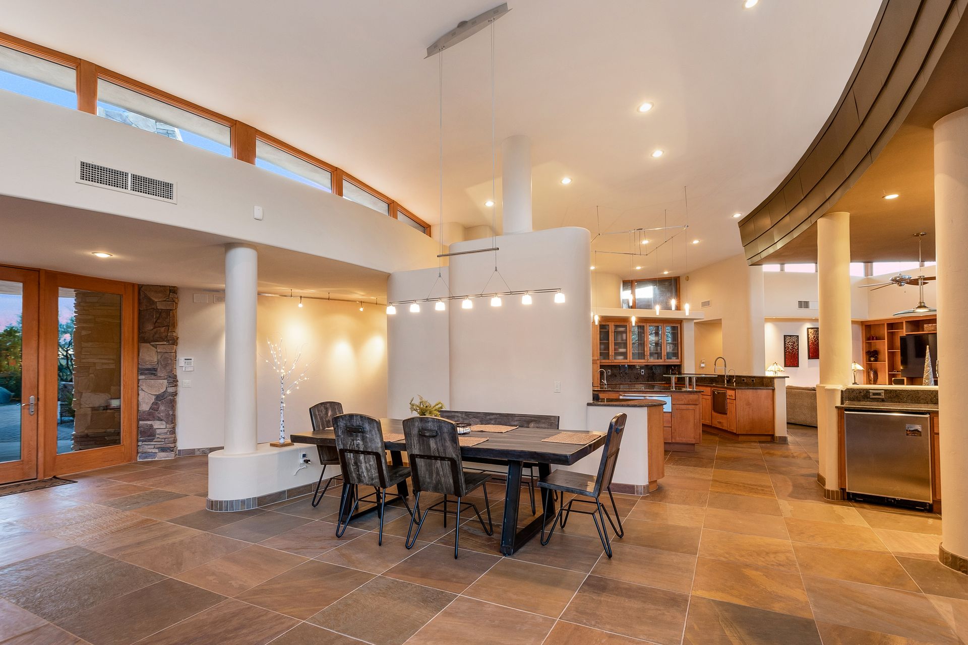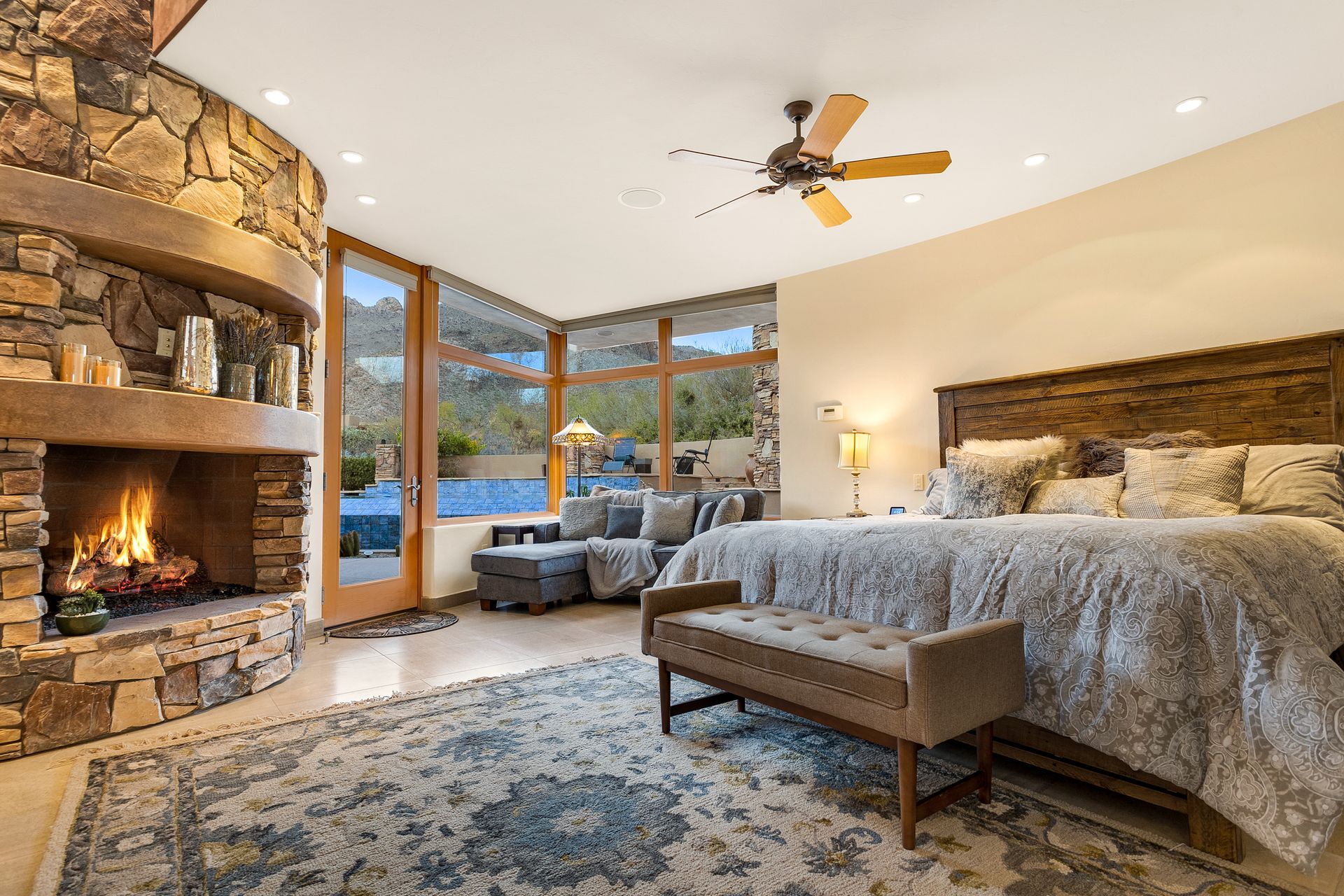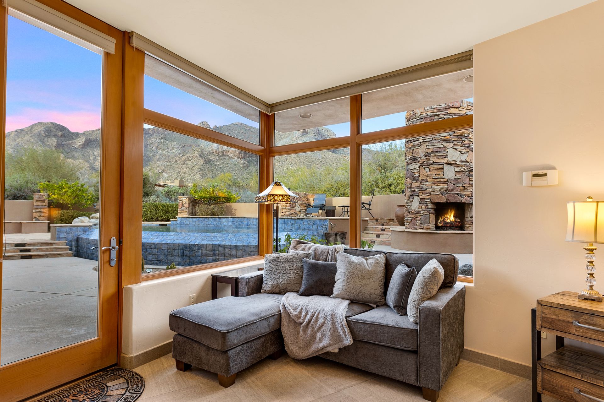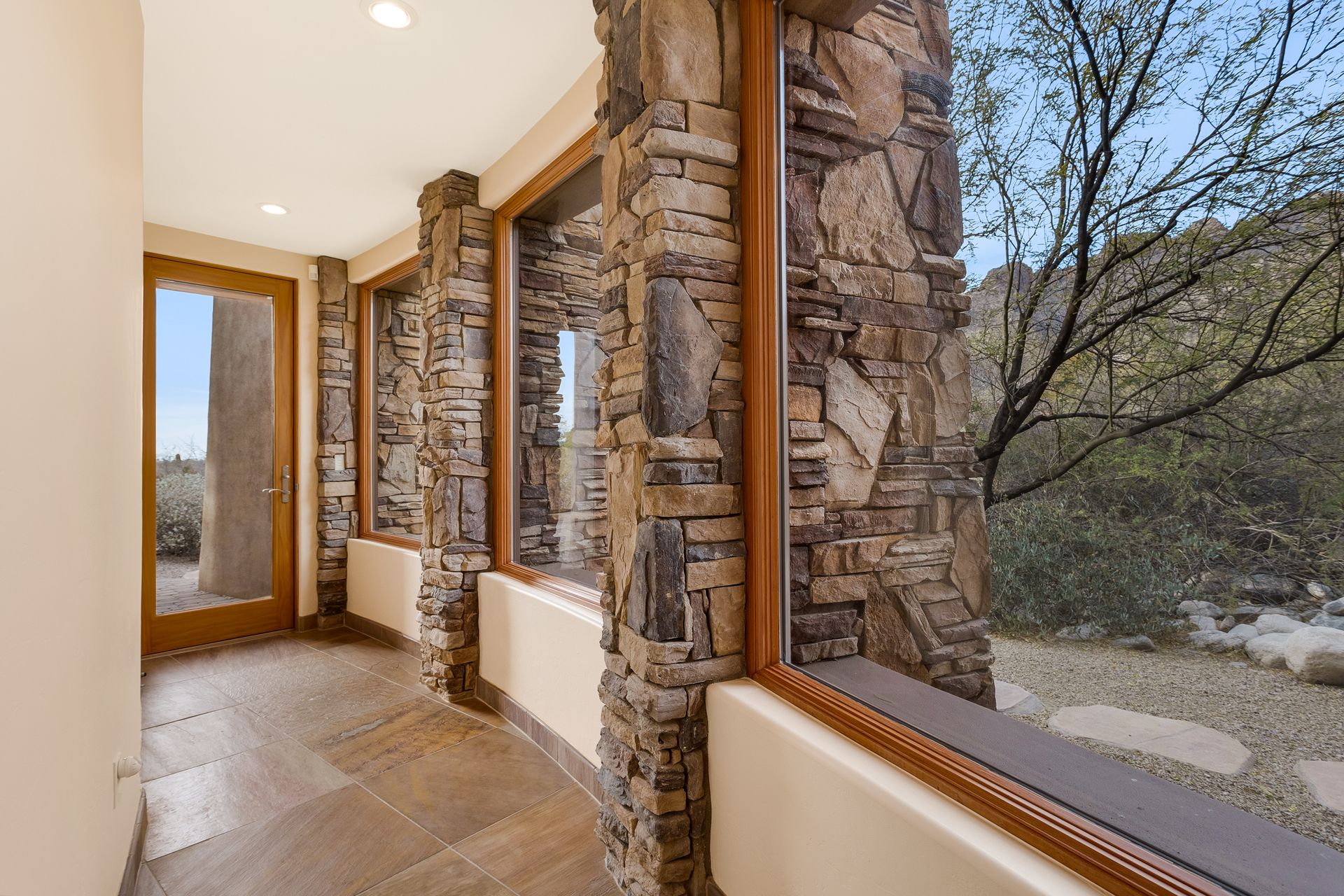 Pima Canyon contemporary home with exemplary display of renowned architect Kevin Howard and designed by Lori Carroll. Stunning private lot beautifully blends the forward-thinking design while integrating the magical backyard of the Sonoran Desert - PRIVACY! Be dazzled by the soaring floor to ceiling curved windows throughout with a touch of warm stone for a fireplace and ledges. The stone flooring is timeless and chosen for the ease of care and desert living. The creative open floor plan blends easy flow, soft and curved walls, and delineates rooms without separating them. The great room just got an entertainment facelift with an updated 85” TV and a fully integrated sound system. The gourmet kitchen includes a Dacor range, two Fisher and Paykel dishwashers, granite, a center island, a true abundance of counter space and a wet bar. The split bedroom, which ensures privacy, has one wing that showcases an oversized master bedroom with a cozy fireplace, a built-in office, a closet fit for a King and Queen and a serene spa-like bathroom. The second wing showcases three oversized guest suites, all with en-suites. A true resort-style home including upper deck for fantastic viewing of all sunrises and sunsets plus a negative overflow spa/pool combination—new tile and pebble sheen. This home is BREATHTAKING!
