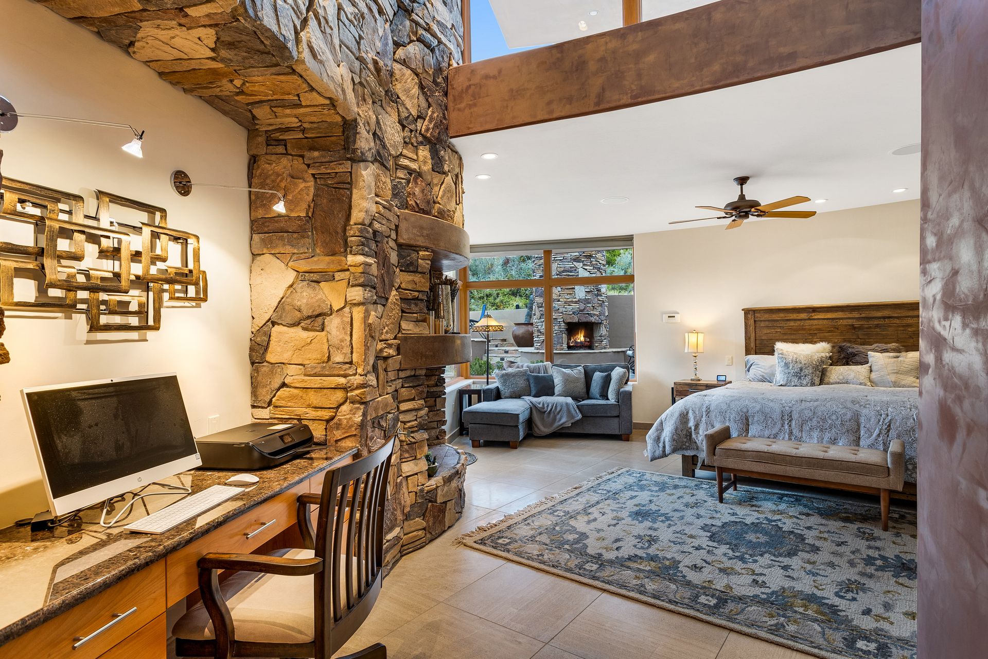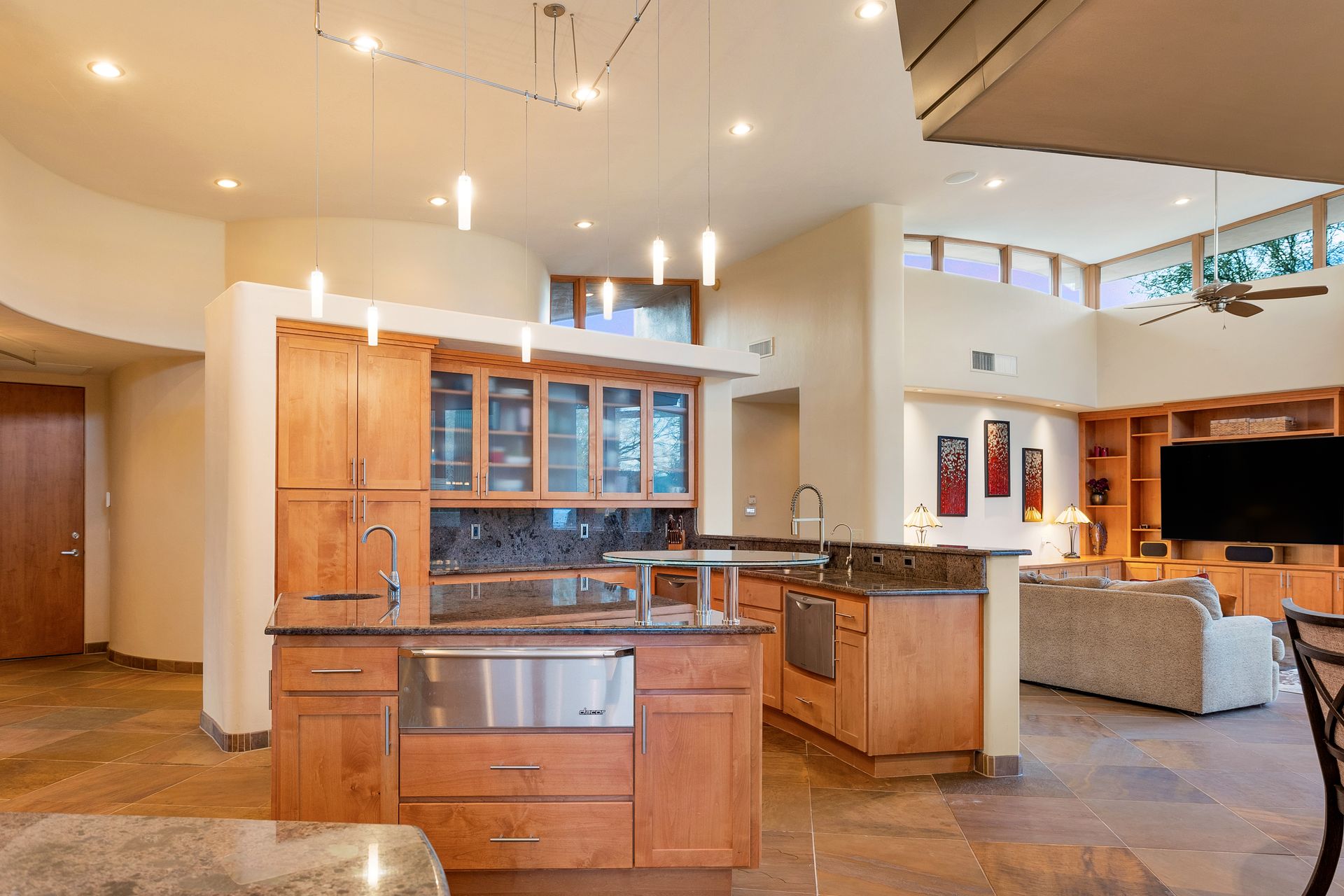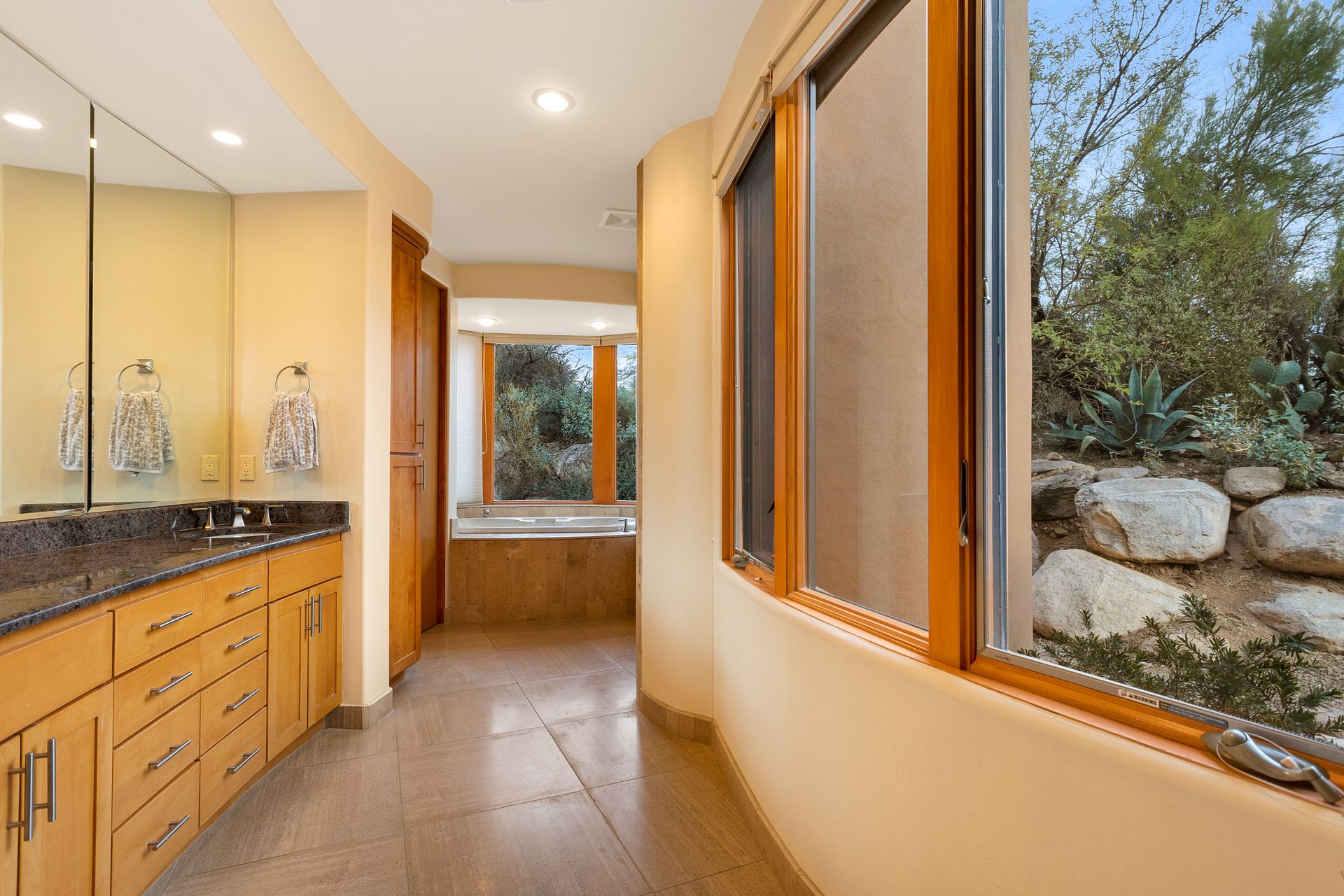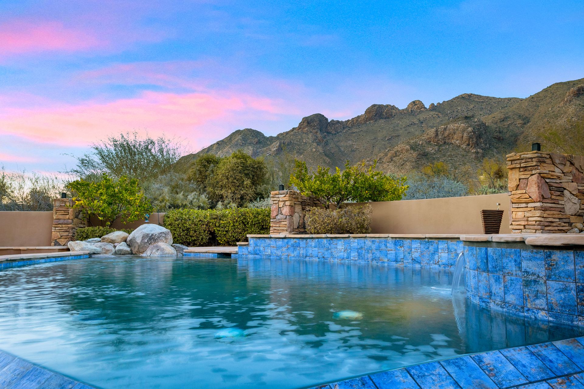 Pima Canyon contemporary home with exemplary display of renowned architect Kevin Howard and designed by Lori Carroll. Stunning private lot beautifully blends the forward-thinking design while integrating the magical backyard of the Sonoran Desert - PRIVACY! Be dazzled by the soaring floor to ceiling curved windows throughout with a touch of warm stone for a fireplace and ledges. The stone flooring is timeless and chosen for the ease of care and desert living. The creative open floor plan blends easy flow, soft and curved walls, and delineates rooms without separating them. The great room just got an entertainment facelift with an updated 85” TV and a fully integrated sound system. The gourmet kitchen includes a Dacor range, two Fisher and Paykel dishwashers, granite, a center island, a true abundance of counter space and a wet bar. The split bedroom, which ensures privacy, has one wing that showcases an oversized master bedroom with a cozy fireplace, a built-in office, a closet fit for a King and Queen and a serene spa-like bathroom. The second wing showcases three oversized guest suites, all with en-suites. A true resort-style home including upper deck for fantastic viewing of all sunrises and sunsets plus a negative overflow spa/pool combination—new tile and pebble sheen. This home is BREATHTAKING!