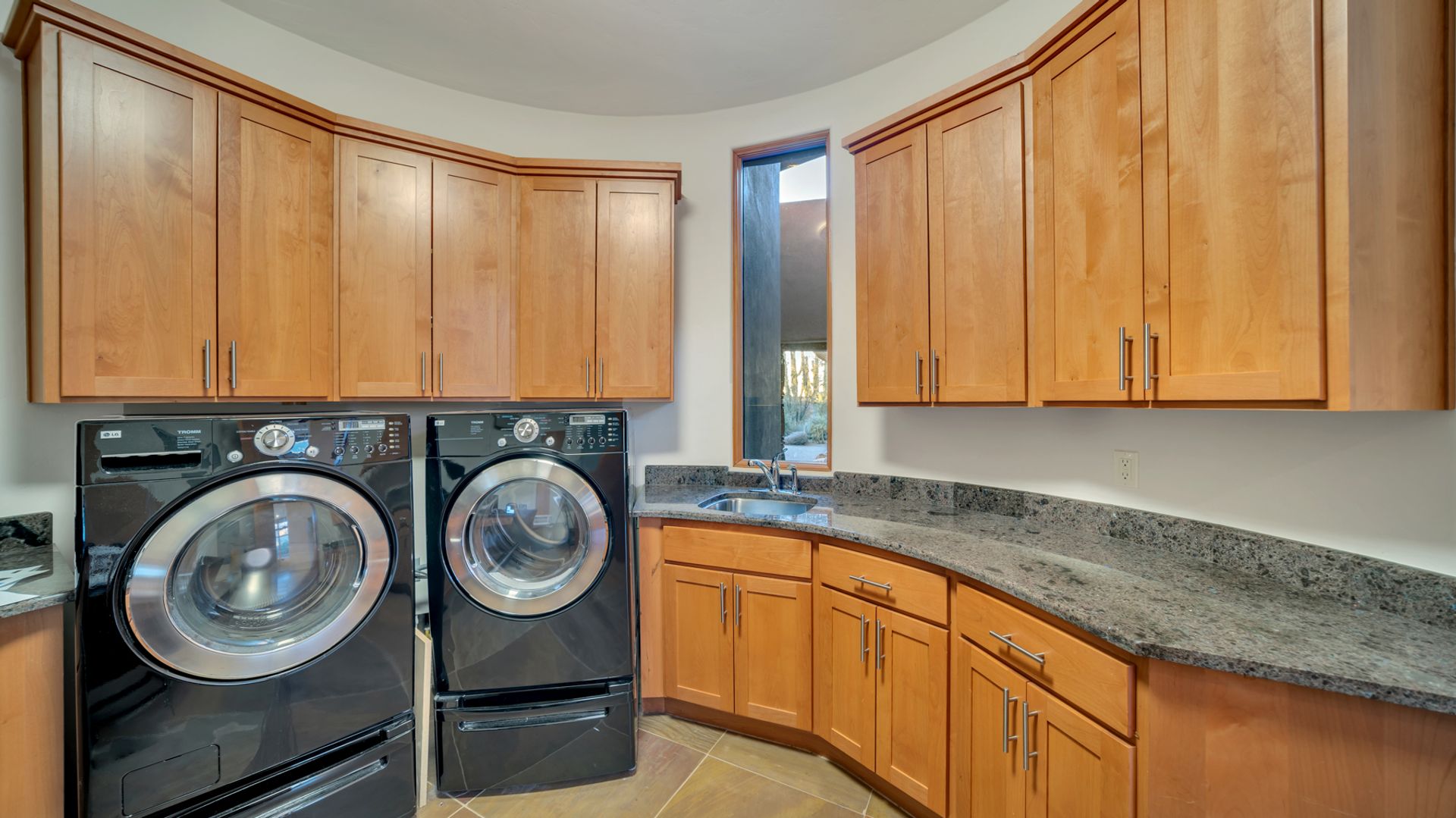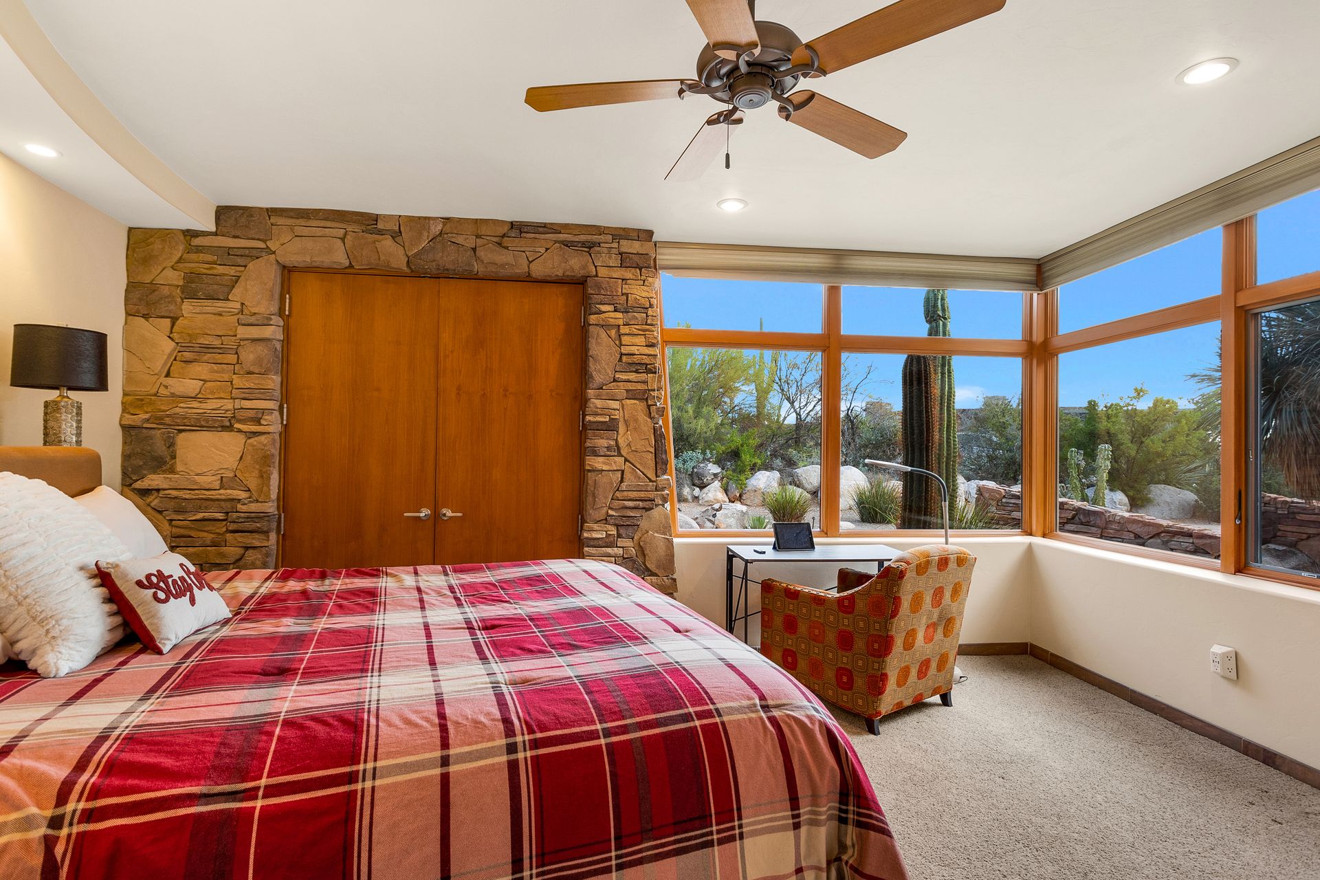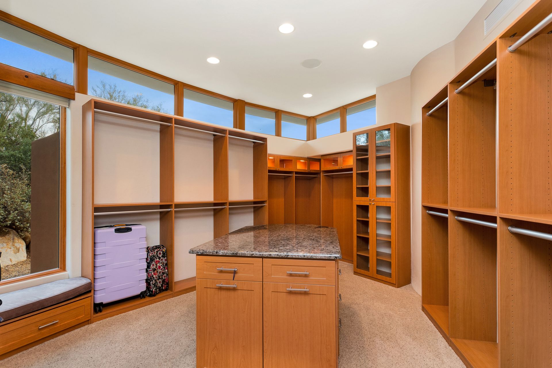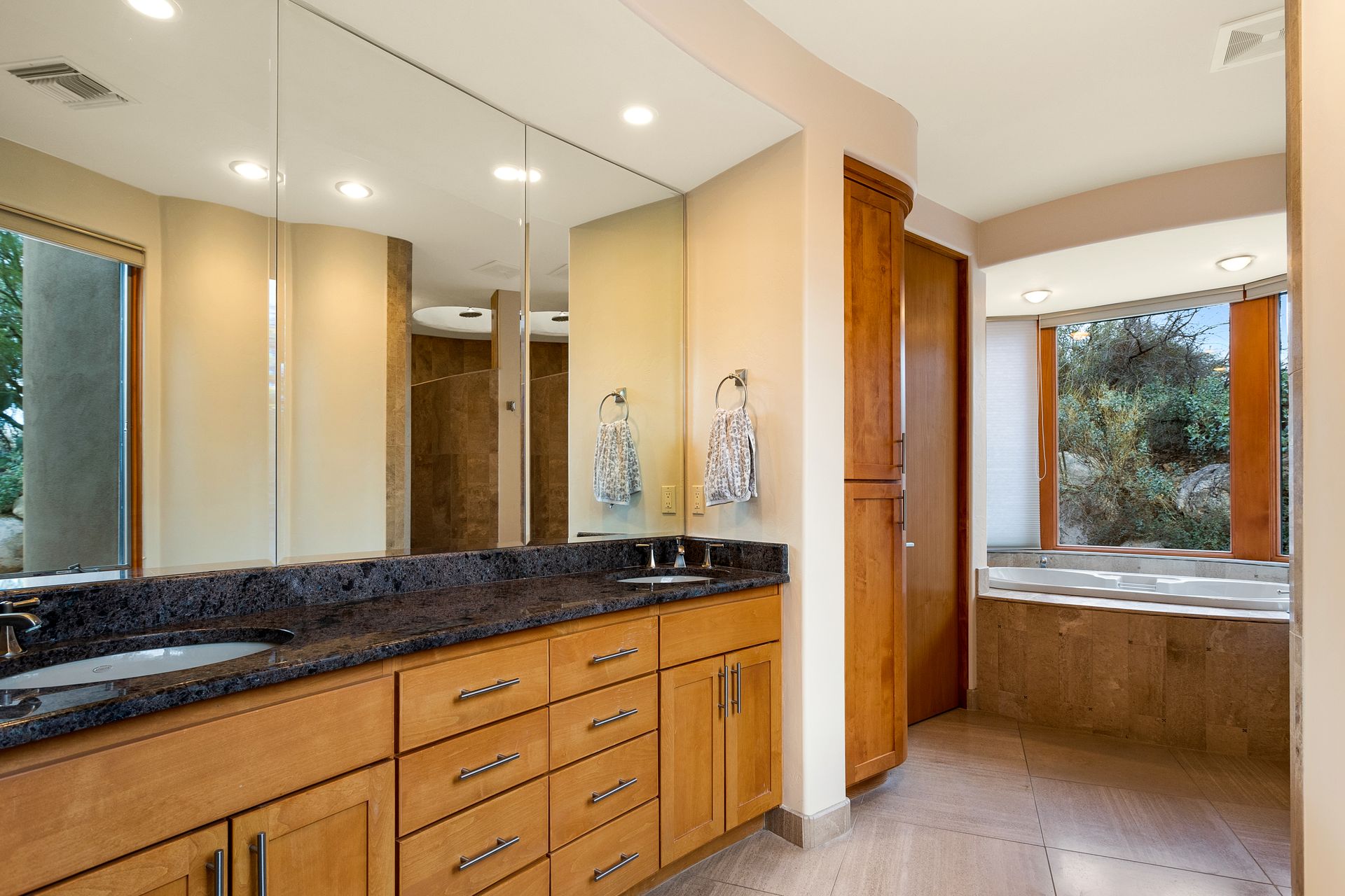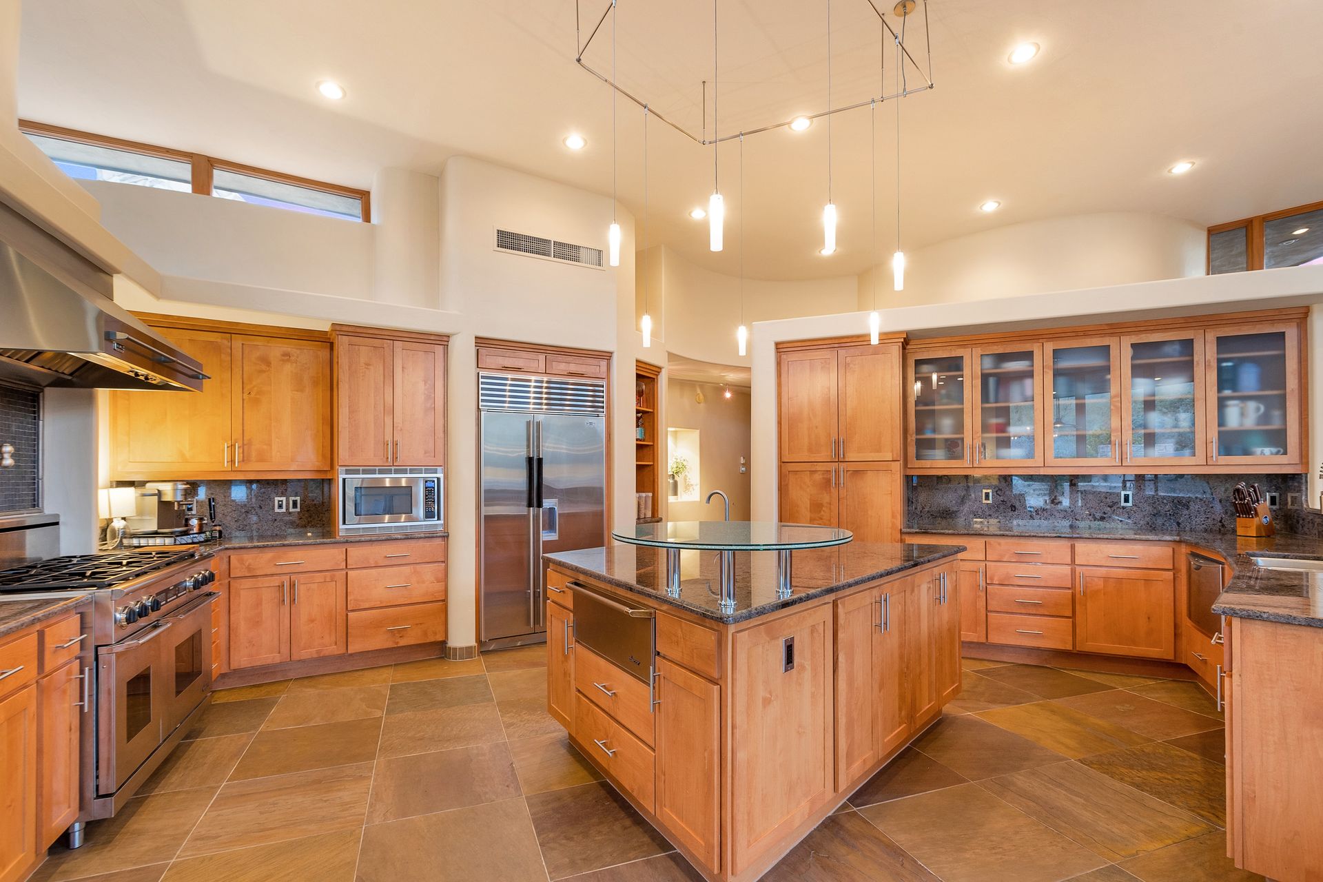 Pima Canyon contemporary home with exemplary display of renowned architect Kevin Howard and designed by Lori Carroll. Stunning private lot beautifully blends the forward-thinking design while integrating the magical backyard of the Sonoran Desert - PRIVACY! Be dazzled by the soaring floor to ceiling curved windows throughout with a touch of warm stone for a fireplace and ledges. The stone flooring is timeless and chosen for the ease of care and desert living. The creative open floor plan blends easy flow, soft and curved walls, and delineates rooms without separating them. The great room just got an entertainment facelift with an updated 85” TV and a fully integrated sound system. The gourmet kitchen includes a Dacor range, two Fisher and Paykel dishwashers, granite, a center island, a true abundance of counter space and a wet bar. The split bedroom, which ensures privacy, has one wing that showcases an oversized master bedroom with a cozy fireplace, a built-in office, a closet fit for a King and Queen and a serene spa-like bathroom. The second wing showcases three oversized guest suites, all with en-suites. A true resort-style home including upper deck for fantastic viewing of all sunrises and sunsets plus a negative overflow spa/pool combination—new tile and pebble sheen. This home is BREATHTAKING!