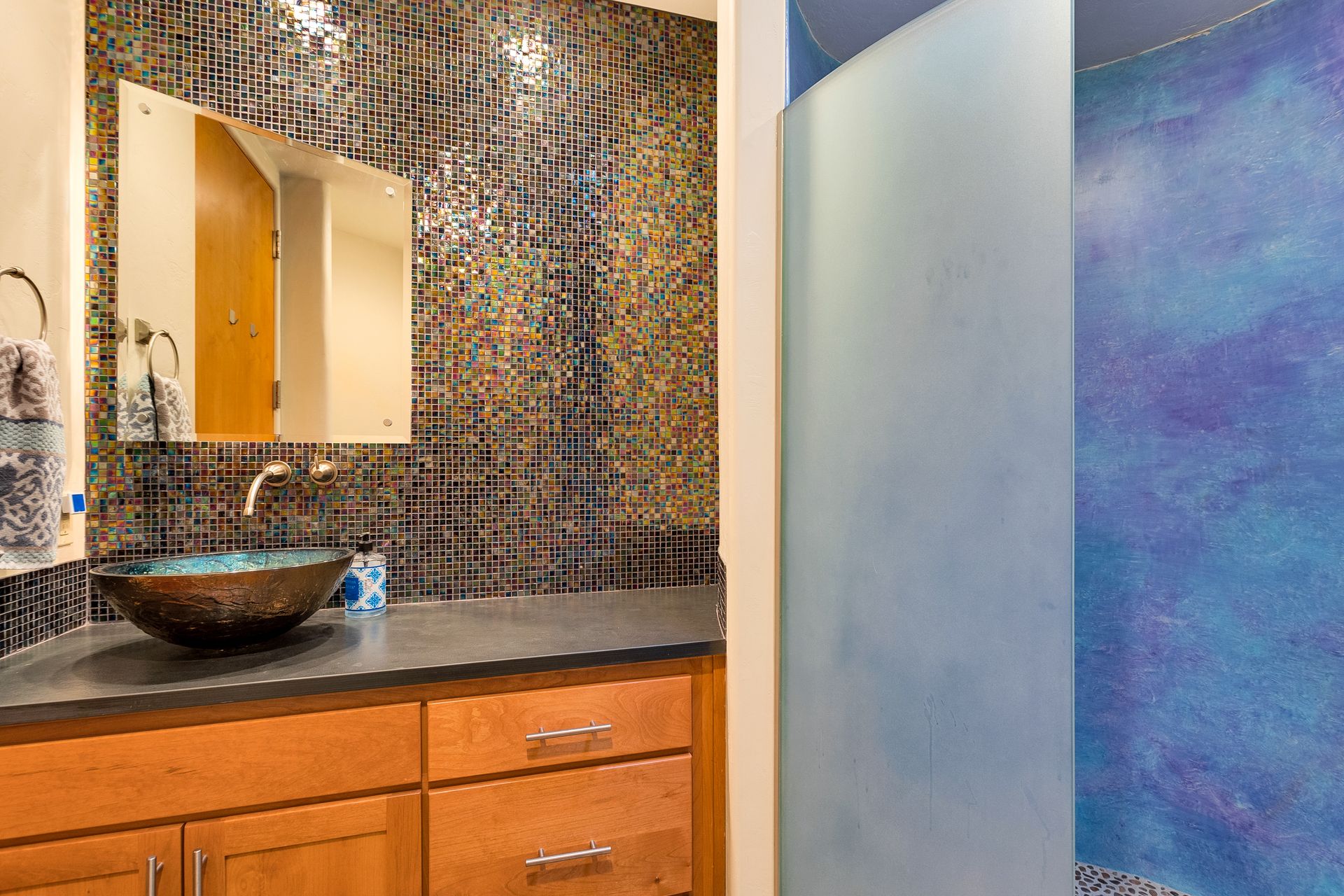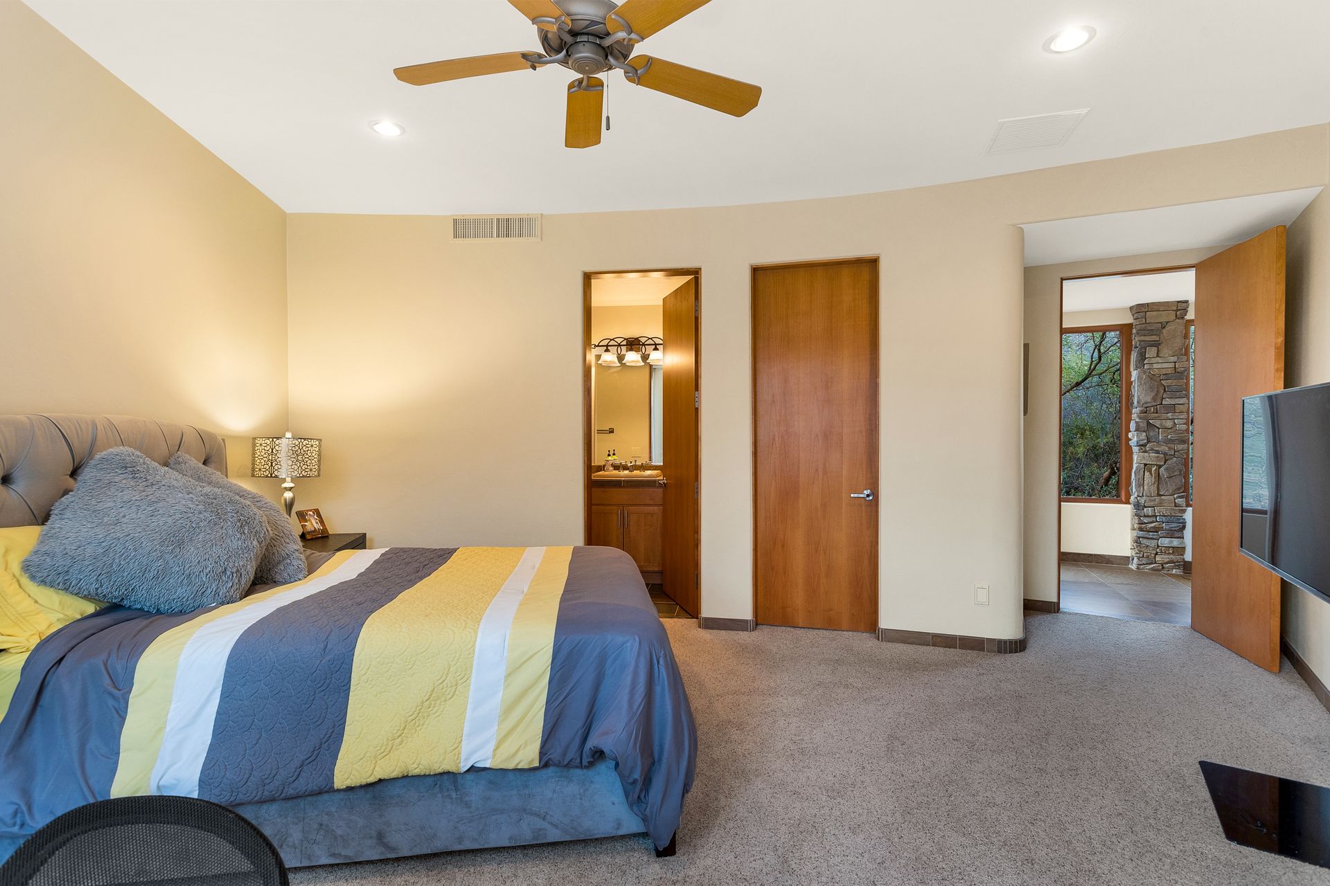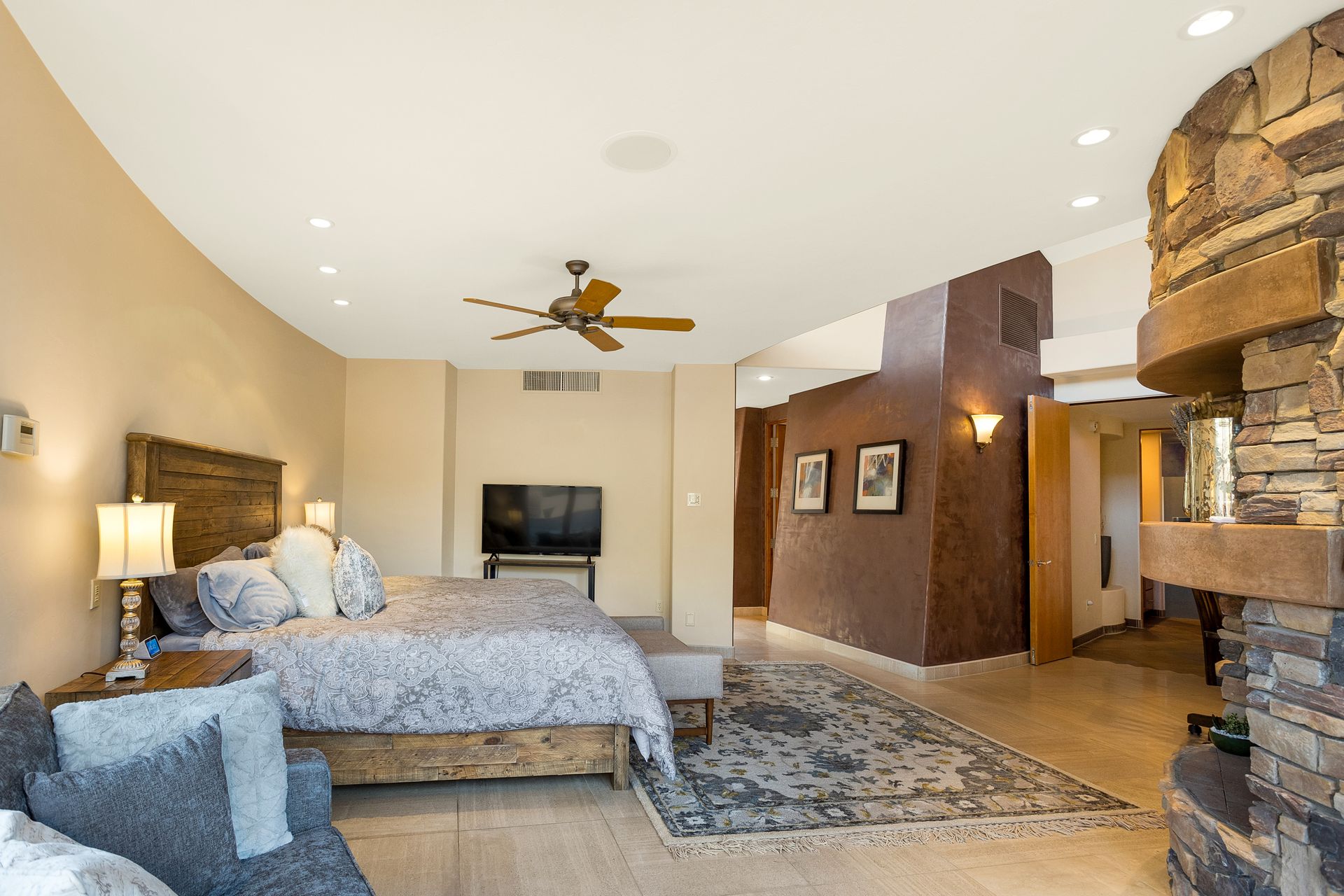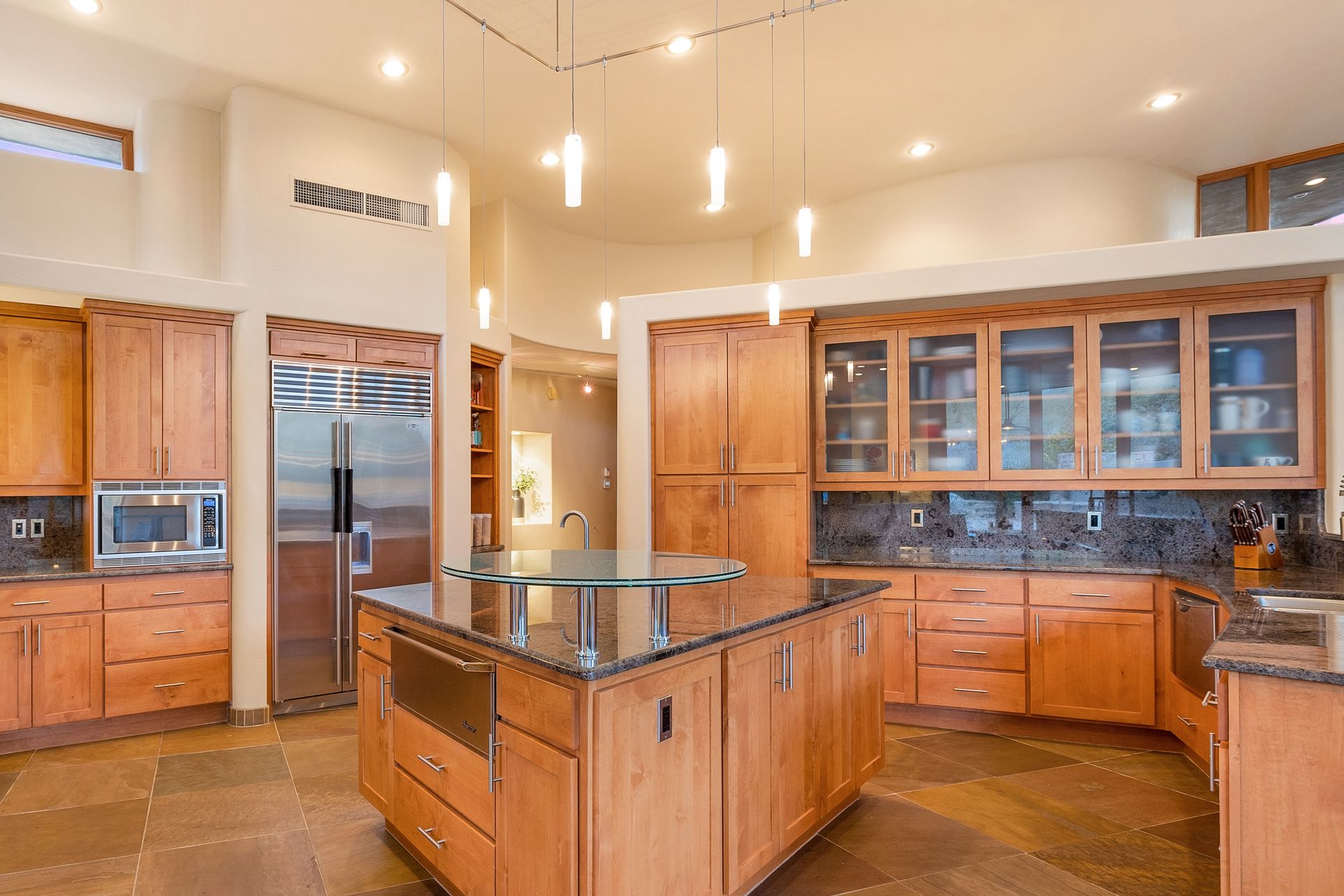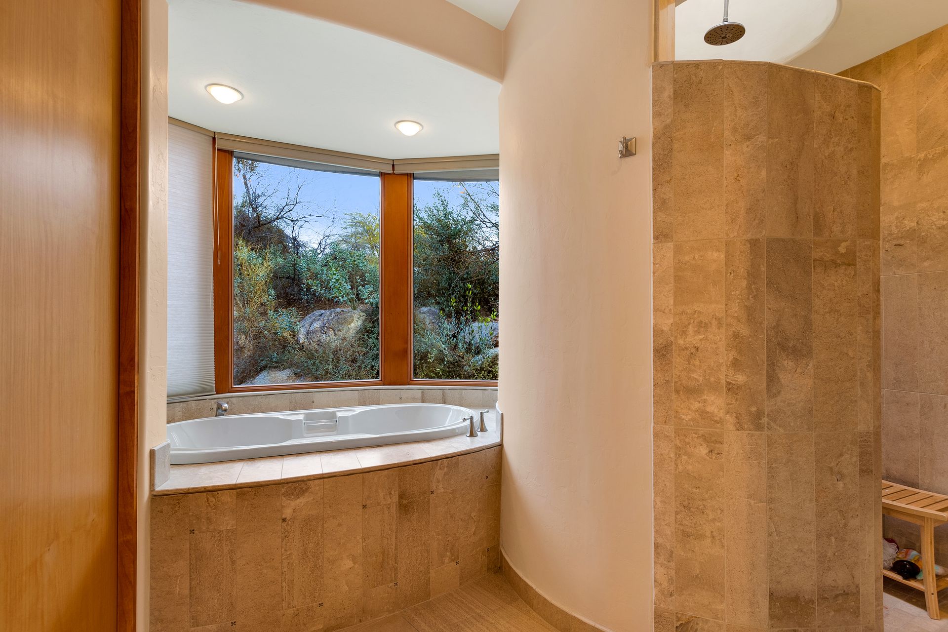 Pima Canyon contemporary home with exemplary display of renowned architect Kevin Howard and designed by Lori Carroll. Stunning private lot beautifully blends the forward-thinking design while integrating the magical backyard of the Sonoran Desert - PRIVACY! Be dazzled by the soaring floor to ceiling curved windows throughout with a touch of warm stone for a fireplace and ledges. The stone flooring is timeless and chosen for the ease of care and desert living. The creative open floor plan blends easy flow, soft and curved walls, and delineates rooms without separating them. The great room just got an entertainment facelift with an updated 85” TV and a fully integrated sound system. The gourmet kitchen includes a Dacor range, two Fisher and Paykel dishwashers, granite, a center island, a true abundance of counter space and a wet bar. The split bedroom, which ensures privacy, has one wing that showcases an oversized master bedroom with a cozy fireplace, a built-in office, a closet fit for a King and Queen and a serene spa-like bathroom. The second wing showcases three oversized guest suites, all with en-suites. A true resort-style home including upper deck for fantastic viewing of all sunrises and sunsets plus a negative overflow spa/pool combination—new tile and pebble sheen. This home is BREATHTAKING!