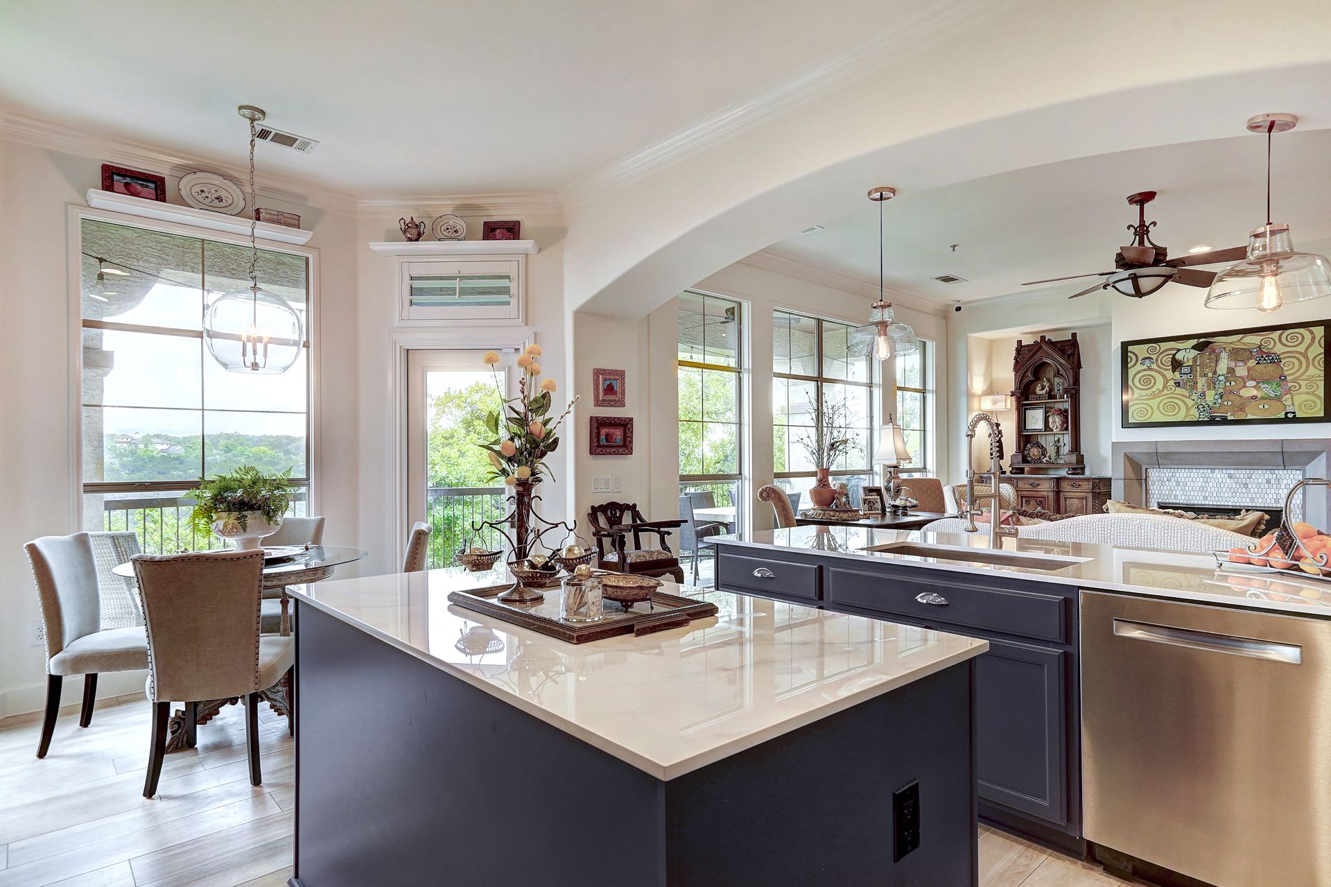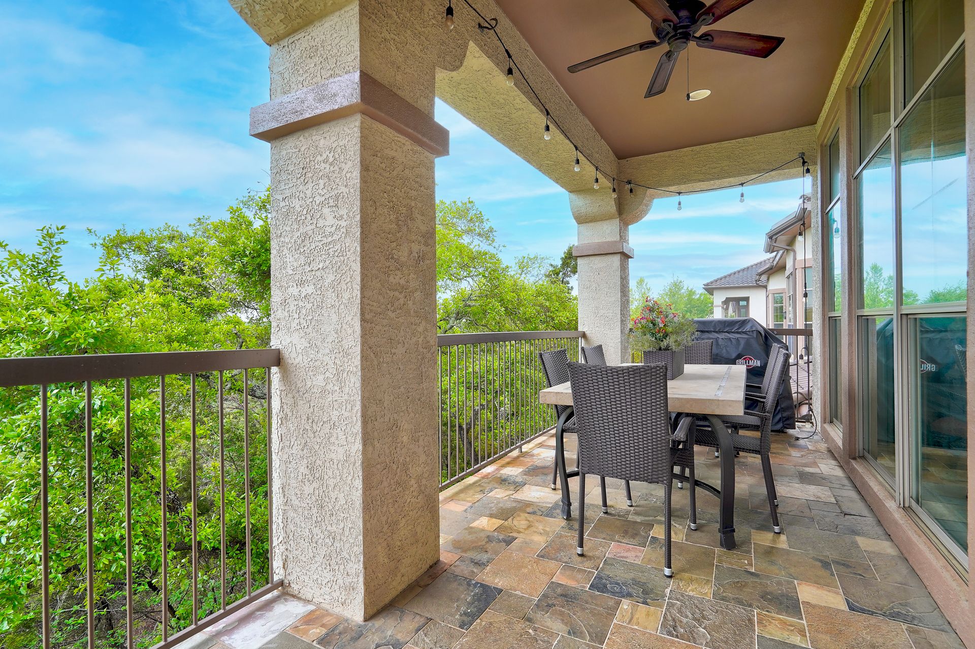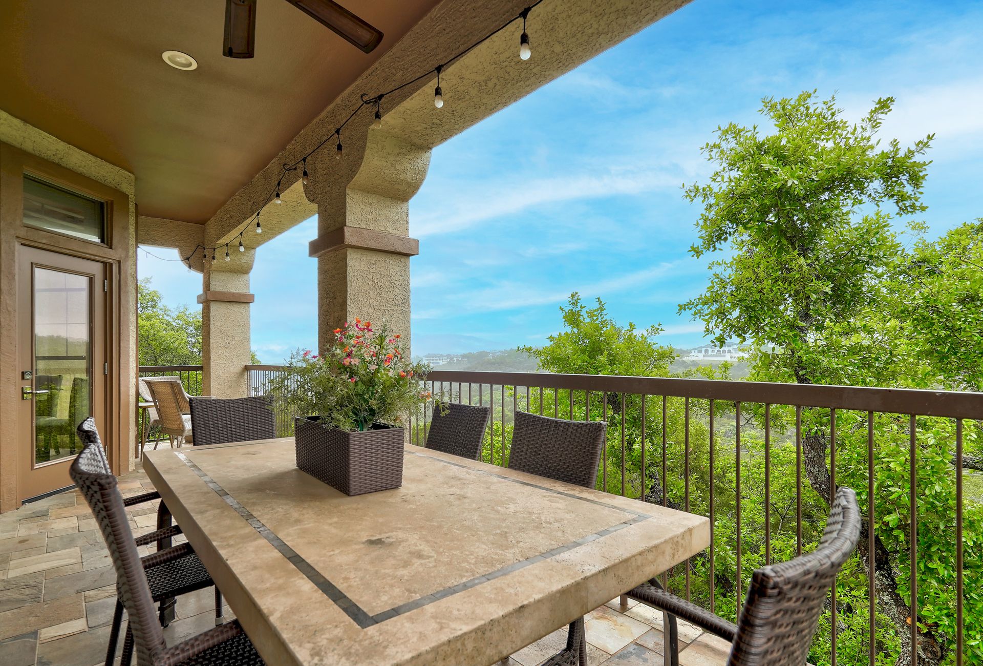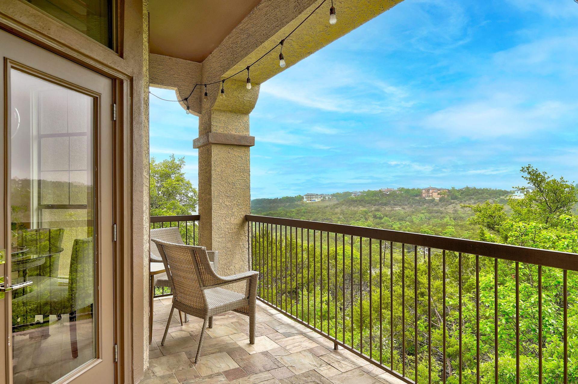 Discover the pinnacle of sophistication and comfort in this desirable condominium nestled near the sought-after community of Barton Creek. Boasting curated fixtures, hardware and flooring, along with a recently installed state-of-the-art Carrier A/C system, this residence offers the epitome of modern luxury and convenience. Enter through the security gate and pass the resort pool on your way to the perfect lock-and-leave that lives as a single-story. This thoughtful design ensures maximum privacy and tranquility. The open-concept living area, with a gorgeous gas log fireplace, creates an inviting ambiance for gatherings and everyday living. Natural light floods the space, accentuating the elegant finishes and unique details. The inviting kitchen is complete with beautiful fixtures, hardware, countertops and customized cabinetry. Whether you're hosting dinner parties or enjoying a quiet meal at home, this kitchen is sure to impress. With abundant windows throughout, this unit is bright and airy, inviting the outdoors in and creating a seamless connection with nature. Venture out onto the balcony and be captivated by panoramic Hill Country views. Whether you're savoring your morning coffee or enjoying an evening sunset, this outdoor space provides the perfect sanctuary. With two spacious guest rooms and an elevated bath, company will feel right at home. Retreat to the tranquil primary bedroom and bath which includes a soaking tub and renovated shower. Enjoy the custom storage solutions with an extraordinary walk-in closet by California Closets. Every detail exudes luxury and comfort. Park with ease in the two-car attached garage with epoxy flooring and experience the ultimate in upscale condominium living in Southwest Austin. This vibrant community offers carefree resort amenities with a pool, gym, overlook terrace, hiking trails and is a short distance to restaurants and movies, with grocery stores and Galleria 10 minutes away and golf courses nearby.