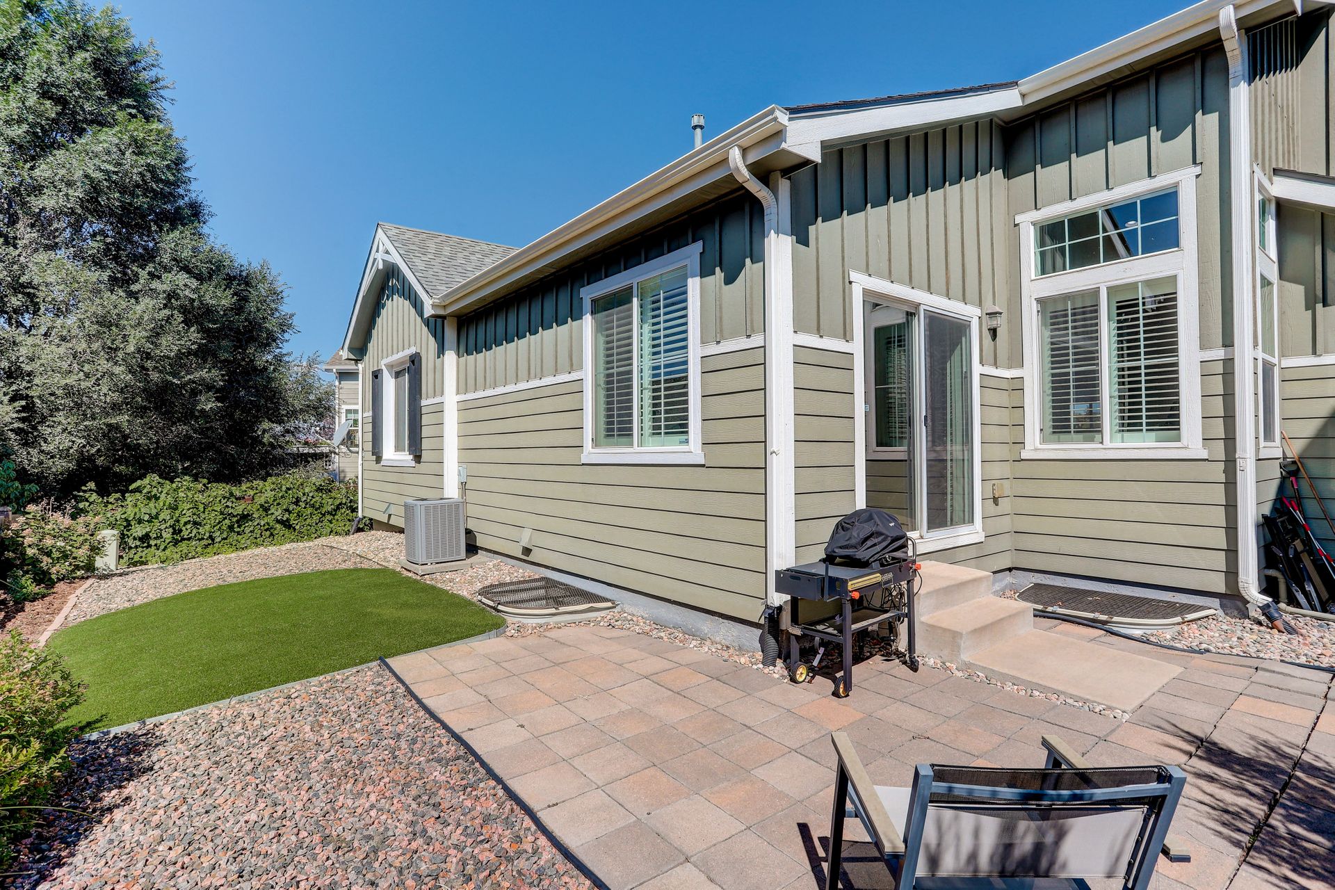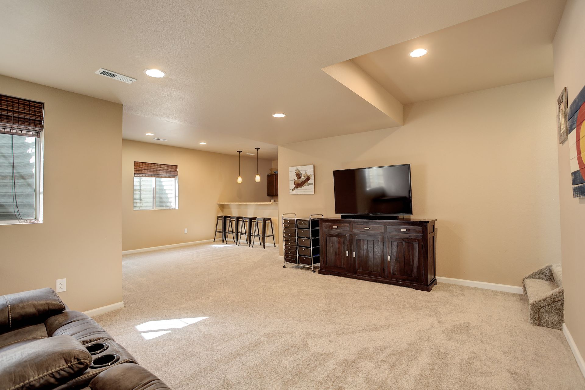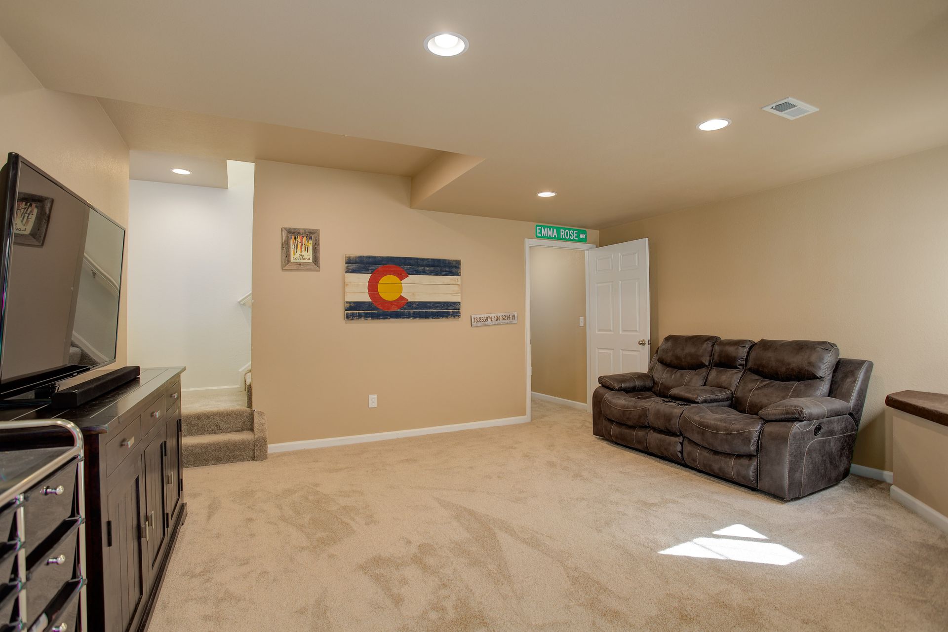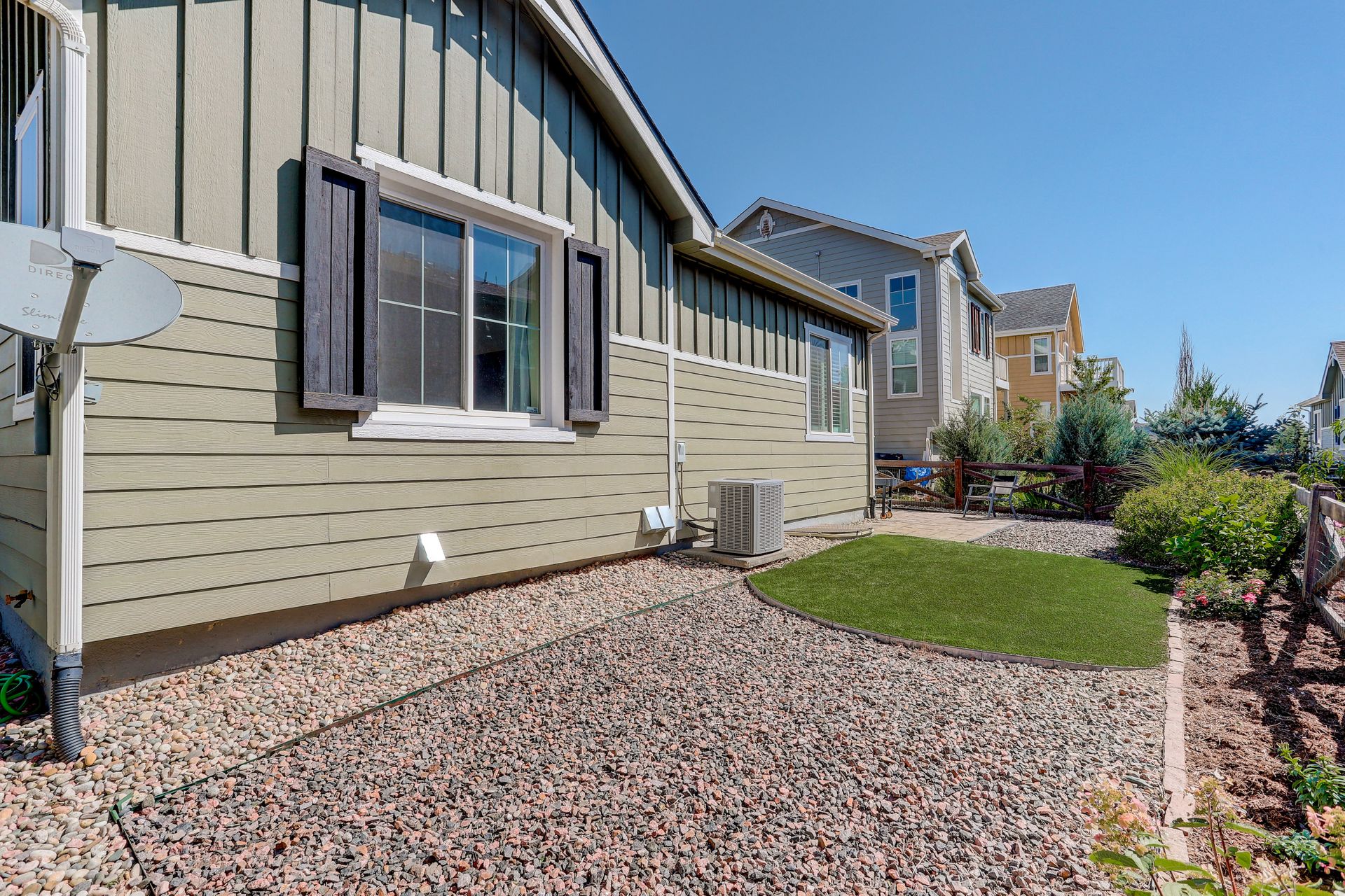 This move-in ready home has 4 bedrooms, 3 baths, vaulted ceilings and plantation shutters throughout the great room area and features...high-quality LVP in most of the main level...13x18 living room with TV niche, clerestory windows and ceiling fan prewire...dining area with decorator light fixture and door to back patio...updated kitchen with painted 42" cabinets, Cambria quartz counters, island with counter bar, convenient 1-bowl sink and touchless faucet, and SS appliances including smooth top range...sunny 12x14 primary bedroom with crown molding, 9' tray ceiling, ensuite with extended vanity, double sinks, soaking tub and walk-in closet...2nd bedroom/office with 9' ceilings and windows overlooking the covered front porch and mature trees...convenient full hall bath...and main level laundry with included W/D. The fully finished, permitted basement has 9' ceilings, quality new carpet throughout and features...two large adjoining family room spaces, one for your couch and TV, and the other for a game table/workout space/etc. and dry bar with ample cabinets, mini-fridge and counter bar...3rd and 4th bedrooms (located peacefully away from the action) with good-sized closets...and full hall bath with large vanity, granite-look formica and 12"x12" ceramic tile shower walls and floor. Outside, you'll enjoy the...sunny backyard with paver patio, artificial turf and mature trees and shrubs...xeriscaped front yard with mature trees and just a small patch of grass...neighborhood walking/biking trail access across the street...less than 1/2 mile to the award winning K-12 Banning Lewis Academy and BLR rec center with pool, splash pad, playground, tennis/pickleball courts and fitness room. Easy access to the Powers corridor shopping, dining and entertainment, and Peterson and Shriever SFBs, too!