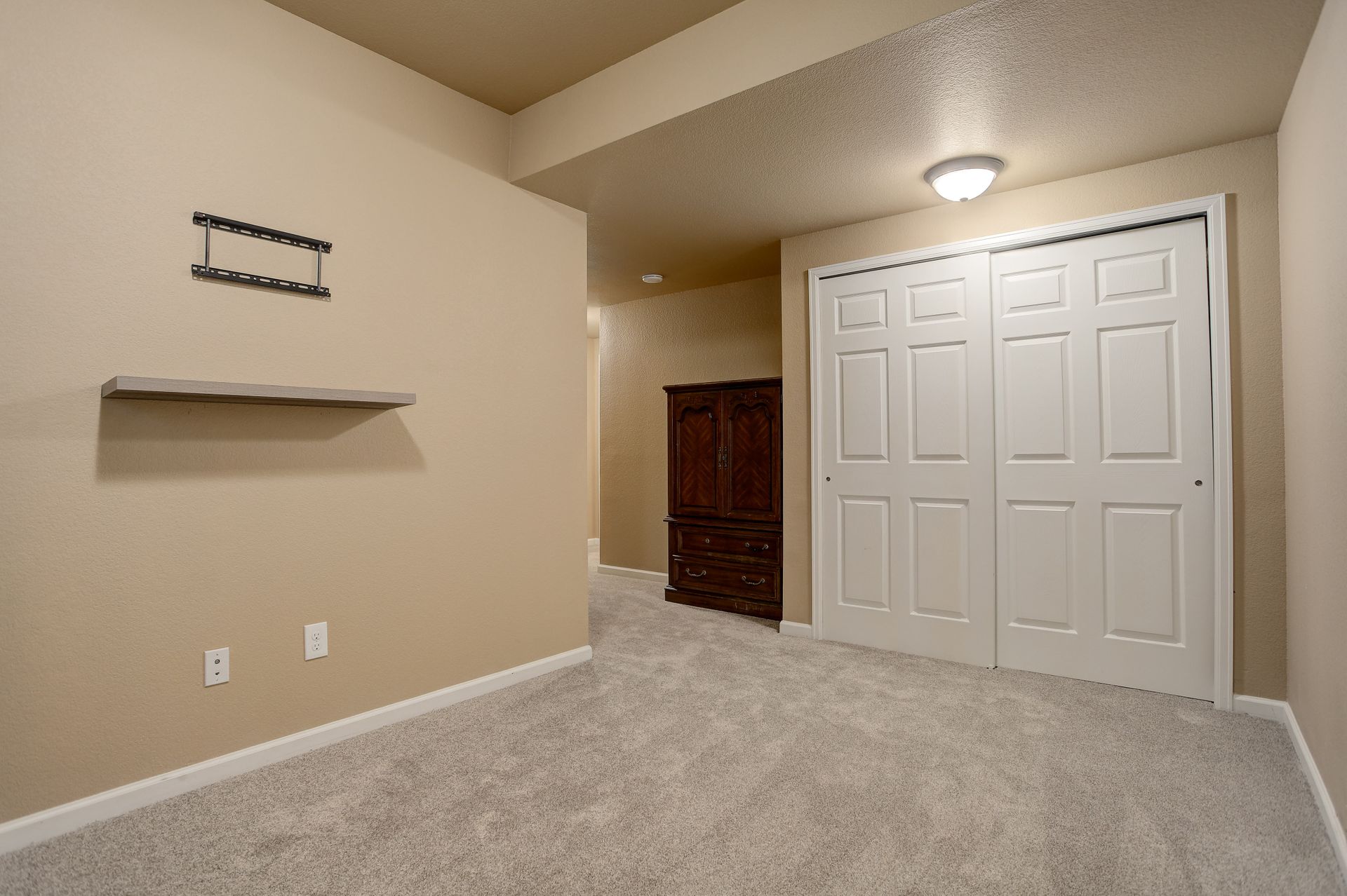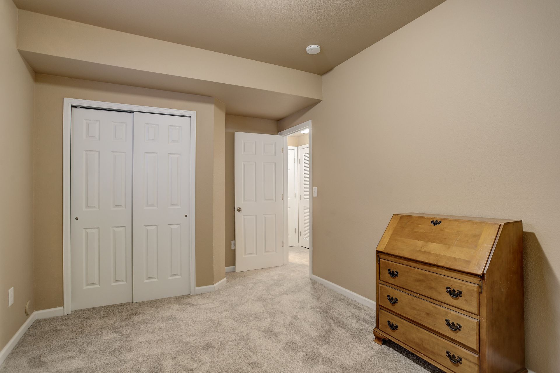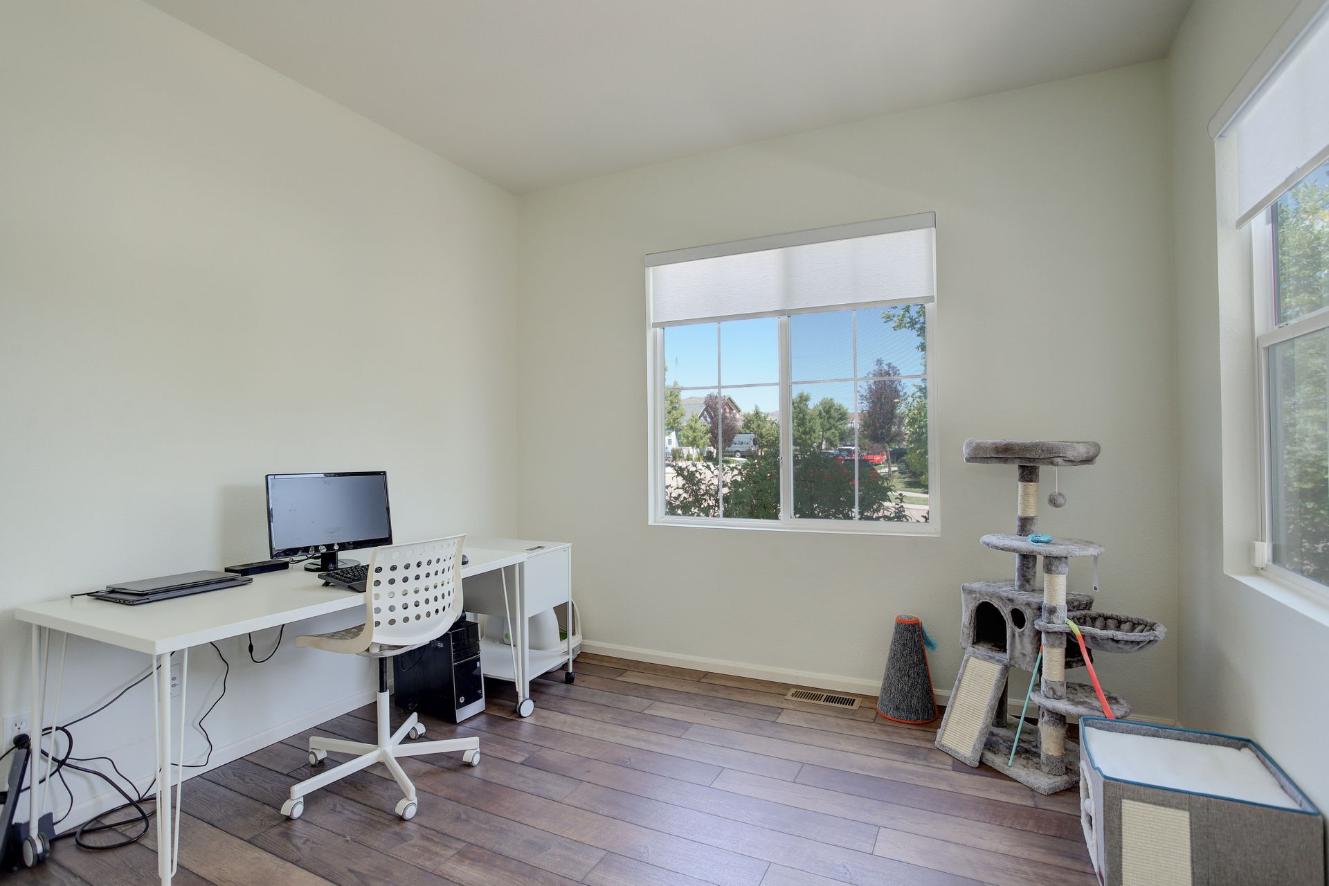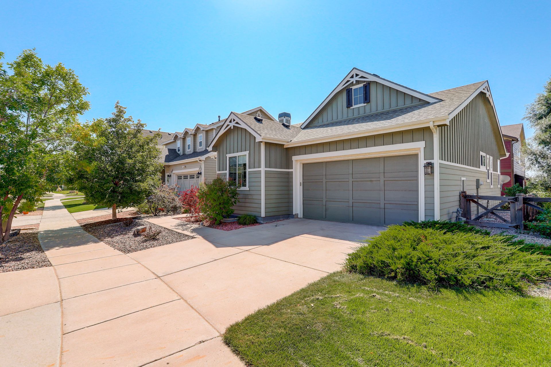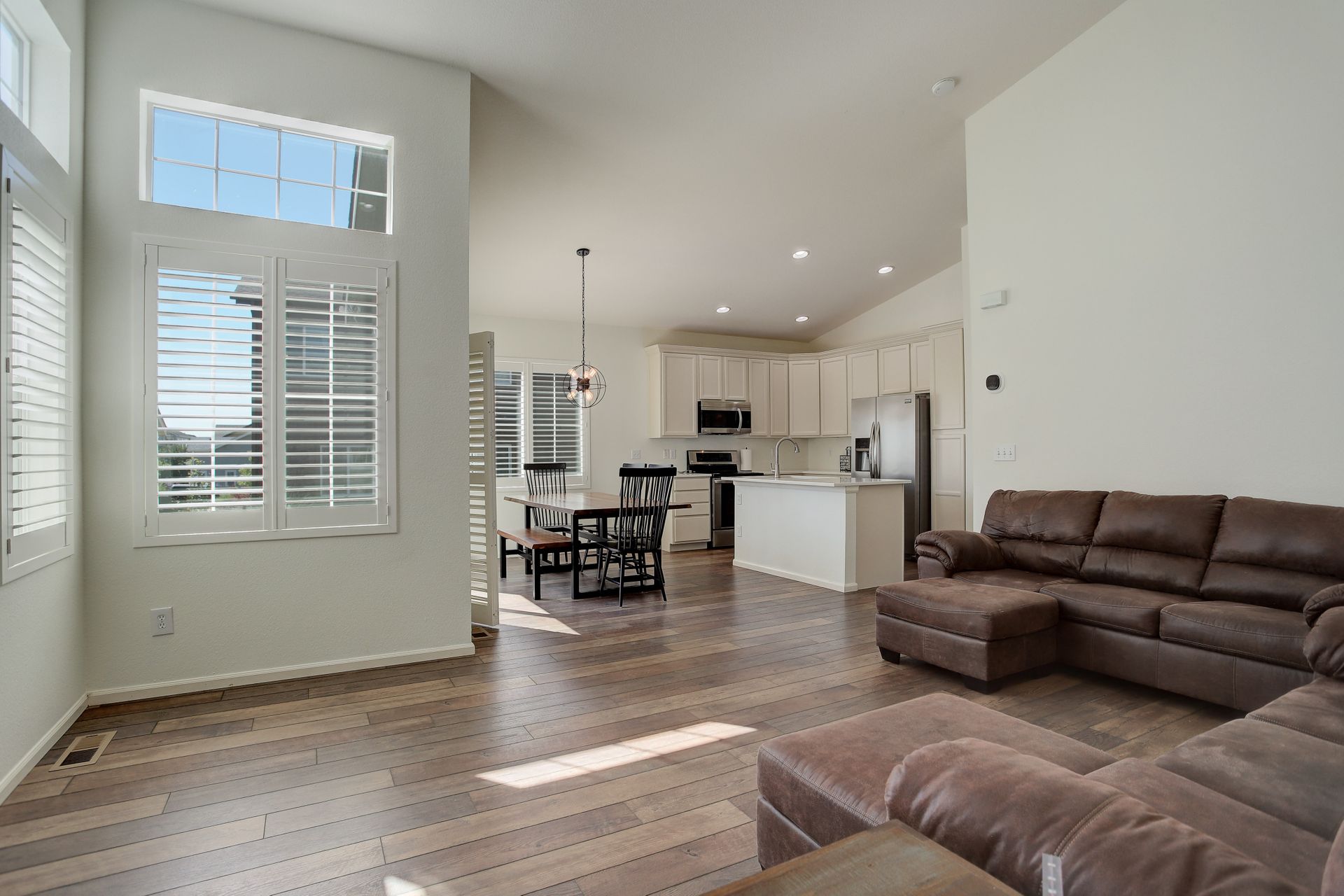 This move-in ready home has 4 bedrooms, 3 baths, vaulted ceilings and plantation shutters throughout the great room area and features...high-quality LVP in most of the main level...13x18 living room with TV niche, clerestory windows and ceiling fan prewire...dining area with decorator light fixture and door to back patio...updated kitchen with painted 42" cabinets, Cambria quartz counters, island with counter bar, convenient 1-bowl sink and touchless faucet, and SS appliances including smooth top range...sunny 12x14 primary bedroom with crown molding, 9' tray ceiling, ensuite with extended vanity, double sinks, soaking tub and walk-in closet...2nd bedroom/office with 9' ceilings and windows overlooking the covered front porch and mature trees...convenient full hall bath...and main level laundry with included W/D. The fully finished, permitted basement has 9' ceilings, quality new carpet throughout and features...two large adjoining family room spaces, one for your couch and TV, and the other for a game table/workout space/etc. and dry bar with ample cabinets, mini-fridge and counter bar...3rd and 4th bedrooms (located peacefully away from the action) with good-sized closets...and full hall bath with large vanity, granite-look formica and 12"x12" ceramic tile shower walls and floor. Outside, you'll enjoy the...sunny backyard with paver patio, artificial turf and mature trees and shrubs...xeriscaped front yard with mature trees and just a small patch of grass...neighborhood walking/biking trail access across the street...less than 1/2 mile to the award winning K-12 Banning Lewis Academy and BLR rec center with pool, splash pad, playground, tennis/pickleball courts and fitness room. Easy access to the Powers corridor shopping, dining and entertainment, and Peterson and Shriever SFBs, too!