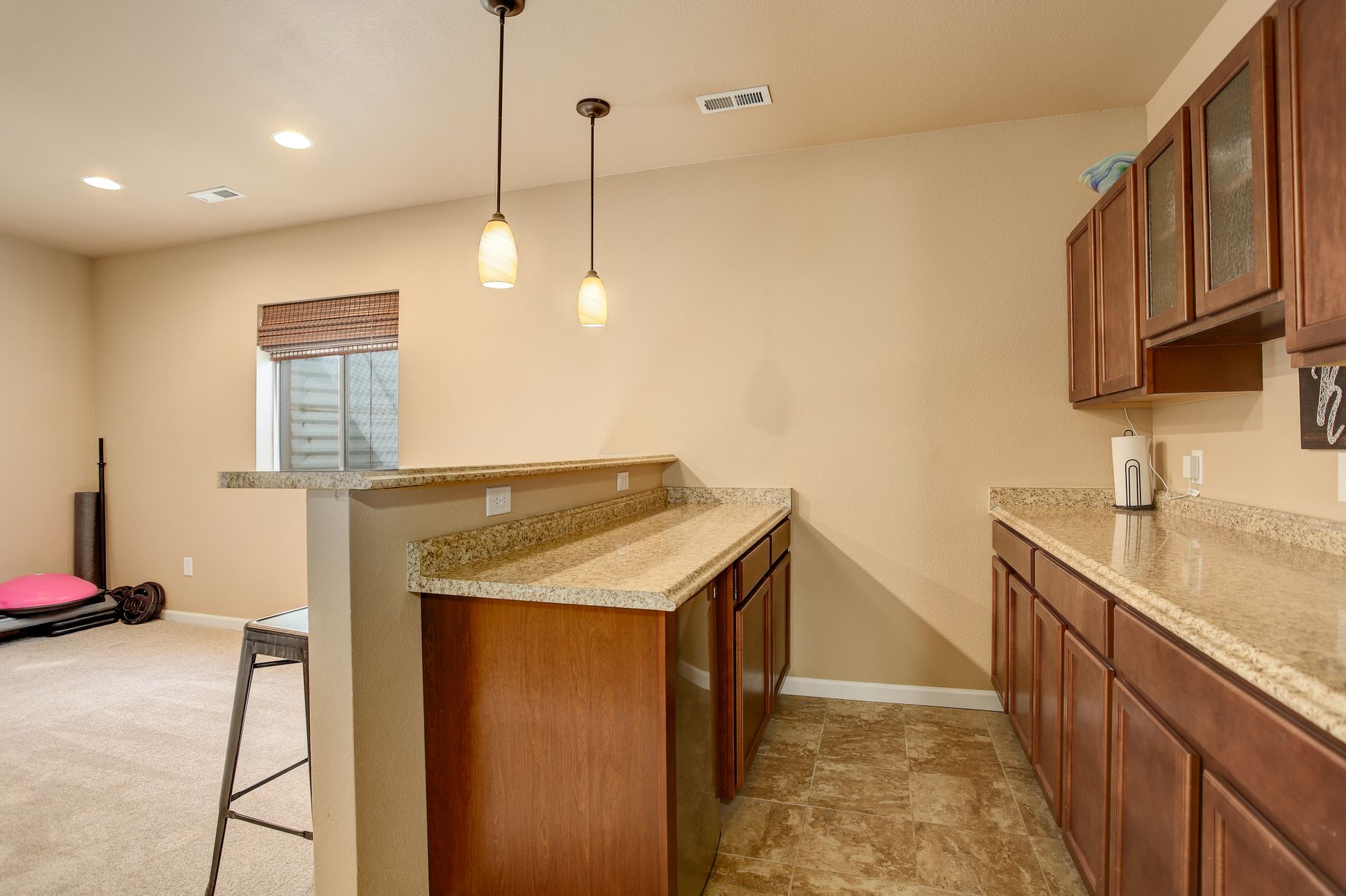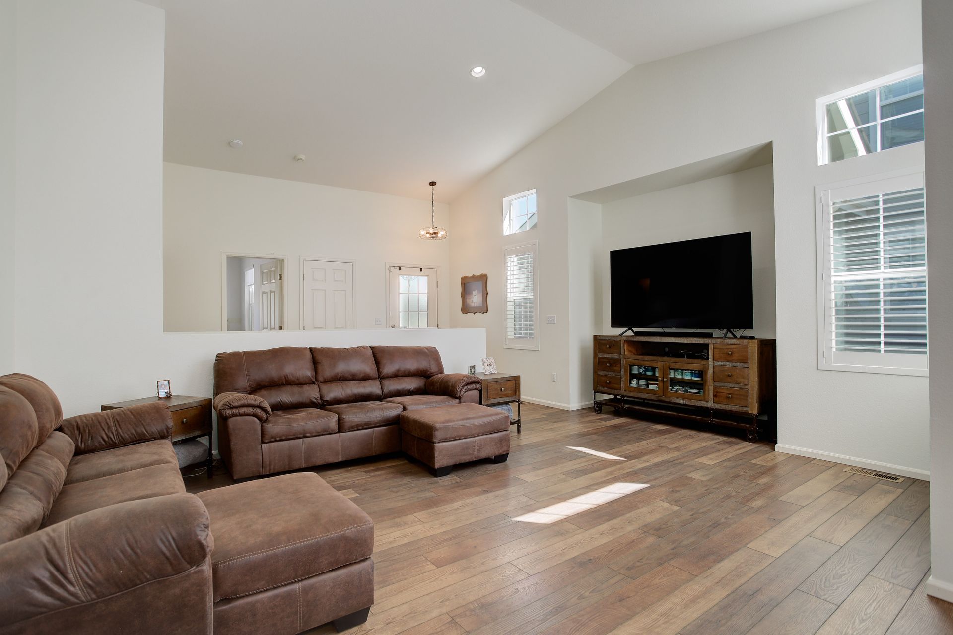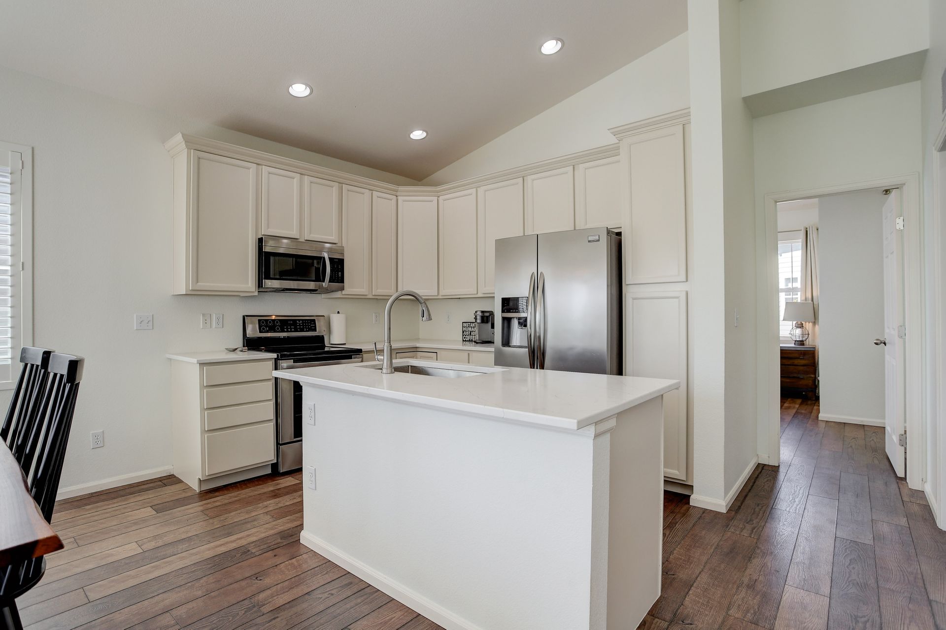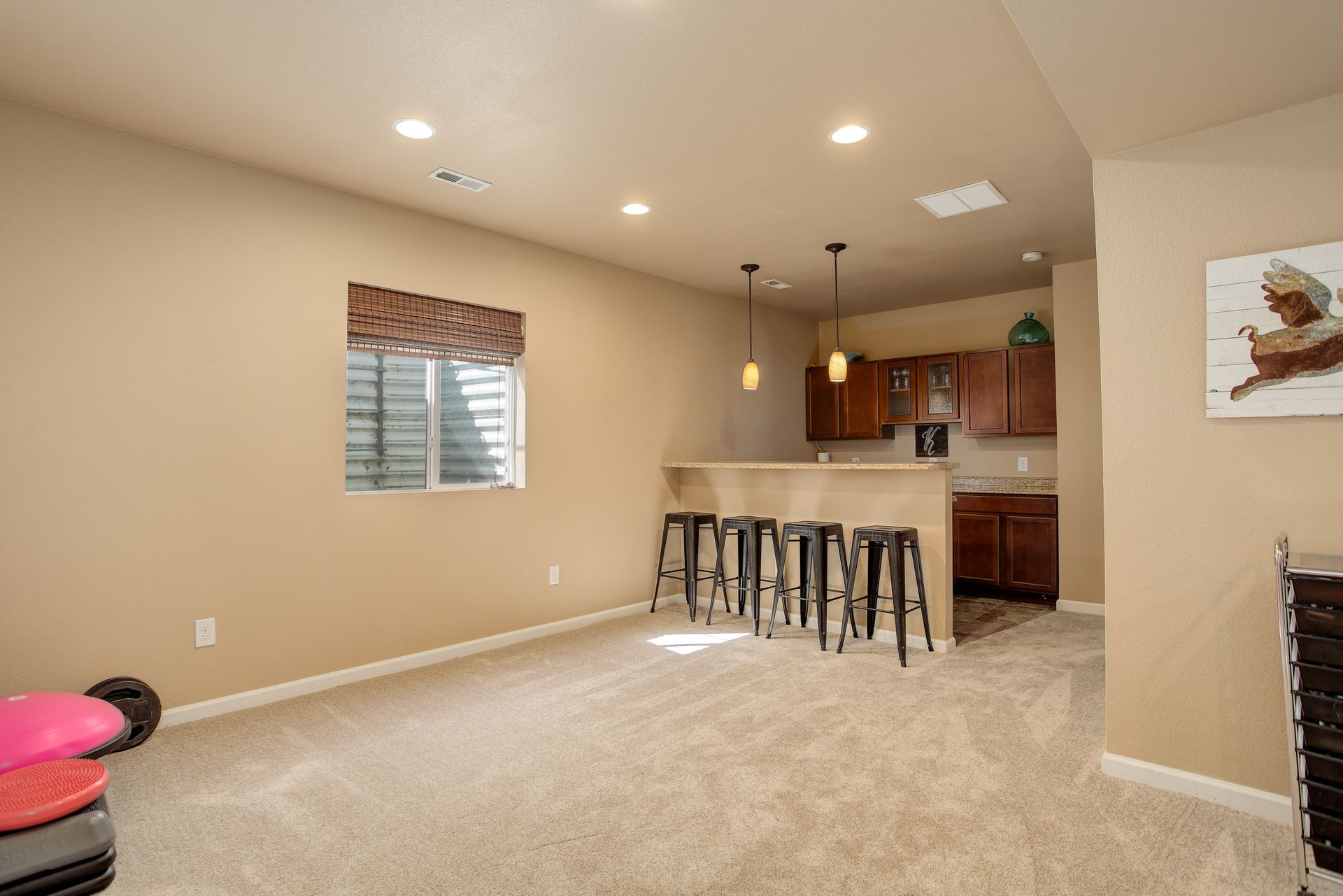 This move-in ready home has 4 bedrooms, 3 baths, vaulted ceilings and plantation shutters throughout the great room area and features...high-quality LVP in most of the main level...13x18 living room with TV niche, clerestory windows and ceiling fan prewire...dining area with decorator light fixture and door to back patio...updated kitchen with painted 42" cabinets, Cambria quartz counters, island with counter bar, convenient 1-bowl sink and touchless faucet, and SS appliances including smooth top range...sunny 12x14 primary bedroom with crown molding, 9' tray ceiling, ensuite with extended vanity, double sinks, soaking tub and walk-in closet...2nd bedroom/office with 9' ceilings and windows overlooking the covered front porch and mature trees...convenient full hall bath...and main level laundry with included W/D. The fully finished, permitted basement has 9' ceilings, quality new carpet throughout and features...two large adjoining family room spaces, one for your couch and TV, and the other for a game table/workout space/etc. and dry bar with ample cabinets, mini-fridge and counter bar...3rd and 4th bedrooms (located peacefully away from the action) with good-sized closets...and full hall bath with large vanity, granite-look formica and 12"x12" ceramic tile shower walls and floor. Outside, you'll enjoy the...sunny backyard with paver patio, artificial turf and mature trees and shrubs...xeriscaped front yard with mature trees and just a small patch of grass...neighborhood walking/biking trail access across the street...less than 1/2 mile to the award winning K-12 Banning Lewis Academy and BLR rec center with pool, splash pad, playground, tennis/pickleball courts and fitness room. Easy access to the Powers corridor shopping, dining and entertainment, and Peterson and Shriever SFBs, too!