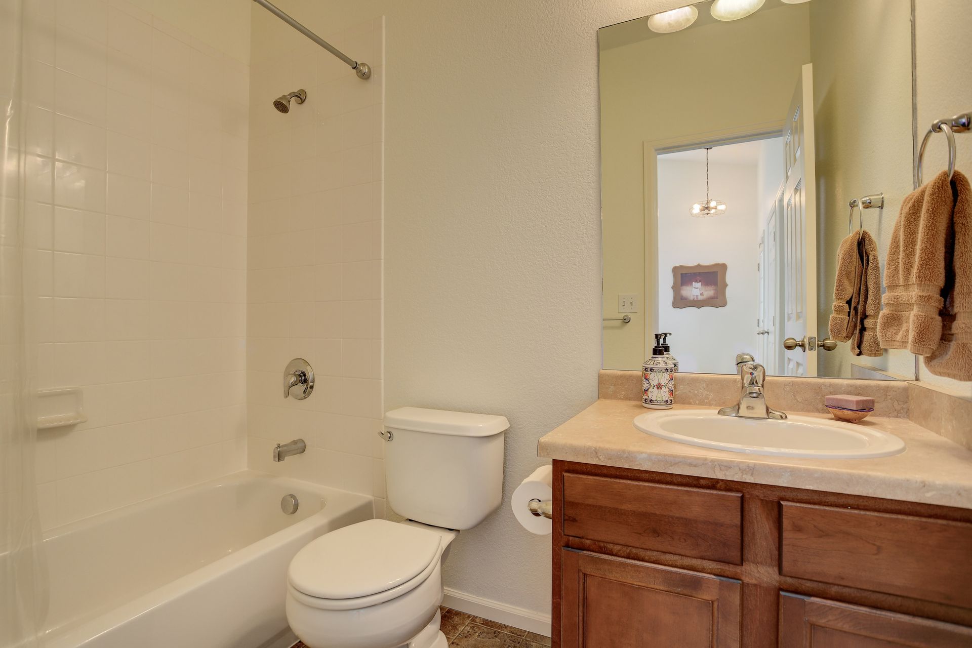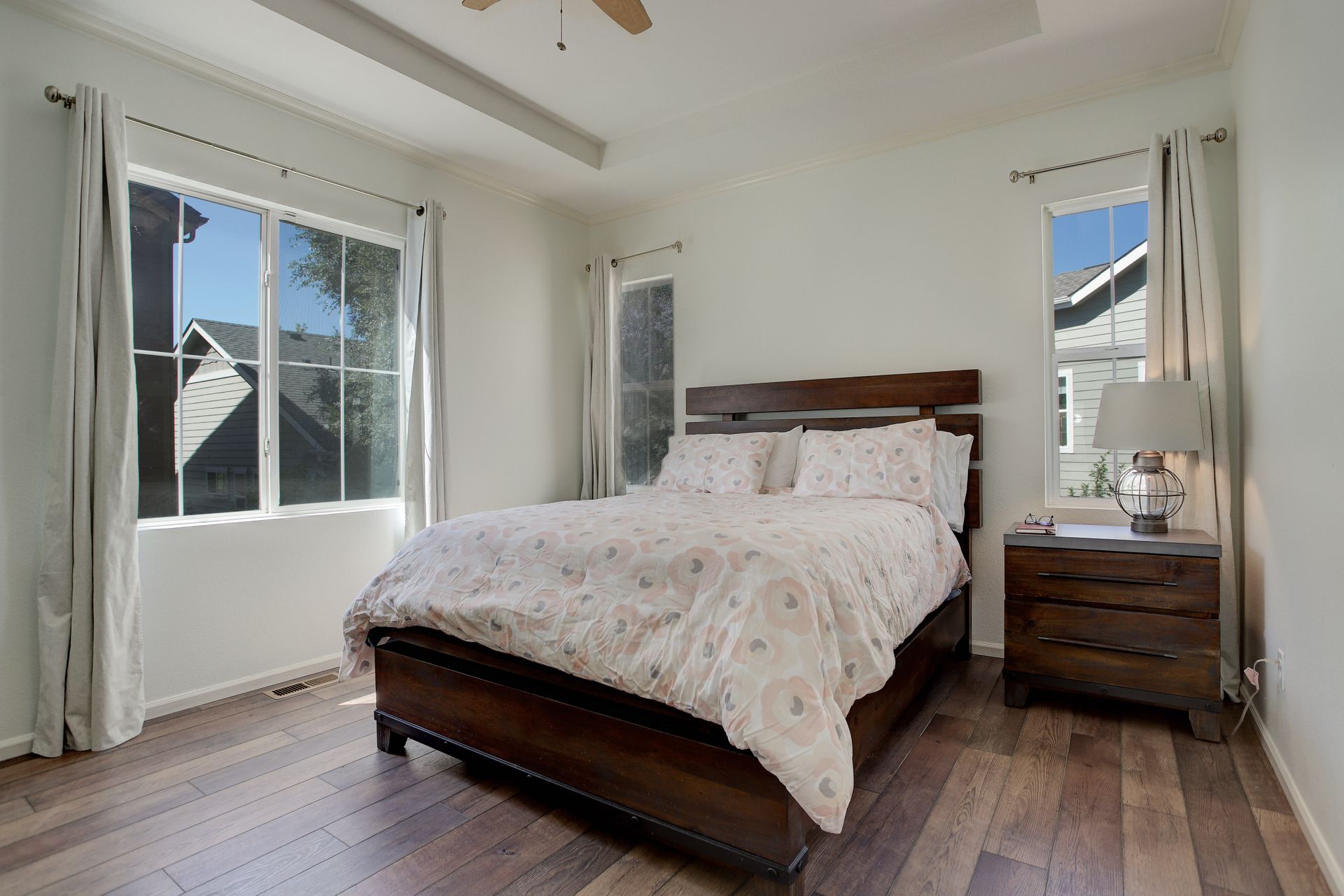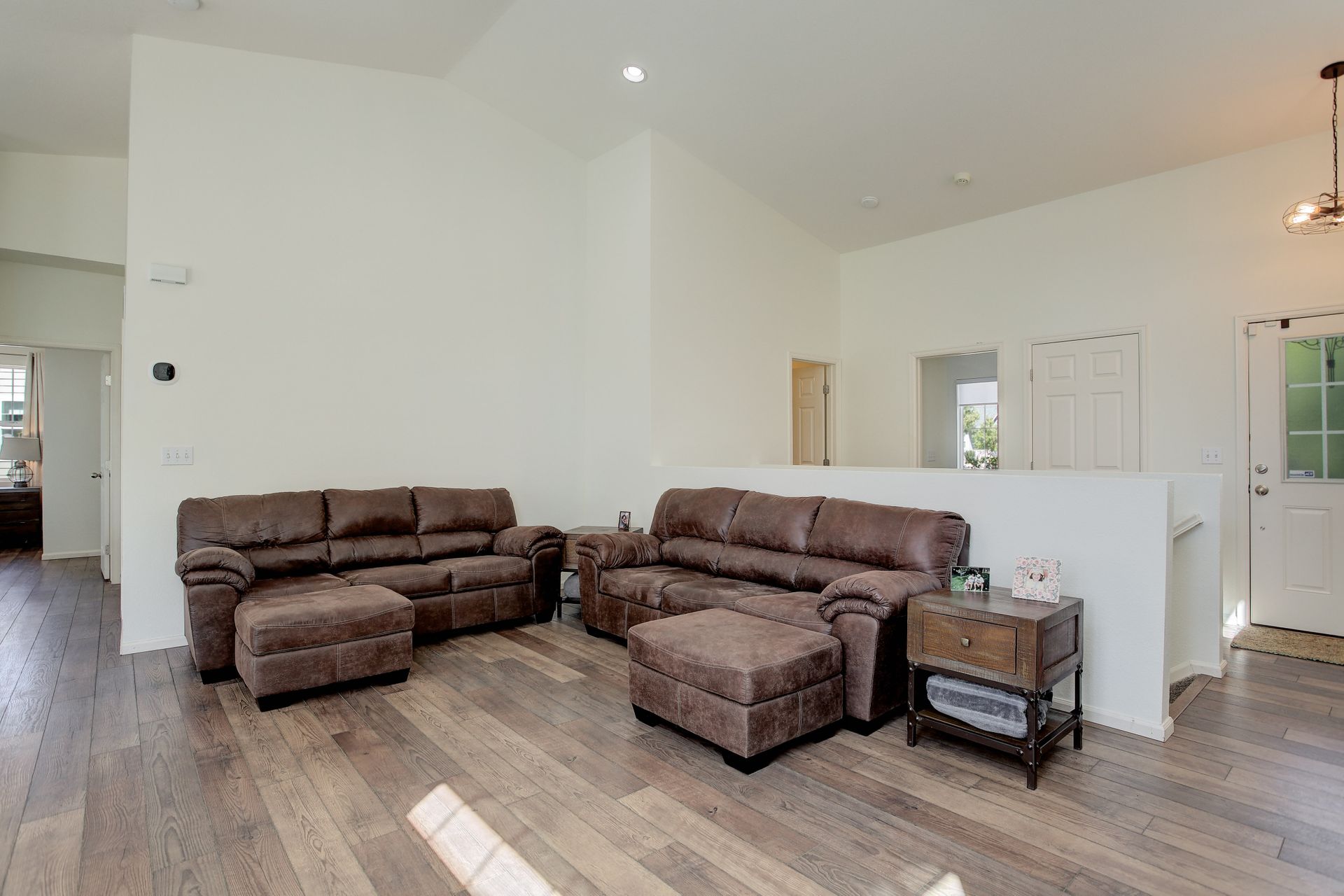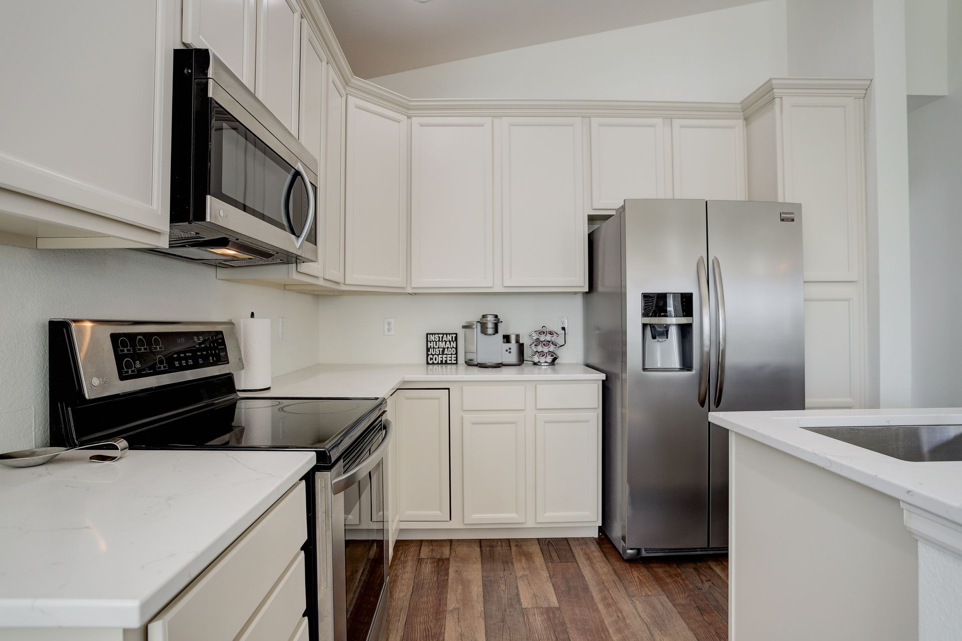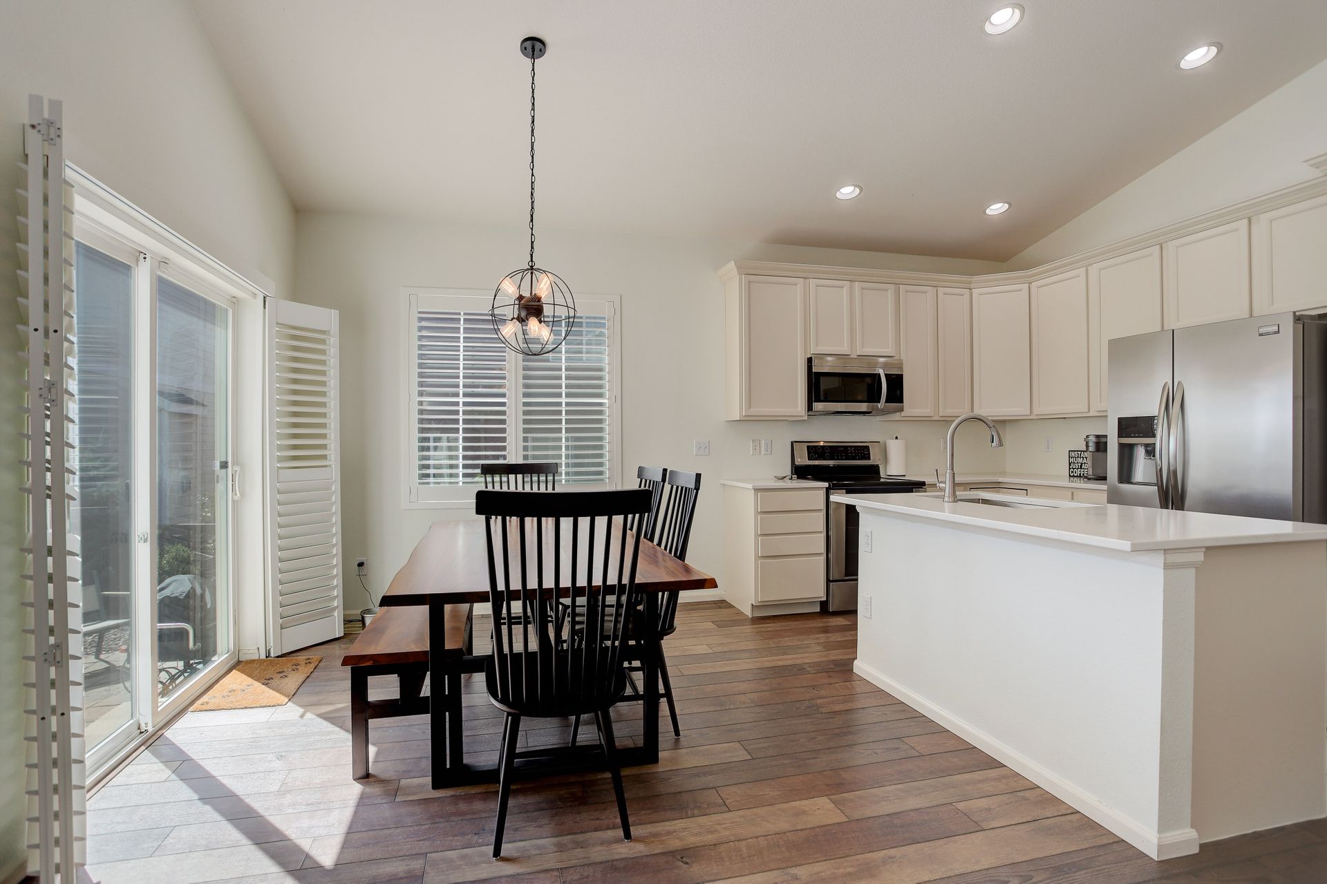 This move-in ready home has 4 bedrooms, 3 baths, vaulted ceilings and plantation shutters throughout the great room area and features...high-quality LVP in most of the main level...13x18 living room with TV niche, clerestory windows and ceiling fan prewire...dining area with decorator light fixture and door to back patio...updated kitchen with painted 42" cabinets, Cambria quartz counters, island with counter bar, convenient 1-bowl sink and touchless faucet, and SS appliances including smooth top range...sunny 12x14 primary bedroom with crown molding, 9' tray ceiling, ensuite with extended vanity, double sinks, soaking tub and walk-in closet...2nd bedroom/office with 9' ceilings and windows overlooking the covered front porch and mature trees...convenient full hall bath...and main level laundry with included W/D. The fully finished, permitted basement has 9' ceilings, quality new carpet throughout and features...two large adjoining family room spaces, one for your couch and TV, and the other for a game table/workout space/etc. and dry bar with ample cabinets, mini-fridge and counter bar...3rd and 4th bedrooms (located peacefully away from the action) with good-sized closets...and full hall bath with large vanity, granite-look formica and 12"x12" ceramic tile shower walls and floor. Outside, you'll enjoy the...sunny backyard with paver patio, artificial turf and mature trees and shrubs...xeriscaped front yard with mature trees and just a small patch of grass...neighborhood walking/biking trail access across the street...less than 1/2 mile to the award winning K-12 Banning Lewis Academy and BLR rec center with pool, splash pad, playground, tennis/pickleball courts and fitness room. Easy access to the Powers corridor shopping, dining and entertainment, and Peterson and Shriever SFBs, too!