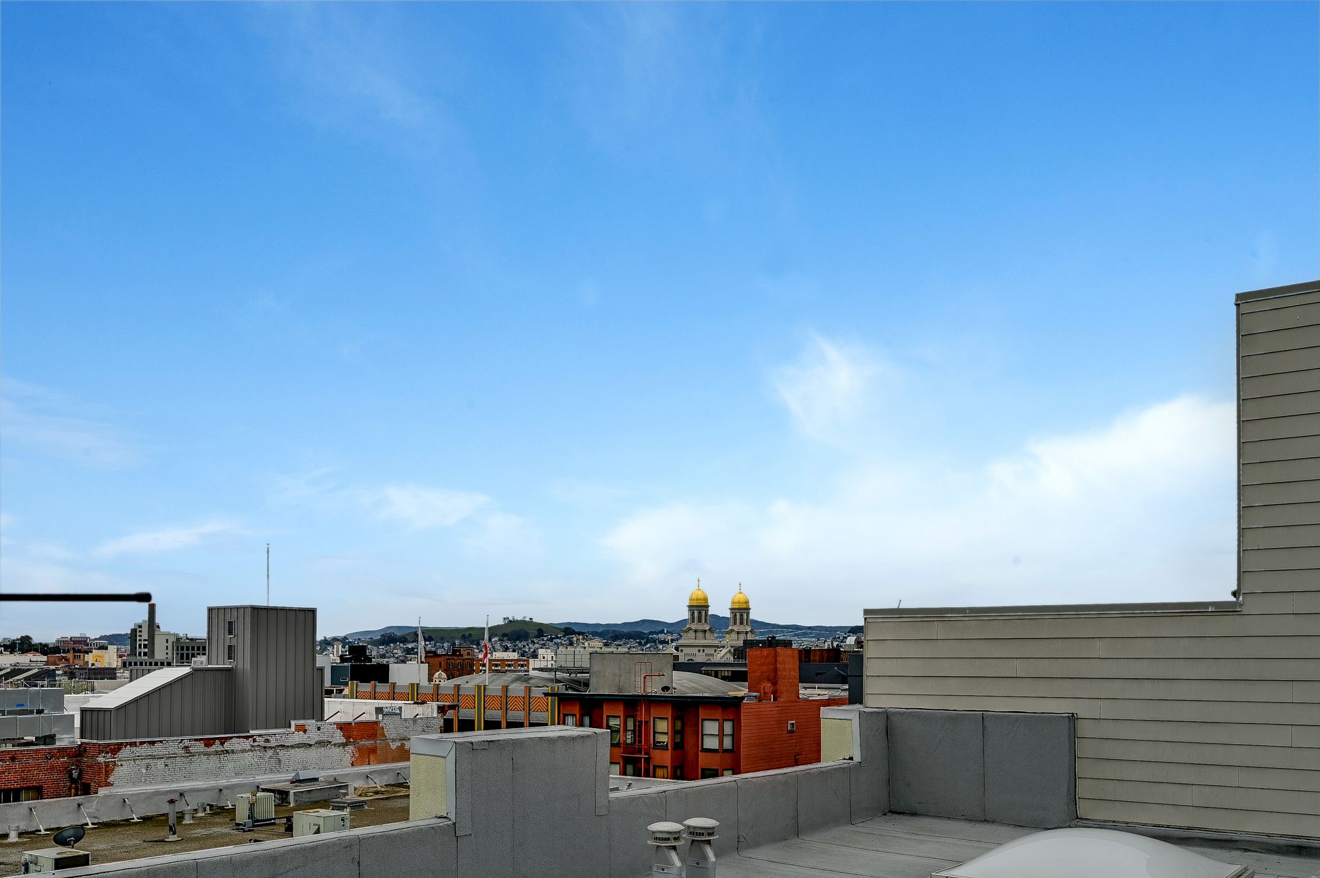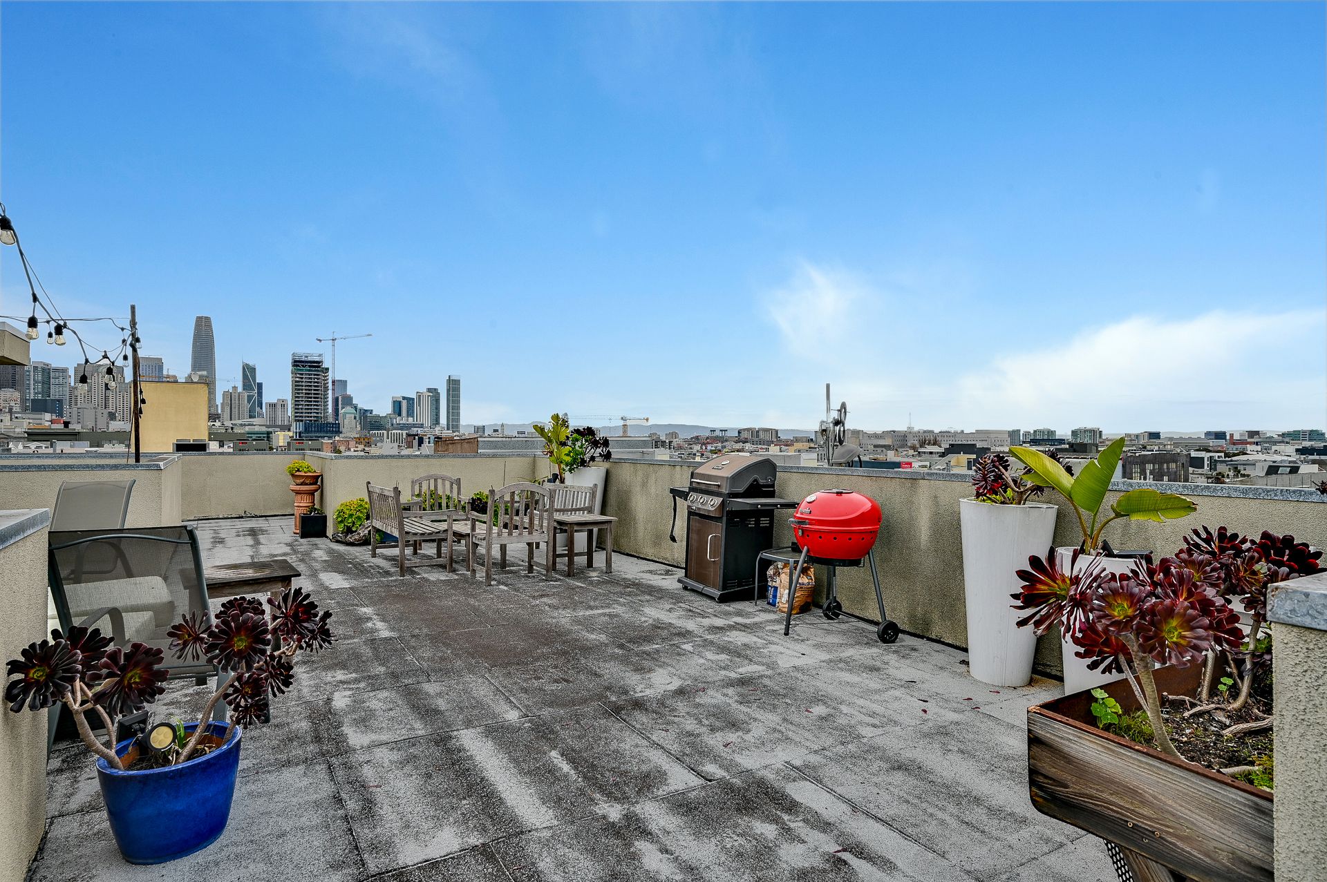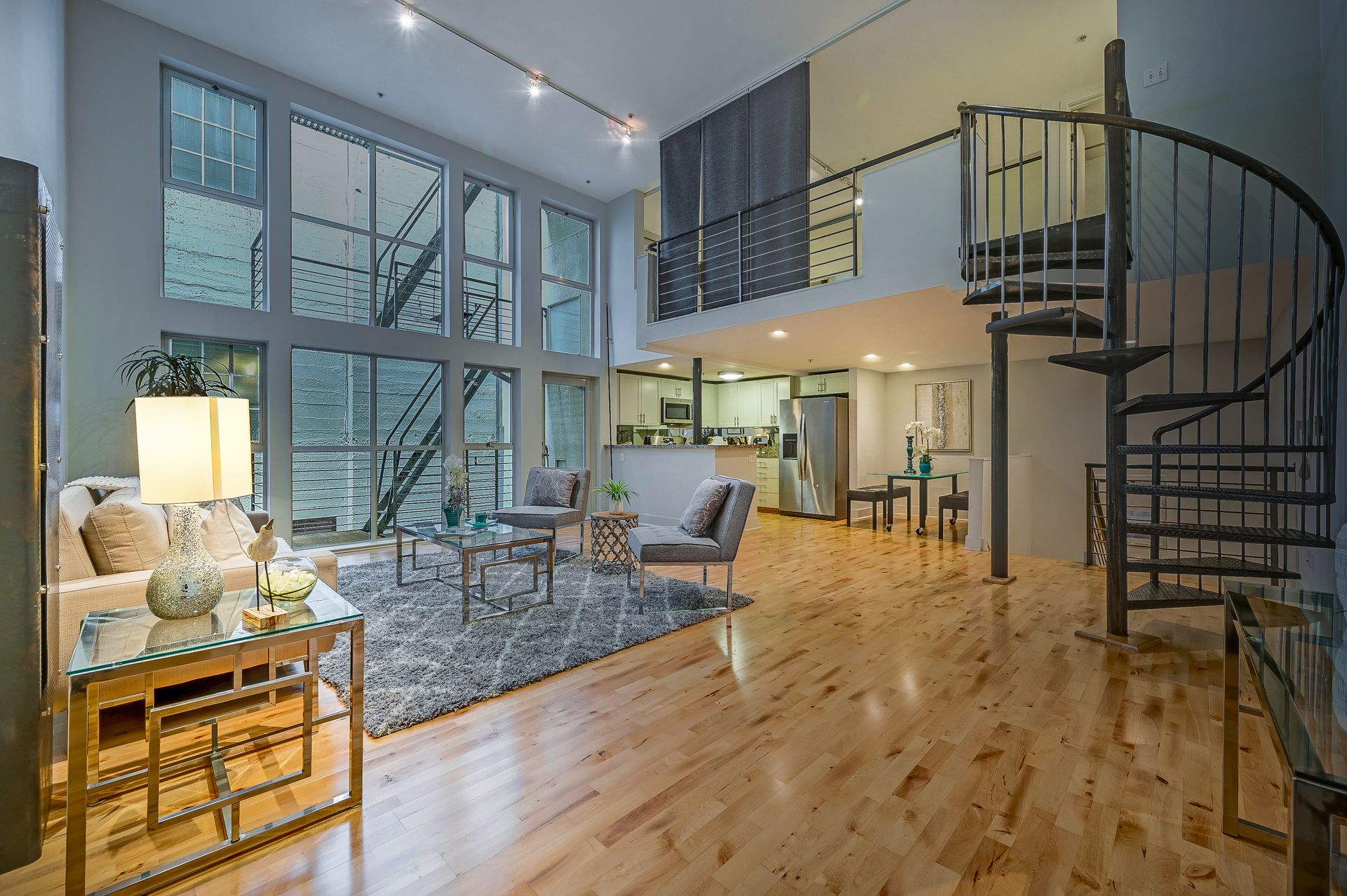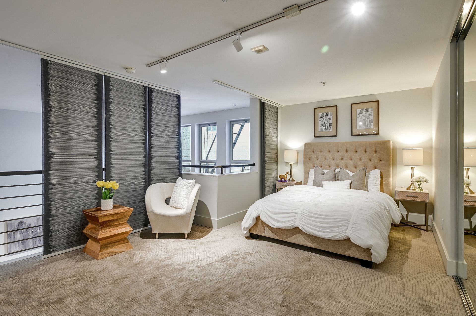 Sunny, dramatic, and centrally located, this tri-level loft features soaring ceilings, two bedrooms, two and one-half baths and two deeded tandem parking spaces with storage. The first level consists of a spacious master suite with ample closet space; it has direct access to a large patio and a half bath for guests. The main level showcases an open floor plan with a soaring ceiling and expansive windows allowing for an abundance of natural light. The open layout is ideal for entertaining with a combination living and dining room and a sizable U-shaped kitchen with granite countertops and stainless-steel appliances. The spacious loft bedroom with an ensuite bathroom overlooks the main living space. Hardwood floors, an in-unit washer and dryer and a shared roof deck with a barbeque area truly makes this loft desirable. This boutique live/work building is on a peaceful block in close proximity to the Civic Center, Bart/Muni, Main Library, Yerba Buena, Hayes Valley, Uber HQ and Twitter HQ. This address has a walk Score of 98 and a Bike Score of 99 according to walkscore.com.