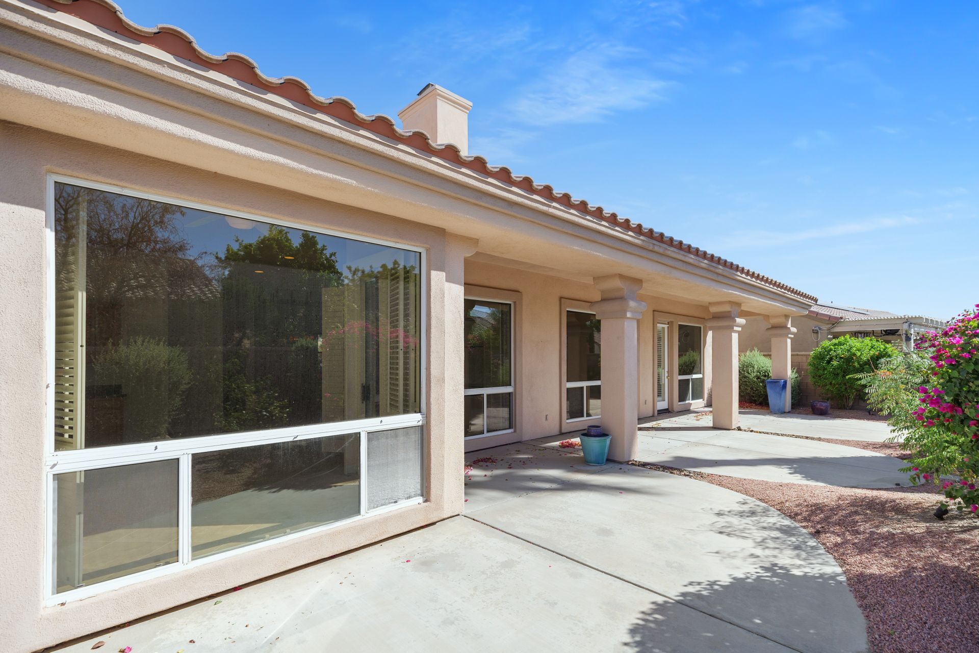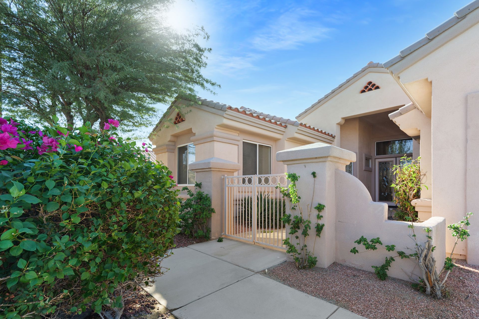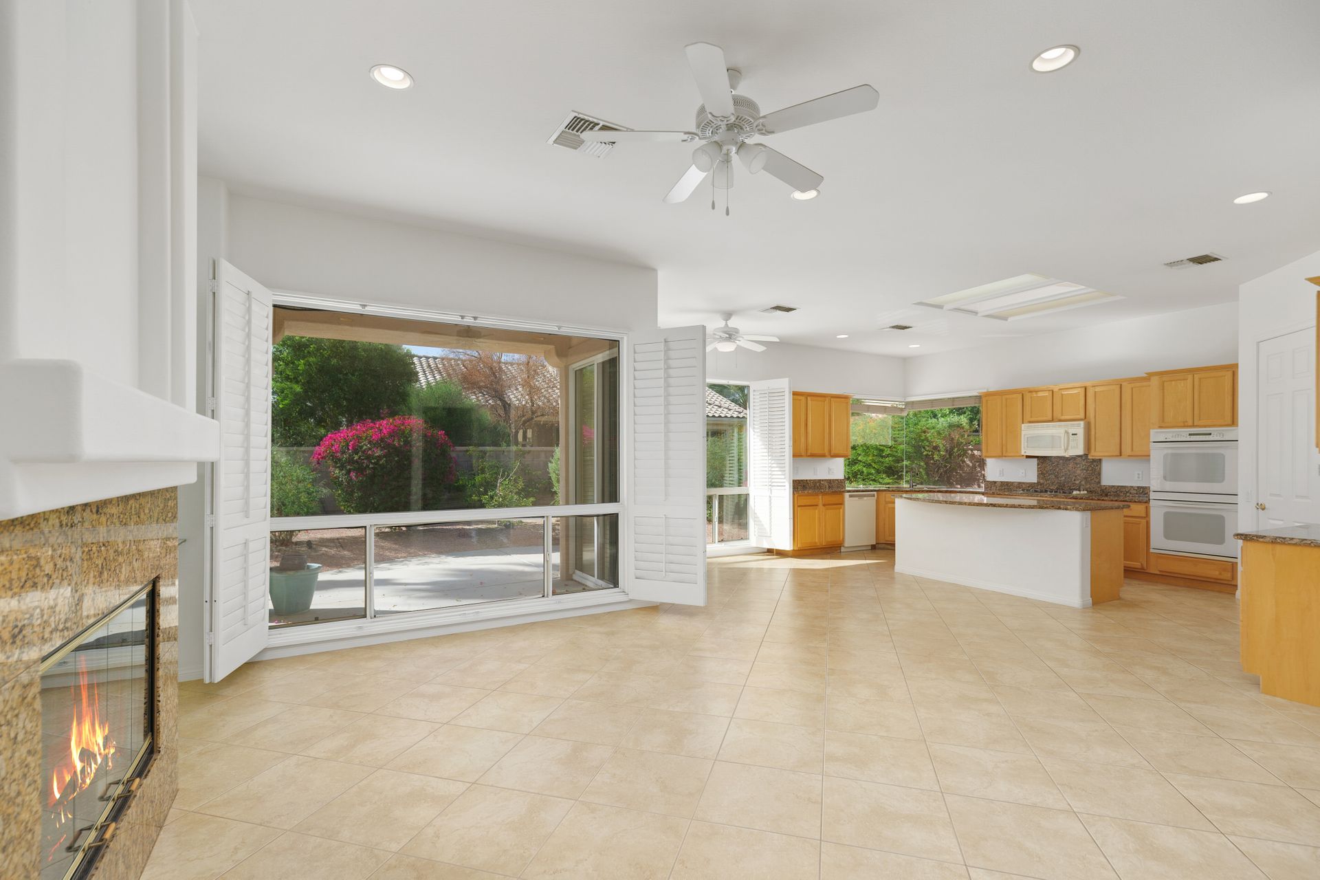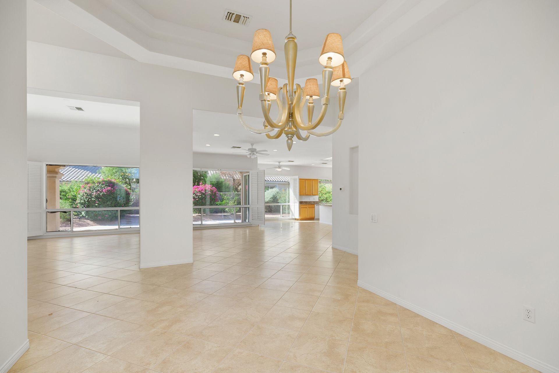 Welcome to Sun City Palm Desert's Portofino. Enter through the gated courtyard and step into a grand foyer and living room with soaring 12-foot ceilings. Enjoy the charm of shutters on most windows and a cozy double-sided fireplace. The kitchen features granite counter tops, a breakfast bar, double wall ovens, and a large skylight that fills the space with light. The formal dining area is beautifully appointed with coffered ceilings. This home includes two guest suites, each with mirrored wardrobe doors and private baths featuring shower/tub combinations. The primary suite boasts a door leading to the back patio, dual walk-in closets with built-in storage, and a private retreat area. The luxurious master bath offers dual sinks, a sitting vanity, a spacious stall shower, and an oversized tub with a glass block wall. Additional features include a 2-car plus golf cart garage and an expansive south-facing backyard with an extended patio and multiple seating areas, ideal for relaxation and entertaining. Sun City offers a wealth of amenities for active lifestyles, including two 18-hole golf courses, three clubhouses for community activities, and diverse dining options with three onsite restaurants. Enjoy outdoor activities such as bocce ball, heated pools, lighted tennis courts, scenic walking paths, and gated dog parks. Conveniently located near the 10 freeway and the new Acrisure Arena, this community truly has it all.