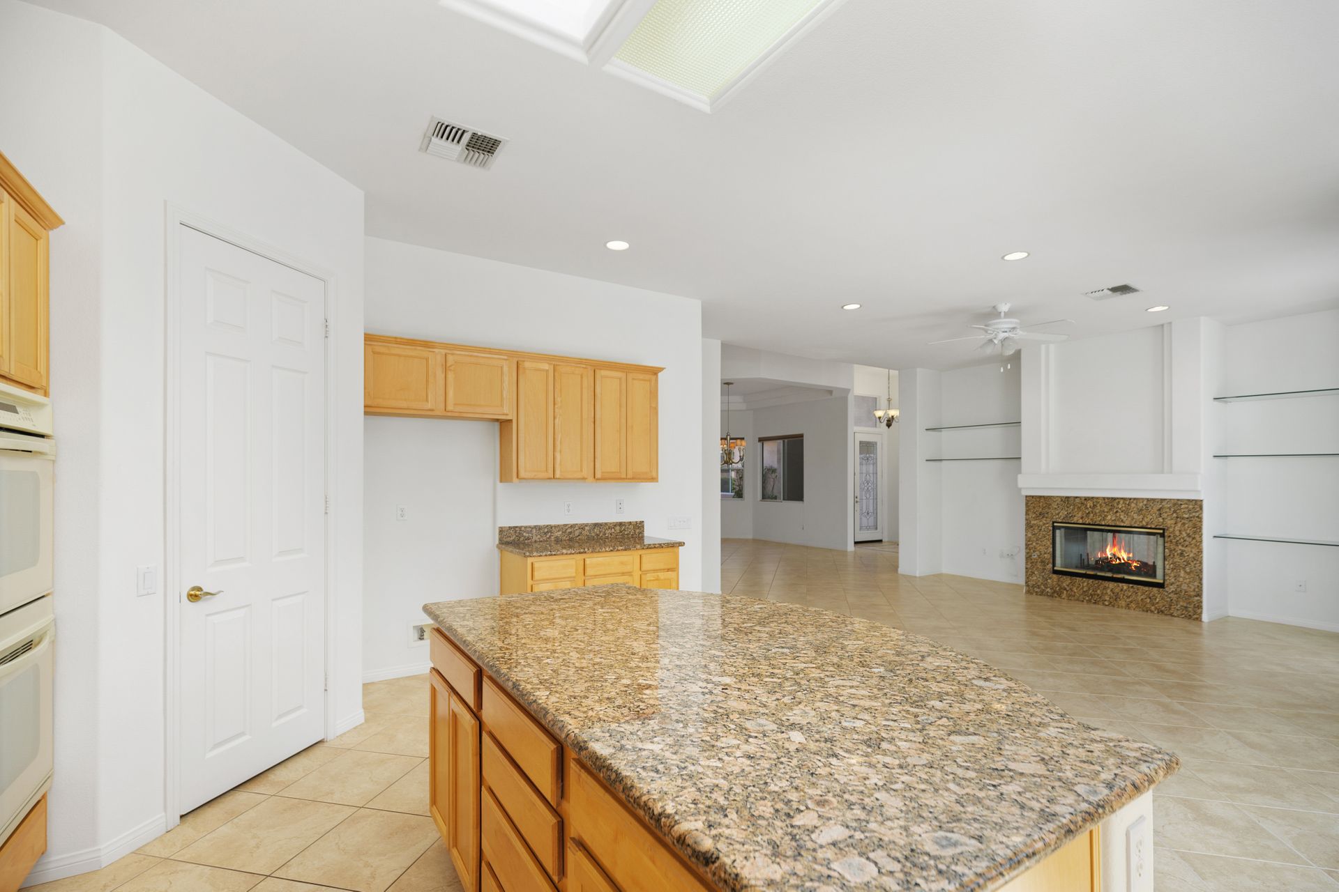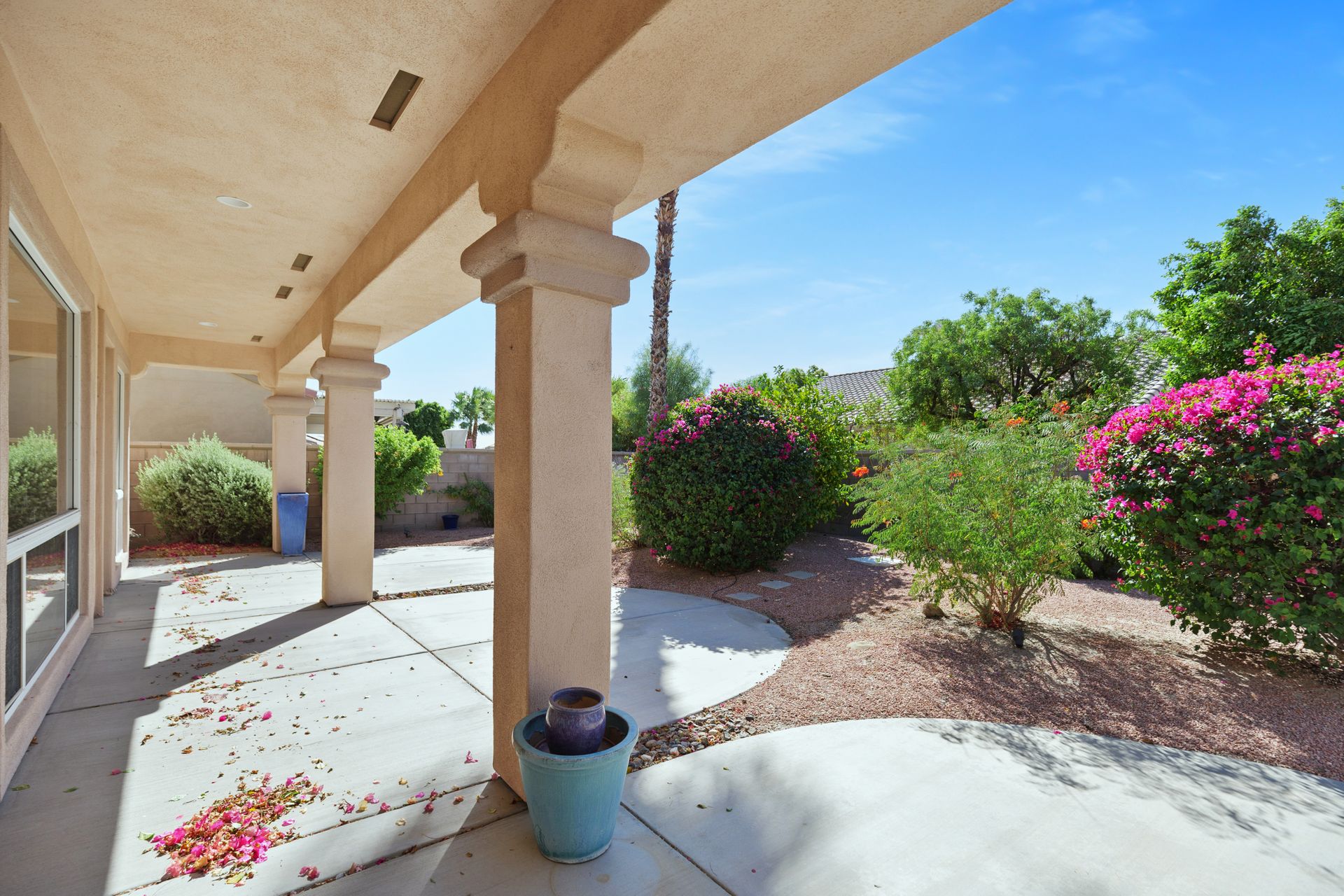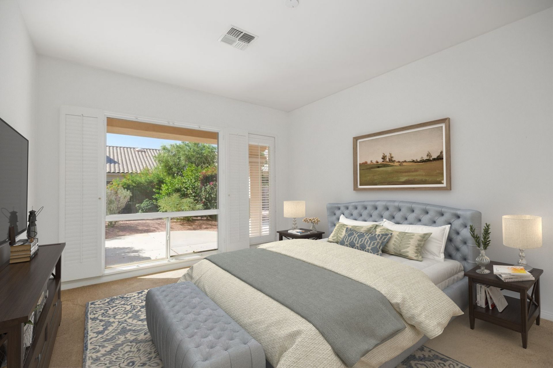 Welcome to Sun City Palm Desert's Portofino. Enter through the gated courtyard and step into a grand foyer and living room with soaring 12-foot ceilings. Enjoy the charm of shutters on most windows and a cozy double-sided fireplace. The kitchen features granite counter tops, a breakfast bar, double wall ovens, and a large skylight that fills the space with light. The formal dining area is beautifully appointed with coffered ceilings. This home includes two guest suites, each with mirrored wardrobe doors and private baths featuring shower/tub combinations. The primary suite boasts a door leading to the back patio, dual walk-in closets with built-in storage, and a private retreat area. The luxurious master bath offers dual sinks, a sitting vanity, a spacious stall shower, and an oversized tub with a glass block wall. Additional features include a 2-car plus golf cart garage and an expansive south-facing backyard with an extended patio and multiple seating areas, ideal for relaxation and entertaining. Sun City offers a wealth of amenities for active lifestyles, including two 18-hole golf courses, three clubhouses for community activities, and diverse dining options with three onsite restaurants. Enjoy outdoor activities such as bocce ball, heated pools, lighted tennis courts, scenic walking paths, and gated dog parks. Conveniently located near the 10 freeway and the new Acrisure Arena, this community truly has it all.