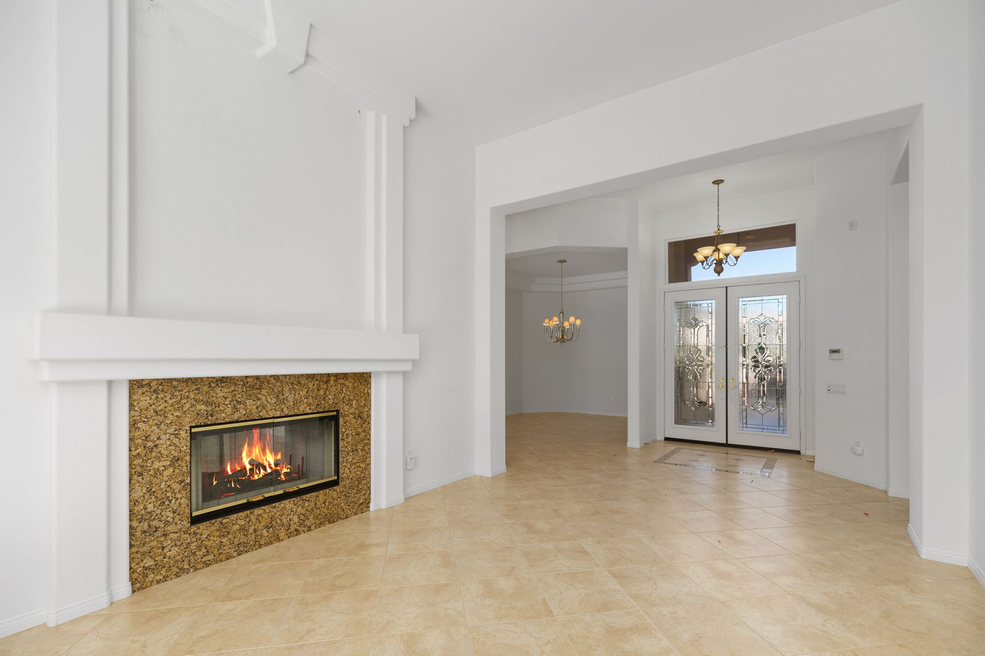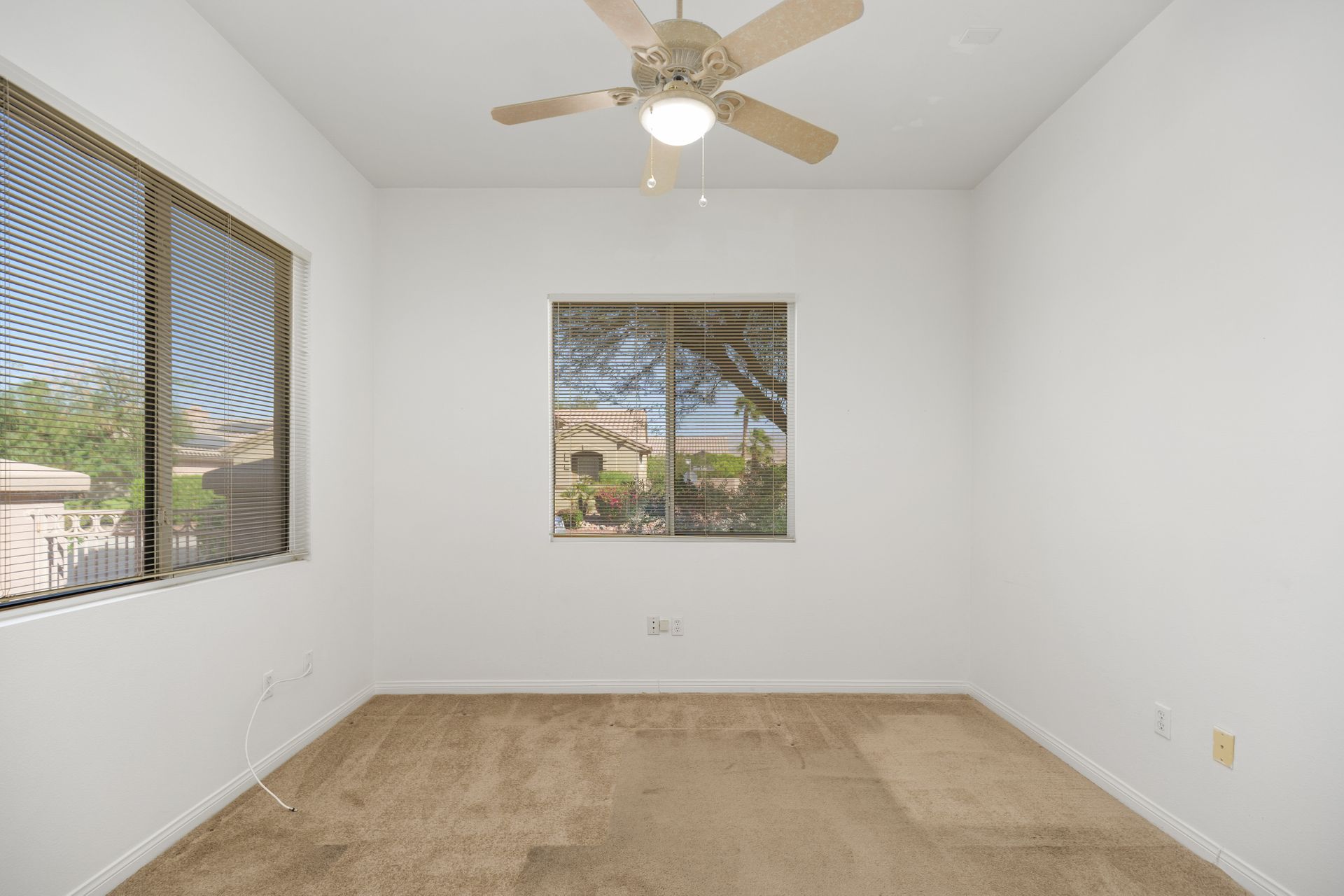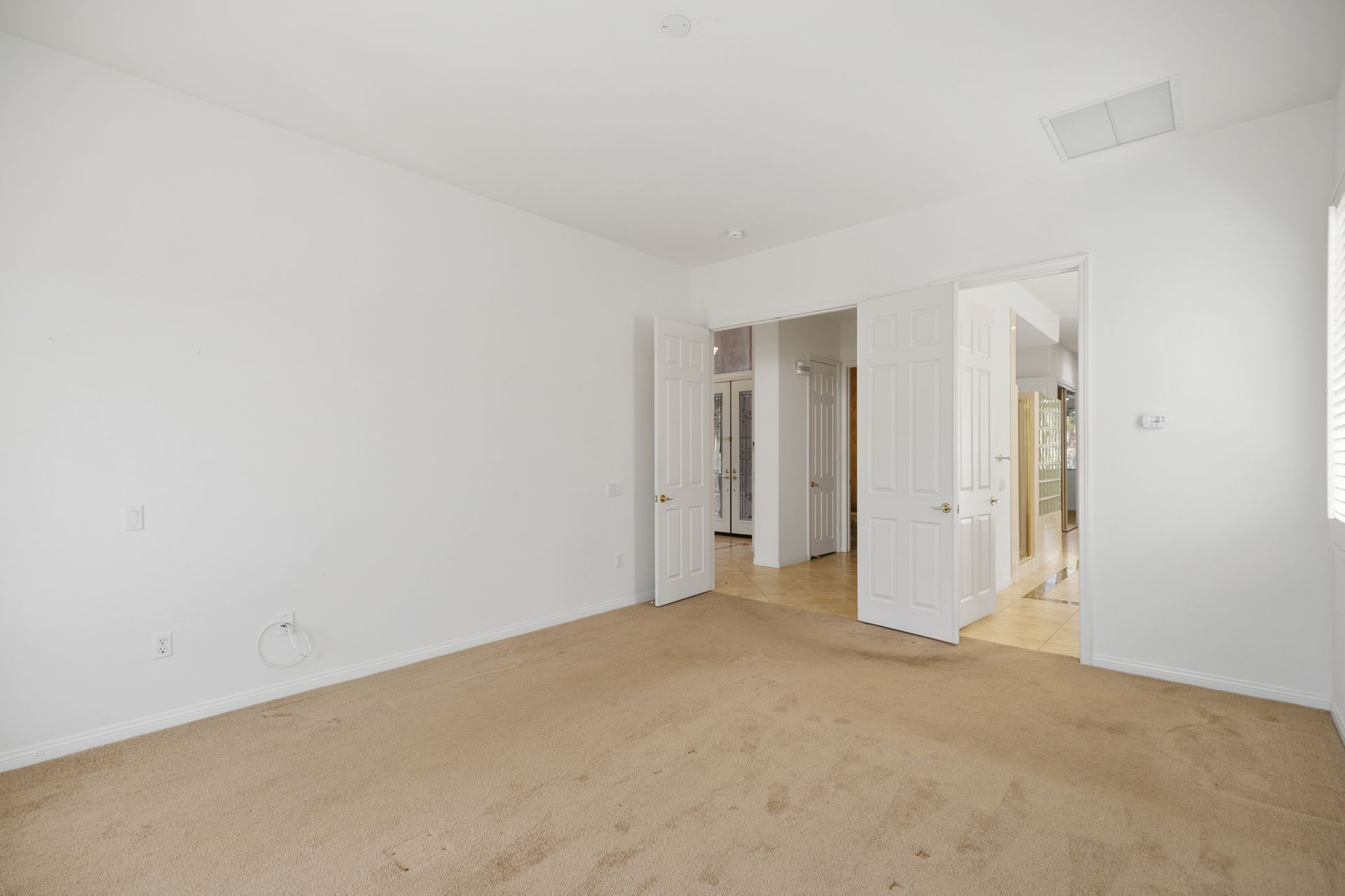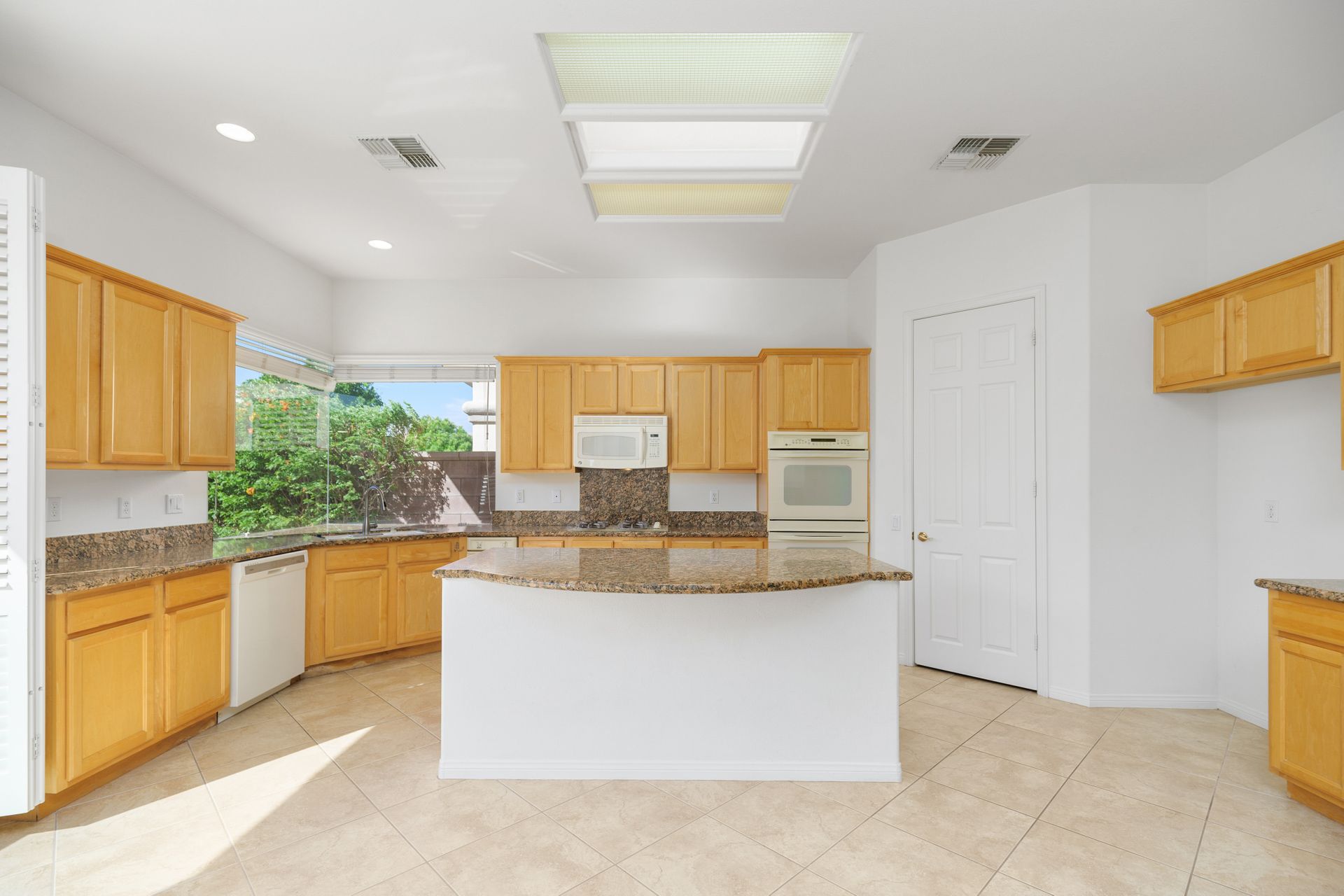 Welcome to Sun City Palm Desert's Portofino. Enter through the gated courtyard and step into a grand foyer and living room with soaring 12-foot ceilings. Enjoy the charm of shutters on most windows and a cozy double-sided fireplace. The kitchen features granite counter tops, a breakfast bar, double wall ovens, and a large skylight that fills the space with light. The formal dining area is beautifully appointed with coffered ceilings. This home includes two guest suites, each with mirrored wardrobe doors and private baths featuring shower/tub combinations. The primary suite boasts a door leading to the back patio, dual walk-in closets with built-in storage, and a private retreat area. The luxurious master bath offers dual sinks, a sitting vanity, a spacious stall shower, and an oversized tub with a glass block wall. Additional features include a 2-car plus golf cart garage and an expansive south-facing backyard with an extended patio and multiple seating areas, ideal for relaxation and entertaining. Sun City offers a wealth of amenities for active lifestyles, including two 18-hole golf courses, three clubhouses for community activities, and diverse dining options with three onsite restaurants. Enjoy outdoor activities such as bocce ball, heated pools, lighted tennis courts, scenic walking paths, and gated dog parks. Conveniently located near the 10 freeway and the new Acrisure Arena, this community truly has it all.