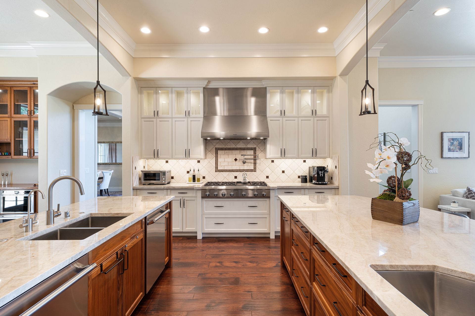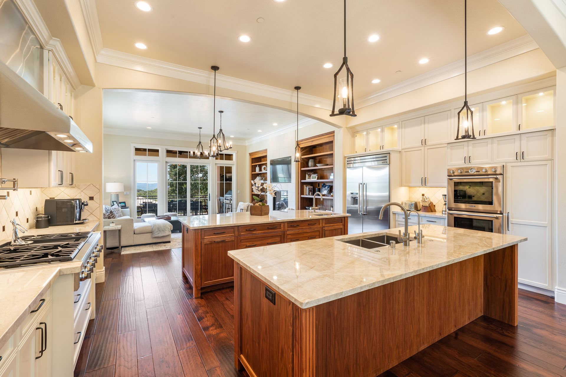 Chef’s kitchen includes 2 large islands with Taj Mahal quartzite counters with bar seating, prep sink, Thermador 6 burner gas cooktop, hood and pot filler faucet, double built-in ovens, microwave drawer, warming drawer, built-in Thermador refrigerator, 2 dishwashers, large stainless double sink, walk-in pantry, instant hot water and Grohe-Blue sparkling water system and soft-close drawers