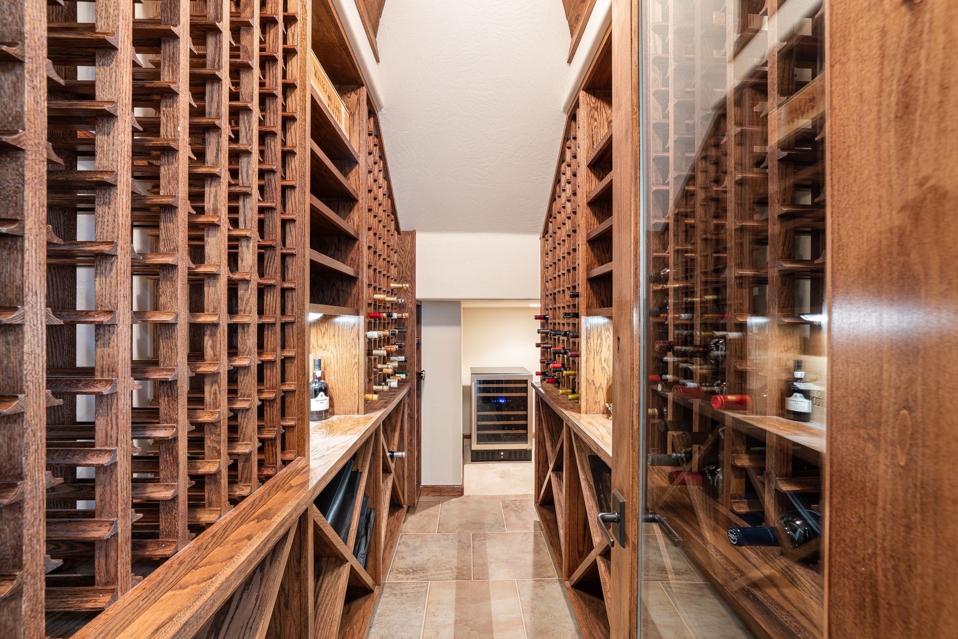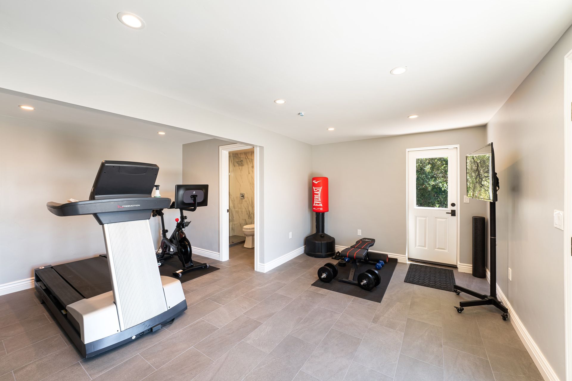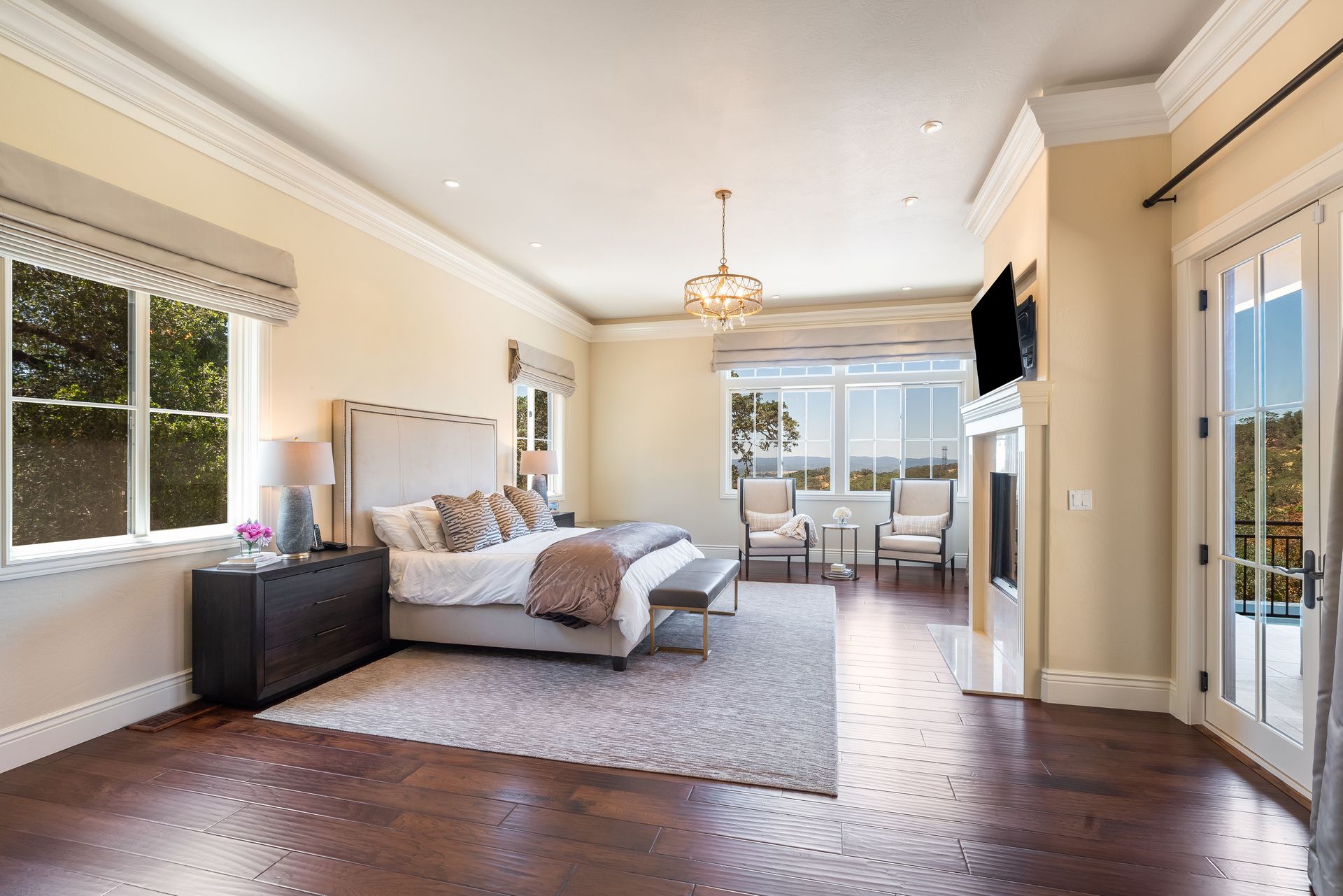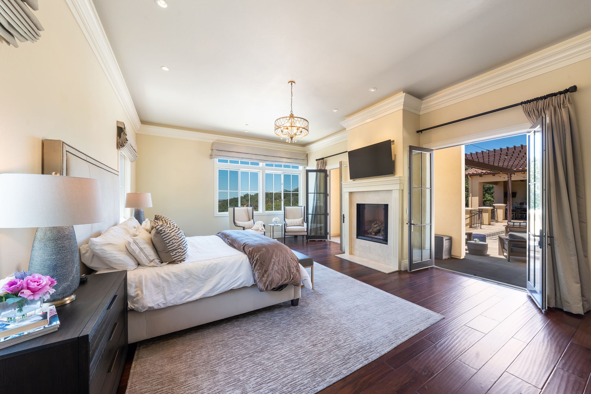 Primary suite is located on the main level, fireplace flanked by 2 sets of French doors to the terrace, wood flooring, crown molding with indirect lighting, a beverage refrigerator, dual walk-in closets with solar tubes for abundant natural light, washer/dryer hook-up and a home gym