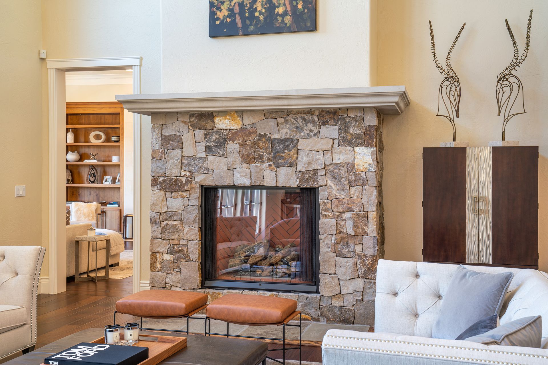 Great room features dramatic shiplap and box beams vaulted ceiling, a fireplace with stone surround, wet bar with sink and beverage refrigerator, and French doors to the terrace and pool making this ideal for entertaining