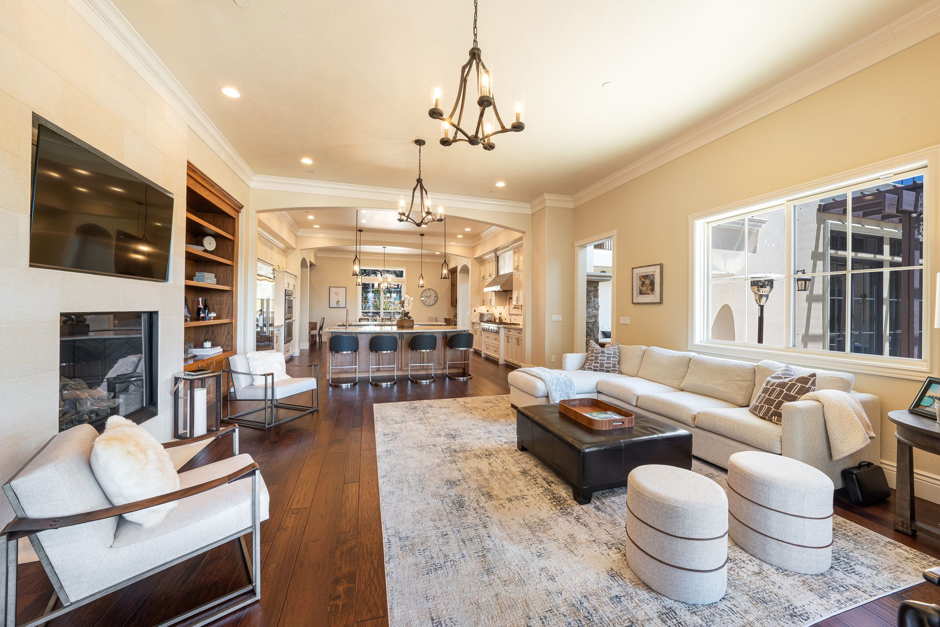 Family room, open to the kitchen, has sliders to the terrace with outdoor kitchen for ease of indoor/outdoor entertaining, gas fireplace flanked by built-in shelving and crown molding