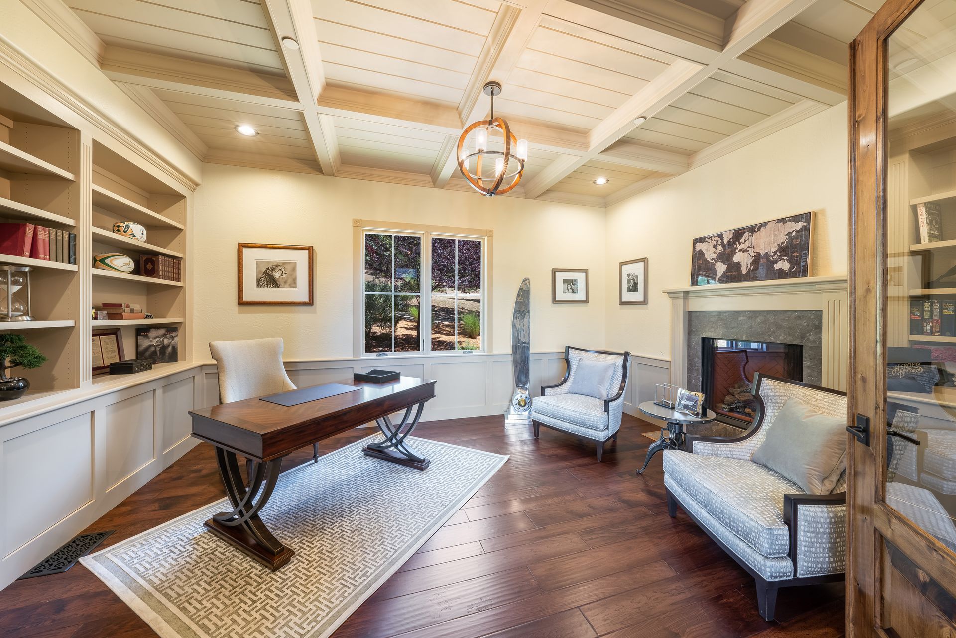 Home office includes a gas fireplace with stone surround, built-in bookshelves, shiplap and box beam ceiling, recessed lighting